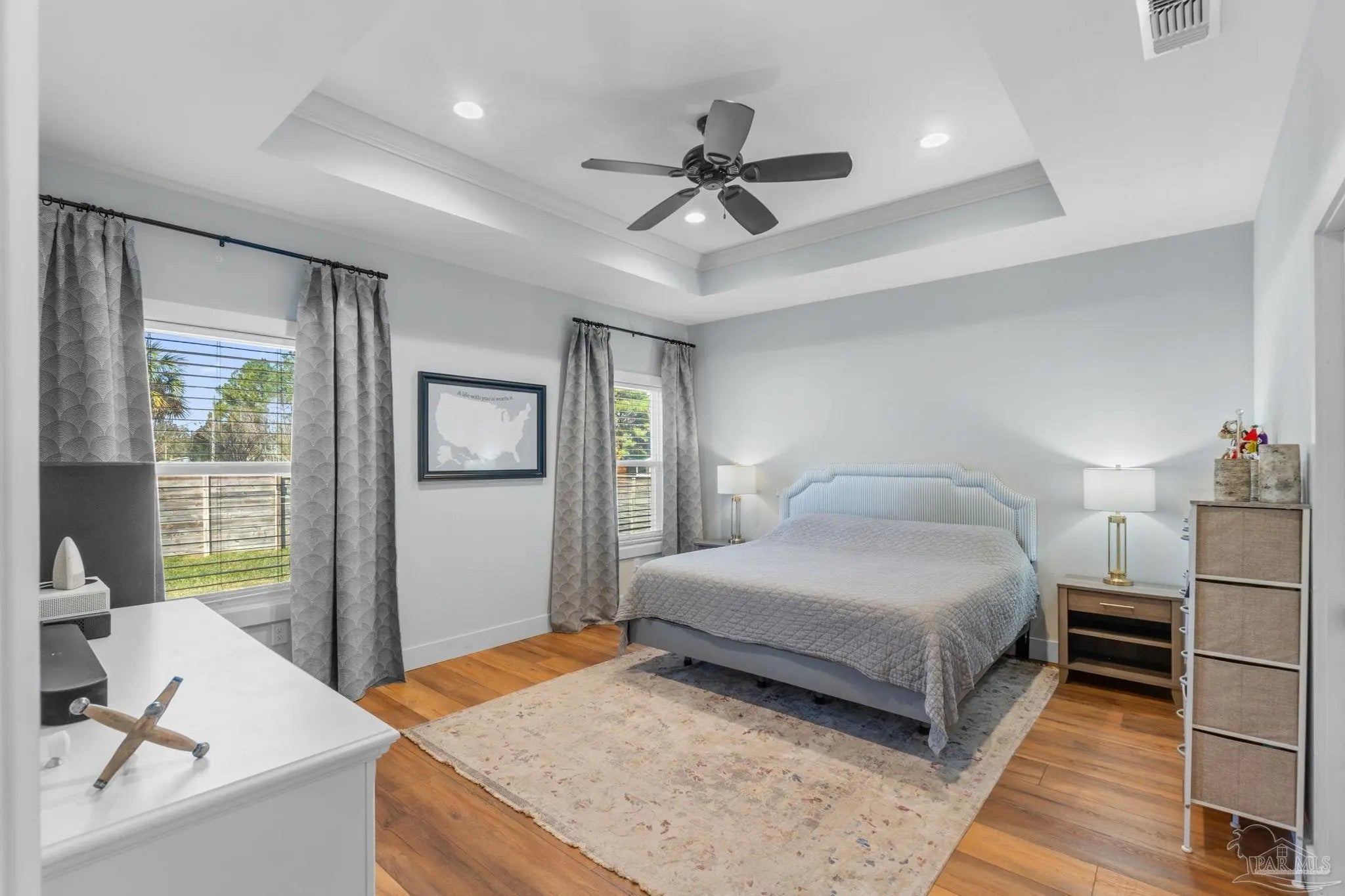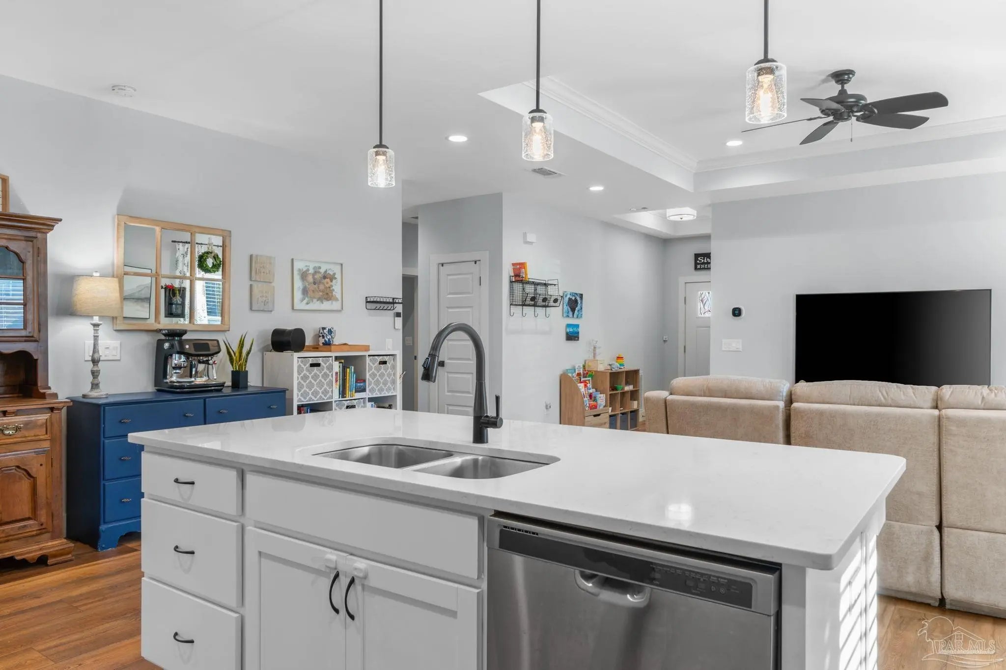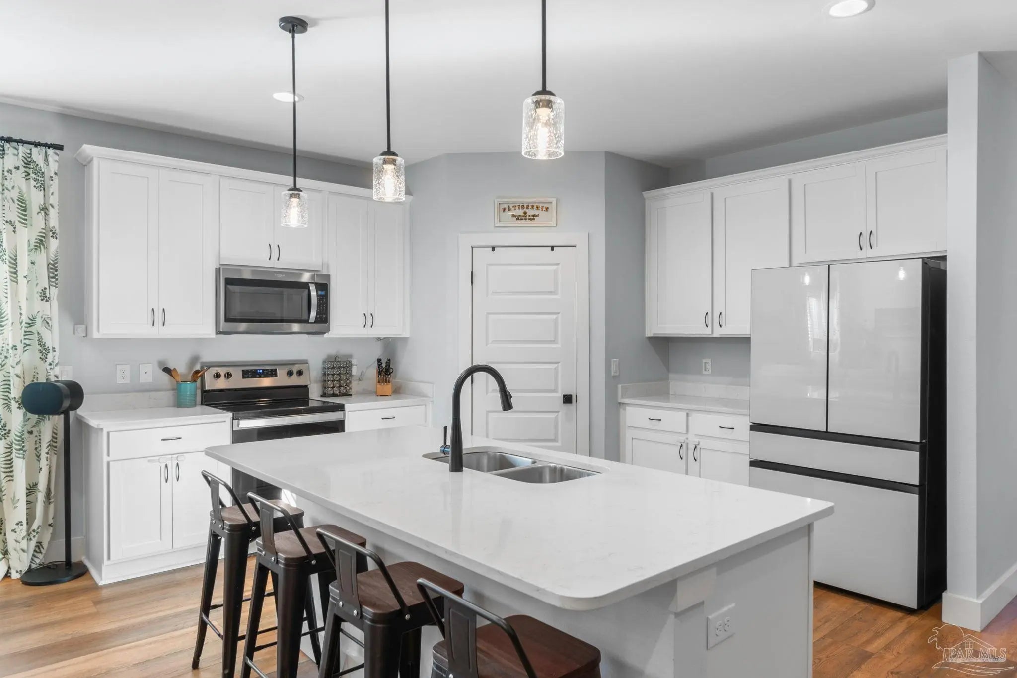 Experience modern luxury in this stunning 4-bedroom, 2-bathroom residence built in 2022, situated on a spacious corner lot in the heart of Midway/Gulf Breeze. Offering maximum flexibility with NO HOA and no rental restrictions, this home is perfect for primary residence or investment. The open-concept interior impresses with 9’ ceilings, 10’ tray accents, and durable luxury vinyl plank flooring throughout—no carpet! The chef-inspired kitchen features white shaker-style soft-close cabinetry, premium quartz countertops, a massive island with pendant lighting, and Whirlpool stainless appliance suite. Retreat to the primary suite featuring a spa-like ensuite with a large tiled shower, double quartz vanity, and a generous walk-in closet. Step outside to a covered back porch with a coffered ceiling, overlooking a fully fenced backyard equipped with a sprinkler system and private well. Notable upgrades include a finished garage with epoxy floors, Fabric Shield hurricane protection, a Sentricon termite system, and gutters around the entire home. Conveniently located near the upcoming Soundside high school and walking distance to a local county park, with easy access to both Navarre and Pensacola beaches. Schedule your private tour today!