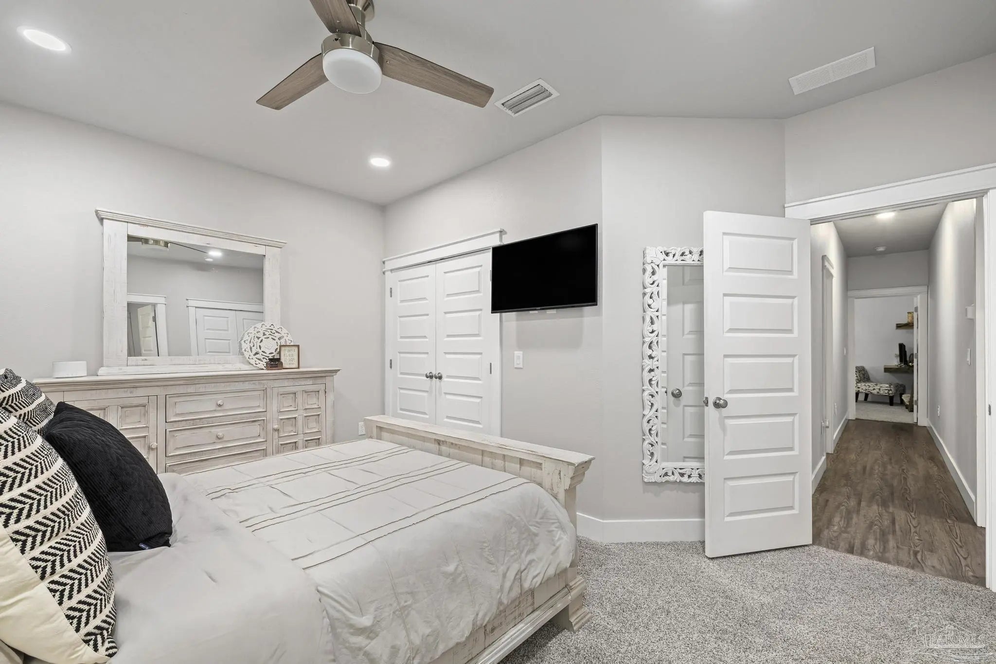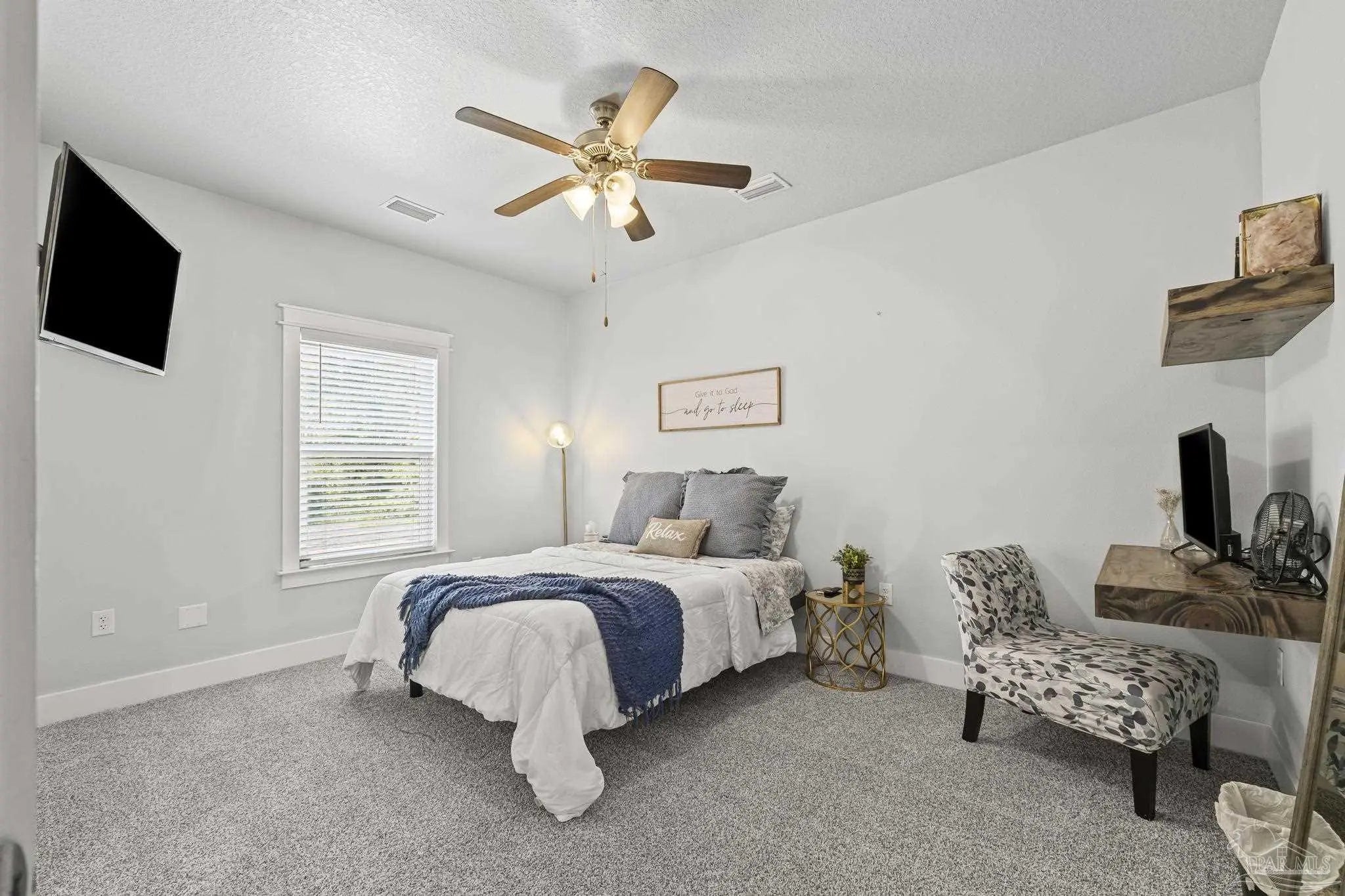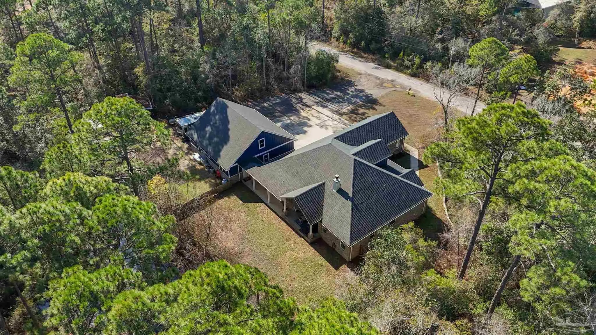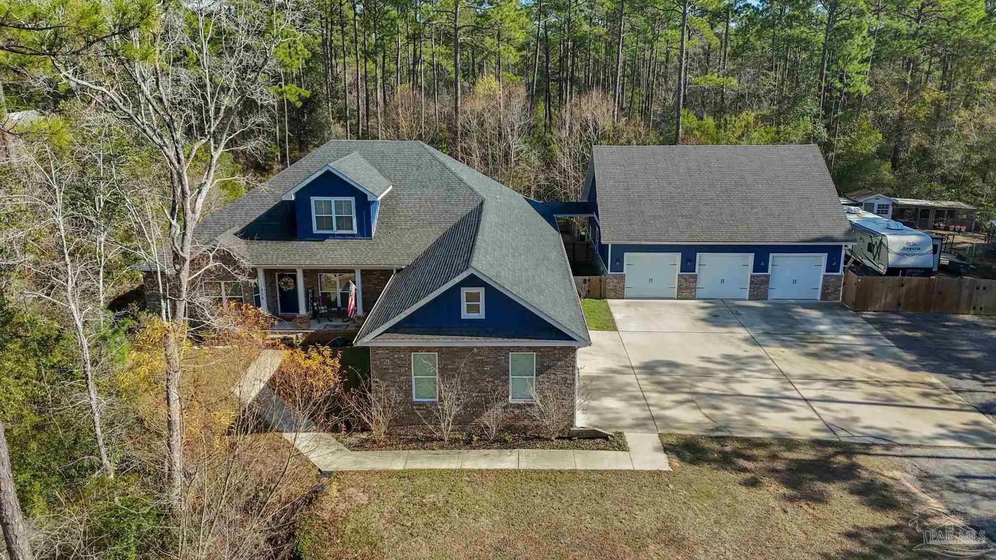 Looking for a home with land? This one is it! This 3,500 sq ft brick home, built in 2019, sits on 1.4 acres across from the bay with no HOA and plenty of indoor space to entertain. The property includes a 6-car garage setup—an attached climate-controlled 3-car garage and a detached 3-car garage with full bath, ample space for multigenerational living. Inside, you'll find an open-concept floor plan with LVP flooring in main living areas, new carpet in all bedrooms, granite in the kitchen and baths, stainless steel appliances, walk in pantry, tankless water heater and wood burning fireplace. The home offers 5 bedrooms and 5 and 1/2 baths, including two ensuites —both with direct access to the covered back porch. The primary ensuite has 2 oversized walk-in closets, a soaker tub, tiled walk-in shower, dual vanity, and linen closet. The two additional guest bedrooms share a connected bath, and the front room off the foyer can function as an office or bedroom with a full bath down the hall. A half bath is conveniently located in the laundry/mudroom area. Upstairs features a large loft and theater room with plenty of space for a pool table or game area. Outside, enjoy a privacy-fenced backyard, RV pad with full hookups, and ample parking for a boat, work trailers, or just extra toys. Fabric shield hurricane protection is included for peace of mind. If you have a lot of toys this is the home for you! Unlimited possibilities.