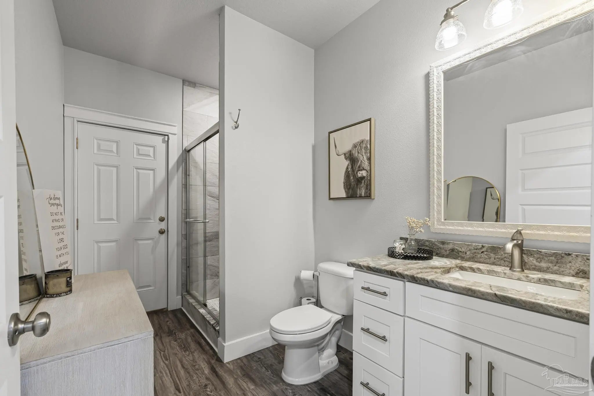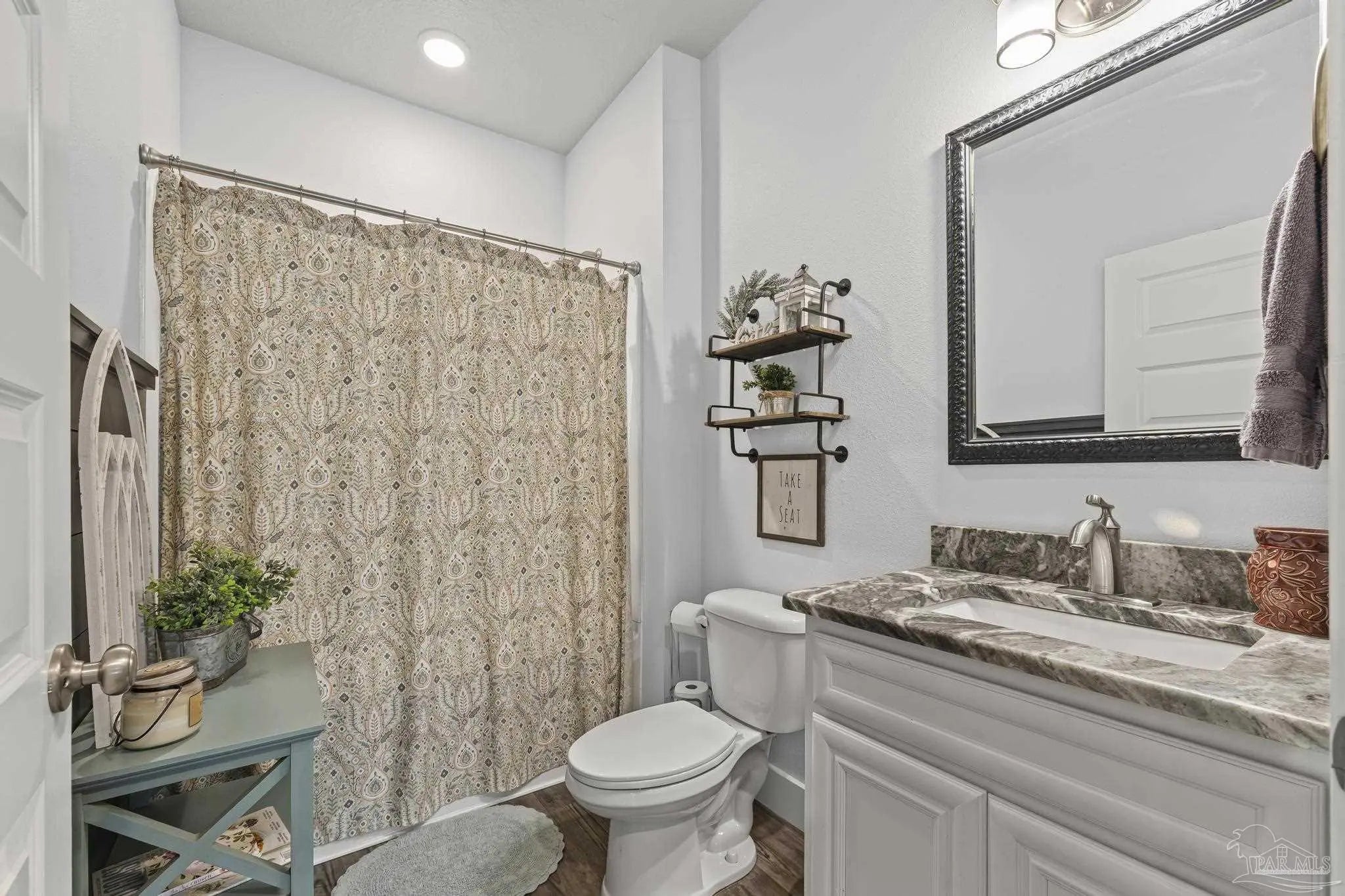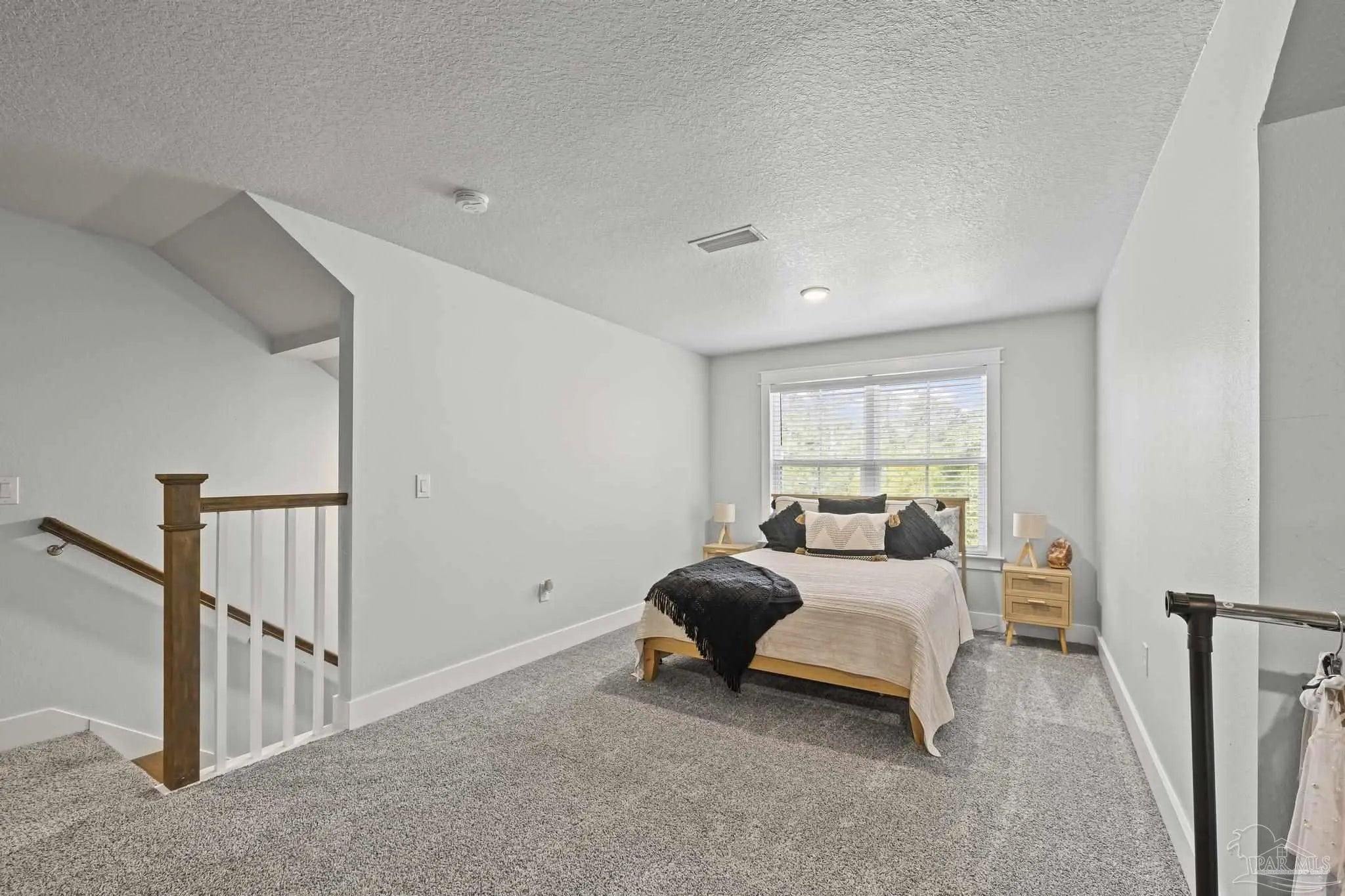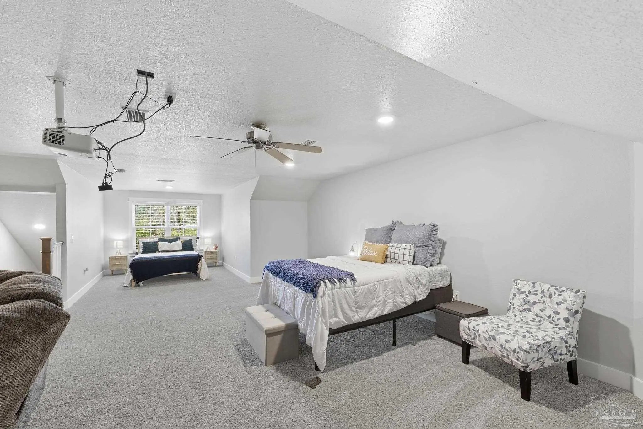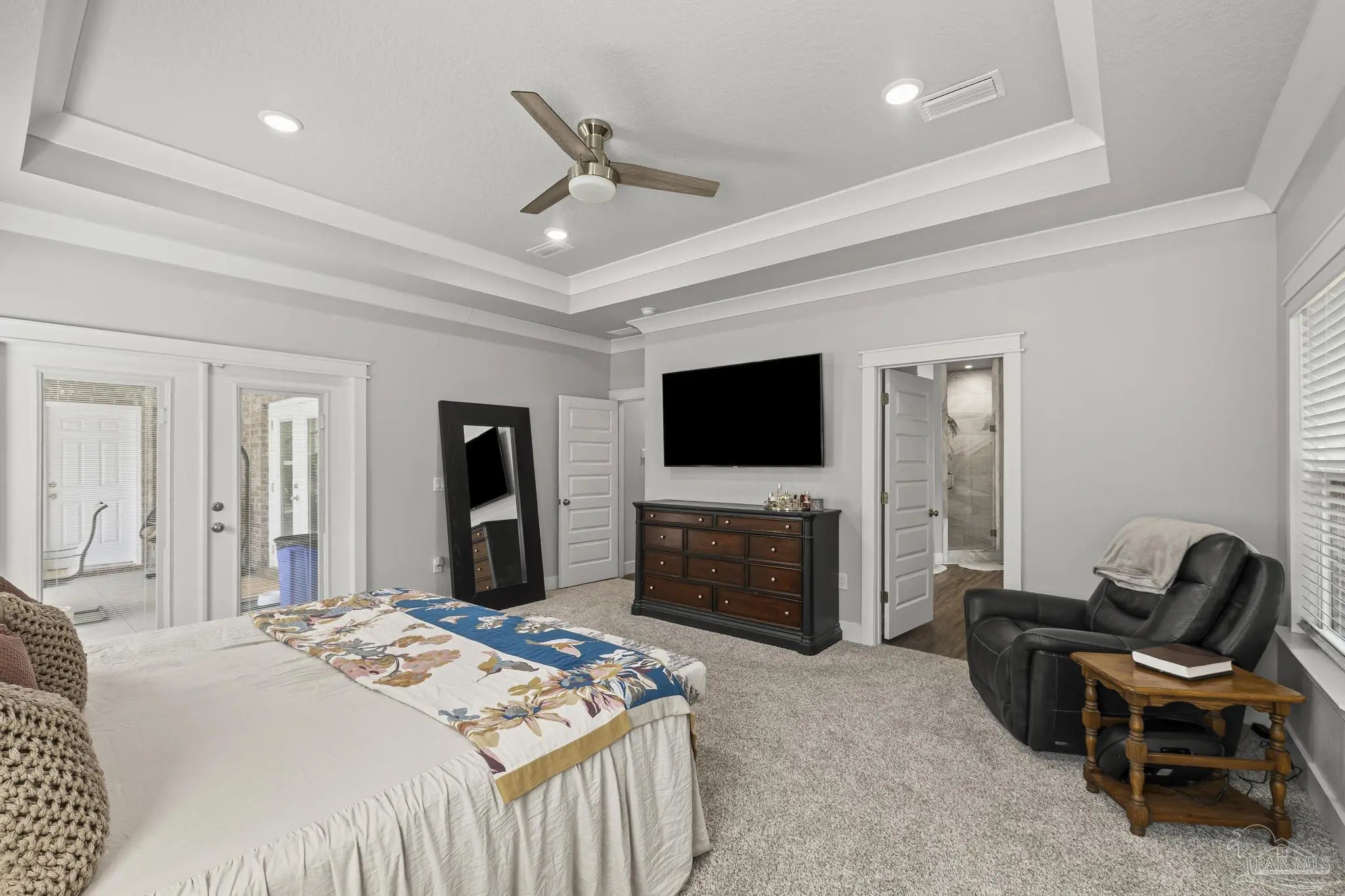 Looking for a home with land? This one is it! This 3,500 sq ft brick home, built in 2019, sits on 1.4 acres across from the bay with no HOA and plenty of indoor space to entertain. The property includes a 6-car garage setup—an attached climate-controlled 3-car garage and a detached 3-car garage with full bath, ample space for multigenerational living. Inside, you'll find an open-concept floor plan with LVP flooring in main living areas, new carpet in all bedrooms, granite in the kitchen and baths, stainless steel appliances, walk in pantry, tankless water heater and wood burning fireplace. The home offers 5 bedrooms and 5 and 1/2 baths, including two ensuites —both with direct access to the covered back porch. The primary ensuite has 2 oversized walk-in closets, a soaker tub, tiled walk-in shower, dual vanity, and linen closet. The two additional guest bedrooms share a connected bath, and the front room off the foyer can function as an office or bedroom with a full bath down the hall. A half bath is conveniently located in the laundry/mudroom area. Upstairs features a large loft and theater room with plenty of space for a pool table or game area. Outside, enjoy a privacy-fenced backyard, RV pad with full hookups, and ample parking for a boat, work trailers, or just extra toys. Fabric shield hurricane protection is included for peace of mind. If you have a lot of toys this is the home for you! Unlimited possibilities.
