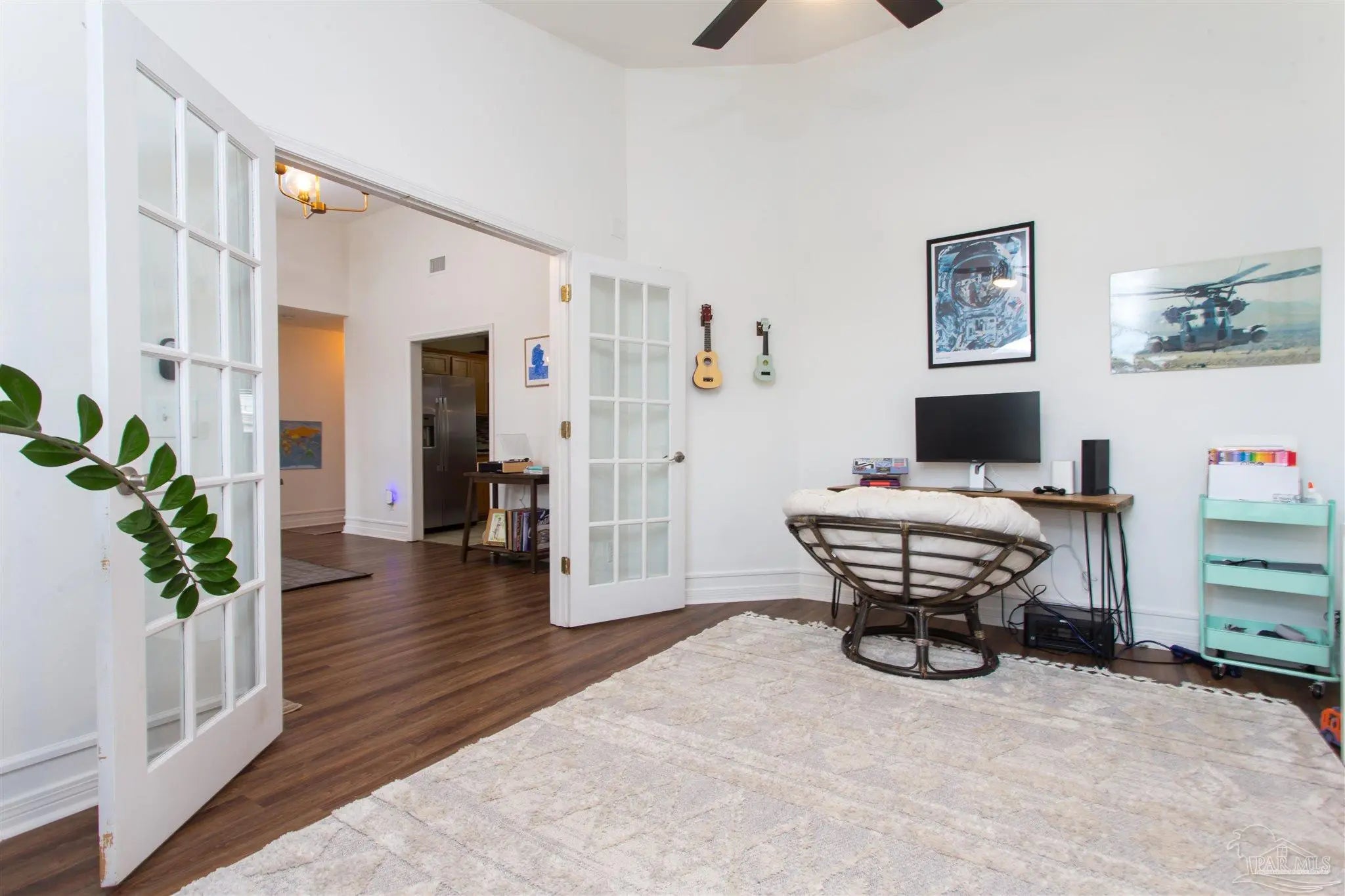 - Baseboards, Cathedral Ceiling(s), Ceiling Fan(s), High Ceilings, Office/Study