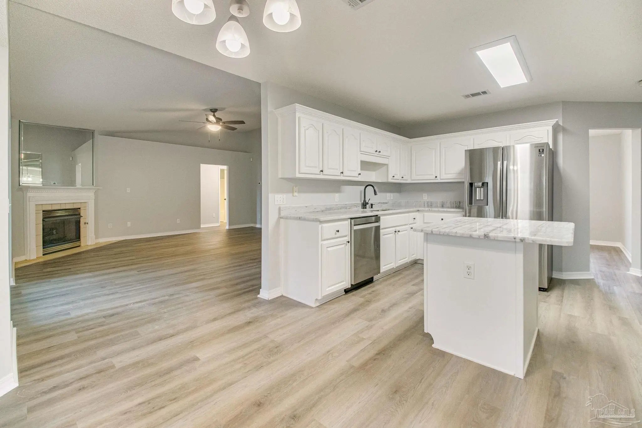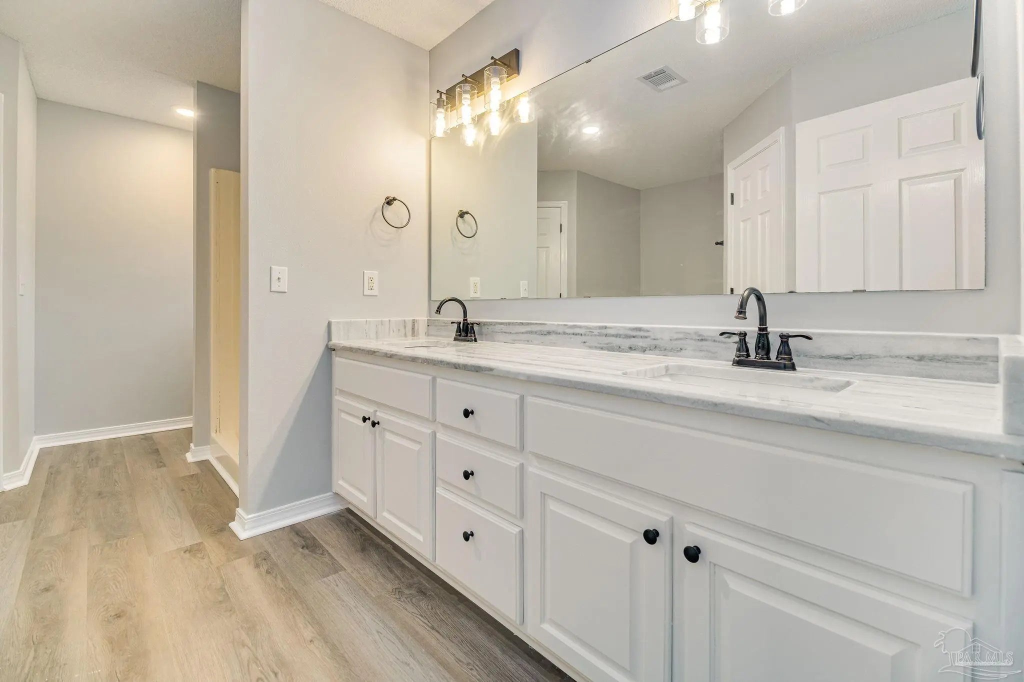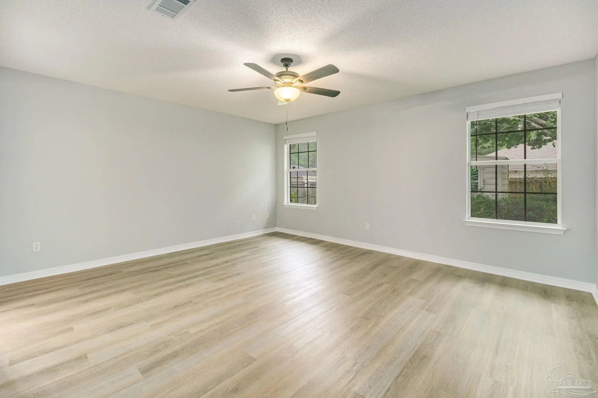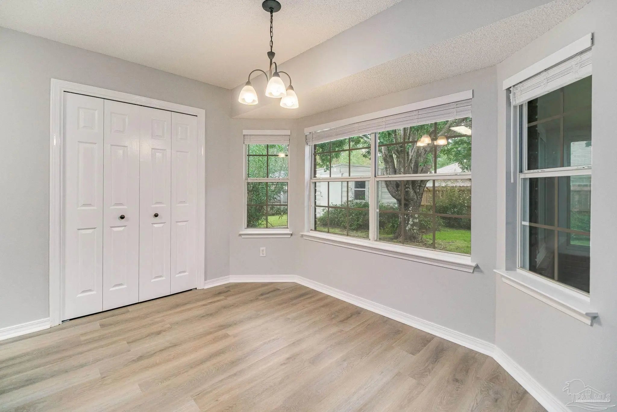 BRIGHT AND BEAUTIFUL HOME IN THE HIGHLY DESIREABLE LILLIAN WOODS SUBDIVISION! This 3 bedroom 2 bath home is conveniently located to NAS Pensacola and the Perdido Key beaches. An inviting front porch welcomes you into an open floor plan brick home with vaulted ceilings and oversized windows for lots of natural light. This home features new luxury vinyl plank flooring throughout the whole house. There is a bonus room that could be used as an office space or playroom as you enter the house. The upgraded kitchen features new Silver Fantasy granite, new stainless appliances, pantry storage & eat-in dining! The dining area opens right off the kitchen and into the living area which features beautiful high ceilings. The living room is light and bright opening out to the large tiled Florida room. The backyard is fully fenced with a shed. The owner's suite is spacious with a dual sink vanity as well as a large soaker tub and separate shower. The shower will have a semi-frameless oil rubbed bronze shower door installed within the next few weeks. There are separate his and hers large walk-in closets! Two guest rooms & full guest bath. Indoor laundry/mud room features added storage. Attached 2 car garage. Did i mention the home has a 3 year oldroof and new ac unit.