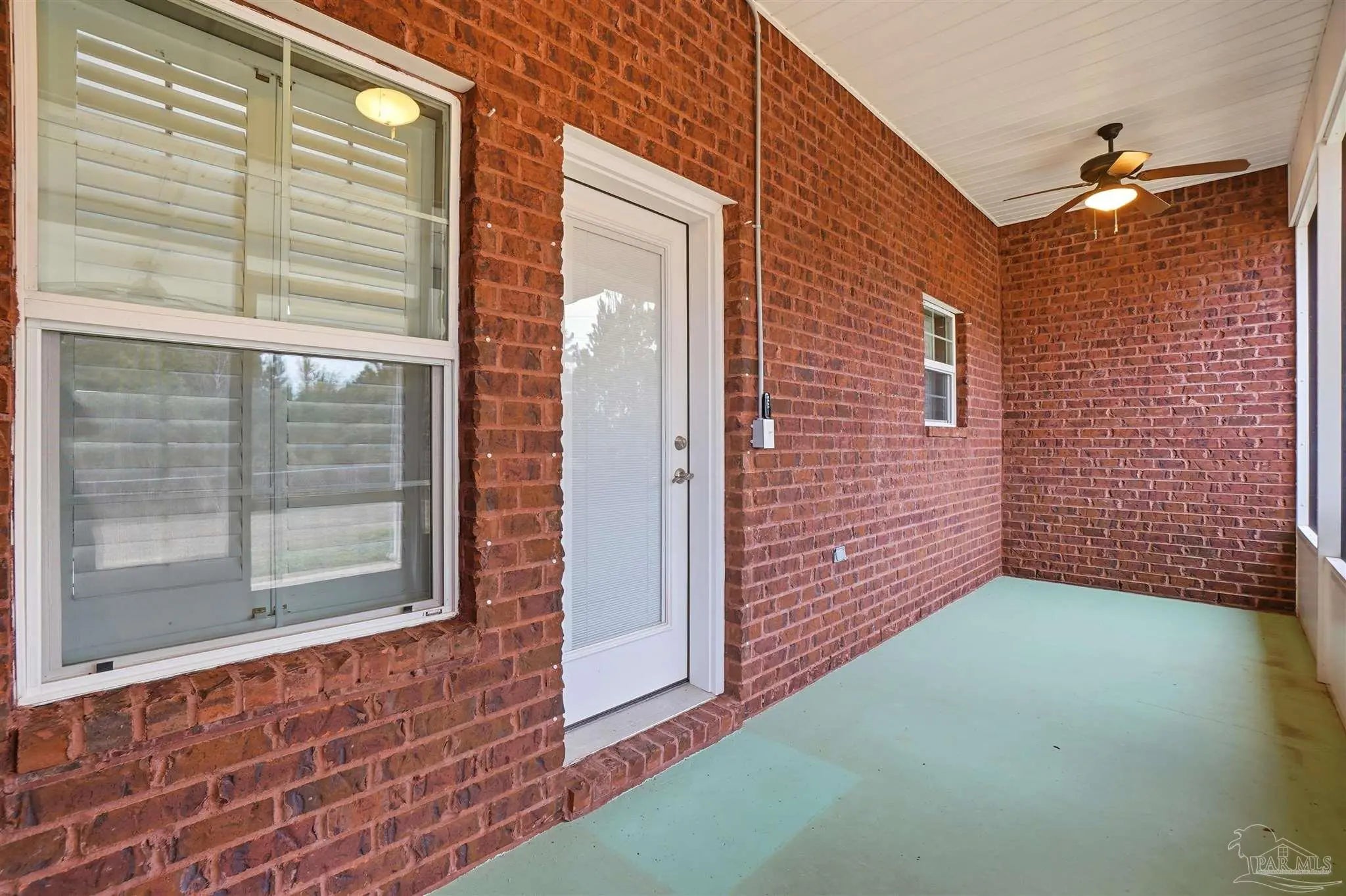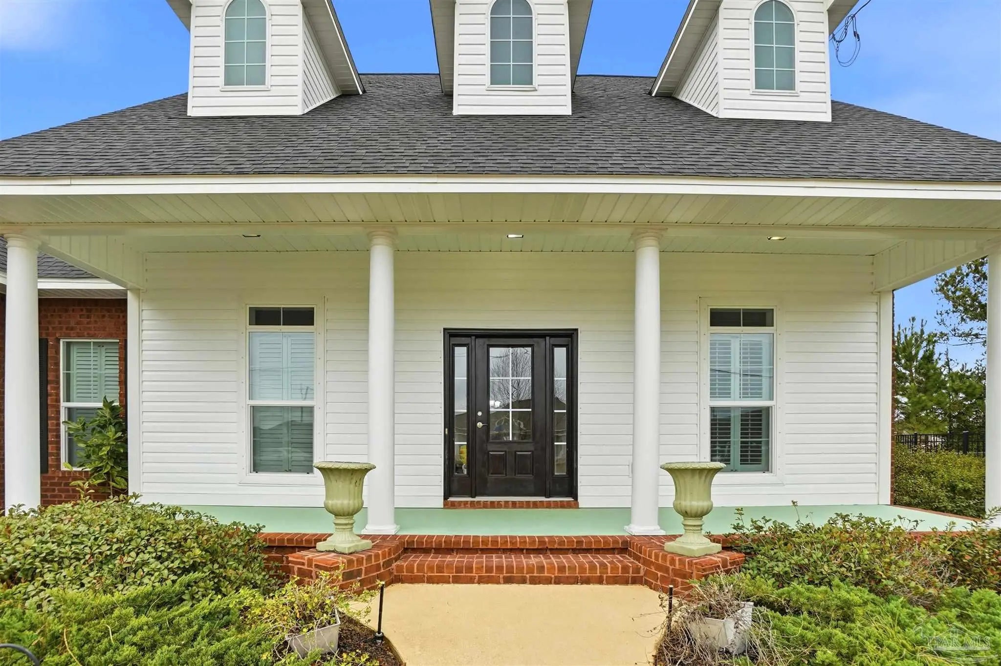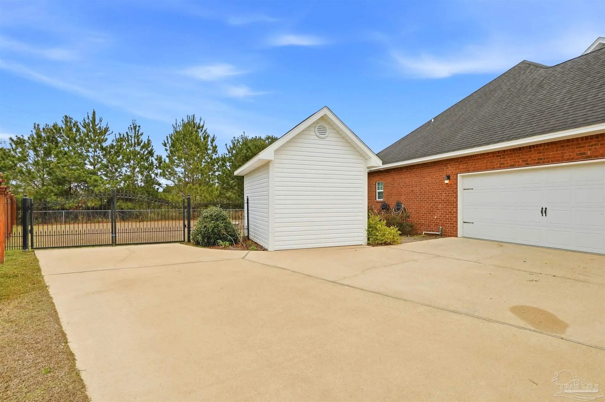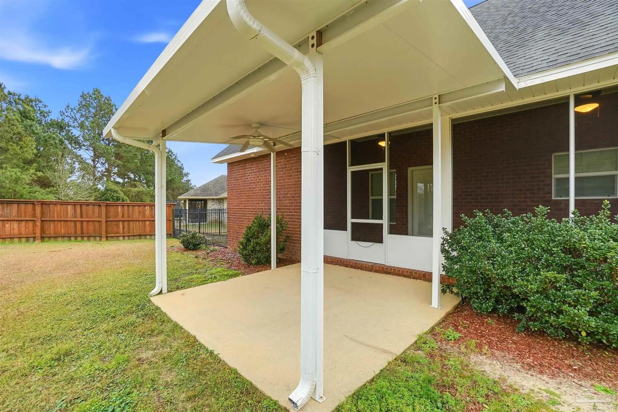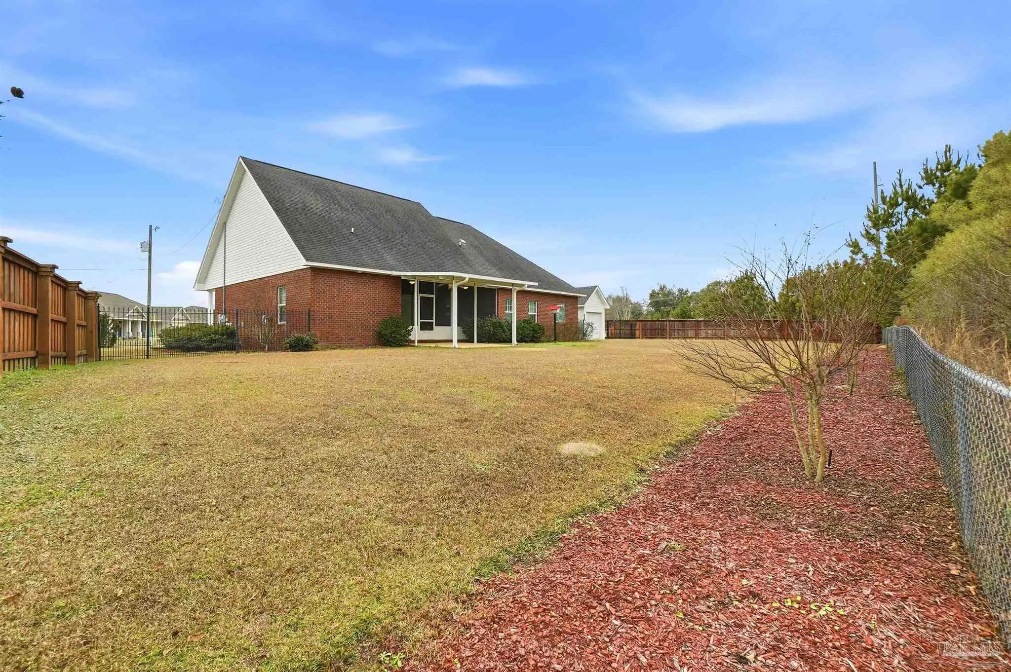 MOVE IN READY 3BR/2BA WITH WORKSHOP BONUS ROOM ON JUST SHORT OF 1/2 ACRE LOT. The property features a workshop/craftsman area, a screened back patio, and a covered back patio for family outdoor cooking, offering versatile spaces for various activities. The vented (heat and cold) workshop/craftsman area can be turned into a home office, playroom for kids, "mancave" or "she-shed" boudoir to escape and relax. The detached golf cart garage/shed and Rainbird sprinkler system (using well water) add convenient features to the home. The kitchen/dining combo boasts granite countertops, ice maker, recessed lighting, and pantry. Bahama shutters are throughout the home, contributing to the property's elegant aesthetic. There is NO HOA which allows for storage of boat, RV, or 5th Wheel Trailer, saving you storage dues and plenty of room from oversized side garage and long driveway. Relax on the screen-in back patio and enjoy mosquito-free windy nights in the summer. Notably, this home is situated on almost half an acre of land and is located less than 2 miles from public boat ramp and less than 20 minutes from Perdido Key Beach, providing ample opportunities for outdoor recreation. Backyard is perfect to add your pool and there is plenty of space for a greenhouse for the gardener in the family. The primary bedroom includes a walk-in closet, and the primary bathroom features a garden tub with separate shower, double vanity, and water closet. The split floorplan has the other 2 bedrooms and hall bath on other side of home for more privacy. The home is fully electric with public water and sewer services, and well water and pump for Rainbird sprinkler system. Additionally, the home comes with a home warranty, and all kitchen appliances to include refrigerator with washer/dryer set offering peace of mind for the new owners. Survey is available and Pest/termite bond is transferable at closing. Call today to make an appointment!