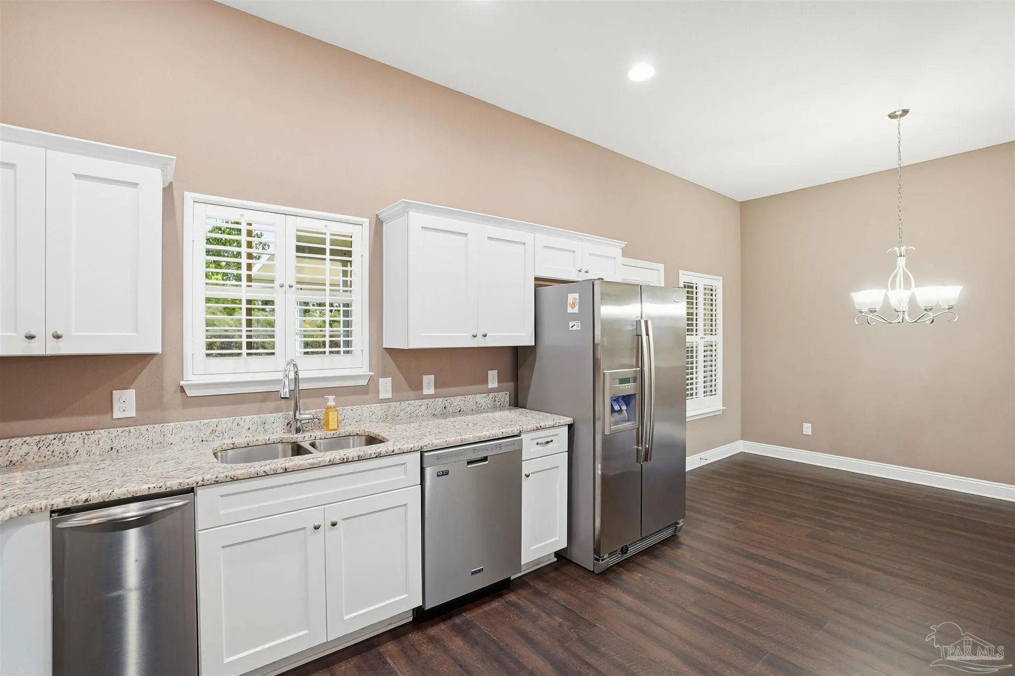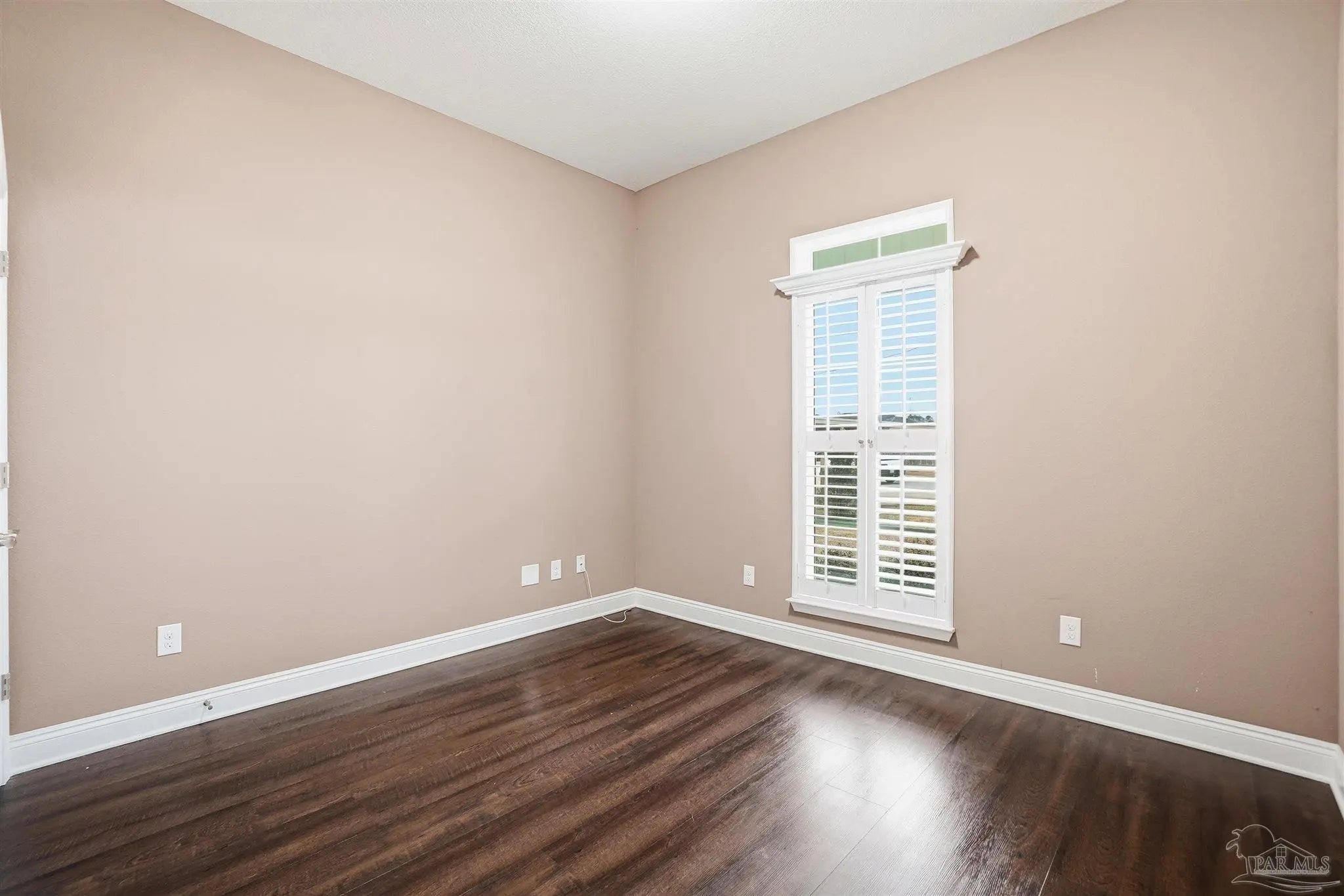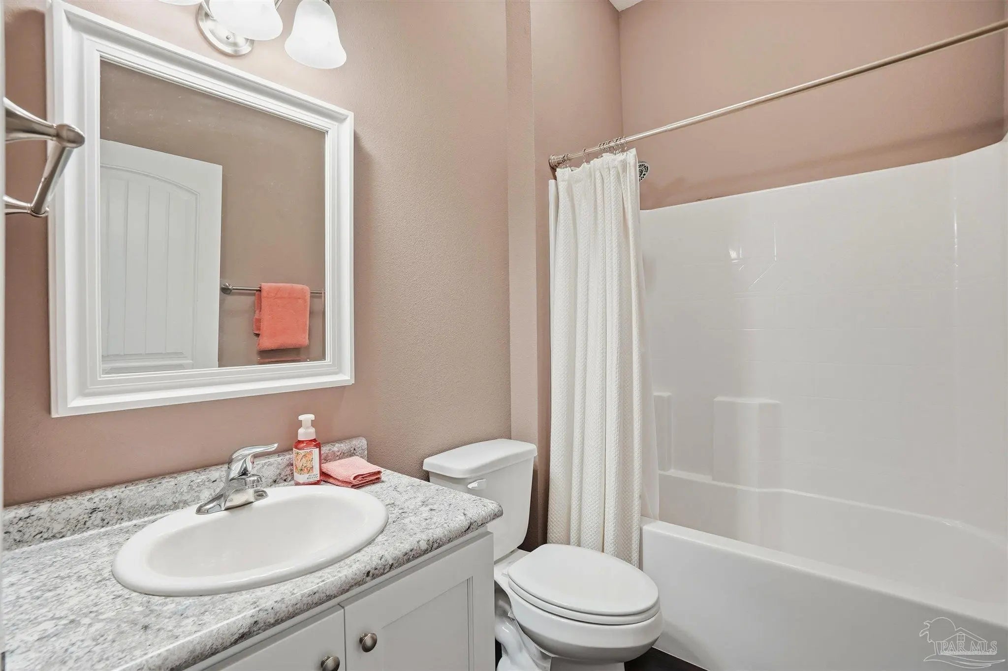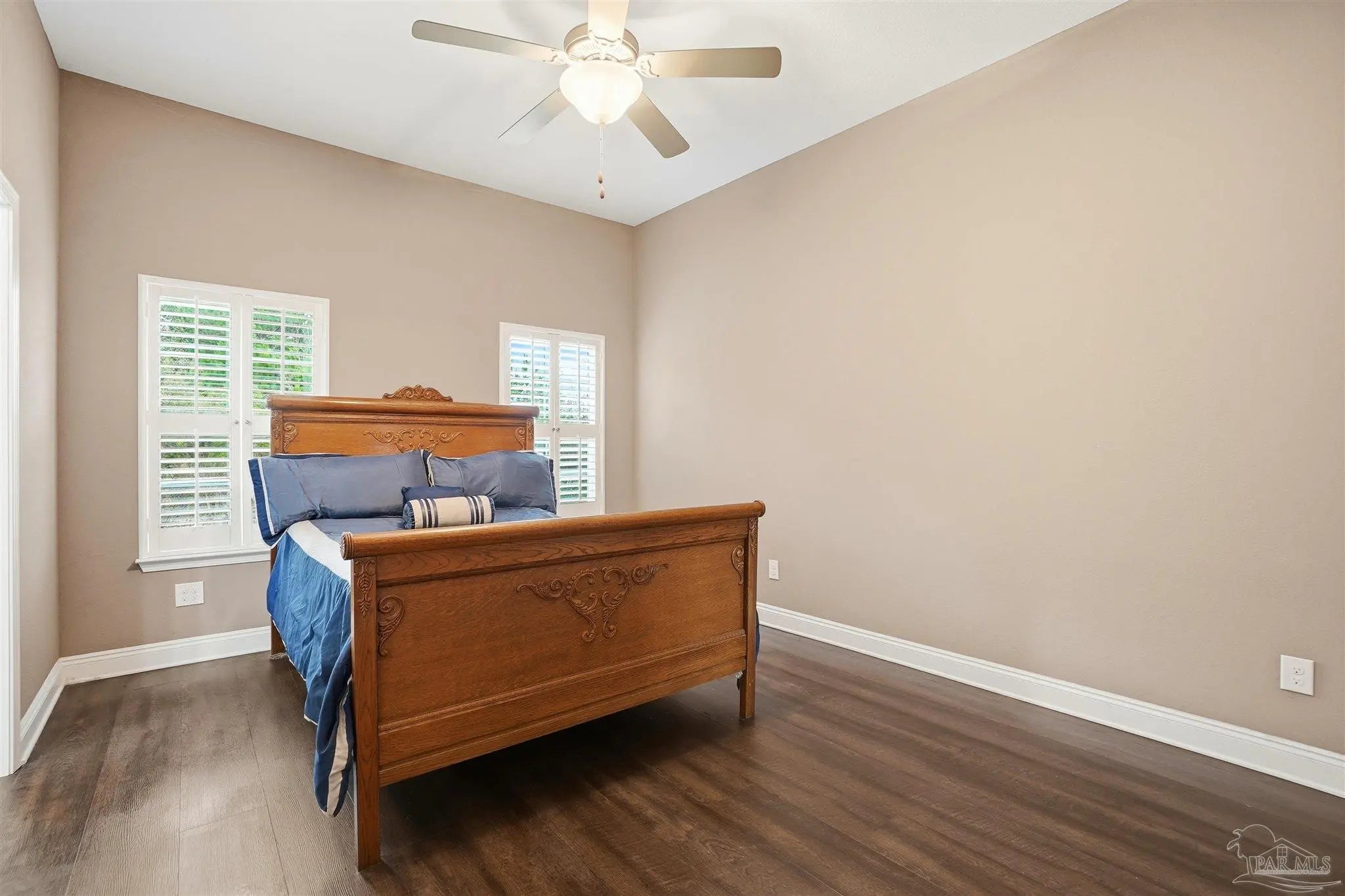 MOVE IN READY 3BR/2BA WITH WORKSHOP BONUS ROOM ON JUST SHORT OF 1/2 ACRE LOT. The property features a workshop/craftsman area, a screened back patio, and a covered back patio for family outdoor cooking, offering versatile spaces for various activities. The vented (heat and cold) workshop/craftsman area can be turned into a home office, playroom for kids, "mancave" or "she-shed" boudoir to escape and relax. The detached golf cart garage/shed and Rainbird sprinkler system (using well water) add convenient features to the home. The kitchen/dining combo boasts granite countertops, ice maker, recessed lighting, and pantry. Bahama shutters are throughout the home, contributing to the property's elegant aesthetic. There is NO HOA which allows for storage of boat, RV, or 5th Wheel Trailer, saving you storage dues and plenty of room from oversized side garage and long driveway. Relax on the screen-in back patio and enjoy mosquito-free windy nights in the summer. Notably, this home is situated on almost half an acre of land and is located less than 2 miles from public boat ramp and less than 20 minutes from Perdido Key Beach, providing ample opportunities for outdoor recreation. Backyard is perfect to add your pool and there is plenty of space for a greenhouse for the gardener in the family. The primary bedroom includes a walk-in closet, and the primary bathroom features a garden tub with separate shower, double vanity, and water closet. The split floorplan has the other 2 bedrooms and hall bath on other side of home for more privacy. The home is fully electric with public water and sewer services, and well water and pump for Rainbird sprinkler system. Additionally, the home comes with a home warranty, and all kitchen appliances to include refrigerator with washer/dryer set offering peace of mind for the new owners. Survey is available and Pest/termite bond is transferable at closing. Call today to make an appointment!