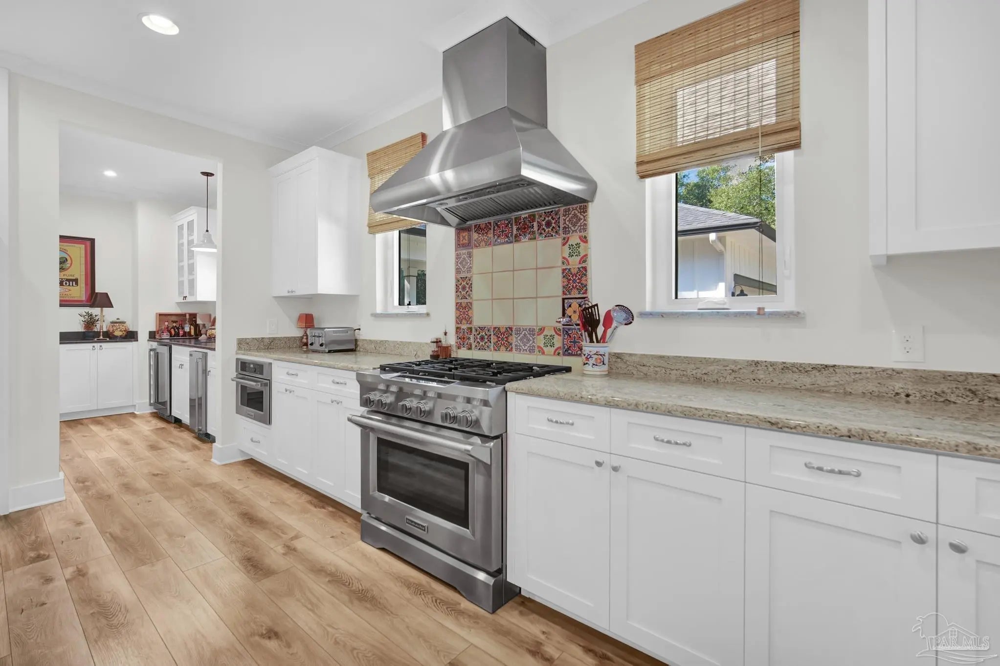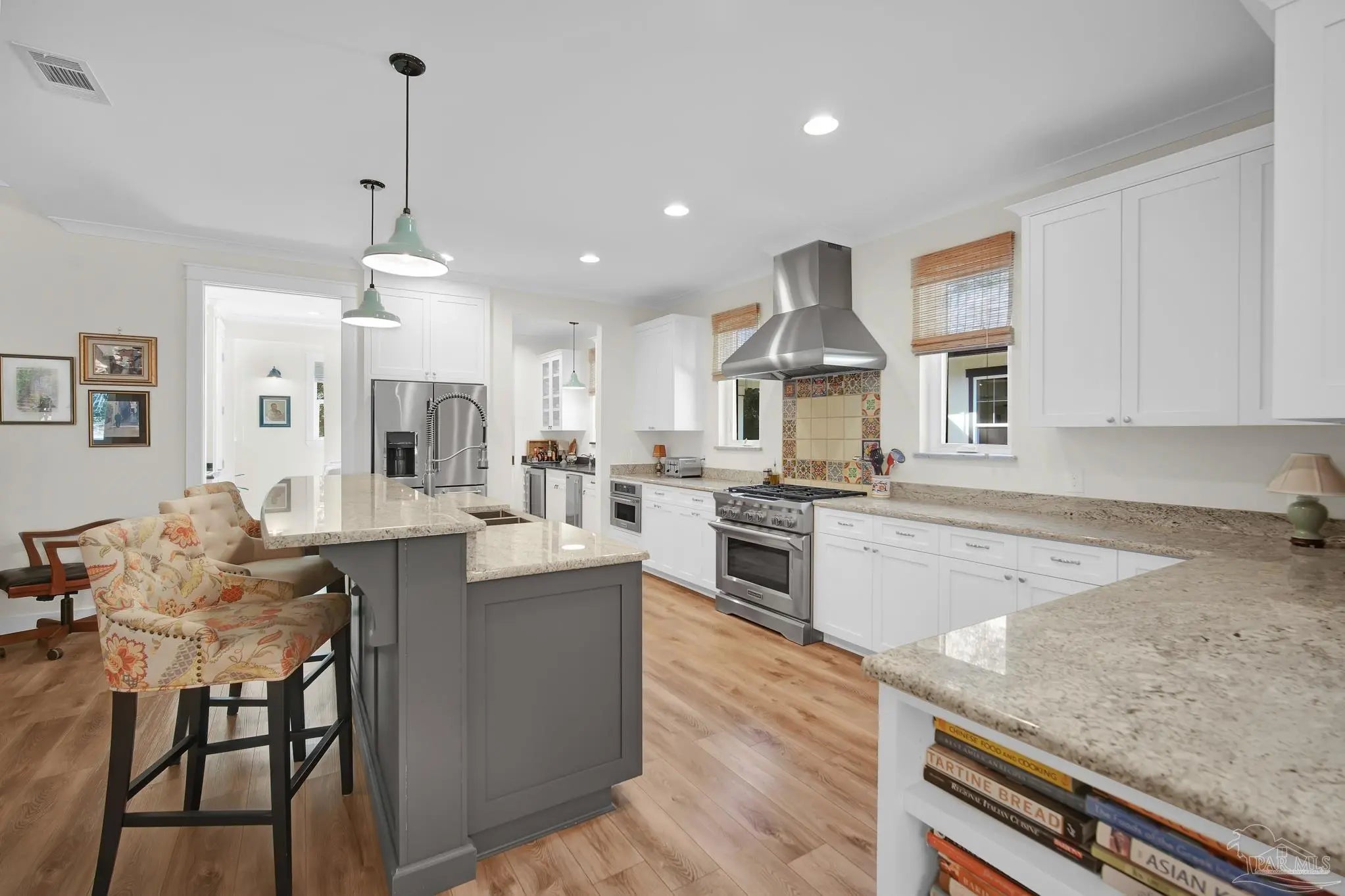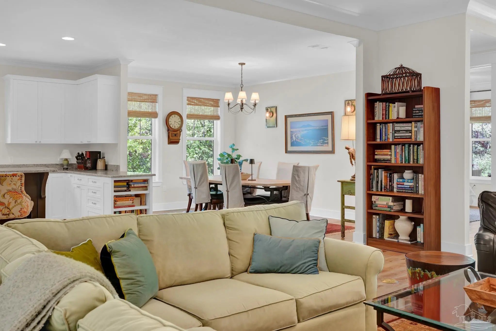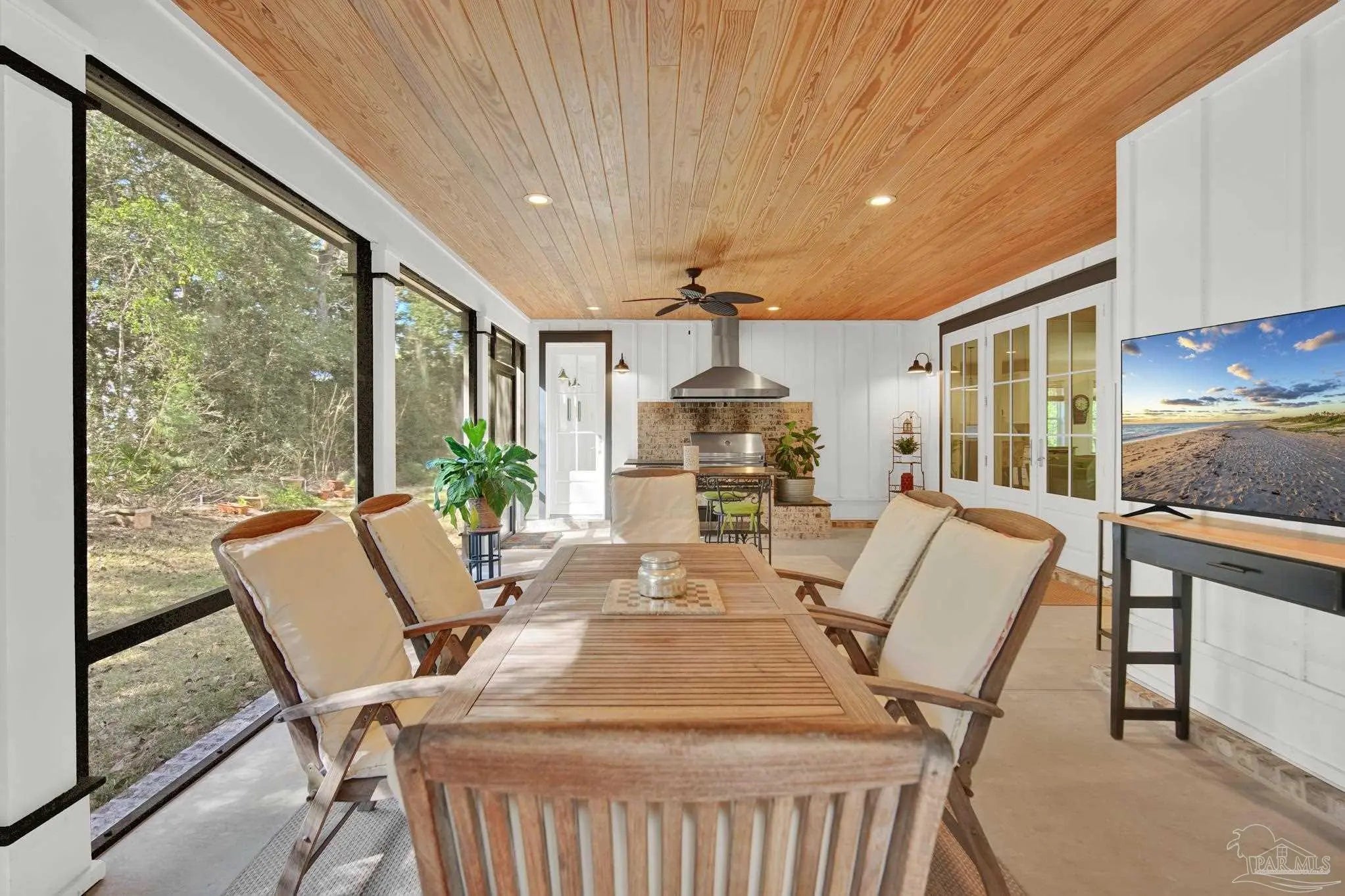 Experience quality & style in this beautifully designed, meticulously maintained coastal cottage featuring 3 BR, 3.5 BA, 2663 SF main house + 180 SF detached. A must-see property! As you approach, a wide front porch that spans the entire facade welcomes you, 8' doors, and high ceilings throughout, complemented by an abundance of windows for natural light. Preserved trees enhance privacy & natural beauty. Entertain friends & family in the expansive Kitchen/Dining/Living area with a gas fireplace that flows into the huge screened-in porch, featuring a built-in natural gas grill & hood. (A $1,200 allowance is available for a new 36" grill, current one does not convey.) Enjoy background music through indoor & outdoor speakers. The Dining Area comfortably seats 10. (Sentimental wall sconces will be replaced & do not convey.)The Office off the Living Room boasts custom doors and transom. The Kitchen & Butler's Pantry are a cook's dream with ample cabinets, granite countertops, and high-end stainless appliances, including a 36" 6 Burner KitchenAid Dual Fuel Range, a 5-door KitchenAid French Door Refrigerator, a KitchenAid Dishwasher, a Deep Stainless Apron Front Sink, and a KitchenAid Microwave Drawer. The Butler's Pantry features Perlick Undercounter Wine/Beverage Chiller and top-hat style Ice Maker. Adjacent to the Kitchen are the laundry, half bath, and hall leading to the detached 2-car garage & 180 SF Man Cave. The Master Suite is spacious enough for a CA King bed & more. Double glass doors open to the back porch. The MBA includes a tiled shower, freestanding tub, two closets, a dual granite vanity, and a water closet. BR 2 & 3 are generously sized with ensuite baths, granite vanities, and walk-in closets. Bathroom flooring is porcelain tile, while a high-quality wide plank LVP in a neutral coastal tone runs throughout the remainder. All appliances, including washer & dryer, convey. Additional features include a whole house generator, termite bond & sprinkler system.