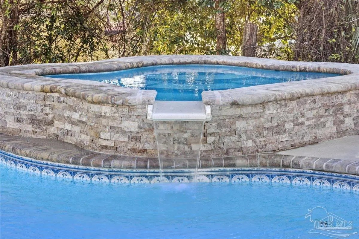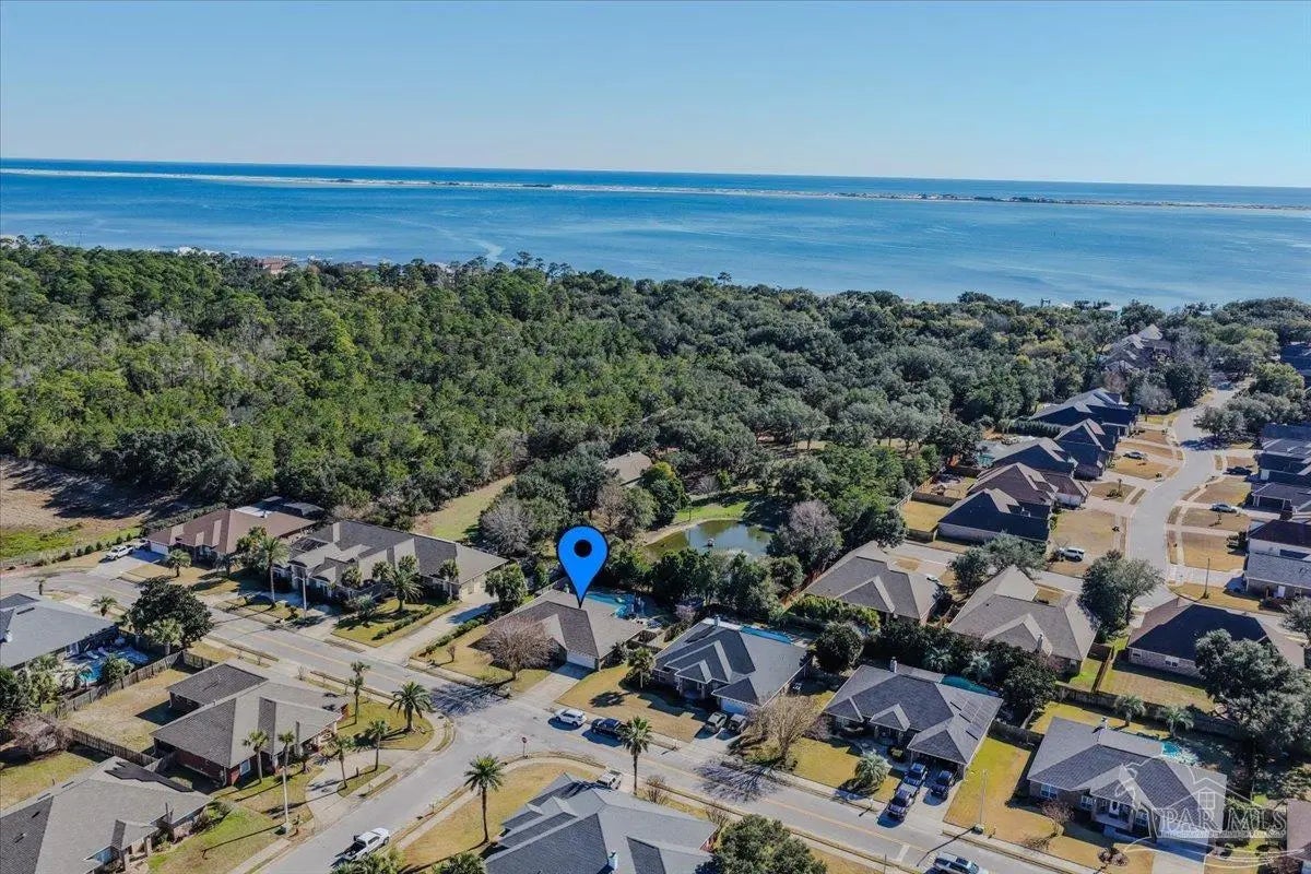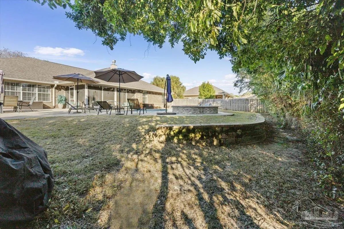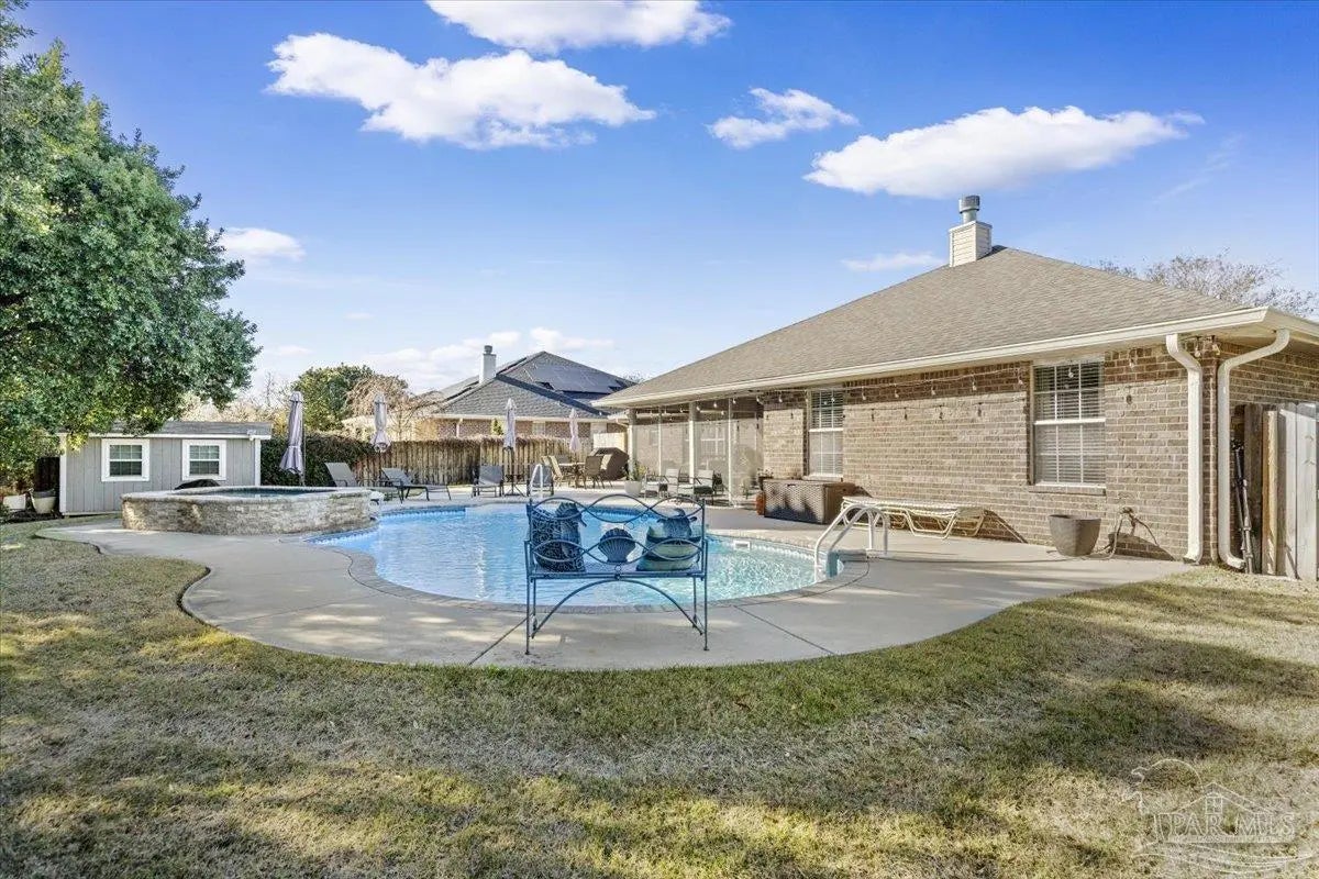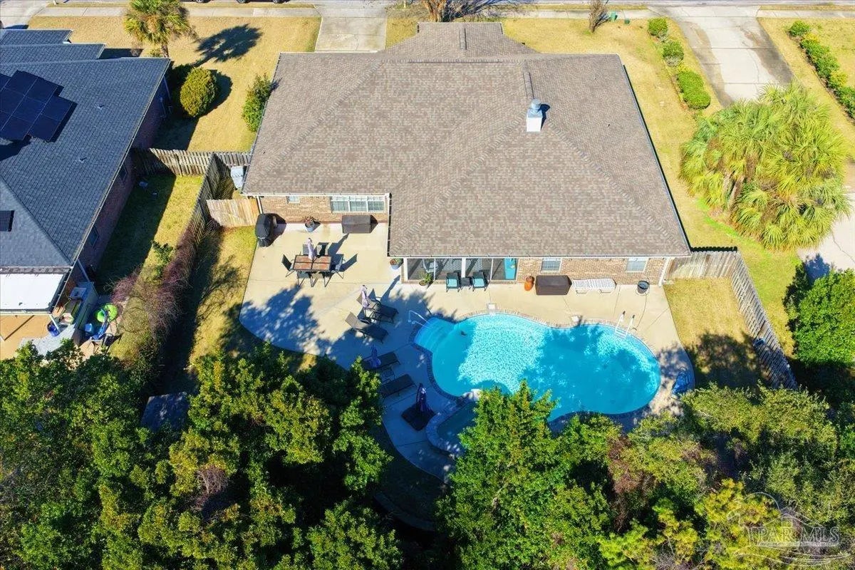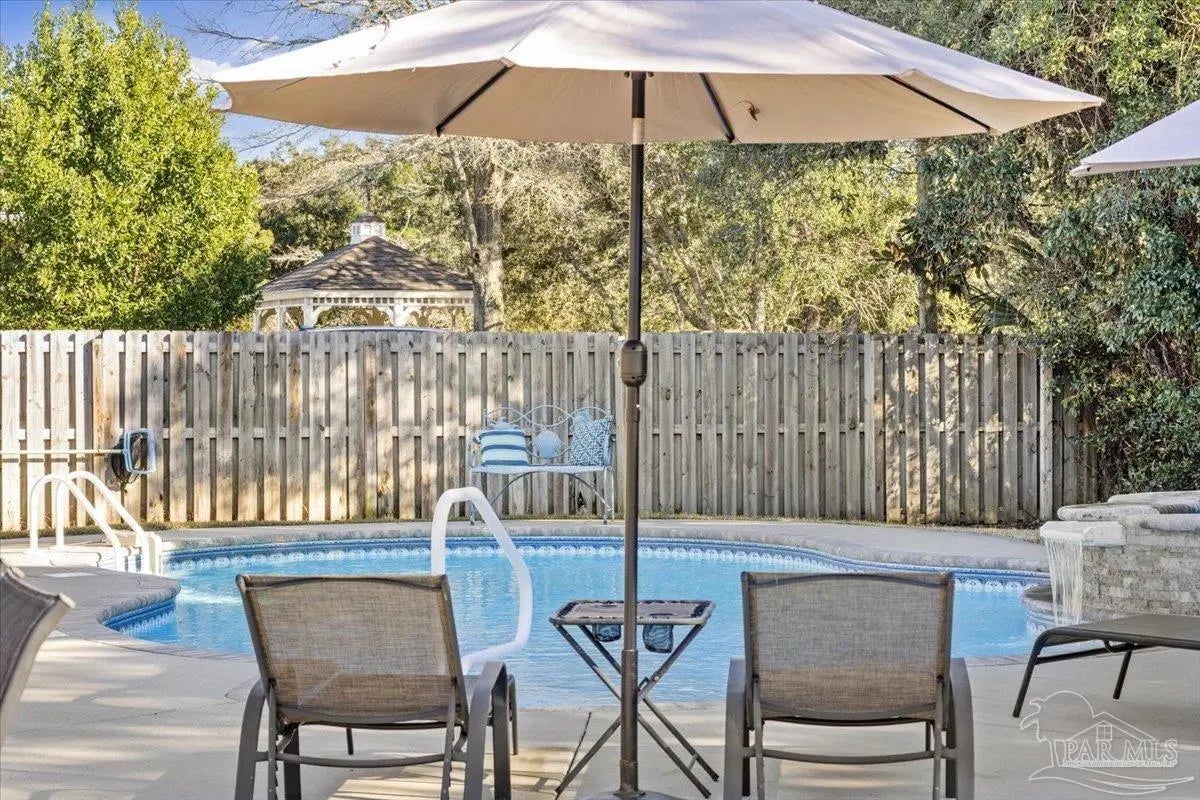Welcome to your peaceful retreat in Woodlawn Heights! This meticulously maintained, 4-bedroom, 2.5-bath home offers 2,548 square feet of move-in ready comfort in a quiet Gulf Breeze neighborhood. Inside, neutral colors and high ceilings create a bright, airy feel. The spacious great room features a cozy corner fireplace. The inviting kitchen has a breakfast bar, granite counterttops, updated stainless steel appliances and flows seamlessly into the dining area. The primary suite is a true sanctuary with a spacious bedroom, ensuite featuring double sinks, a soaking tub, a separate shower, and 2 walk-in closets. Your private backyard paradise features a heated saltwater pool (installed in 2022) that backs to no rear neighbors, with pond views, setting the tone for serene relaxation and entertaining. Enjoy the screened porch and a handy shed with electricity. Recent updates provide ultimate peace of mind: a new roof (2023), an epoxy-coated garage, a reclaimed-water sprinkler system, and a transferable termite bond. The established Woodlawn Heights community offers sidewalks, walking trails, a neighborhood park, an on-site middle school, and HOA amenities including boat/RV storage. Just a short drive away, experience the vibrant local lifestyle at The Eatery on Highway 98—a premier food truck park and community gathering spot where you can enjoy diverse local cuisine from rotating trucks and relax in a family and dog-friendly setting with games. This home perfectly combines privacy, modern updates, and fantastic community living.