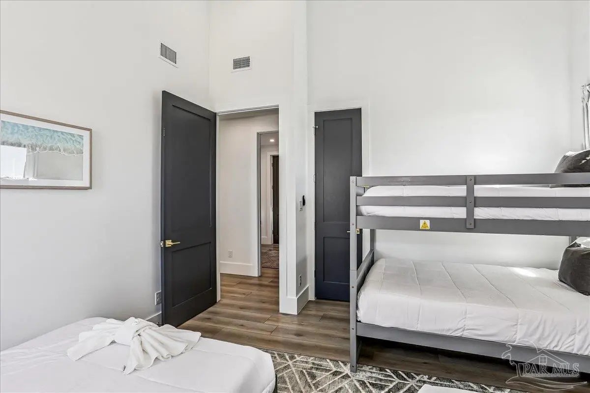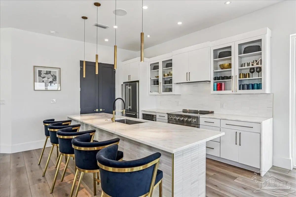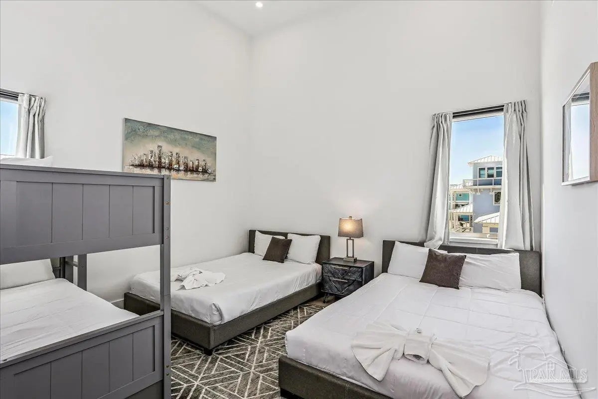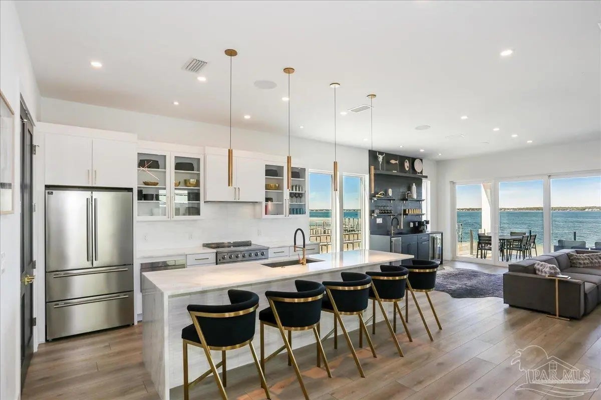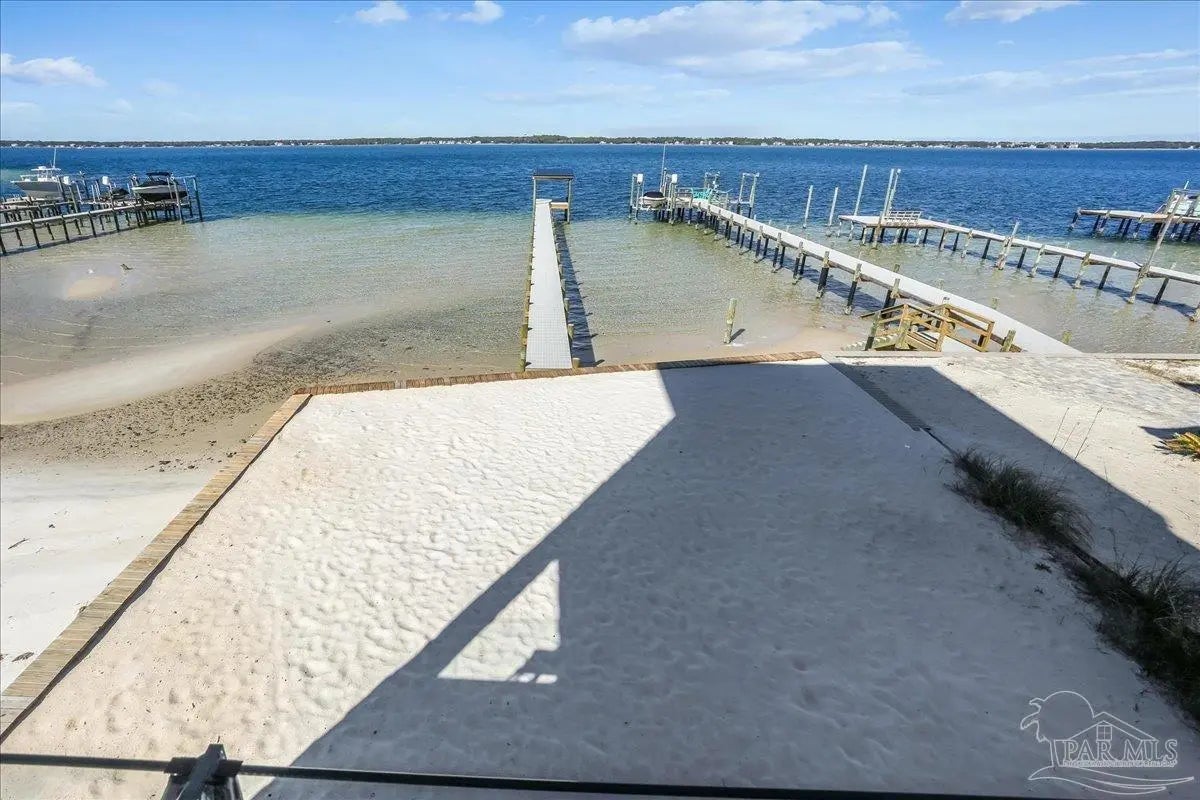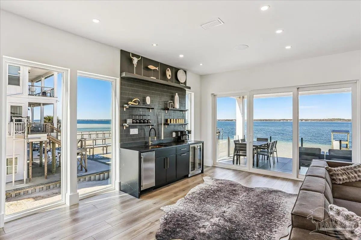 It’s all about the” lifestyle” of life at the beach on the water with your golf cart, your own sandy beach at your front door and your own dock. “Bay Life” exemplifies the ultimate in Waterfront living on the Santa Rosa Sound at Navarre Beach. Sleek contemporary fully furnished 5-bedroom, 4.5 bath retreat complete with Dock and Golf Cart, designed for effortless relaxation and unforgettable entertaining. Expansive open floor plan with soaring 10-ft to 14.5-ft ceilings and walls of windows, creating an open and airy atmosphere. The living area flows to spacious covered porch overlooking the water. The home is bathed in natural light enhancing its bright and welcoming ambience. Expansive living area seamlessly opens to the dining area with seating for 10 and the sophisticated wet bar with ice maker and wine cooler, perfect for entertaining. Fully equipped gourmet kitchen is a cooks dream with large quartz island seating 5, quartz counter tops, an abundance of tall soft close cabinetry and drawers, high end stainless appliances, and large walk-in pantry with custom wood shelving. Conveniently located to living area is a powder room. On the main living level is a spacious ensuite bedroom with tall windows and luxury bath with floor to ceiling tiled shower. Adjoining this area is flex area opening to another covered porch. You will elevate your experience with added convenience of an Elevator to all levels. On the third level is the Master suite with a wall of windows overlooking the water, soaring ceiling, two walk-in closets, quartz top double vanity, and floor to ceiling tiled shower. Next to the Master is laundry complete with laundry sink, washer, dryer, and cabinetry. Down the hall is ensuite bedroom with walk in closet, and an additional guest bedroom, bunk bedroom and guest bath with quartz top double vanity and tiled tub. Vacation Home or Investment sleeps 16. You will appreciate the attention to the luxury details in the grand sleek décor and furnishings.