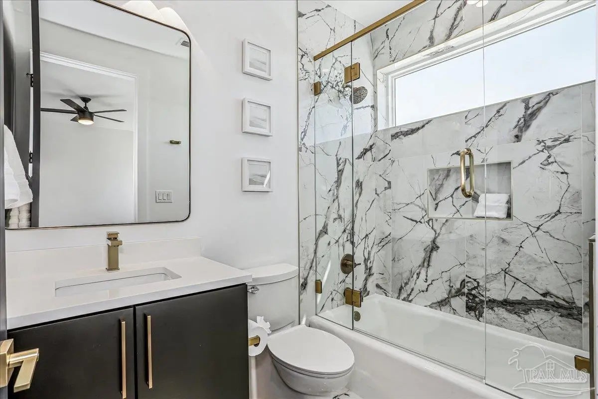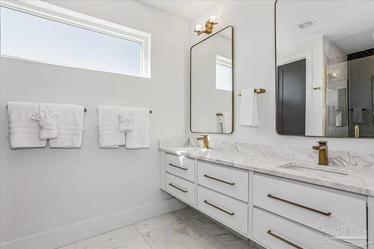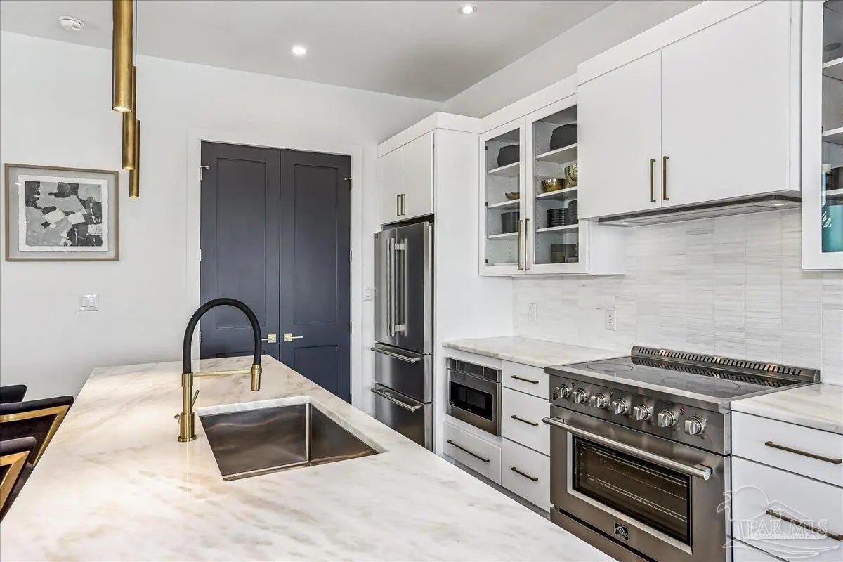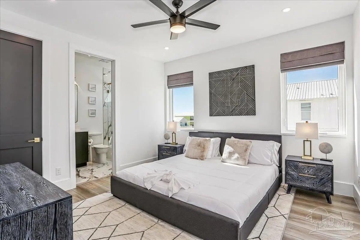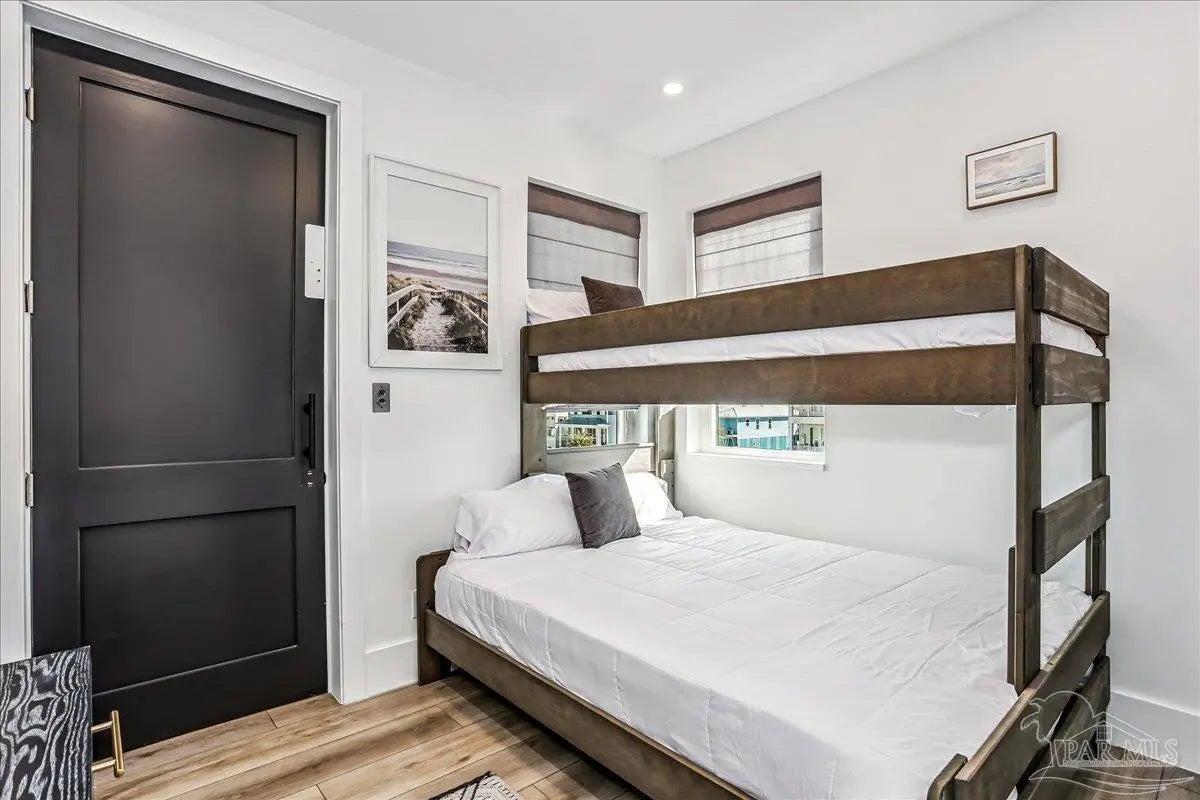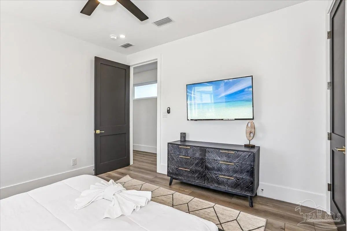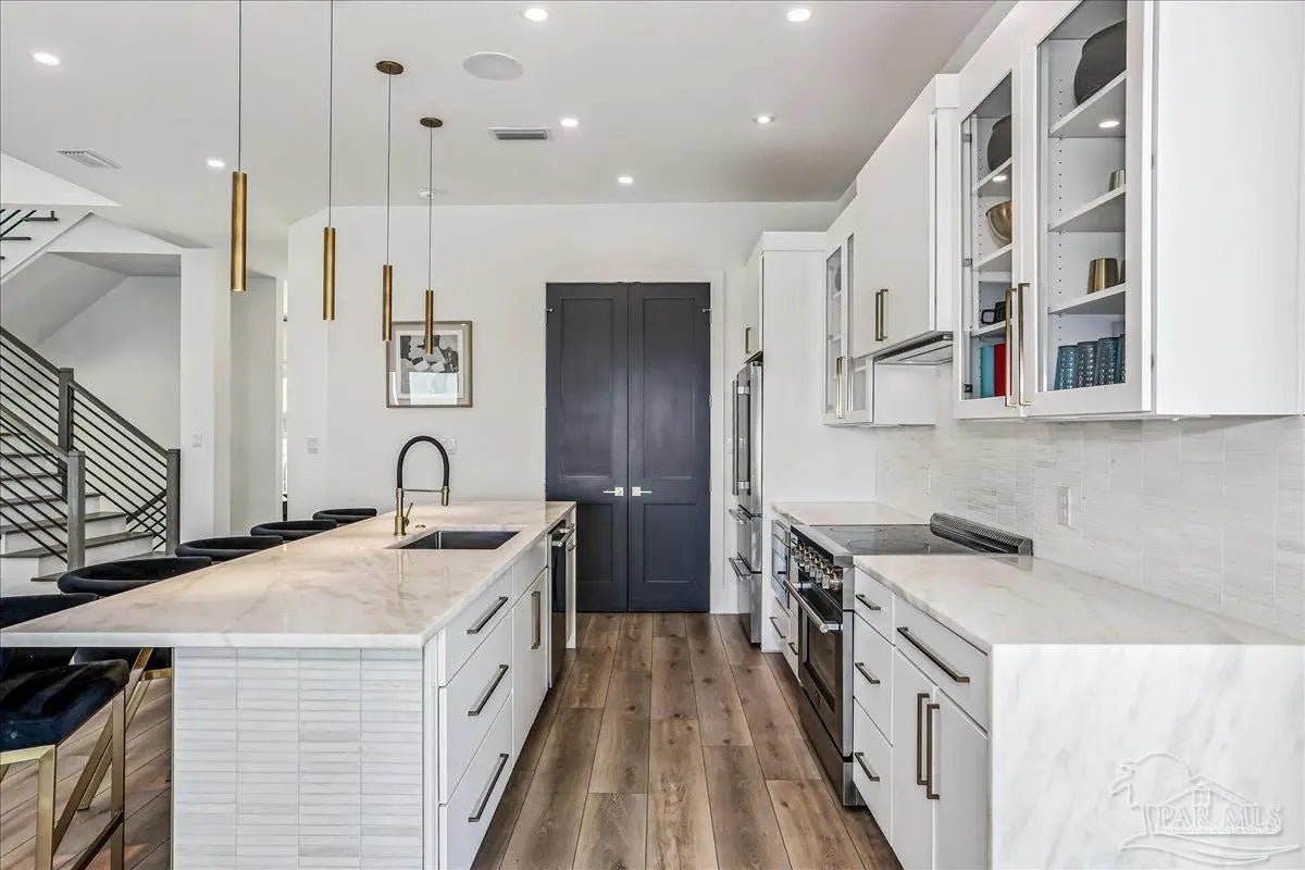 It’s all about the” lifestyle” of life at the beach on the water with your golf cart, your own sandy beach at your front door and your own dock. “Bay Life” exemplifies the ultimate in Waterfront living on the Santa Rosa Sound at Navarre Beach. Sleek contemporary fully furnished 5-bedroom, 4.5 bath retreat complete with Dock and Golf Cart, designed for effortless relaxation and unforgettable entertaining. Expansive open floor plan with soaring 10-ft to 14.5-ft ceilings and walls of windows, creating an open and airy atmosphere. The living area flows to spacious covered porch overlooking the water. The home is bathed in natural light enhancing its bright and welcoming ambience. Expansive living area seamlessly opens to the dining area with seating for 10 and the sophisticated wet bar with ice maker and wine cooler, perfect for entertaining. Fully equipped gourmet kitchen is a cooks dream with large quartz island seating 5, quartz counter tops, an abundance of tall soft close cabinetry and drawers, high end stainless appliances, and large walk-in pantry with custom wood shelving. Conveniently located to living area is a powder room. On the main living level is a spacious ensuite bedroom with tall windows and luxury bath with floor to ceiling tiled shower. Adjoining this area is flex area opening to another covered porch. You will elevate your experience with added convenience of an Elevator to all levels. On the third level is the Master suite with a wall of windows overlooking the water, soaring ceiling, two walk-in closets, quartz top double vanity, and floor to ceiling tiled shower. Next to the Master is laundry complete with laundry sink, washer, dryer, and cabinetry. Down the hall is ensuite bedroom with walk in closet, and an additional guest bedroom, bunk bedroom and guest bath with quartz top double vanity and tiled tub. Vacation Home or Investment sleeps 16. You will appreciate the attention to the luxury details in the grand sleek décor and furnishings.