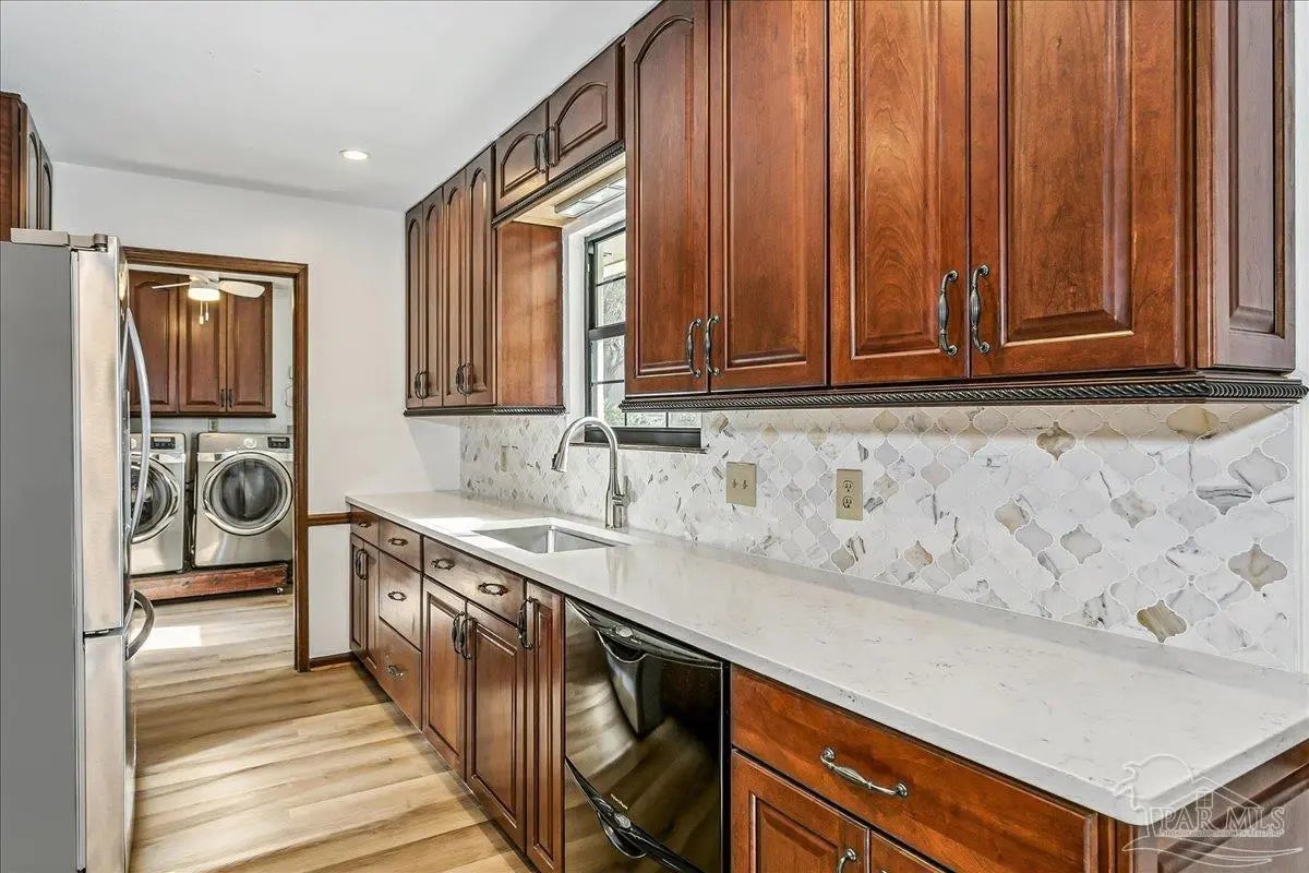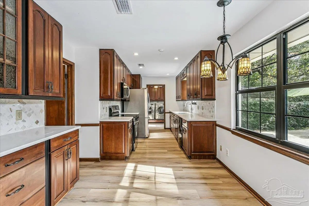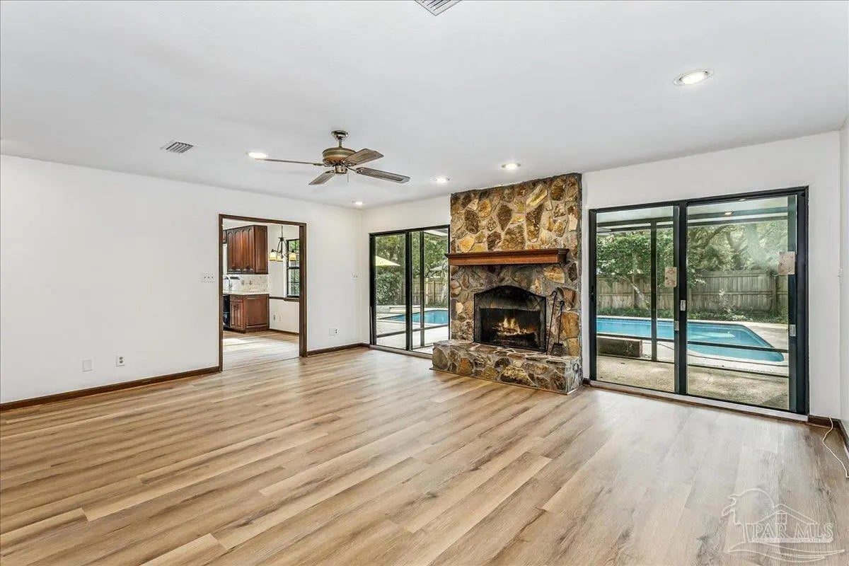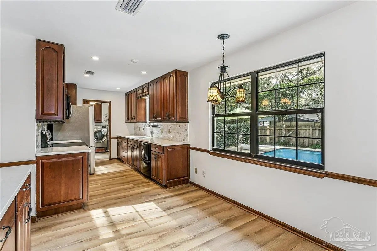Welcome home! Located in beautiful Gulf Breeze, this four bedroom two bathroom residence featuring a LARGE, sparkling gunite private swimming pool and a functional layout with large bedrooms is the place for you. The property is situated in the sought after, quiet Whisper Bay neighborhood which is known for the gorgeous southern live oaks lining the streets. Meticulously maintained, this home is move in ready. New backsplash and counters in the kitchen with newer appliances. The kitchen pantry and lower cabinets are equipped with pull-out organizational shelves. Newer kitchen appliances, new flooring throughout, new paint, 2021 Roof, new hot water heater, and brand new pool pump are just a few of the upgrades that make this house a home. Great proximity to top rated schools and the Naval Live Oaks Nature Preserve (nature trails and access to the Sound and Pensacola Bay!) while remaining just minutes from the white sands of Pensacola Beach. A screen porch overlooks the backyard patio and provides ample space for outdoor entertaining around the pool. This home has a large lot with plenty of privacy and mature landscaping as well as gutters with leaf protection. Also, a shed is tucked back in the back yard for extra storage! Hurricane mitigation (roof, garage door, storm shutters) via Rebuild NW Florida. This home represents a perfect opportunity to enjoy the coastal lifestyle of Gulf Breeze!