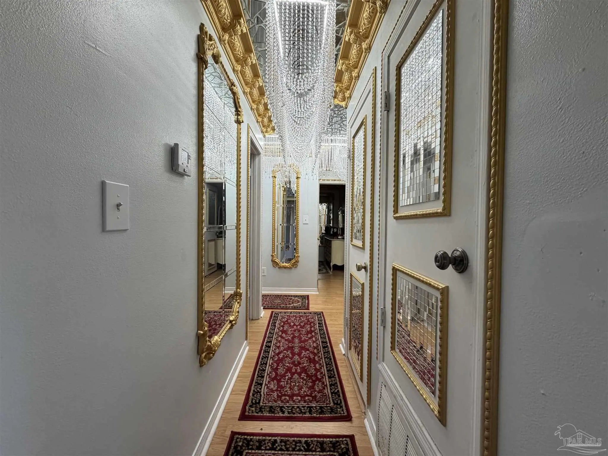 This single-story brick residence offers a spacious front yard with mature trees and a distinctive yellow-accented two-car garage. The gently sloped driveway features decorative edging and a vintage-style lamp post, providing curb appeal with character. Inside, the home showcases a unique, custom interior with ornate finishes throughout. The formal living room is adorned with gold-trimmed mirrors, velvet tufted seating, and a dramatic crystal chandelier. An elaborate fireplace surround with mirrored accents anchors the space, complemented by wood-style flooring and lace window treatments. The kitchen features mirrored and gold-detailed cabinetry, tile flooring, and stainless steel appliances. A large crystal chandelier and mosaic ceiling continue the opulent style into the adjacent dining area, which offers natural light and a circular table setting. The formal dining room offers an expansive space for hosting, with a long table beneath another show-stopping crystal ceiling fixture, framed by rich wood furniture and detailed crown molding. Multiple bedrooms reflect the home's ornate design, with mirrored wall panels, decorative trim, and statement light fixtures. Hallways are finished with red runners and matching gold-accented mirrors, maintaining visual continuity throughout the layout.