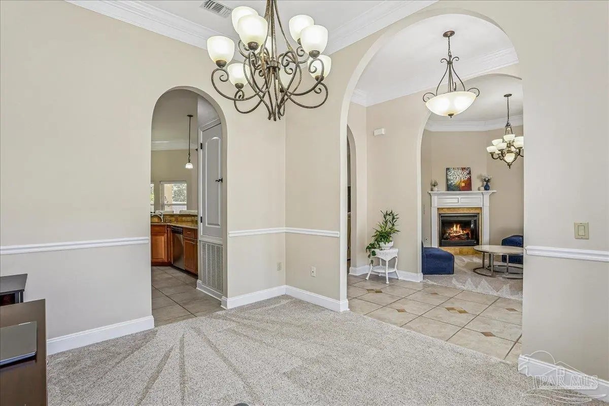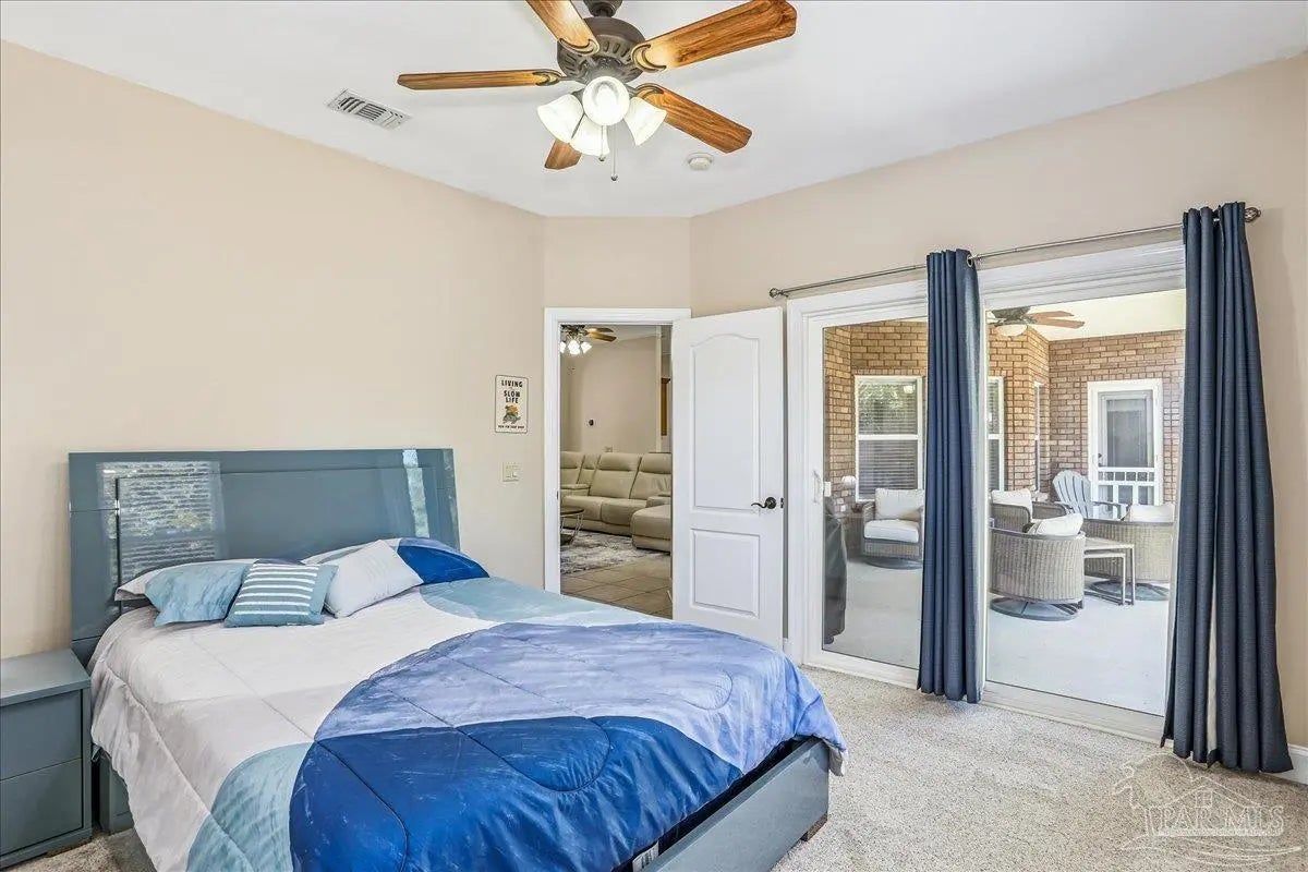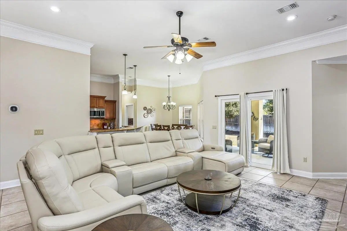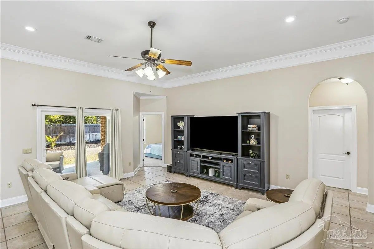 Soundside custom home with stunning Intracoastal views and private water access. Just 13 miles to Hurlburt Field and 3 miles to Navarre Beach. This well-maintained 4-bedroom home features a Great Room, office, formal dining room, high ceilings with crown molding, tile floors and a gas fireplace. Kitchen with granite counters, stainless appliances, tile backsplash, breakfast bar, huge corner pantry and dining area. Primary suite opens via double doors to the covered patio; bath offers soaking tub, separate cultured-marble shower with bench, dual vanities, water closet and massive walk-in closet. Three additional spacious bedrooms, laundry/mud room with front-load washer & dryer, sink and cabinets. Smart features include Ecobee thermostat and doorbell camera. Relax on the covered patio or front porch with water views, lush landscaping and fruit trees. Room for a pool; gutters and stained concrete; natural gas. New neighborhood waterfront dock where you can enjoy fishing, swimming, kayaking and sunsets steps from your door. Upgrades include new carpet, all interior paint, new sliding doors in two bedrooms, refrigerator (2 years old), new gas water heater, new light fixtures in bedrooms and new blinds in all rooms throughout the home. Don't miss out on this gorgeous home, call for a showing today!