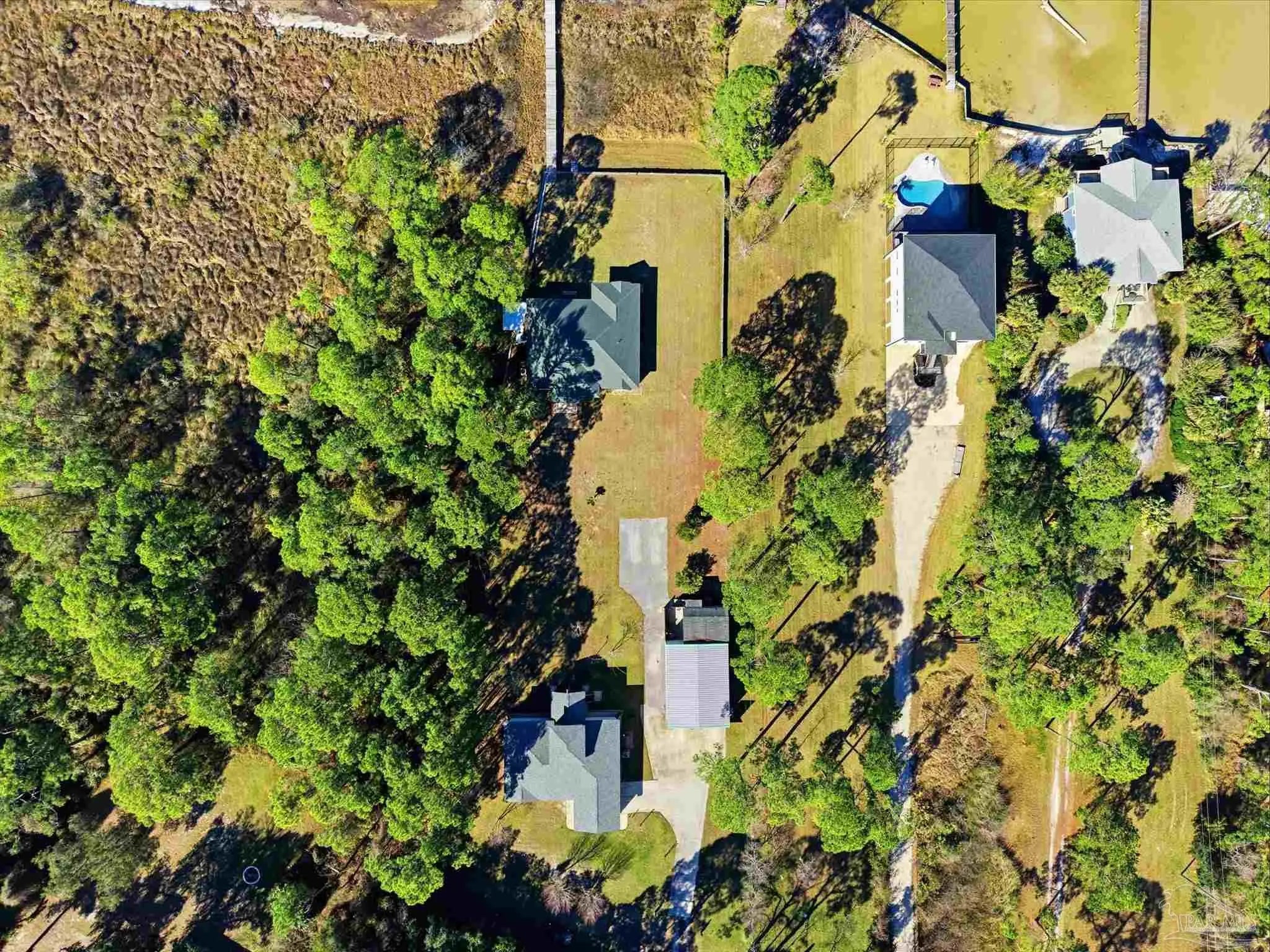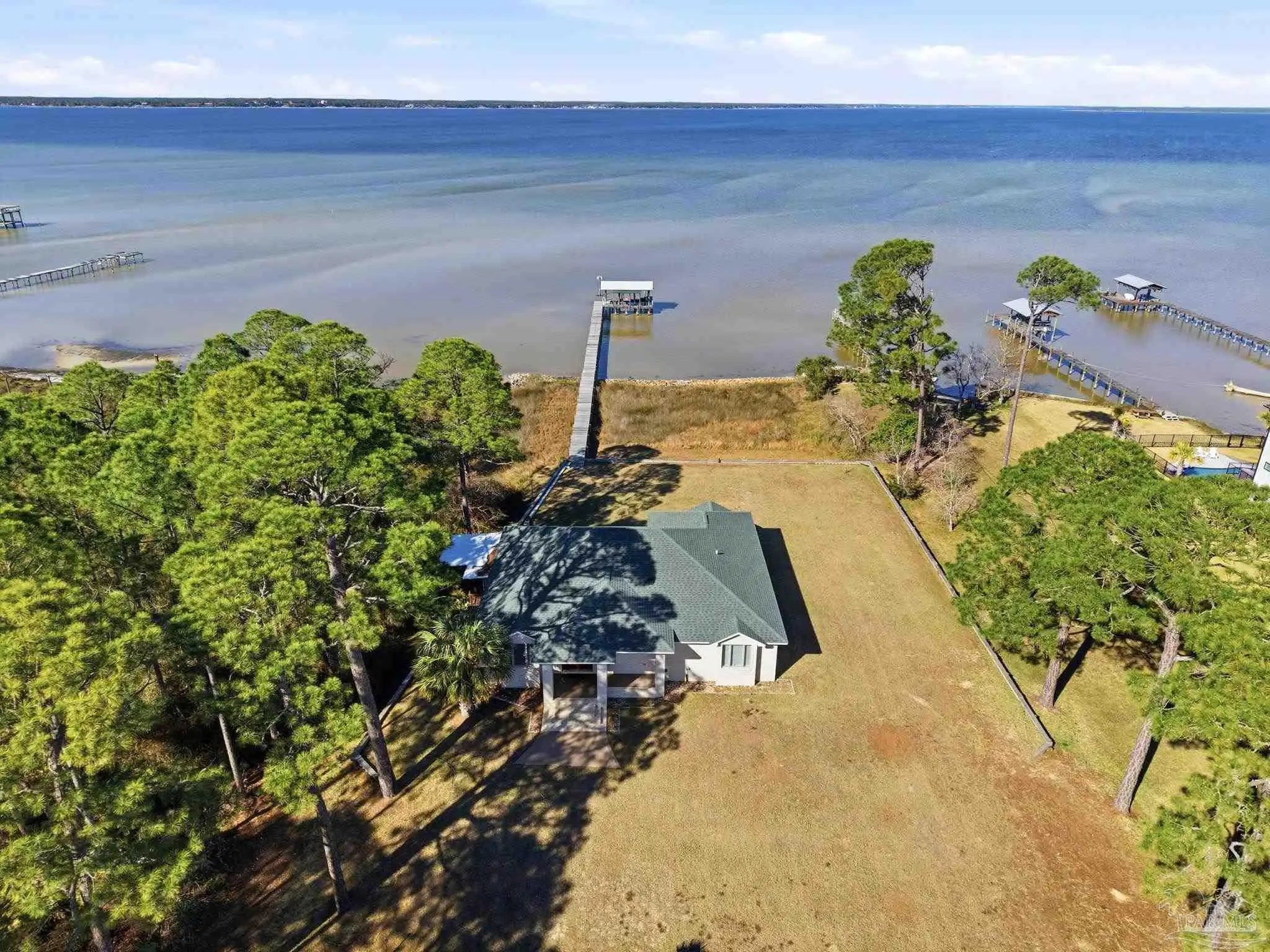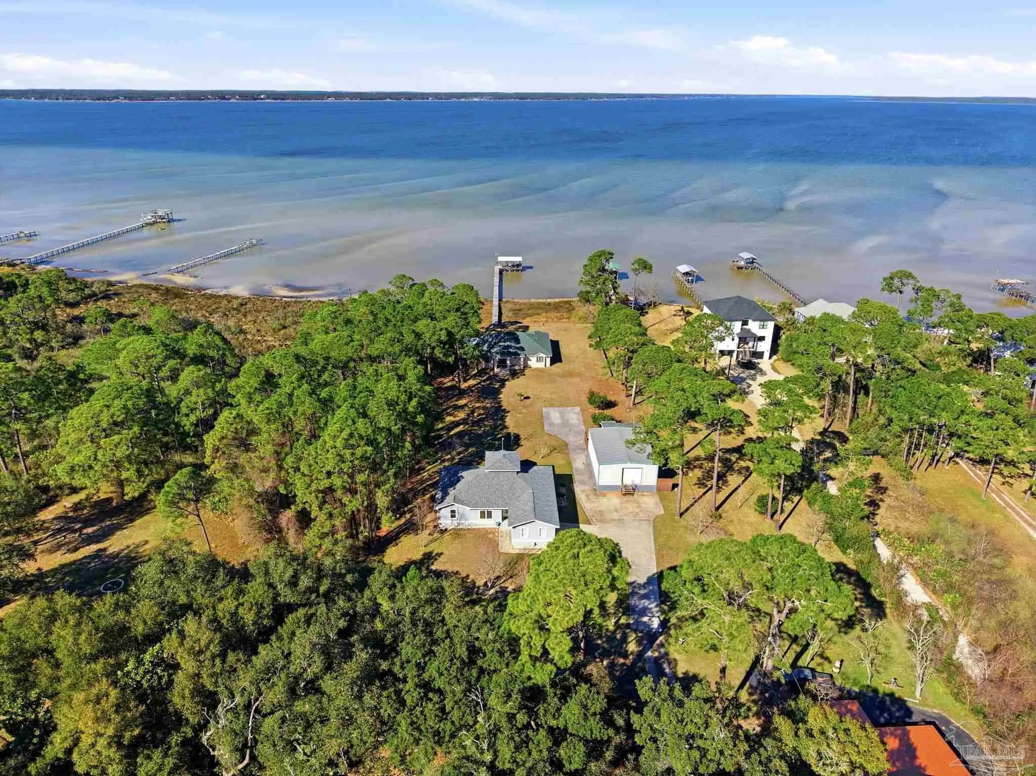 Experience exceptional waterfront living on Perdido Bay with this beautifully appointed coastal retreat designed to maximize views, comfort, & the boating lifestyle. The property offers 2 homes & a 30X40 warehouse/workshop with electricity and water. Along the water’s edge, a substantial 120-foot riprap rock wall stabilizes the shoreline, while the property is further secured by a 327-foot, four-foot-high retaining wall constructed as a seawall that surrounds the property on three sides. This thoughtfully engineered system provides added peace of mind while preserving the integrity & beauty of the waterfront setting. A pier with boat lift, boathouse & fish cleaning station with electric & water make this property ideal for avid boaters & anglers. Inside the waterfront home, a spacious open-concept living, dining, & kitchen area is perfectly positioned to capture sweeping bay views from every angle. The kitchen showcases granite countertops, stainless steel appliances, & custom solid maple cabinetry, thoughtfully designed for both functionality & entertaining. The living room features custom built-in cabinetry & a propane fireplace, creating a warm yet refined gathering space overlooking Perdido Bay. The primary suite is a true waterfront sanctuary with a trey ceiling, recessed lighting, stunning bay views, & private access to the porch. The ensuite bath is elegantly finished with travertine countertops, a jetted tub, custom ceramic sinks with dual vanities, & a walk-in shower with bench & dual showerheads. Enjoy coastal breezes from the covered L-shaped back porch and the 14’ x 14’ screened porch. Major updates include a new water heater (2025), HVAC (2020), & roof (2021), offering peace of mind for years to come. This Perdido Bay waterfront property seamlessly blends luxury, durability, and an unbeatable boating lifestyle. If 14918 home is sold separately, it will be $500,000 and an access easement will be granted.