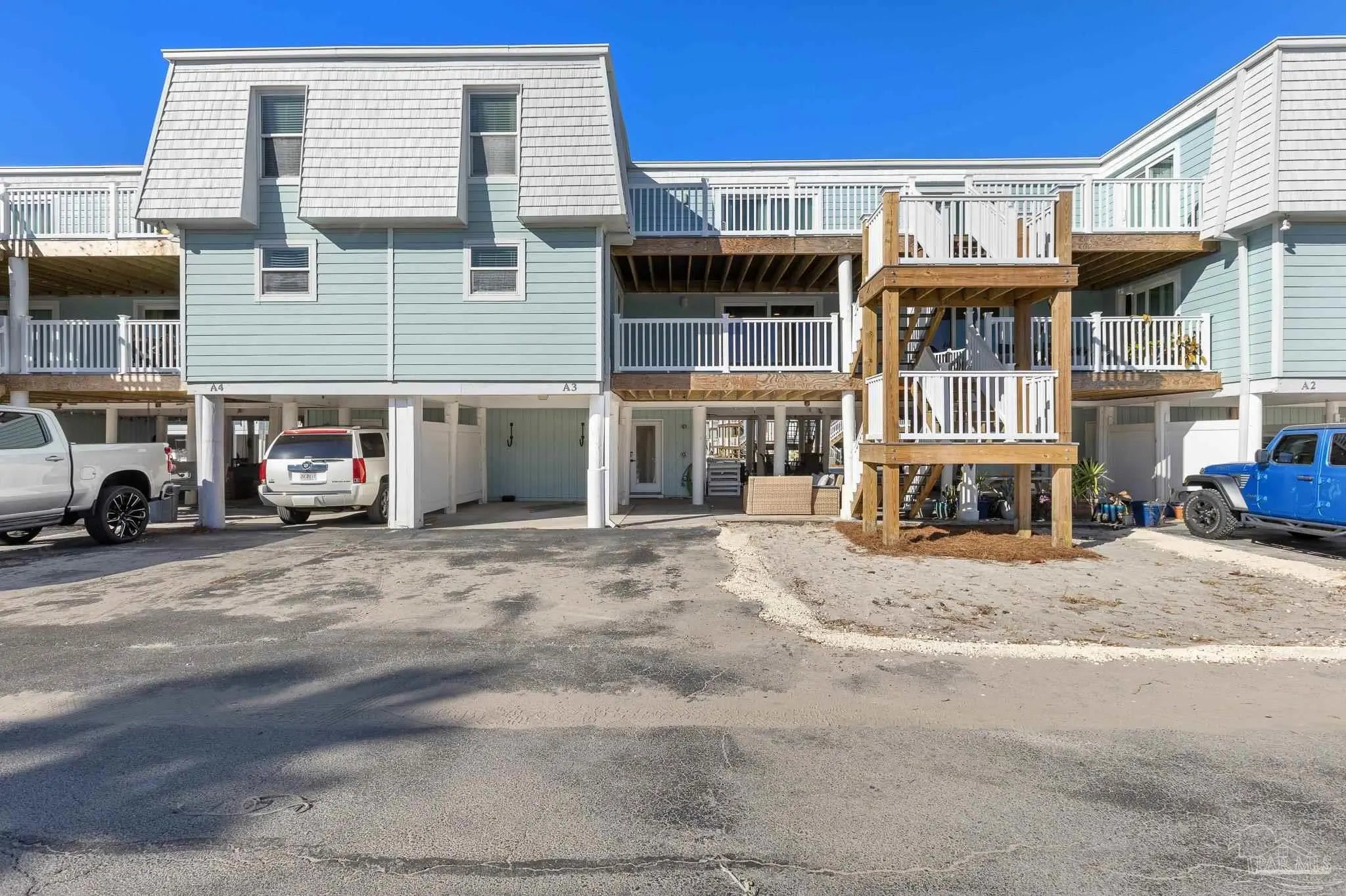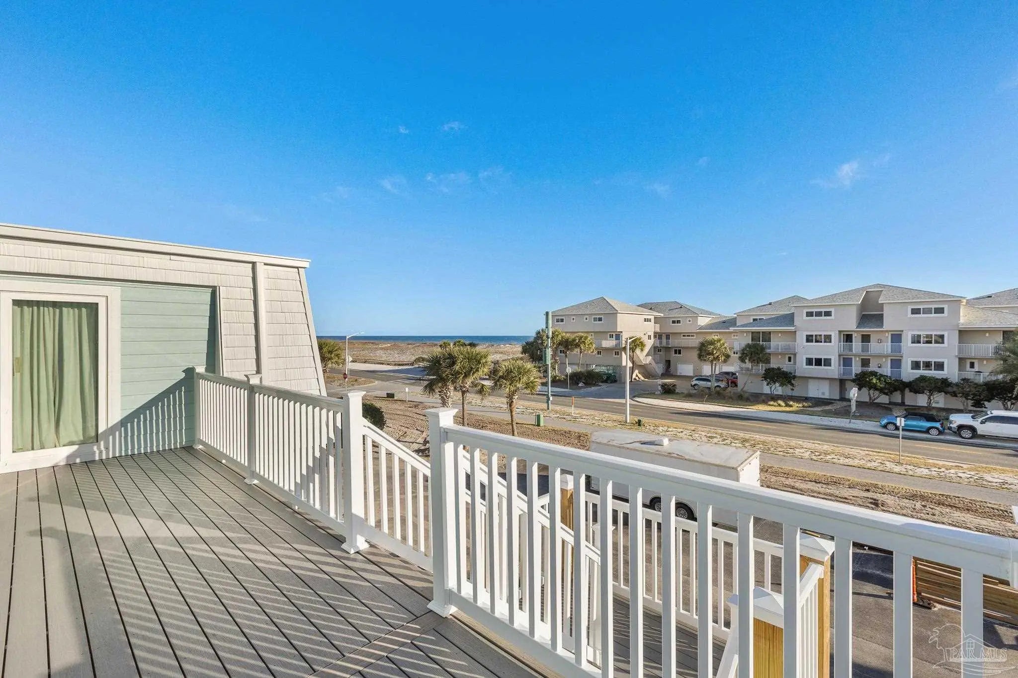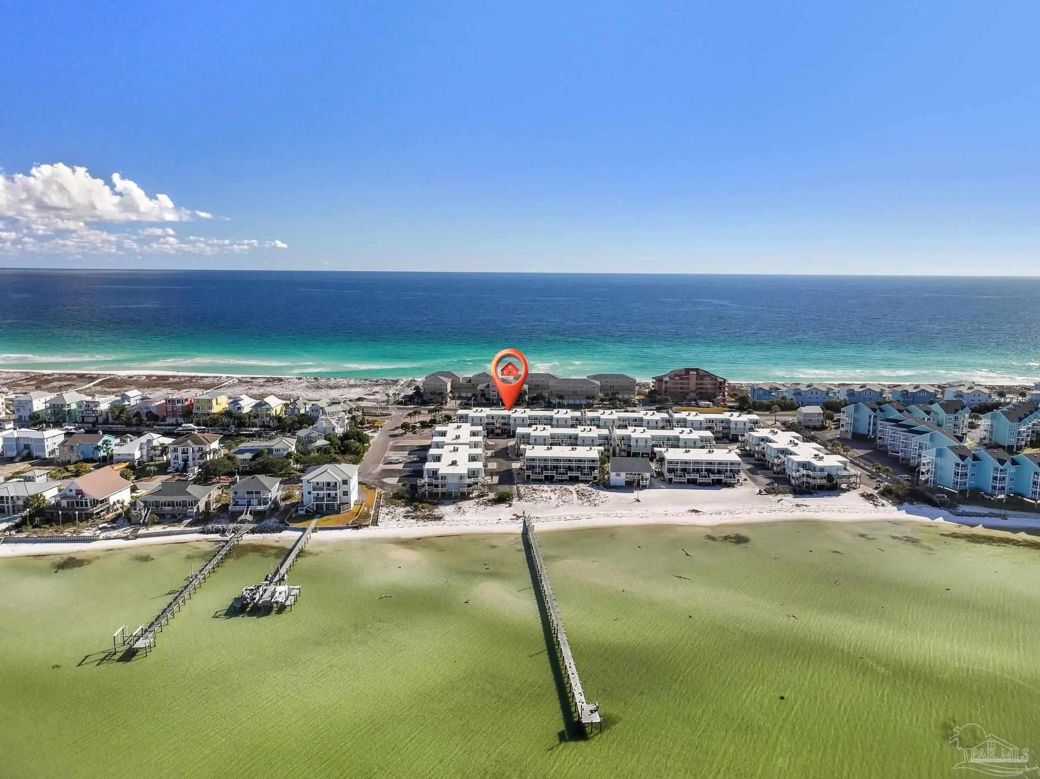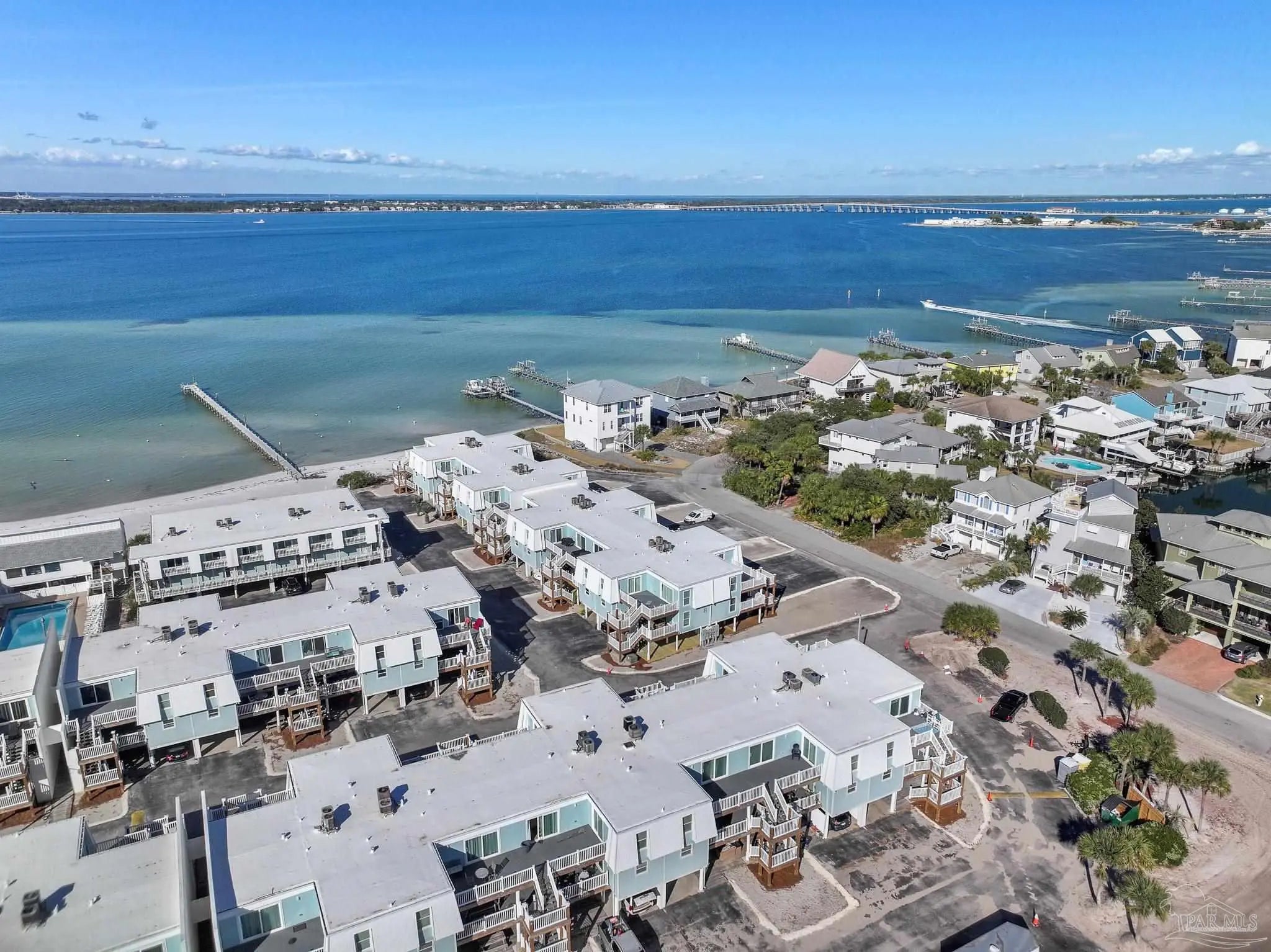 Calling all snowbirds, or anyone that loves a good investment opportunity! Welcome to Boardwalk A3, a turnkey, thoughtfully updated, beach retreat where modern comfort meets laid-back coastal living. Perfectly positioned between the Santa Rosa Sound and the Gulf of Mexico, this 2-bedroom, 3-bath condo puts you right in the heart of Pensacola Beach—close enough to everything, yet peaceful and relaxing the moment you arrive. Inside, the condo has a fresh, modern beach vibe with recent updates throughout. The open-concept living space is bright and inviting, ideal for unwinding after a day on the water or gathering for movie nights. The beautifully renovated kitchen features newer stainless-steel appliances, quartz countertops, a tiled backsplash, and an oversized island with seating—perfect for cooking, snacking, and connecting with guests. Upstairs, the primary suite offers a renovated private bath, and its own balcony with Gulf views—your personal spot for morning coffee or evening breezes. The second bedroom is perfect for additional guests, with access to a recently renovated bathroom equipped with jetted tub. Step outside and enjoy the best of the Boardwalk community: private Soundside beach access, a fishing dock, a large pool, and even a volleyball court, all just steps from your door. After a day in the sun, relax on the covered patio with dinner and drinks as the sky glows over the Sound. Two private balconies, covered parking, beach-gear storage, and an in-unit washer and dryer make your stay effortless and comfortable. Stylish, updated, and ideally located, Boardwalk A3 is the perfect home base for your next Pensacola Beach getaway.