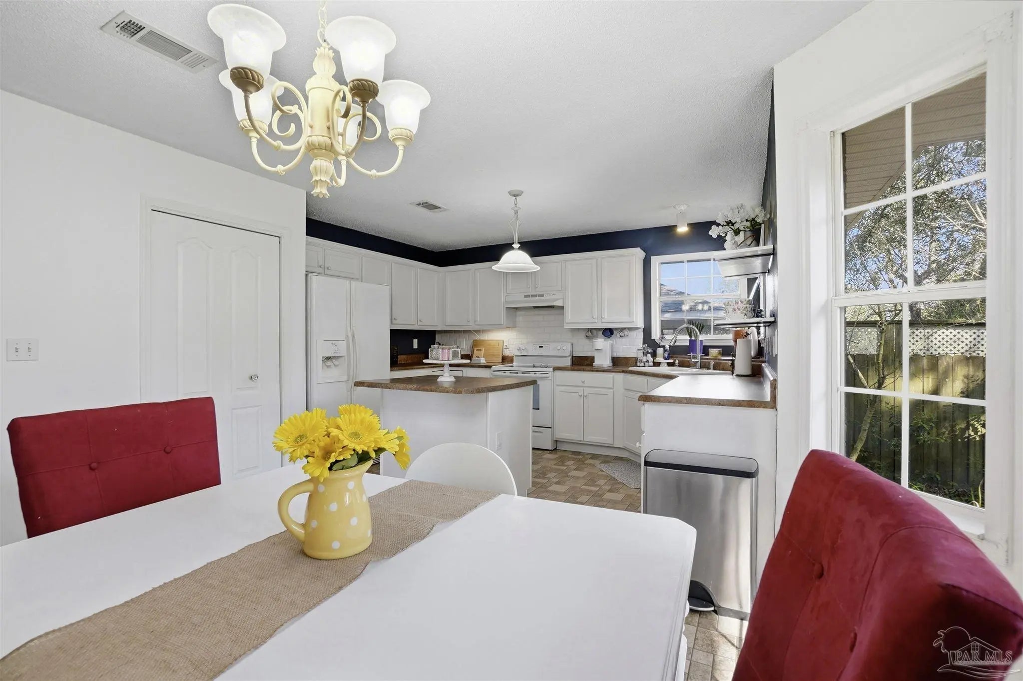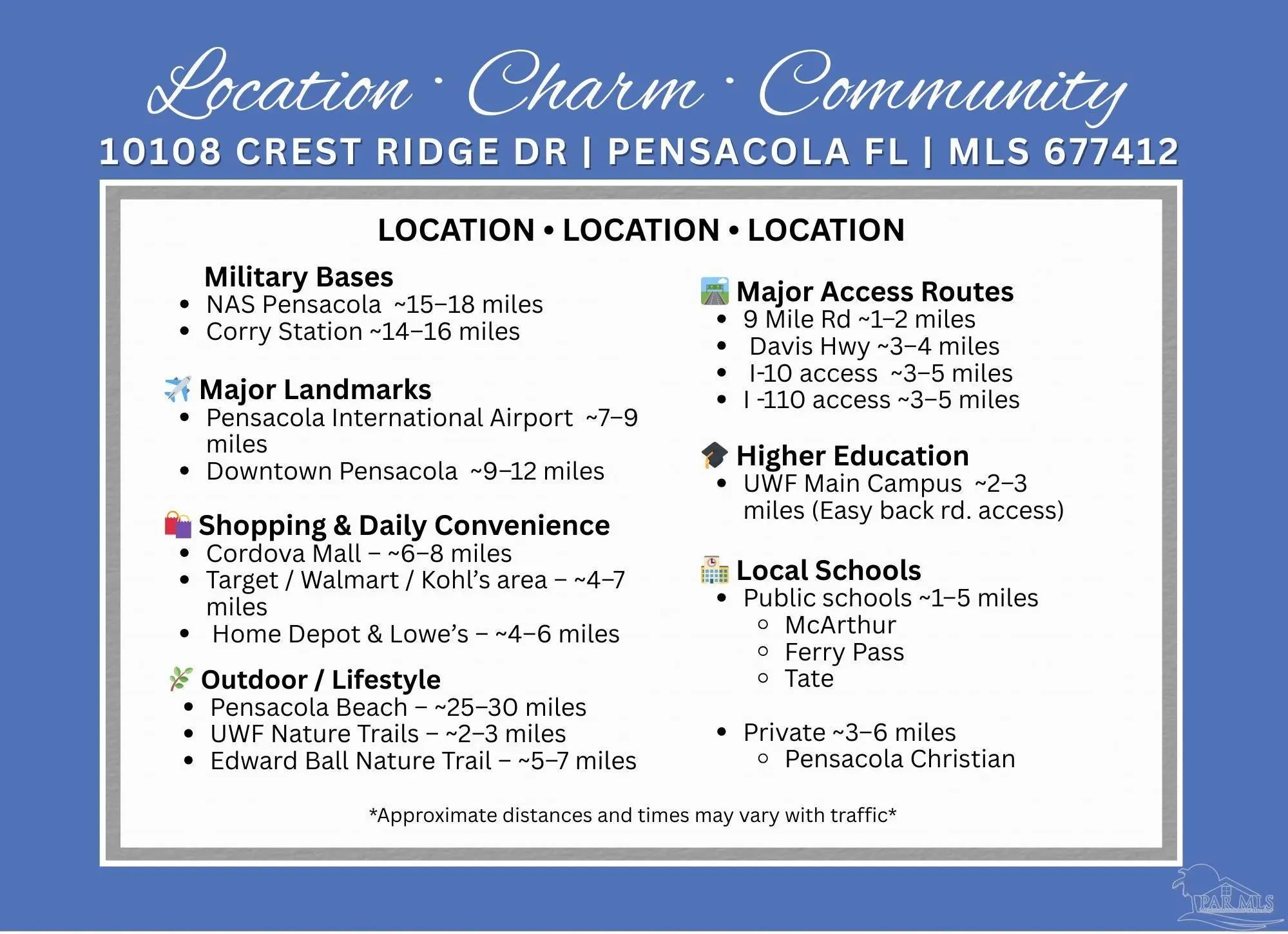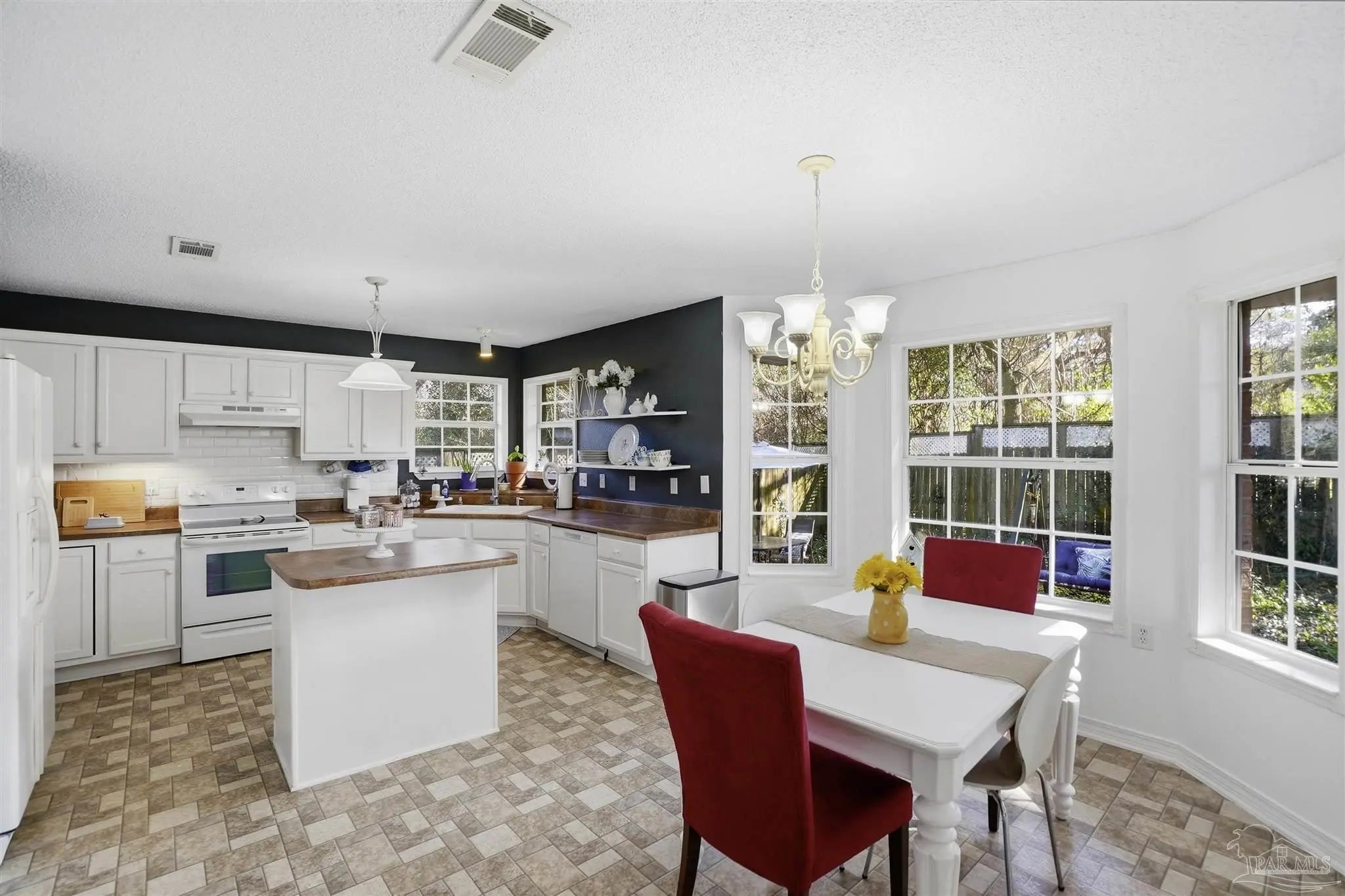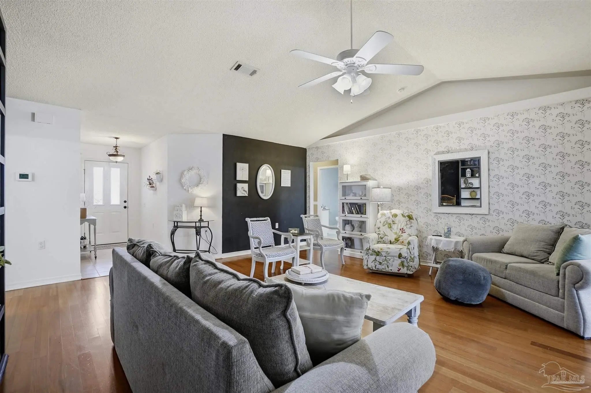 Welcome to this well-maintained, all-brick home in Waterford Place, a sidewalk-lined neighborhood known for its convenience and charm. Enjoy quick access to shopping, popular restaurants, major interstates, and Pensacola’s renowned white-sand beaches. A tiled foyer leads into a spacious great room featuring cathedral ceilings, a ceiling fan, built-in bookcases, and French doors that open to the covered back porch. This bright, open space is ideal for both everyday living and effortless entertaining. The fully equipped kitchen includes an island, abundant cabinetry, and a seamless flow into the breakfast nook. A bay window frames peaceful views of the backyard, creating the perfect spot for casual meals or morning coffee. The primary suite offers a generous layout with a tray ceiling and ceiling fan. Its ensuite bathroom provides excellent functionality with two closets, a double vanity, a garden tub, a separate shower, and a private water closet. Additional bedrooms are well-sized and arranged within a split floor plan for added privacy. Throughout the home, you’ll find durable hard-surface flooring, no carpet. Additional highlights include a 2-car garage with a utility sink, a sprinkler system, and a privacy-fenced backyard. The covered back porch offers a quiet space to unwind or entertain outdoors. Major update includes a roof replacement in 2021. This is a solid, well-cared-for home in a desirable location, move-in ready and waiting for its next owner. Schedule your personal tour today.
