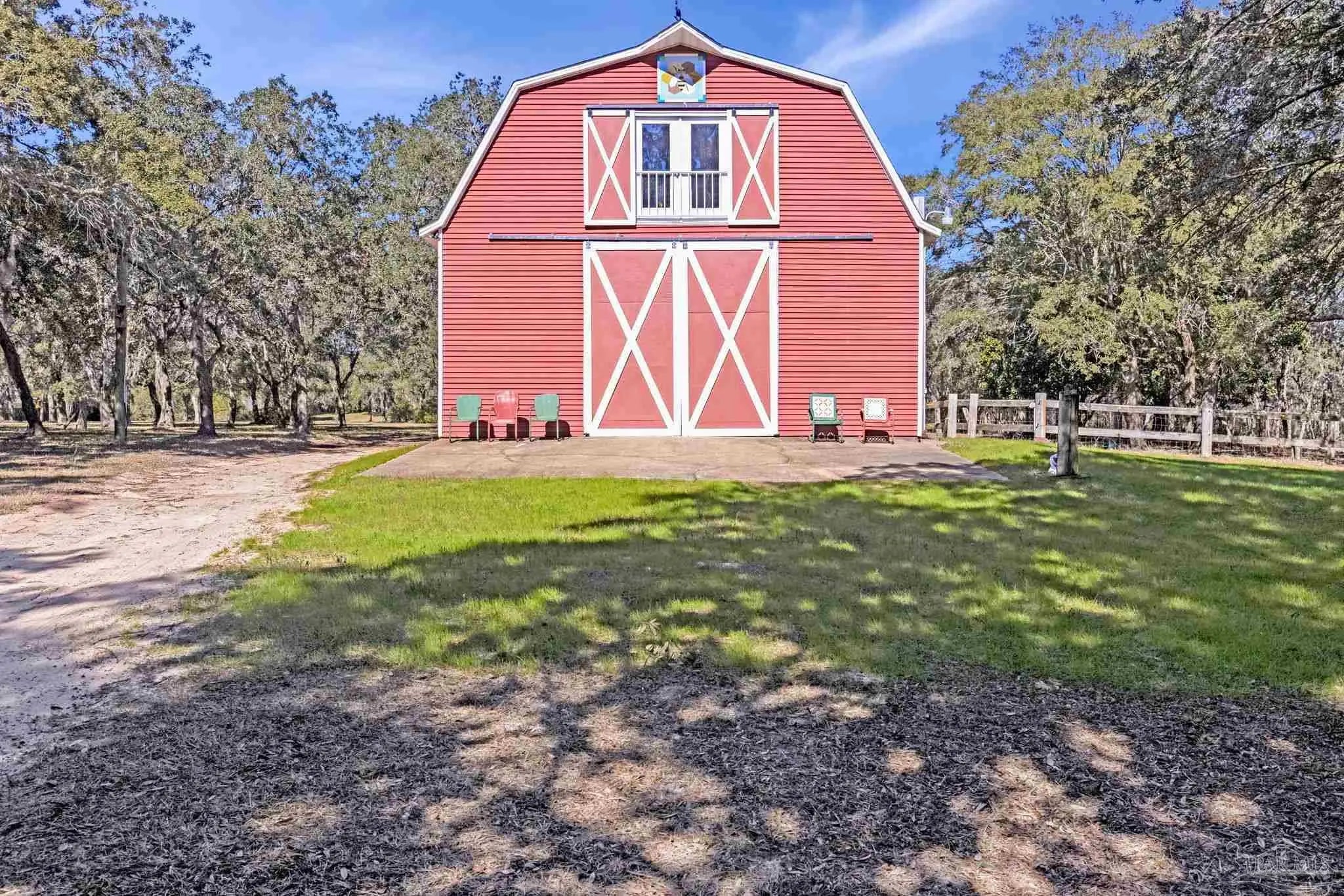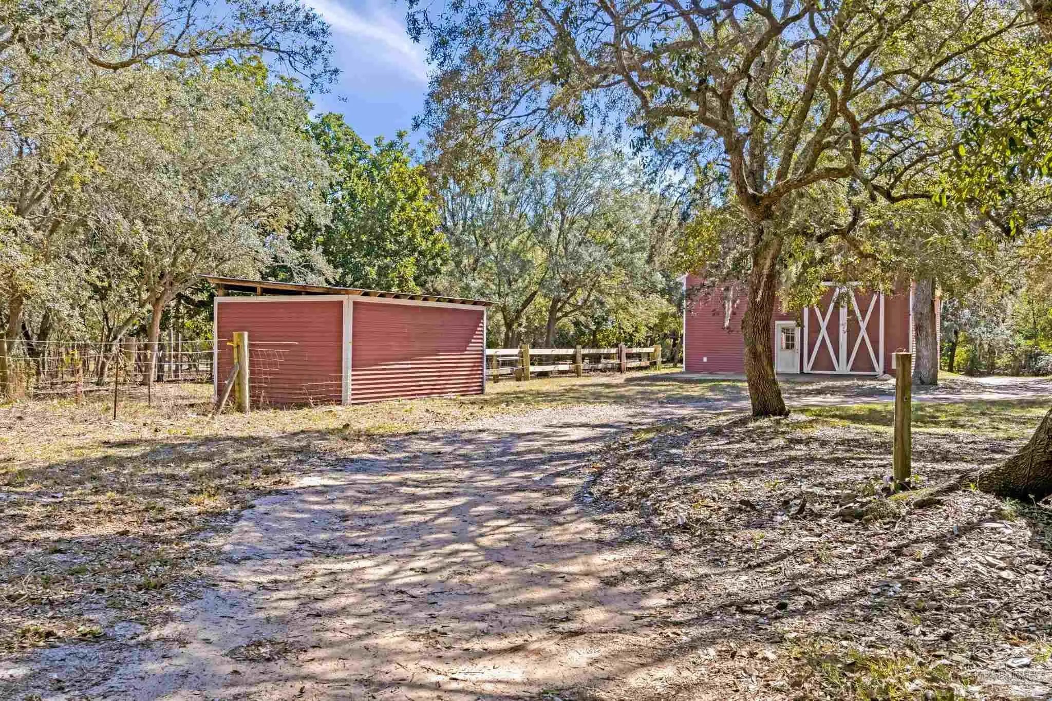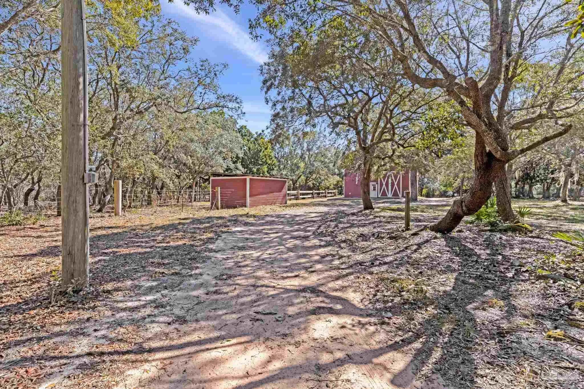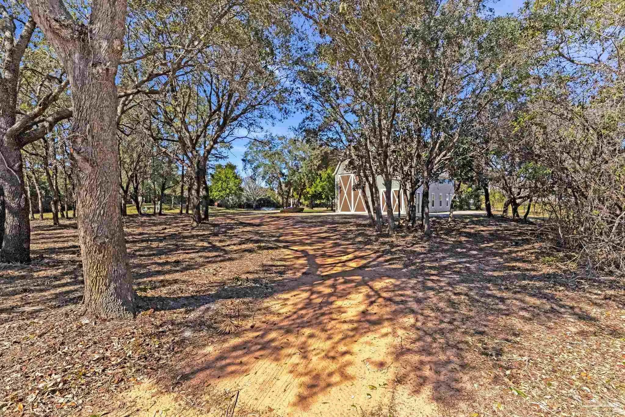 Welcome to your own private retreat right here in Gulf Breeze, and what a truly rare find it is. Properties like this almost never come available. This find offers over 11 beautiful, high-and-dry acres with mature trees, open pastures, and peaceful pockets of nature. You'll feel a world away, while still being just minutes from town and beaches. This is the kind of property where life slows down, and memories are made. Picture mornings sitting on the porch sipping coffee while watching the sun rise over the sound and evenings relaxing by the pond as the sun sets, watching herons and ducks float by. Wide open spaces for all the animals and hobbies you have dreamed of, with a fenced paddock and pasture for horses, goats, and more. This land is usable and thoughtfully laid out with two barns, one of which features an accessory unit ideal for a guest or private studio apartment. The large lap pool offers a perfect spot to cool off on warm Florida days. As you drive across your private wooden bridge over a meandering creek, there is an immediate sense of calm that sets the tone for the entire property. The custom-built brick home feels straight out of a storybook, welcoming you with an expansive front porch and a warm, inviting foyer. Inside, you find a formal dining room, a dedicated office, and a living room with dark hardwood floors and a fireplace. It is the perfect place to unwind at the end of the day. The kitchen features abundant wood cabinetry, black appliances, an island, and a breakfast nook. From there, there is easy access to the laundry room and an oversized side-entry two-car garage. Upstairs, the spacious primary suite offers its own fireplace, while the primary bathroom features double vanities, a tiled walk-in shower, dual closets, and an oversized soaking tub looking out to your private sanctum. There are two additional spacious bedrooms that share a full bath. Plus, a separate guest suite with a private entrance includes a mini kitchen and bath.