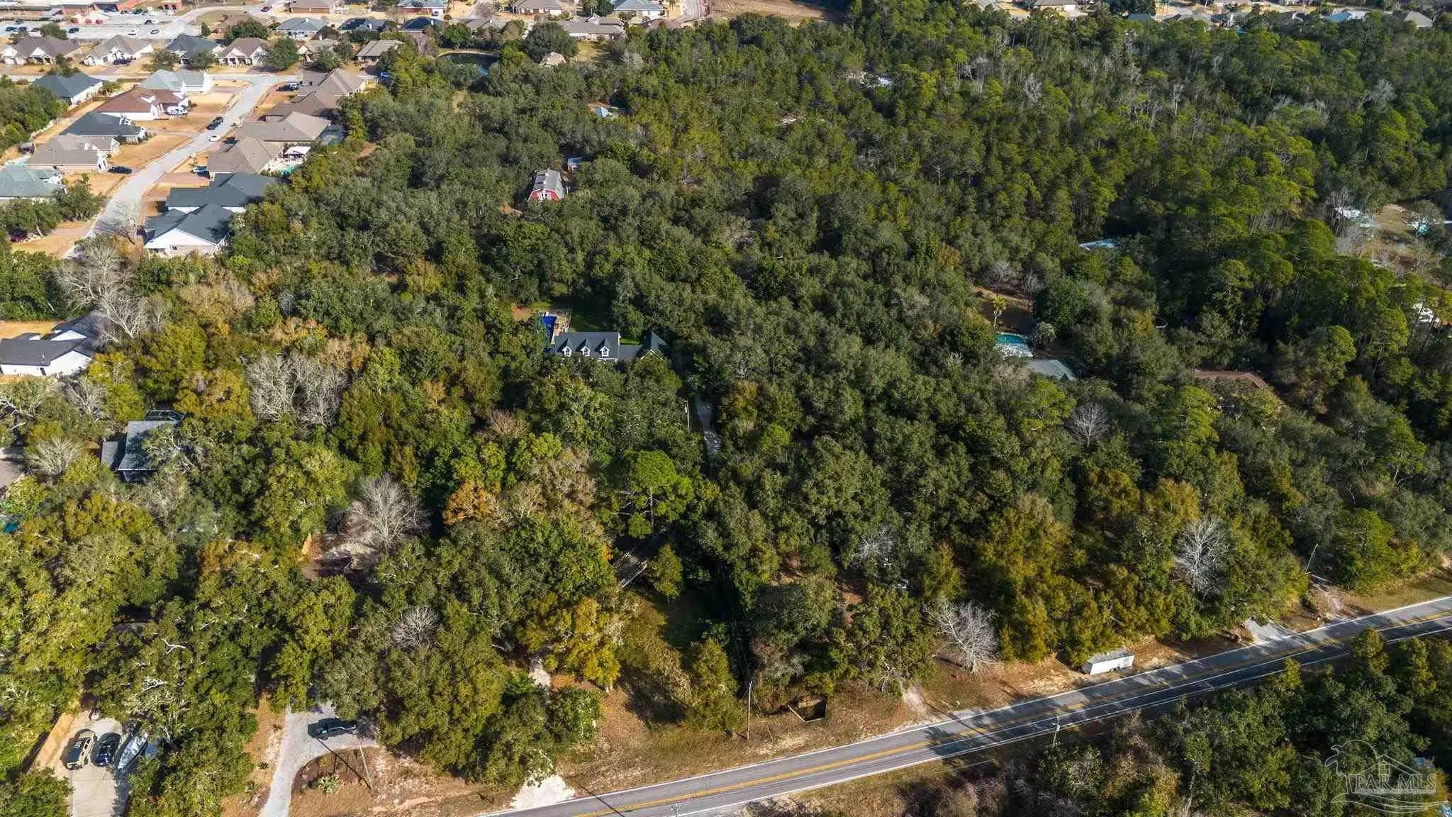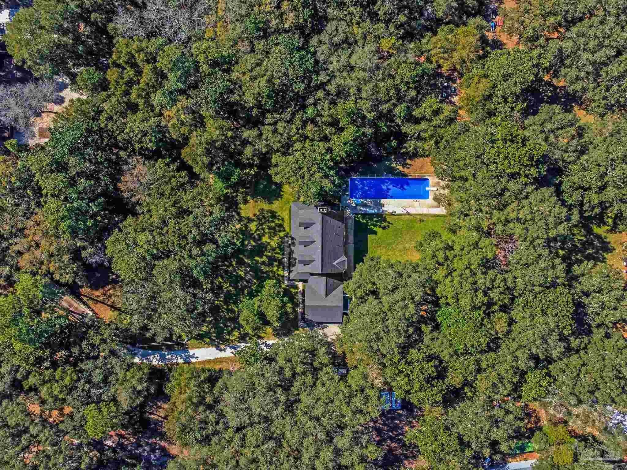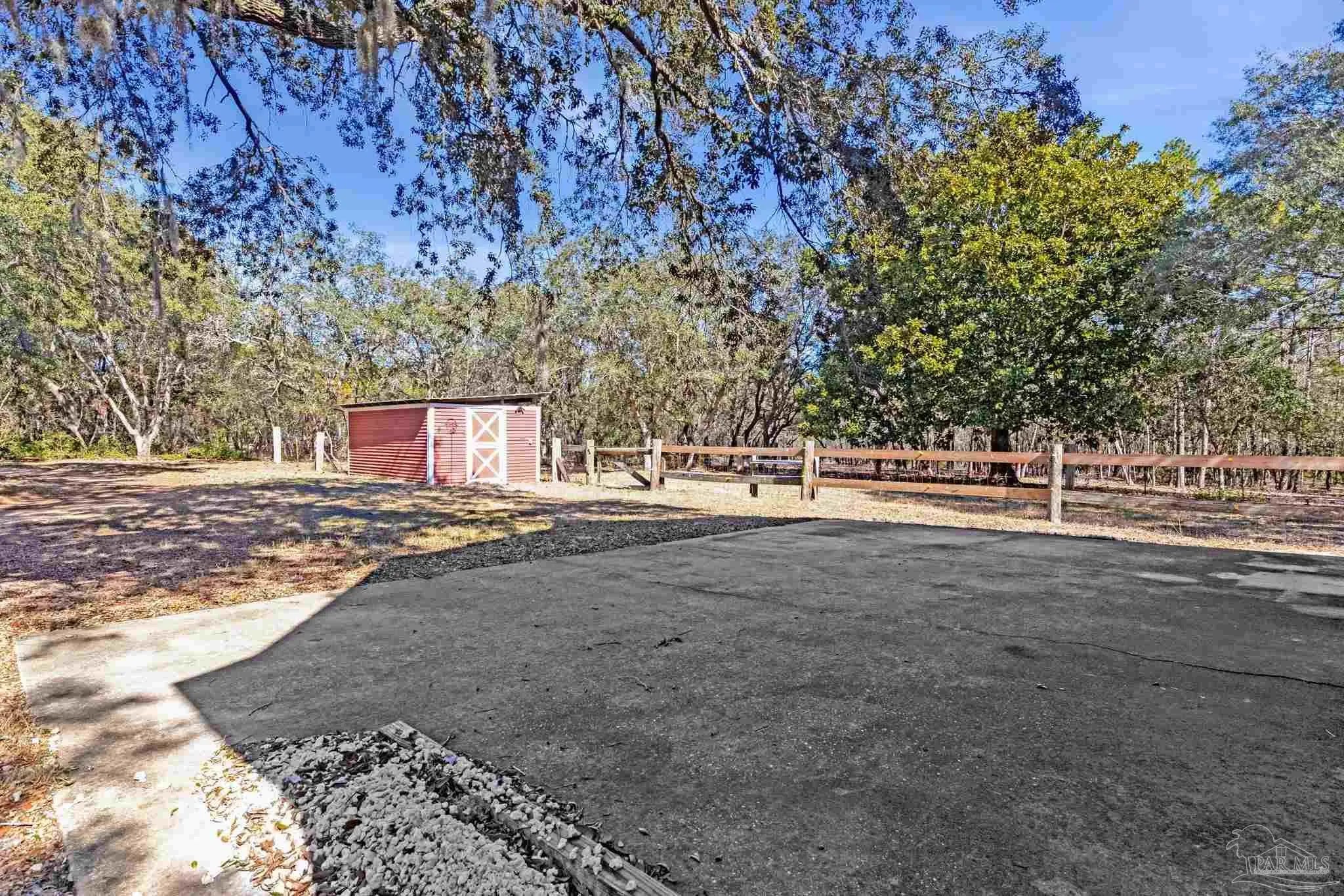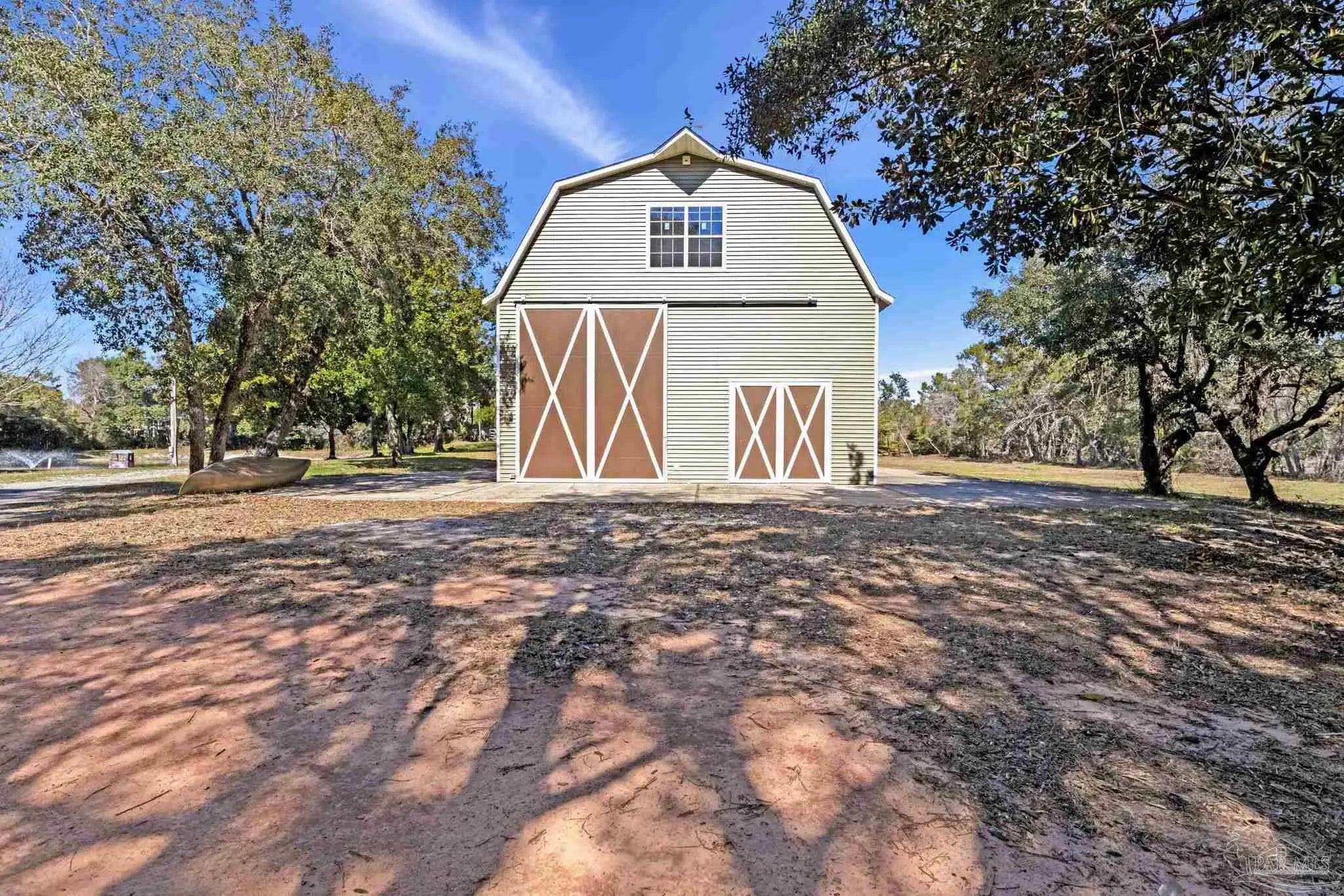 Welcome to your own private retreat right here in Gulf Breeze, and what a truly rare find it is. Properties like this almost never come available. This find offers over 11 beautiful, high-and-dry acres with mature trees, open pastures, and peaceful pockets of nature. You'll feel a world away, while still being just minutes from town and beaches. This is the kind of property where life slows down, and memories are made. Picture mornings sitting on the porch sipping coffee while watching the sun rise over the sound and evenings relaxing by the pond as the sun sets, watching herons and ducks float by. Wide open spaces for all the animals and hobbies you have dreamed of, with a fenced paddock and pasture for horses, goats, and more. This land is usable and thoughtfully laid out with two barns, one of which features an accessory unit ideal for a guest or private studio apartment. The large lap pool offers a perfect spot to cool off on warm Florida days. As you drive across your private wooden bridge over a meandering creek, there is an immediate sense of calm that sets the tone for the entire property. The custom-built brick home feels straight out of a storybook, welcoming you with an expansive front porch and a warm, inviting foyer. Inside, you find a formal dining room, a dedicated office, and a living room with dark hardwood floors and a fireplace. It is the perfect place to unwind at the end of the day. The kitchen features abundant wood cabinetry, black appliances, an island, and a breakfast nook. From there, there is easy access to the laundry room and an oversized side-entry two-car garage. Upstairs, the spacious primary suite offers its own fireplace, while the primary bathroom features double vanities, a tiled walk-in shower, dual closets, and an oversized soaking tub looking out to your private sanctum. There are two additional spacious bedrooms that share a full bath. Plus, a separate guest suite with a private entrance includes a mini kitchen and bath.