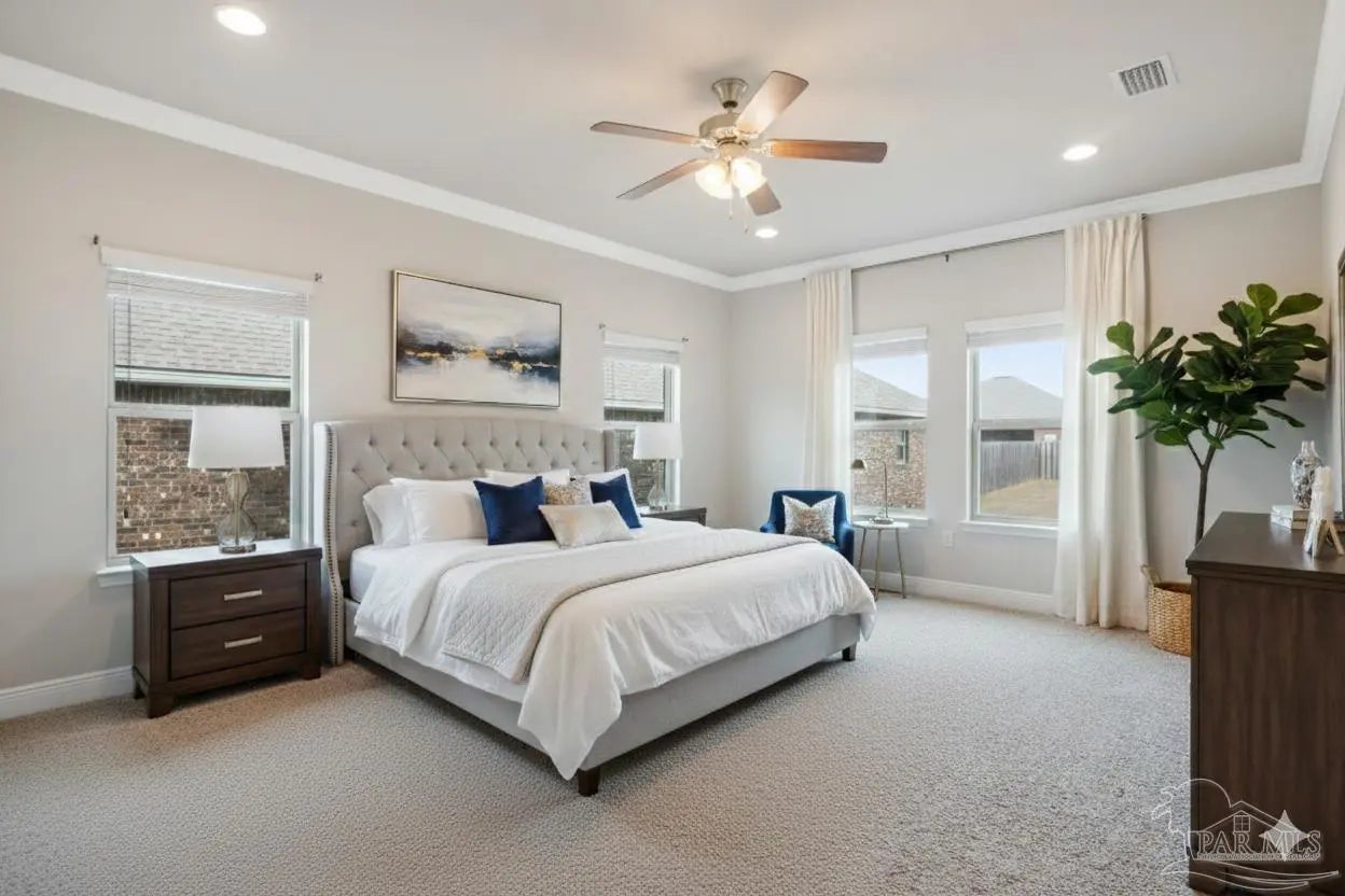 The wait for your home in sought-after Vintage Creek is officially over! Step inside and you’re instantly welcomed by a bright foyer that sets the tone for the entire home. To your left, you’ll find a convenient powder room and easy access to the laundry area, because function matters. From there, the home opens into a spacious, airy floor plan with hardwood floors throughout the living room, dining area, and kitchen. The kitchen features cream-colored cabinetry, ample prep space, and a dedicated nook ideal for a coffee bar or showcasing your favorite China. French doors lead out to a covered patio, seamlessly blending indoor and outdoor living. And the backyard? Let’s just say there’s room to dream big. Whether it’s an in-ground pool, expanded entertaining space, or your own private oasis, the possibilities are wide open. The primary suite is conveniently located on the main floor and can accommodate a king-size bed, with an oversized walk-in closet. The primary bathroom features tile flooring, a water closet, a soaking tub, a walk-in tiled shower, and dual vanities with granite countertops, creating a true retreat at the end of the day. Upstairs, you’ll find a generous secondary living space perfect for movie nights, a playroom, or even a pool table setup. Down the hall are four additional spacious bedrooms, each with a walk-in closet, along with a shared full bath with a tub/shower combo and double granite vanities. Oh, and here’s the bonus: the solar panels are paid off. That means your electric bill might feel more like a fun trivia number than a real expense. Located in a gated community with amenities that include a neighborhood pool, clubhouse, and secure entrance, this home checks the boxes and then some. Now is your chance to make it yours.