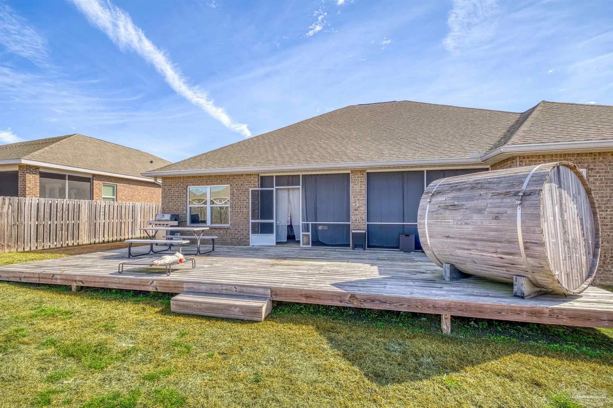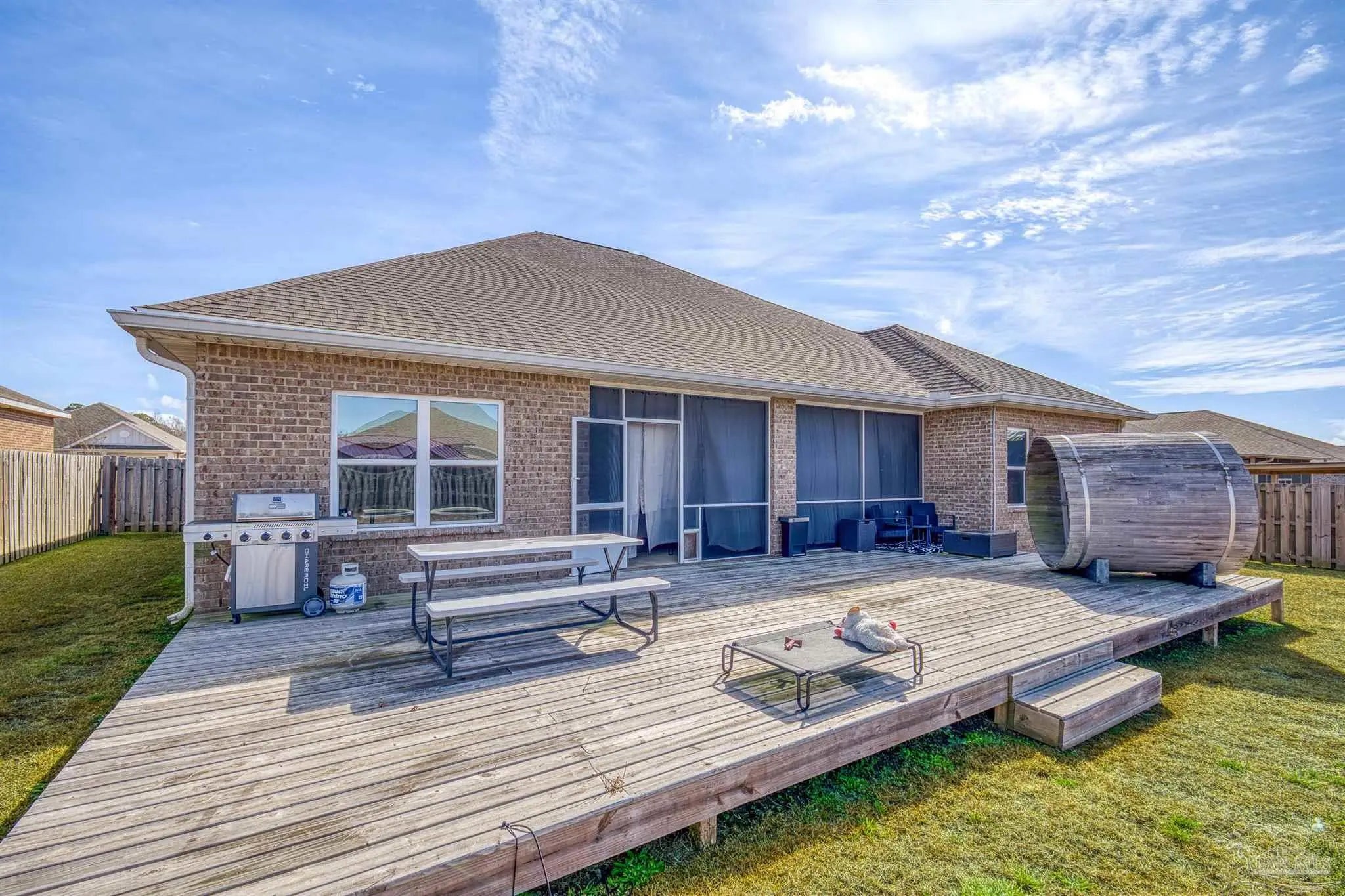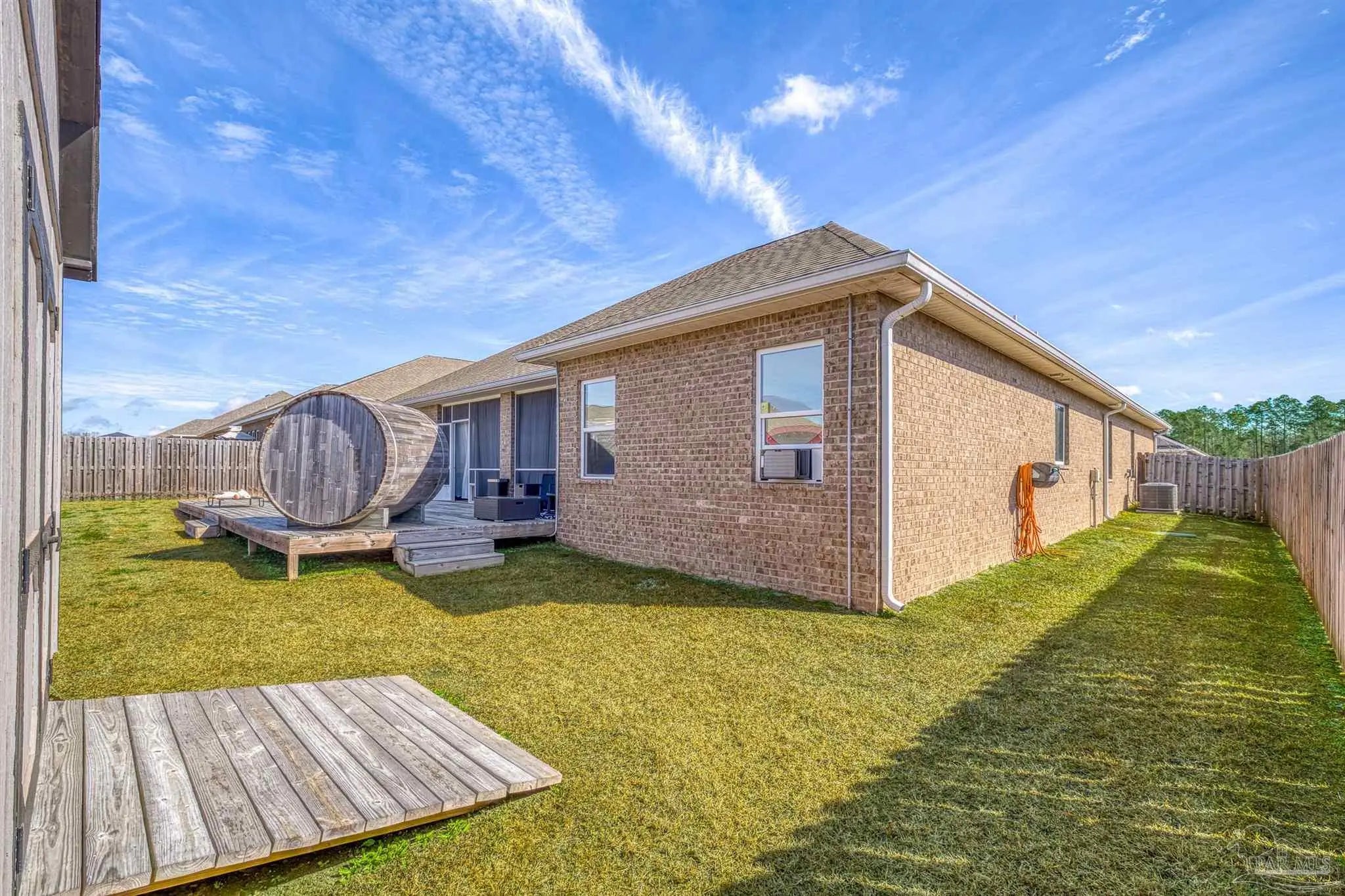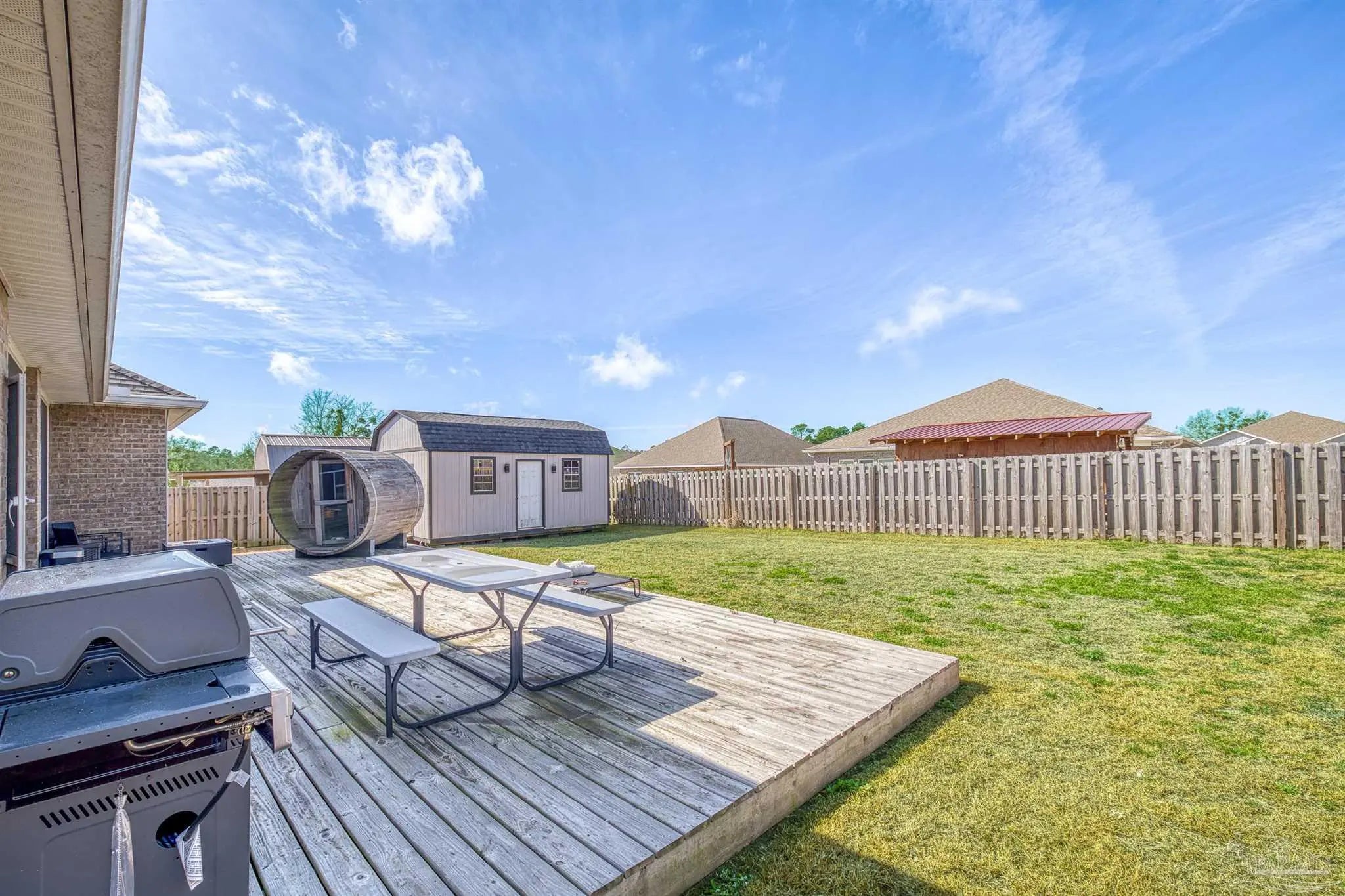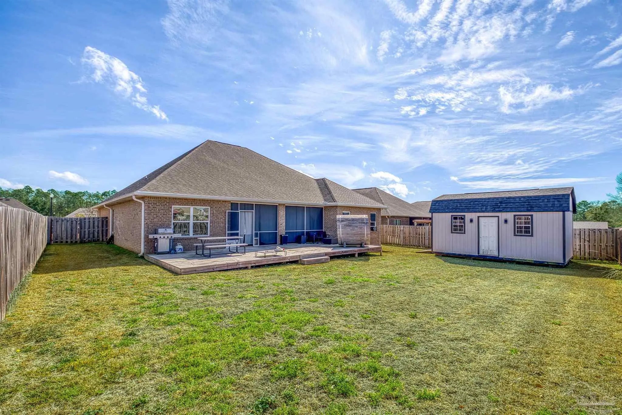 Beautiful home in the sought-after Graystone community, featuring the popular McKenzie plan with 5 bedrooms and 3 full baths. This spacious design offers 9-ft ceilings, a split bedroom layout, and an open flow from the kitchen through the dining and family room. The kitchen includes stainless steel appliances, granite countertops, Moen faucets, and a large island, while Luxury Vinyl Plank flooring enhances the foyer, living, dining, kitchen, and hallways. The main suite offers a private retreat with a 5' shower, large walk-in closet, and linen storage. Bedrooms 2–5 are generously sized, and a dedicated study at the front of the home provides a bright workspace with a large window. Additional features include an 11x23 covered back patio, privacy fenced fully sodded yard, large storage shed, wood deck, garage door opener, and an all-electric 50-gallon water heater with an efficient HVAC system. This home also comes equipped with fabric hurricane window protection and a Smart Home Technology package for added peace of mind. A rare opportunity to own a spacious, modern home in one of the area’s most desirable communities.
