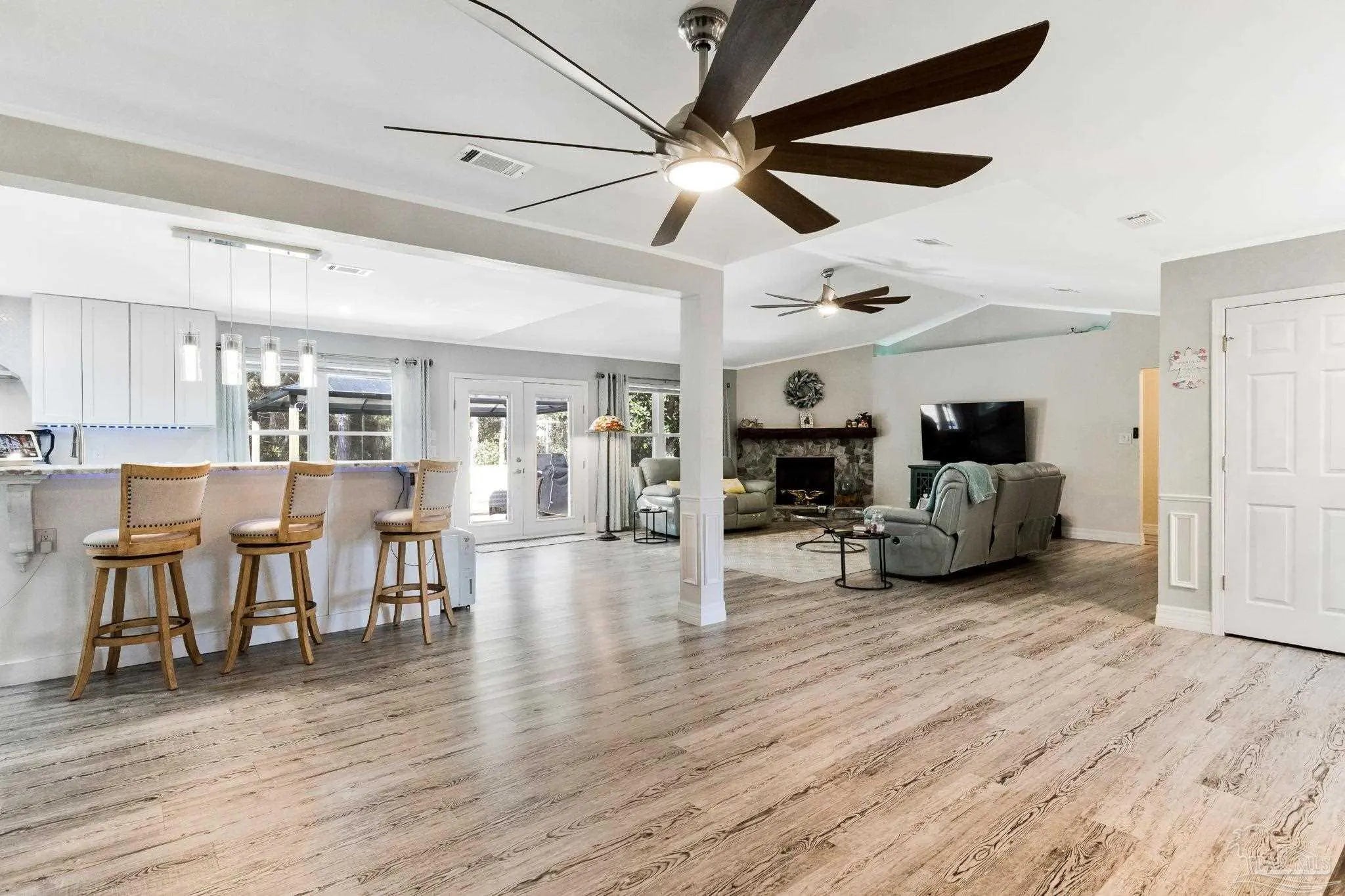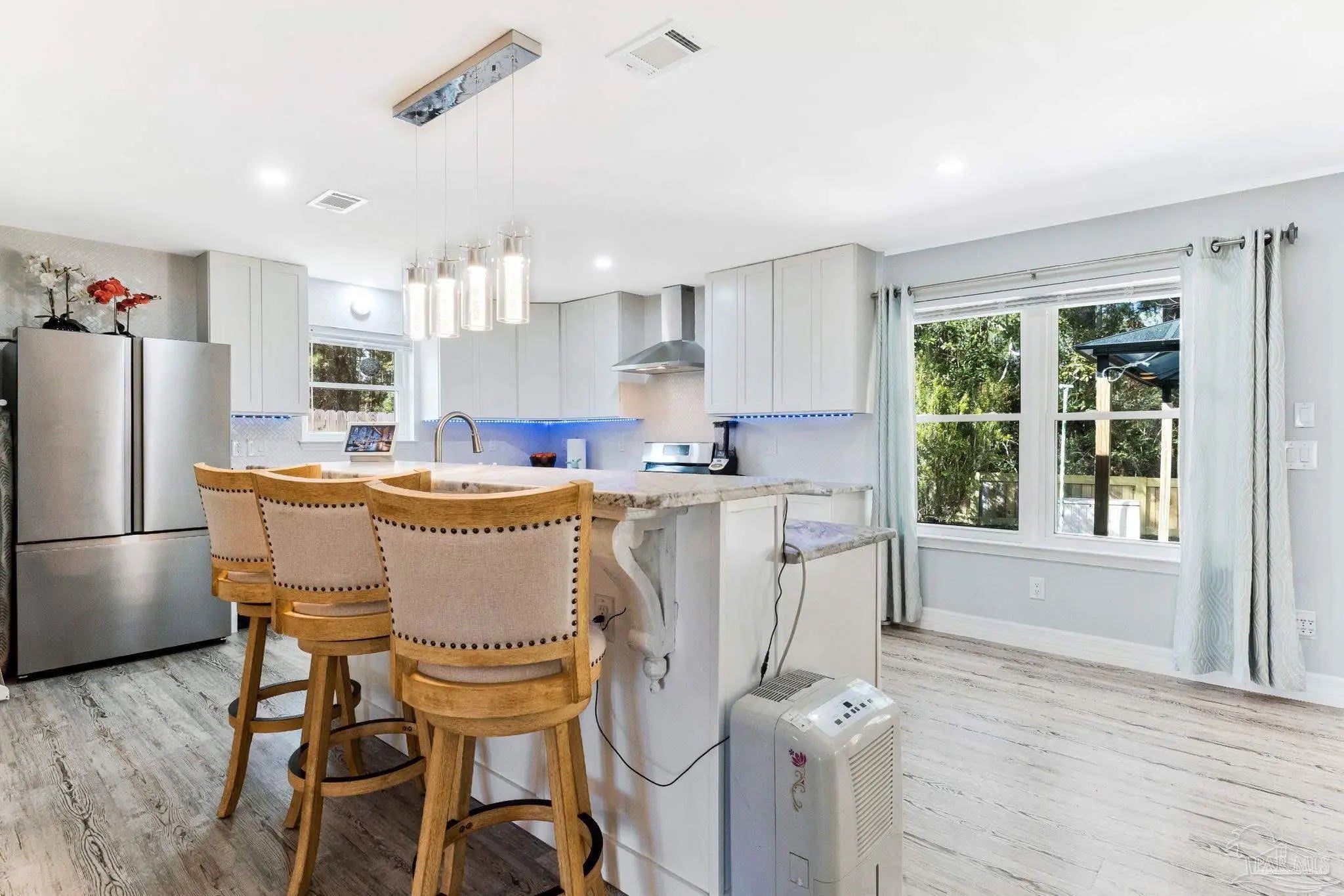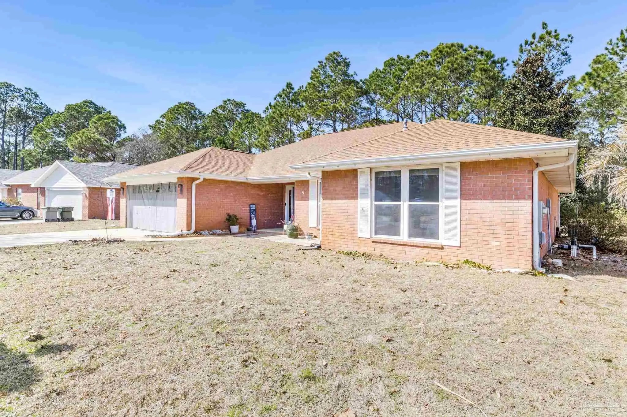 Come home to beauty and convenience. This Bauer Estates' home is in a quiet cul-de-sac located near Beaches, Library, Pickle Ball Courts, Two Beautiful State Parks and Athletic Centers. Just 25 minutes from downtown Pensacola. When you enter this beautiful home’s open floor plan you will be amazed at all the upgrades. Beautifully unique lighting features throughout the home. Upper grade luxury vinyl graces this large open area. Italian imported leathered granite enhances the custom kitchen. Beautiful ample cabinets, refrigerator, dishwasher and gas range with hood complete your kitchen. Your guests can sit comfortably at the bar as you prepare to entertain. The spacious living area has a gas fueled fireplace. The master bedroom has a lovely built-in dresser with the leathered granite top. The updated master bath has a beautiful shower and double vanity. The two secondary bedrooms are quite spacious. Lots of storage in this home. The laundry room is a dream with so much storage and work counter area as well as sink. A new fence was installed in the backyard but kept low to enjoy the beautiful forest view. The two-car garage has a mini split HVAC system for those weekend hobbies or business. Whole House Natural Gas Generator brings peace of mind and this one is regularly serviced. Front and back sprinkler system with yard well to save you on your water bill. HVAC 2019, Roof 2019, Windows 2021. Seller will consider selling Gazebo and furnishings. This well maintained home is move in ready.