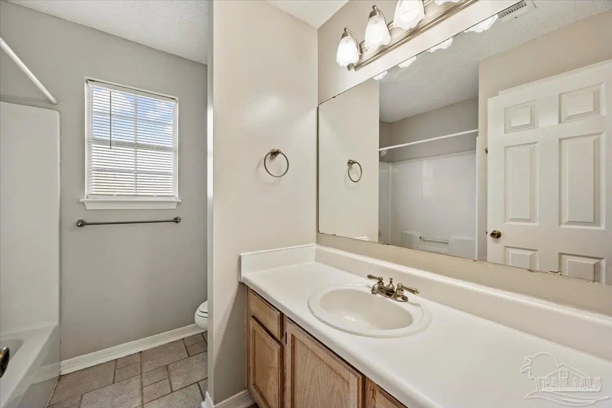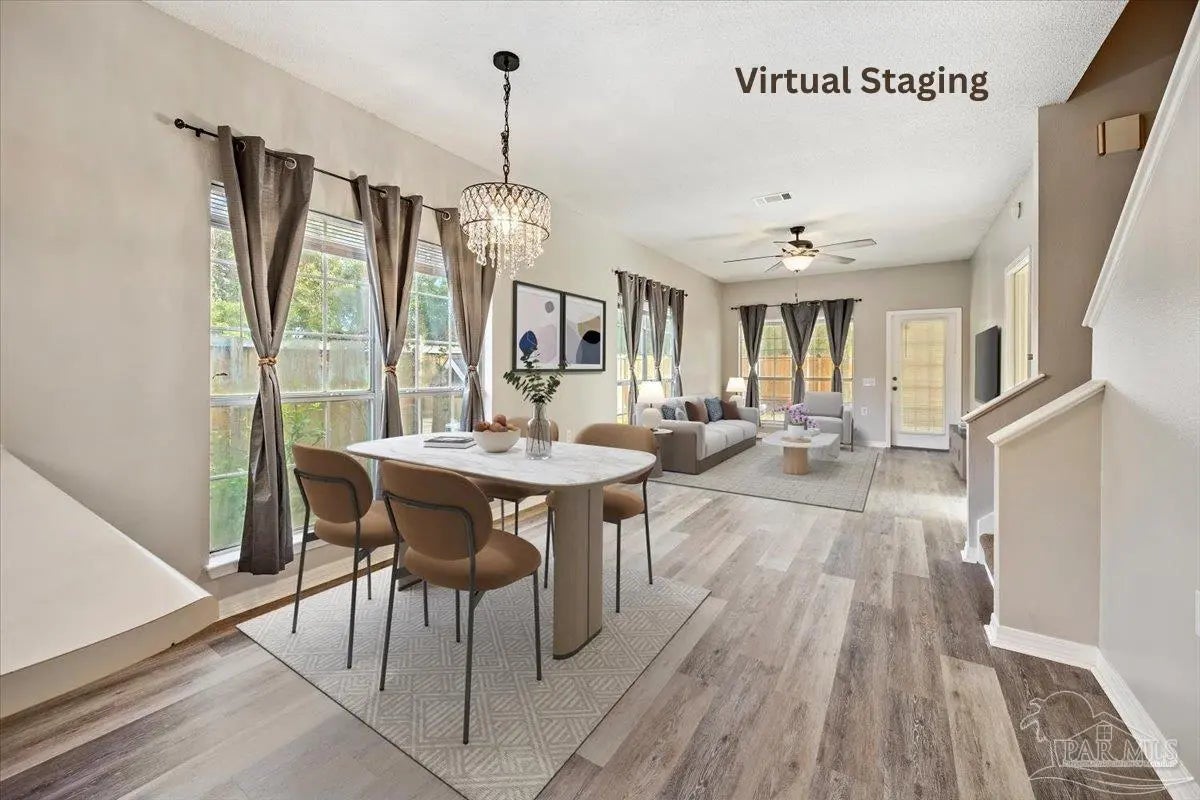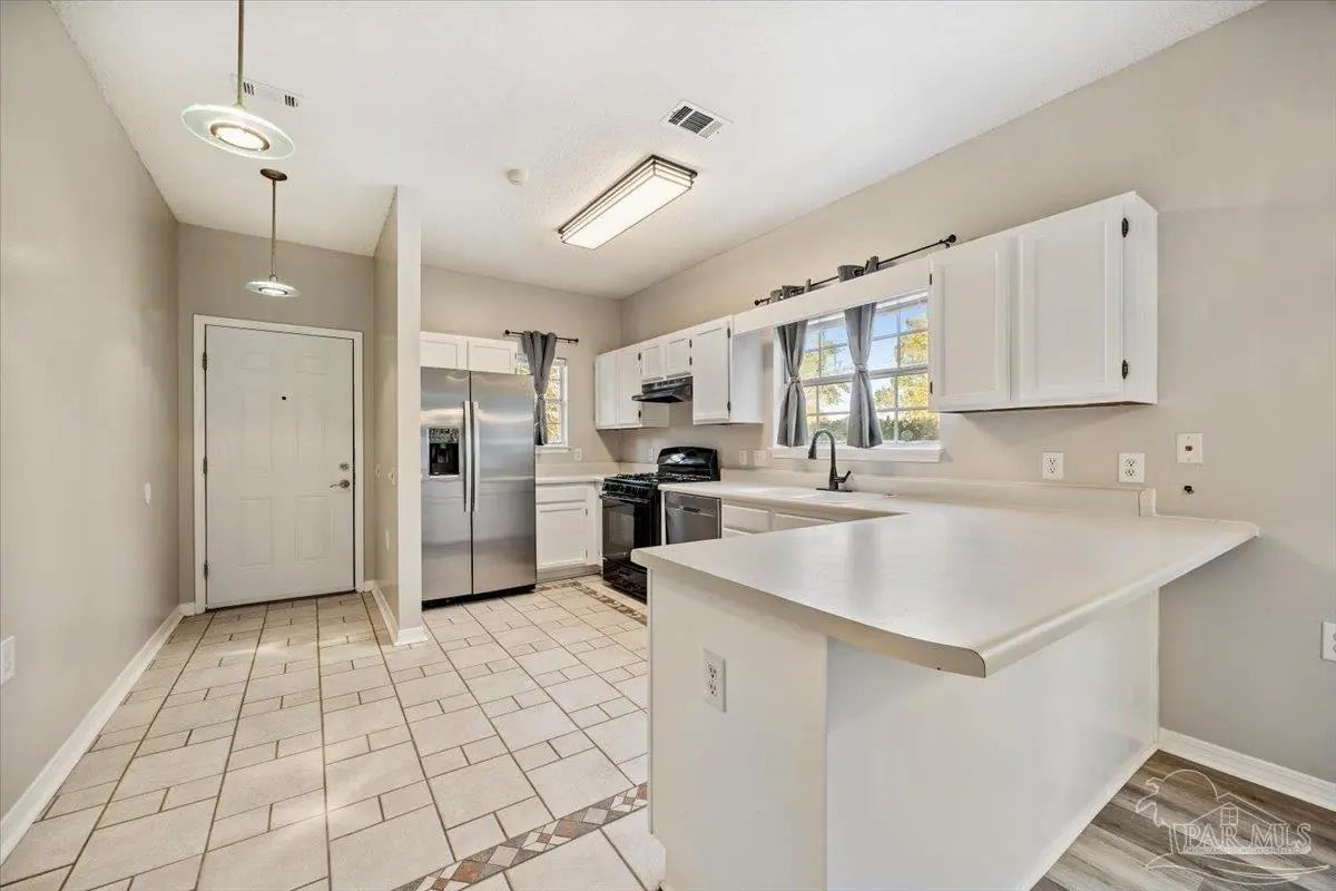 Welcome to this beautifully maintained 3 bedroom + flex room that could be an office, playroom or a 4th bedroom, 2 bath home in The Cottages at Grandpointe. As the original model home, it holds a prime location directly next to the HOA playground and first on the street. The primary bedroom is located downstairs with three additional rooms upstairs, offering a functional layout with space for everyone. Kitchen appliances convey, and the finished laundry room includes the washer and dryer. The interior has been freshly painted and features new waterproof LVP plank flooring and updated lighting. Enjoy the covered back porch overlooking a fully privacy fenced backyard with a nice storage shed. Conveniently located near the interstate for an easy commute and centrally positioned between Escambia and Santa Rosa counties, close to UWF, large hospitals and our beautiful sandy beaches.