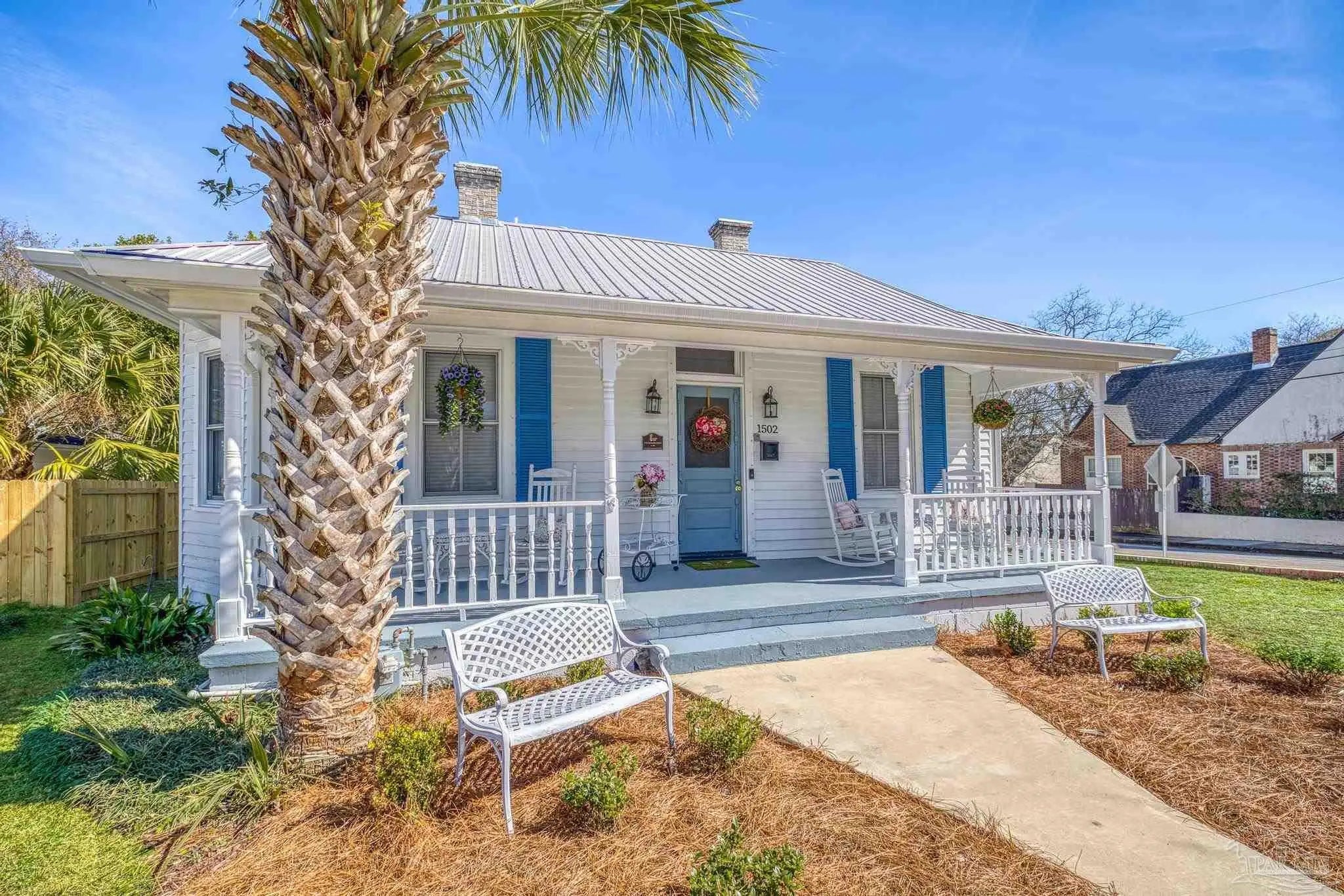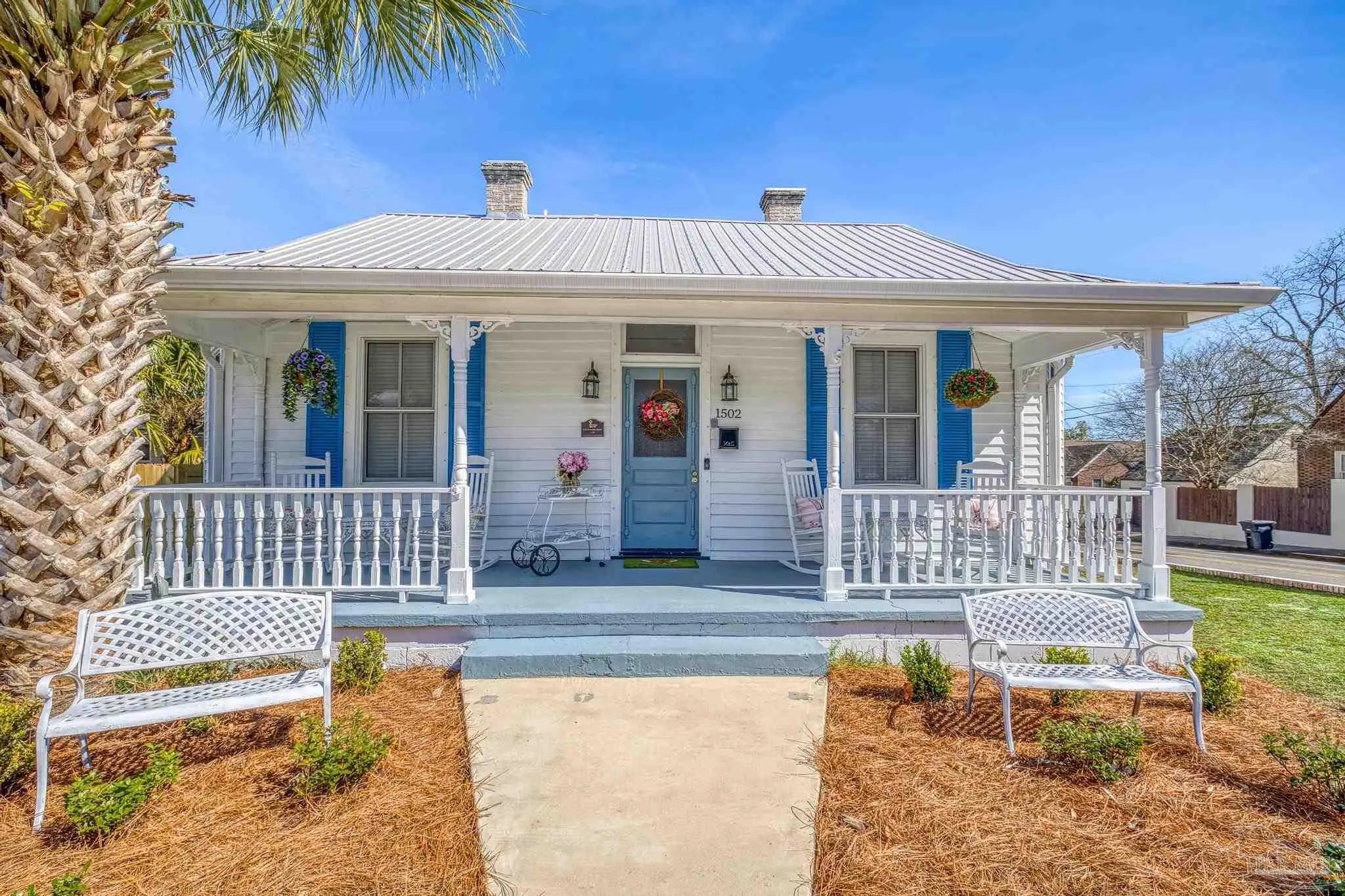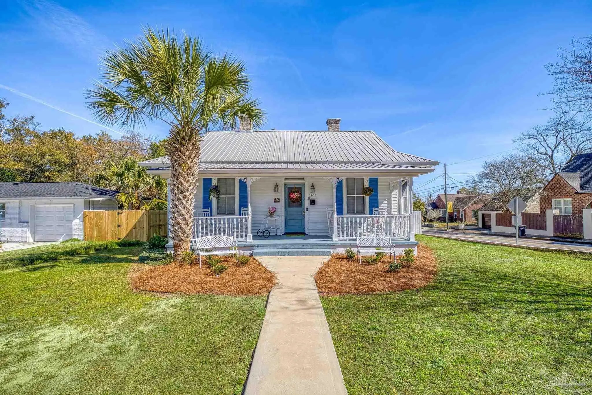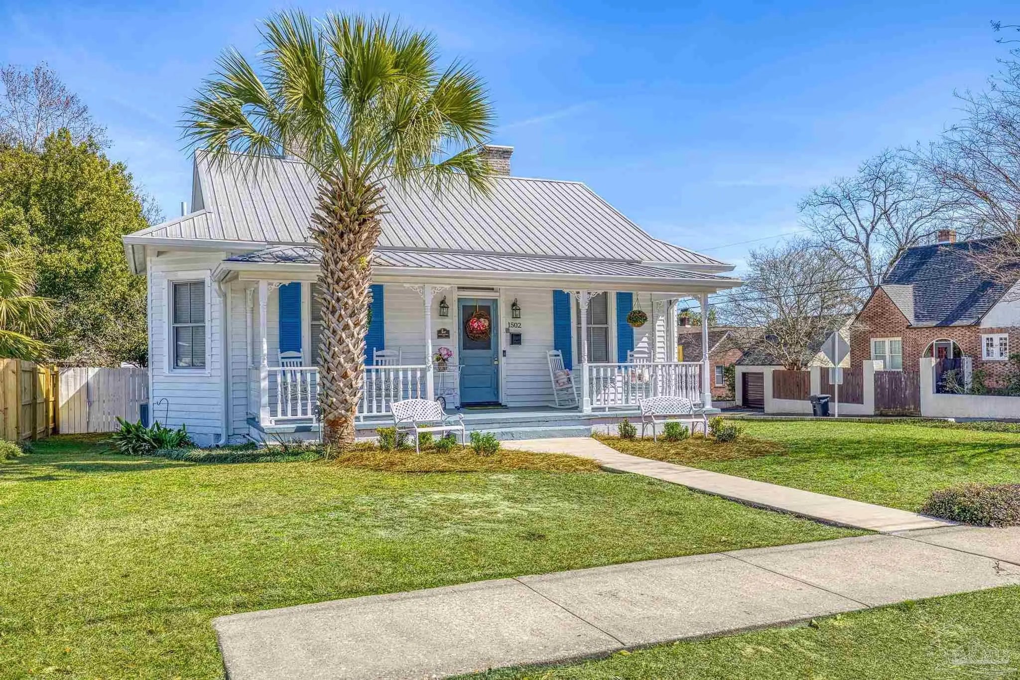 Charming North Hill Historic District Cottage! Located in the highly sought-after North Hill Historic District, this beautifully maintained home offers 3 bedrooms and 2 full bathrooms with 1,514 square feet of living space, perfectly situated on a .17-acre corner lot. Welcomed by a large front porch with classic rocking chairs and a cheerful pop of color on the front door, this home blends timeless character with thoughtful updates. Inside, you’ll find a wonderful flow throughout, highlighted by crown molding, built-in bookcases and shelving, and four ornamental fireplaces that preserve the home’s historic charm. The kitchen features granite countertops, a breakfast bar area, and updated appliances including a refrigerator, stove, dishwasher, and microwave (2024). The spacious primary bathroom includes a travertine shower with bench, while the guest bath offers a large soaking tub. Recent updates provide peace of mind, including whole-house exterior painting (2025), new gutters (2025), updated lighting and ceiling fans (2023), and washer and dryer (2025). The low-maintenance landscaping complements the attractive corner lot setting. Enjoy living in one of Pensacola’s most beloved neighborhoods, known for its strong sense of community, neighborhood events, and beautiful historic surroundings. The subdivision also offers a picnic area, playground, and tennis courts for added recreation. This is a rare opportunity to own a charming historic cottage with modern conveniences in an exceptional location!
