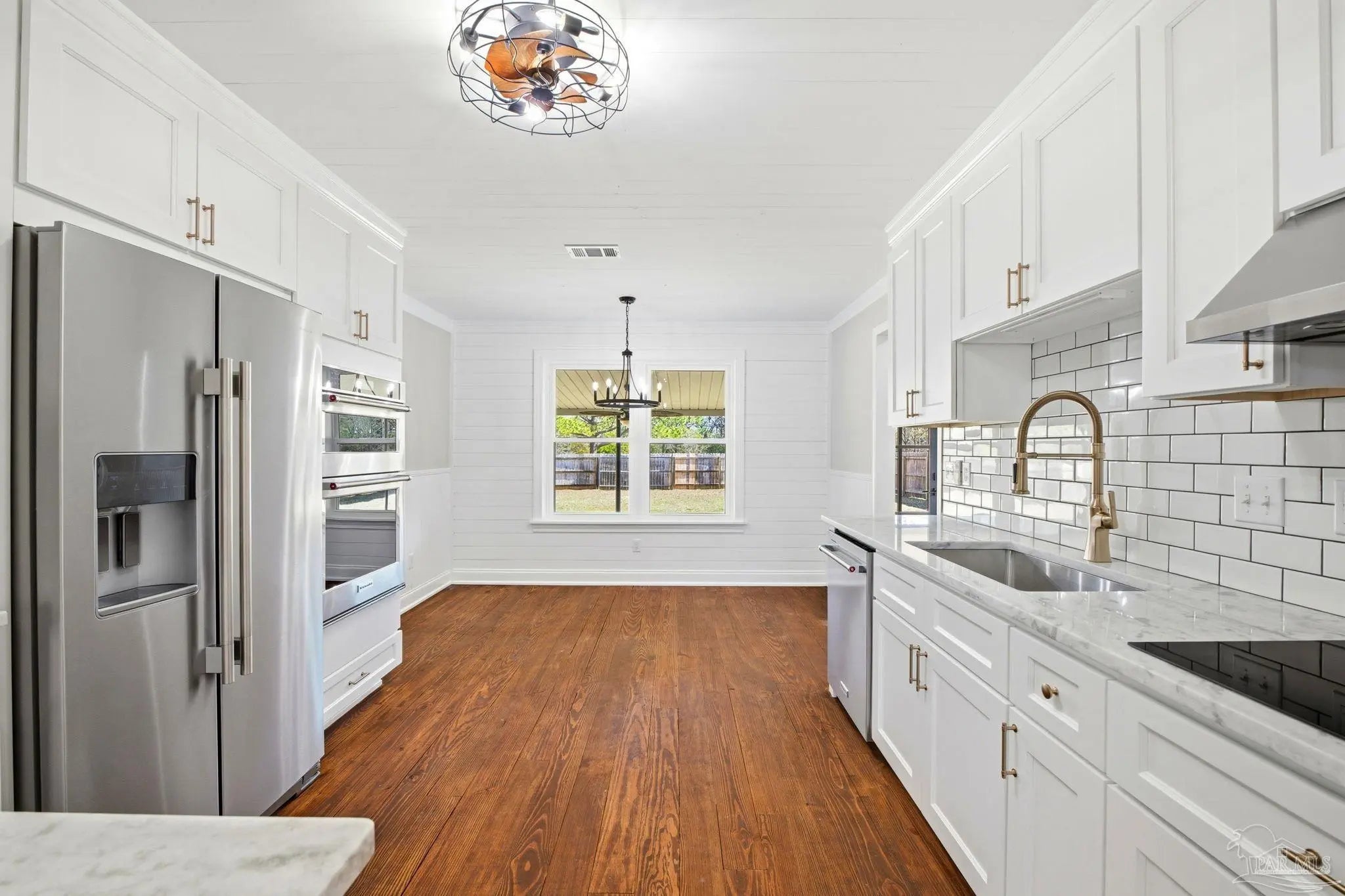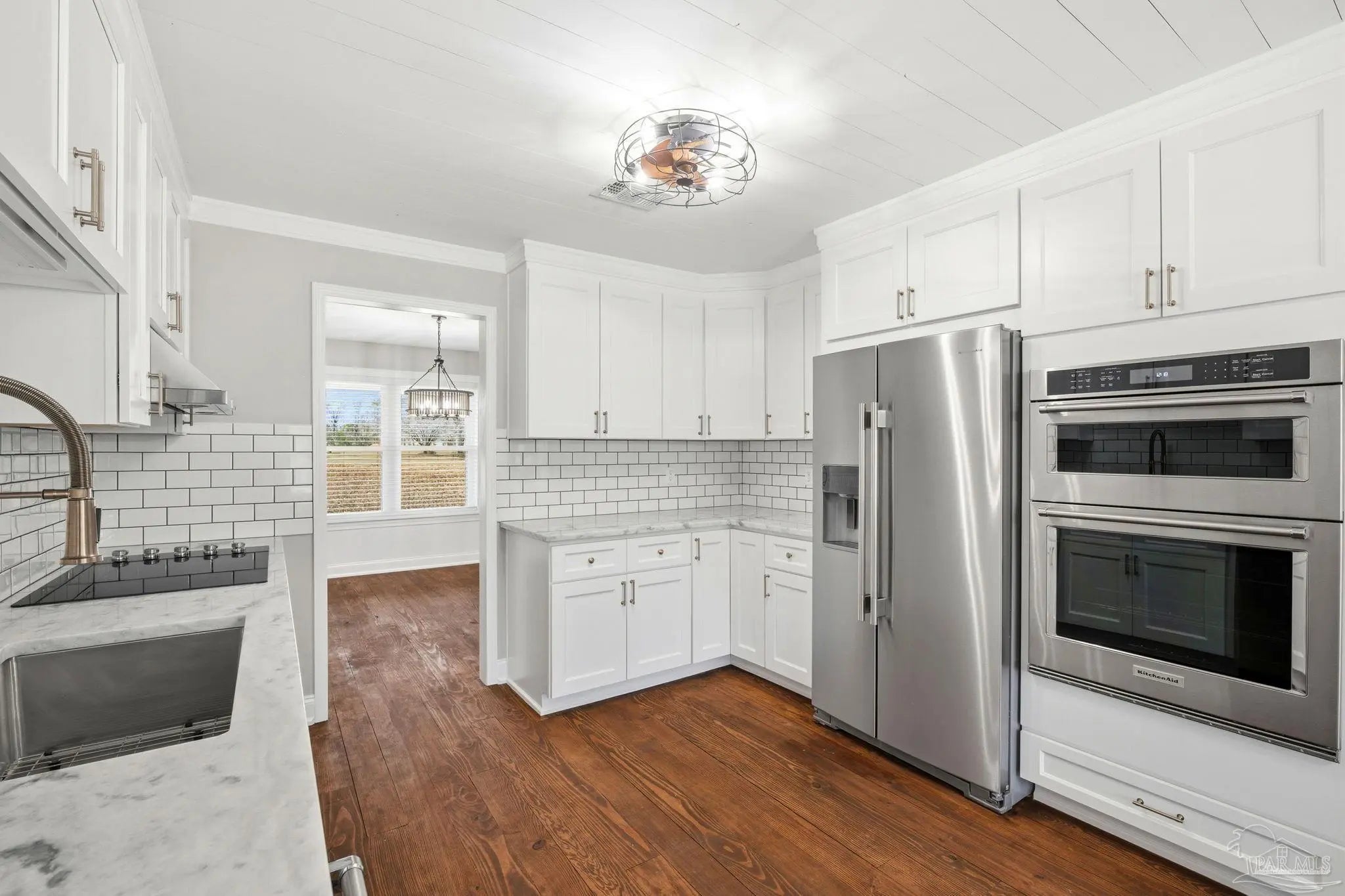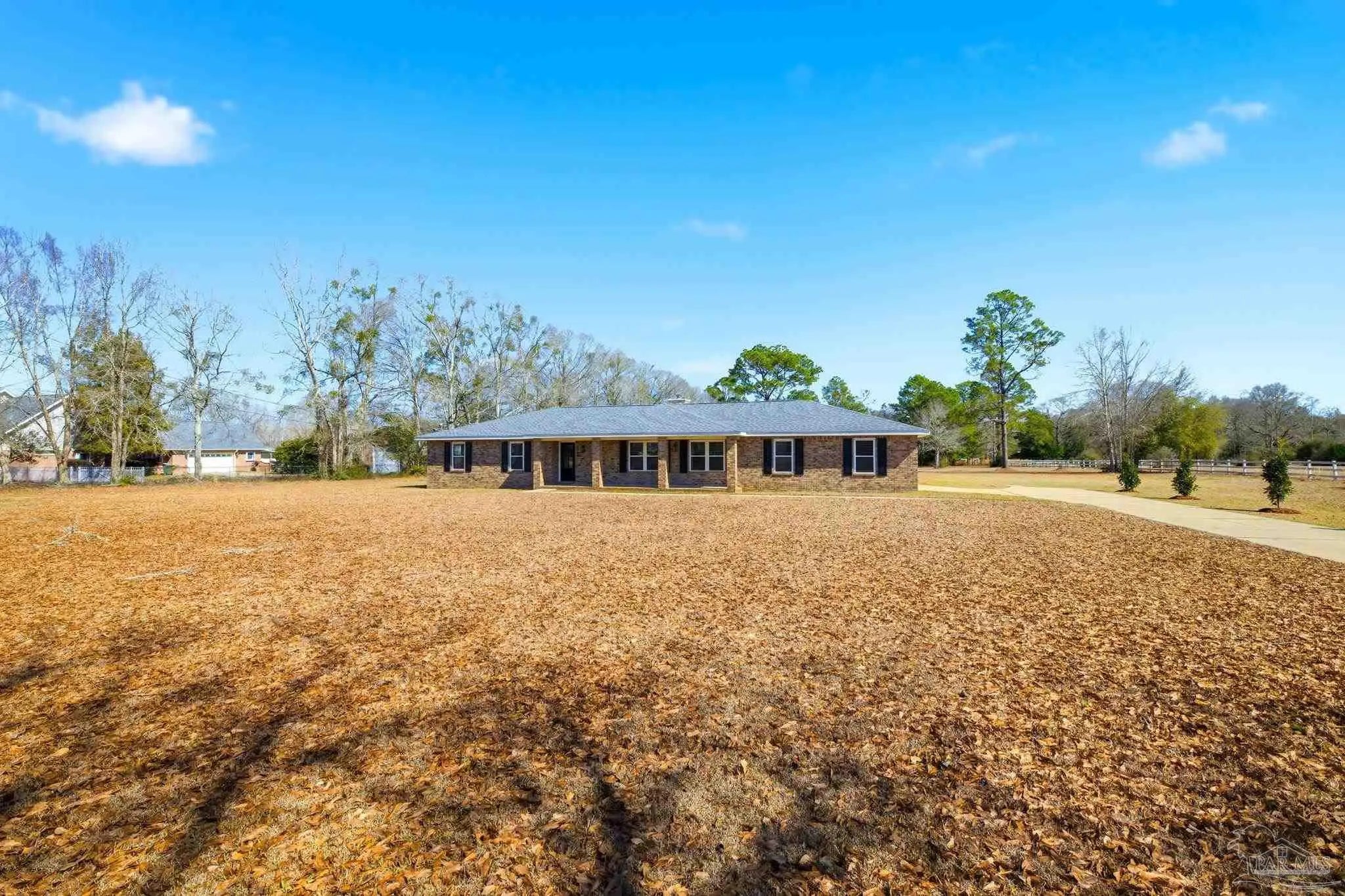 Stunning fully renovated 4BR/3BA home on 3.86 acres in Molino Meadows. Built in 1991 and updated throughout with a new roof installed October 2020, new double-hung windows (2025, with warranty), new exterior doors, new hot water heater and whole-house interior paint. Custom features include reclaimed rough sawmill-cut pine flooring, designer tile bathrooms, Fantasy White dolomite countertops, soft-close shaker cabinetry, Delta champagne bronze fixtures, custom wainscoting, built-ins, and custom wood shelving in closets. KitchenAid stainless appliance suite with combo wall oven and microwave. Floorplan includes a private mother-in-law suite, formal dining room, breakfast area, large family room with wood-burning fireplace, and a library with French doors and custom bookcases. Finished 2 car garage with trimmed windows and baseboards. Privacy fenced backyard, covered porch, and two driveway access points (front and back of the property). No HOA. Equestrian acreage. Move-in ready with premium upgrades throughout.
