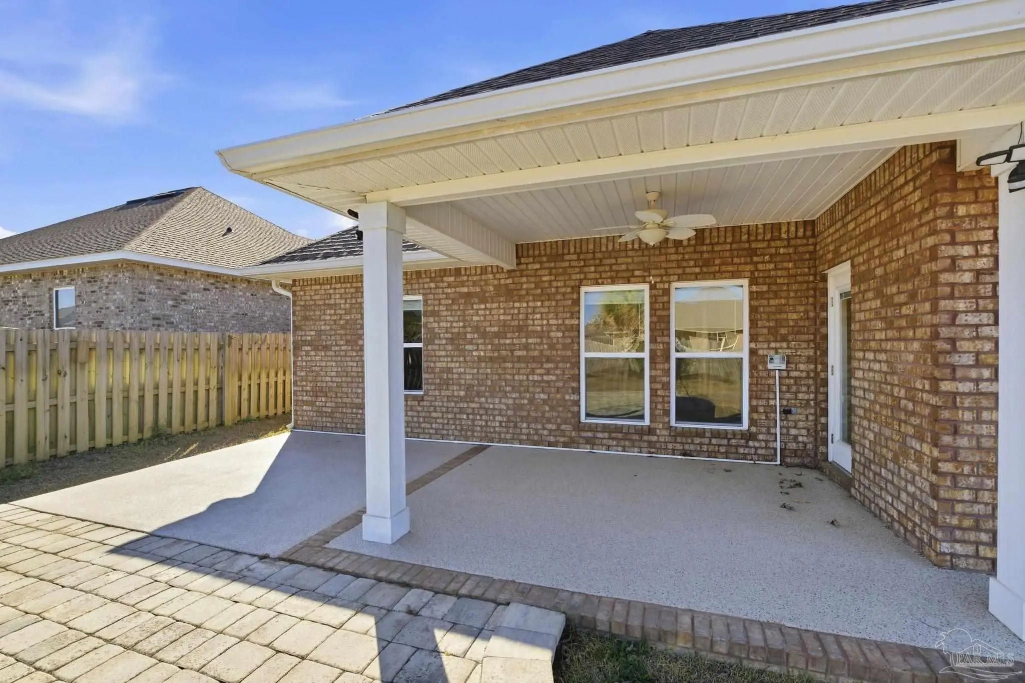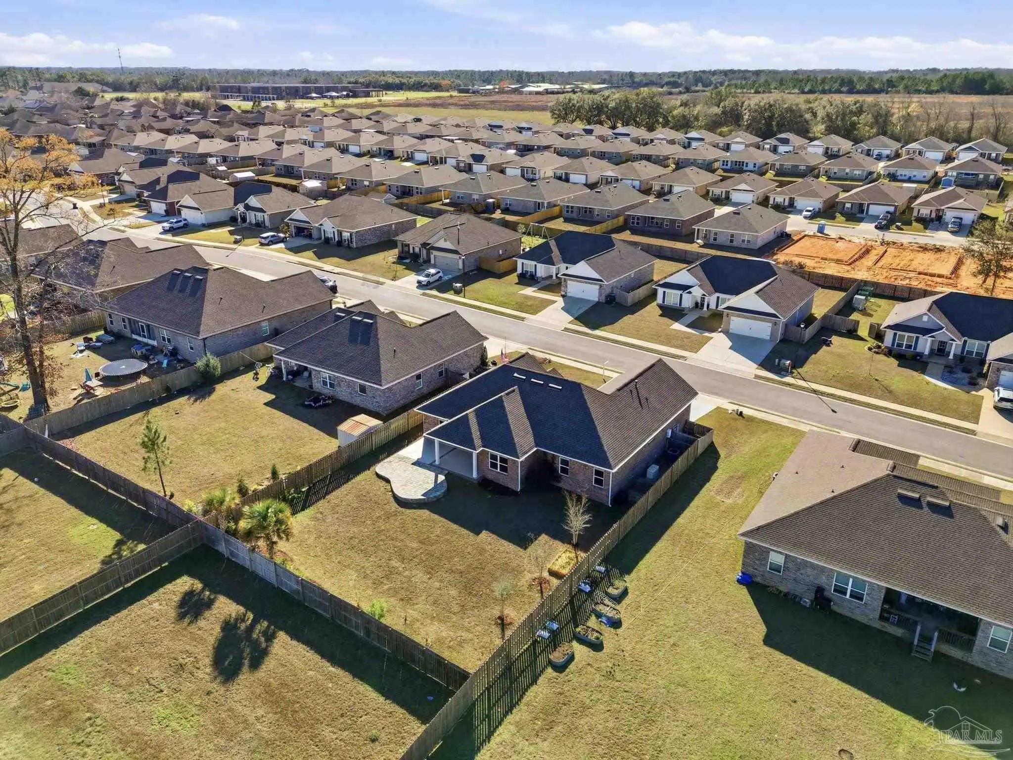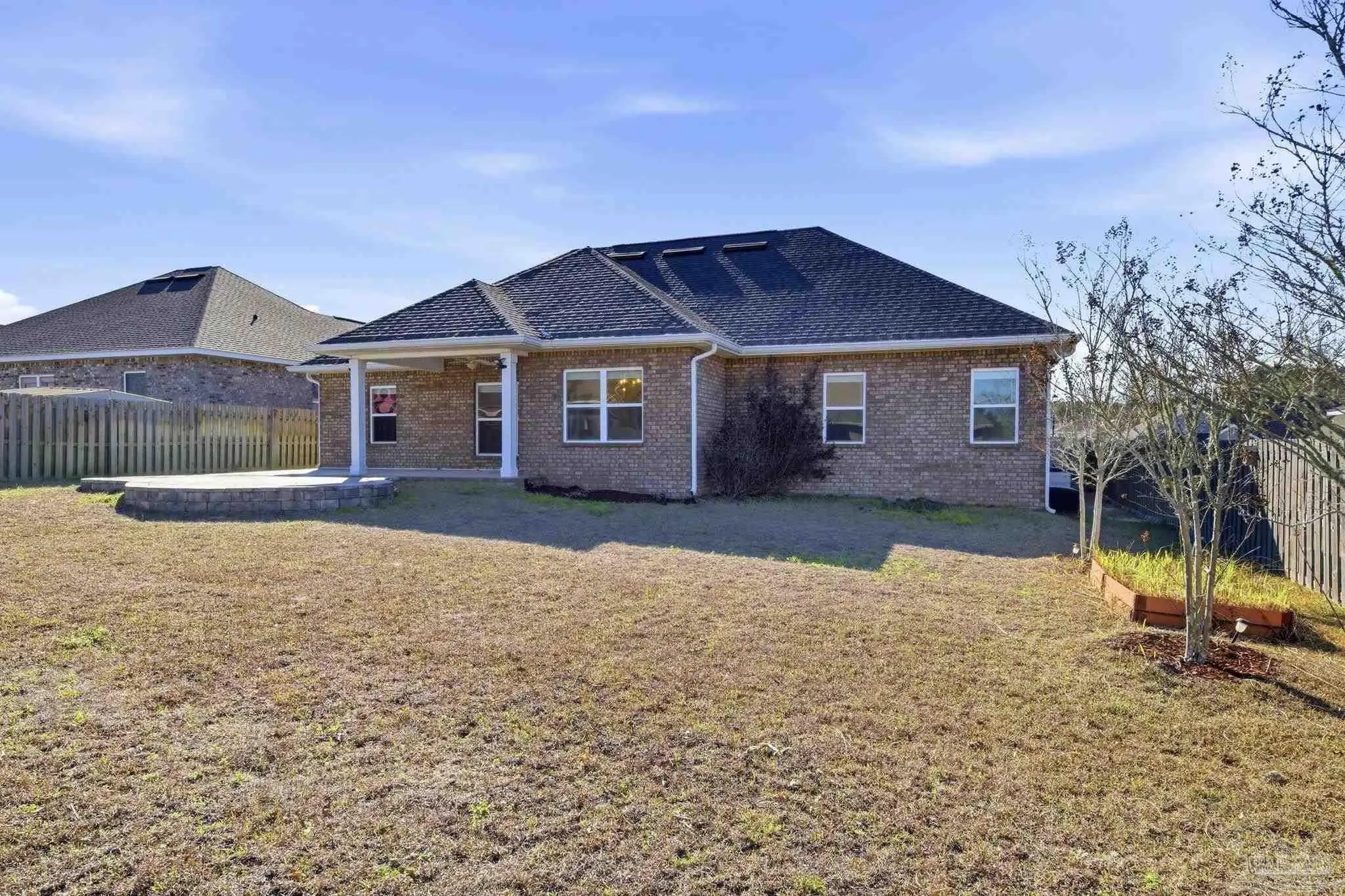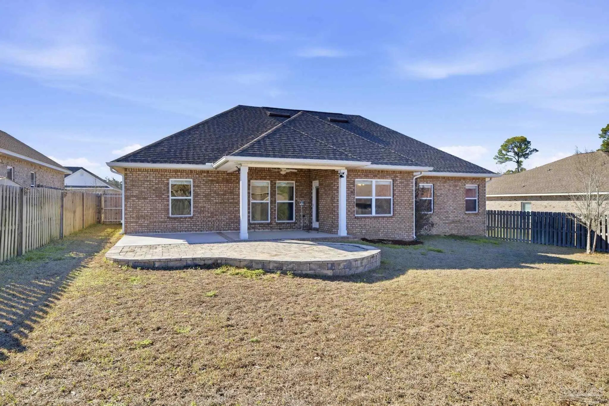 Built in 2021 and thoughtfully elevated beyond standard builds, this 3-bed/2.5-bath Craftsman-style home delivers the advantages of newer construction with a long list of premium upgrades. Offering a smart, split floor plan, the layout provides separation between the primary and secondary bedrooms while maintaining an open living space designed for everyday functionality and entertaining. The kitchen anchors the home with a 7-foot granite island, shaker cabinetry, stainless steel appliances, gas range, built-in microwave, disposal, generous pantry, LED lighting, and bar seating that flows seamlessly into the dining and living areas. Tray ceilings in both the family room and primary suite add architectural interest, while plenty of rear windows overlook the covered patio and paver extension, creating a natural transition to a backyard designed for outdoor gatherings. The well-appointed primary suite includes a custom floor-to-ceiling tiled shower and a layout that prioritizes comfort and privacy. A flex room off the foyer offers versatility for a home office, fitness area, library, media room, or play space. Luxury laminate plank flooring extends through the main living areas, complemented by maintenance-free vinyl trim and brick accents that enhance exterior appeal. Upgrades include: a whole-home Generac generator for uninterrupted power, tankless water heater, epoxy-coated garage flooring, and custom mudroom with bench and cubbies. The covered patio features brick detailing and overlooks a spacious yard ideal for pets, recreation, or future additions. Located in Bentley Oaks, residents enjoy sidewalks, a community park with basketball/pickleball courts, golf cart-friendly streets, biking paths, and regular neighborhood events such as food trucks. With convenient access to I-10, Navy Federal Credit Union campus, and area beaches, this property is an outstanding example of newer construction enhanced with intentional upgrades that truly sets it apart from the crowd.