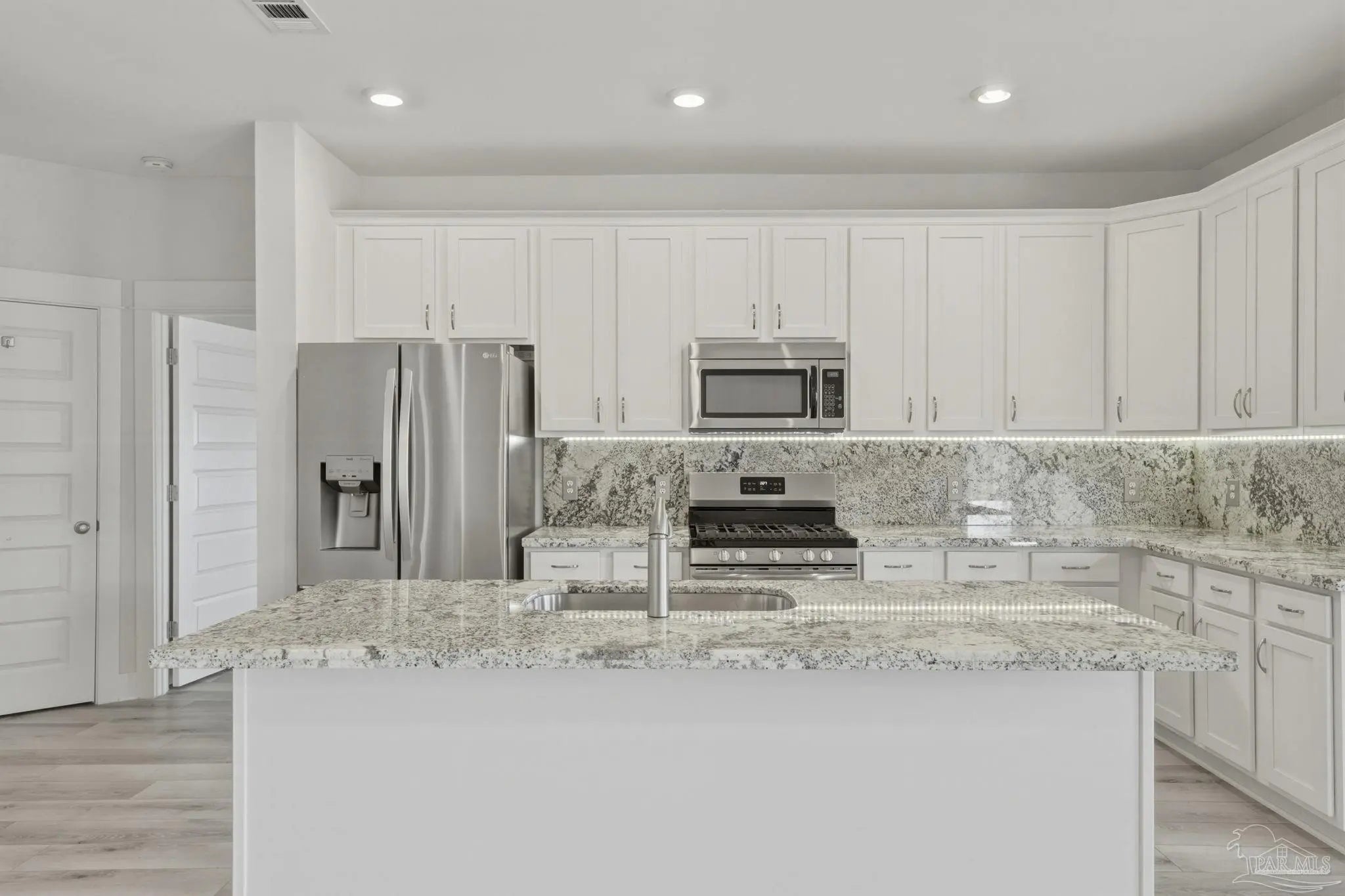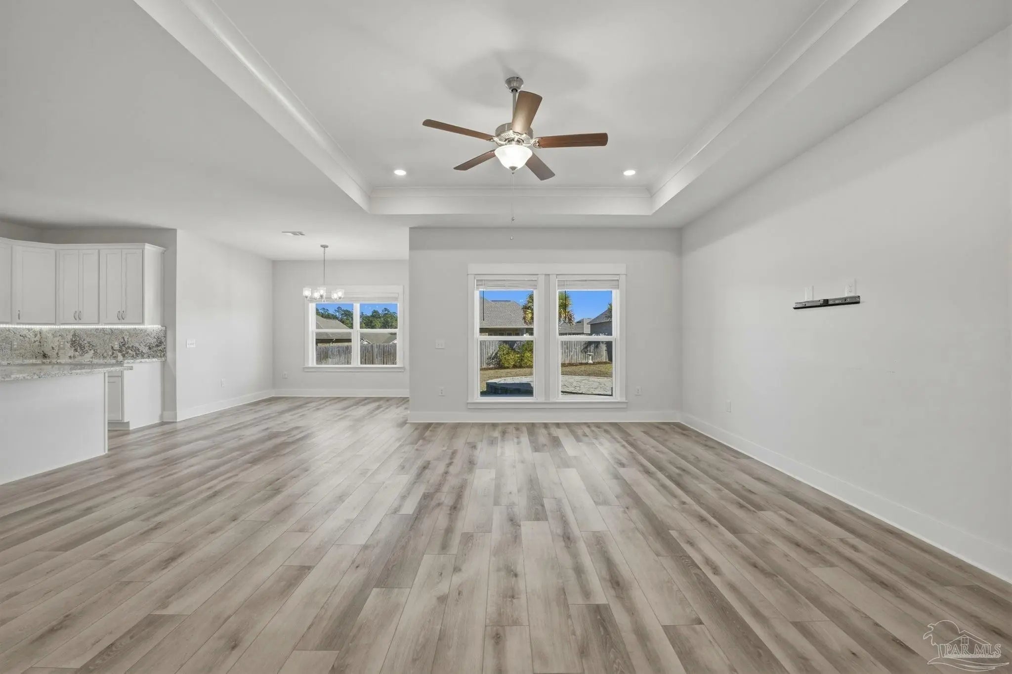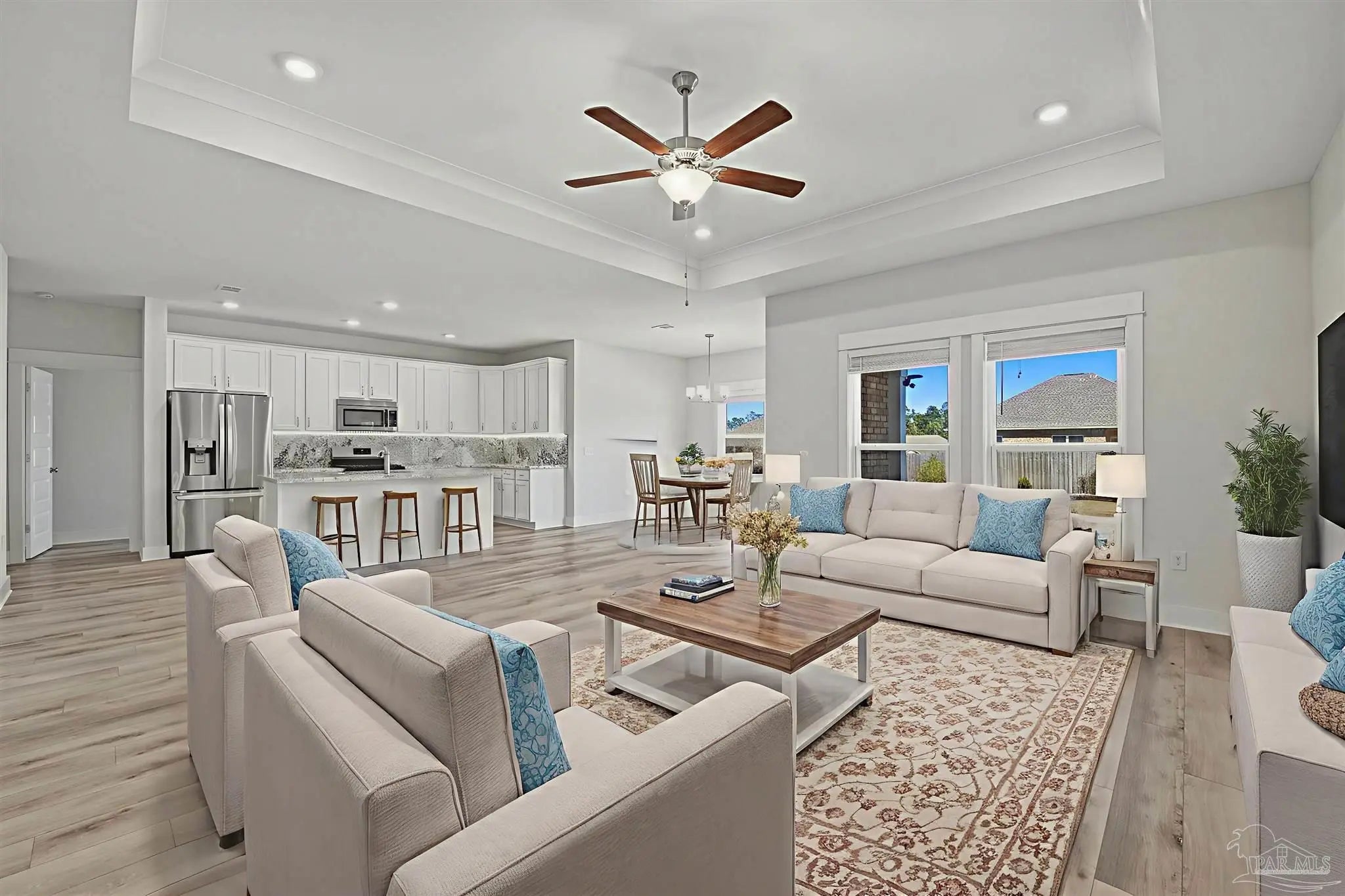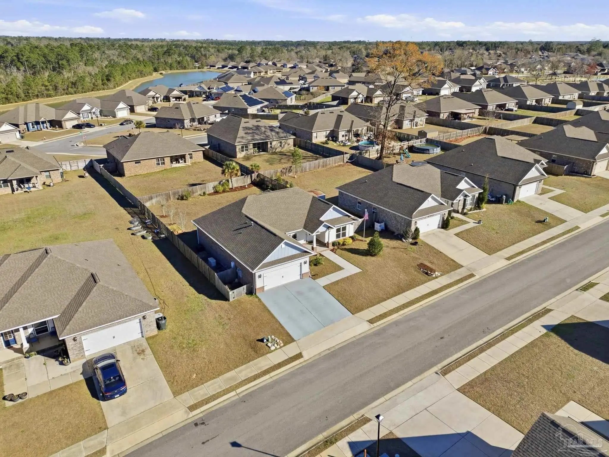 Built in 2021 and thoughtfully elevated beyond standard builds, this 3-bed/2.5-bath Craftsman-style home delivers the advantages of newer construction with a long list of premium upgrades. Offering a smart, split floor plan, the layout provides separation between the primary and secondary bedrooms while maintaining an open living space designed for everyday functionality and entertaining. The kitchen anchors the home with a 7-foot granite island, shaker cabinetry, stainless steel appliances, gas range, built-in microwave, disposal, generous pantry, LED lighting, and bar seating that flows seamlessly into the dining and living areas. Tray ceilings in both the family room and primary suite add architectural interest, while plenty of rear windows overlook the covered patio and paver extension, creating a natural transition to a backyard designed for outdoor gatherings. The well-appointed primary suite includes a custom floor-to-ceiling tiled shower and a layout that prioritizes comfort and privacy. A flex room off the foyer offers versatility for a home office, fitness area, library, media room, or play space. Luxury laminate plank flooring extends through the main living areas, complemented by maintenance-free vinyl trim and brick accents that enhance exterior appeal. Upgrades include: a whole-home Generac generator for uninterrupted power, tankless water heater, epoxy-coated garage flooring, and custom mudroom with bench and cubbies. The covered patio features brick detailing and overlooks a spacious yard ideal for pets, recreation, or future additions. Located in Bentley Oaks, residents enjoy sidewalks, a community park with basketball/pickleball courts, golf cart-friendly streets, biking paths, and regular neighborhood events such as food trucks. With convenient access to I-10, Navy Federal Credit Union campus, and area beaches, this property is an outstanding example of newer construction enhanced with intentional upgrades that truly sets it apart from the crowd.