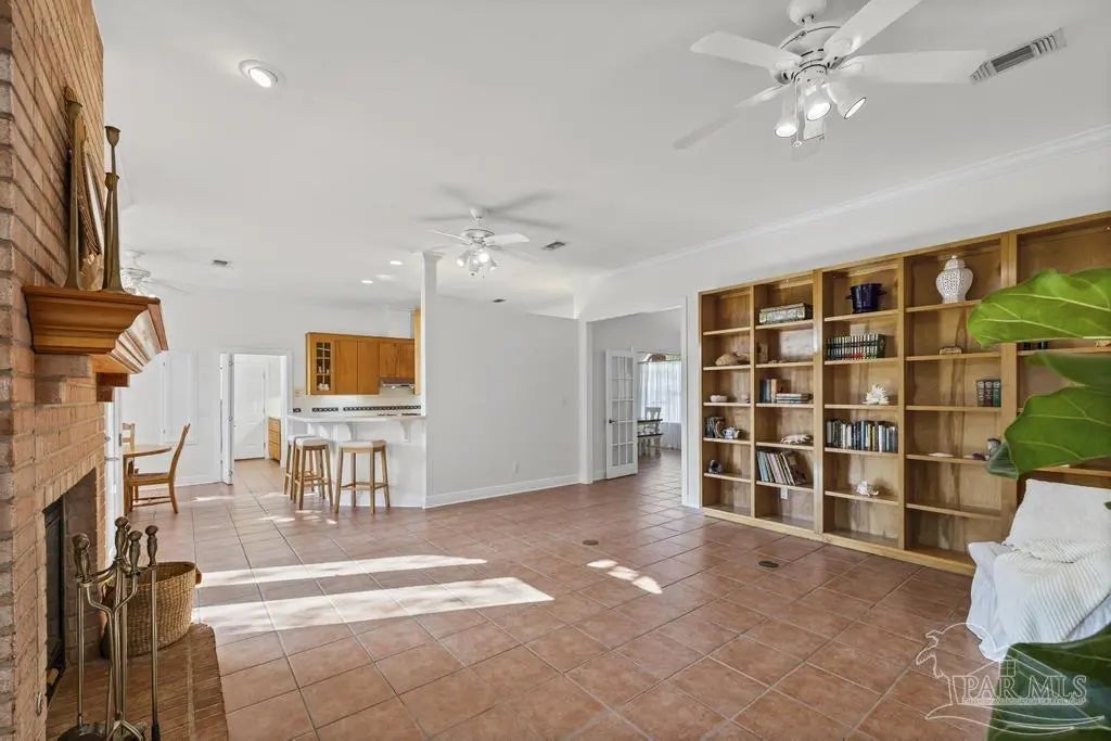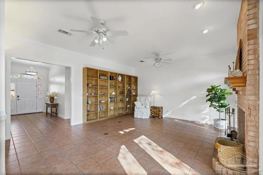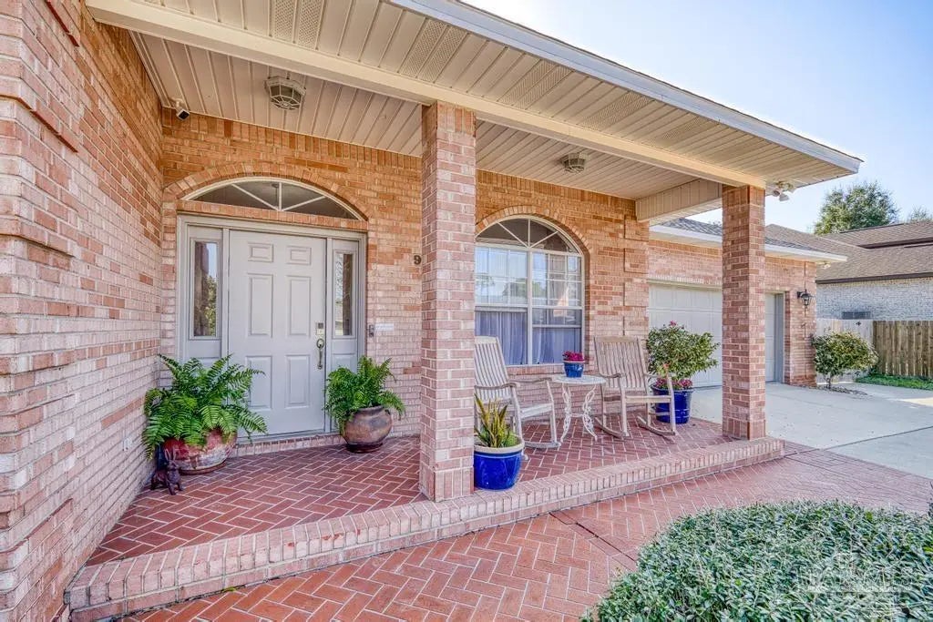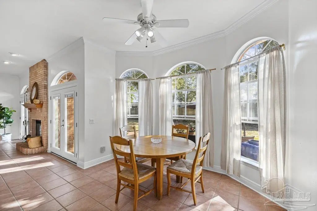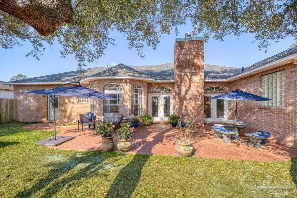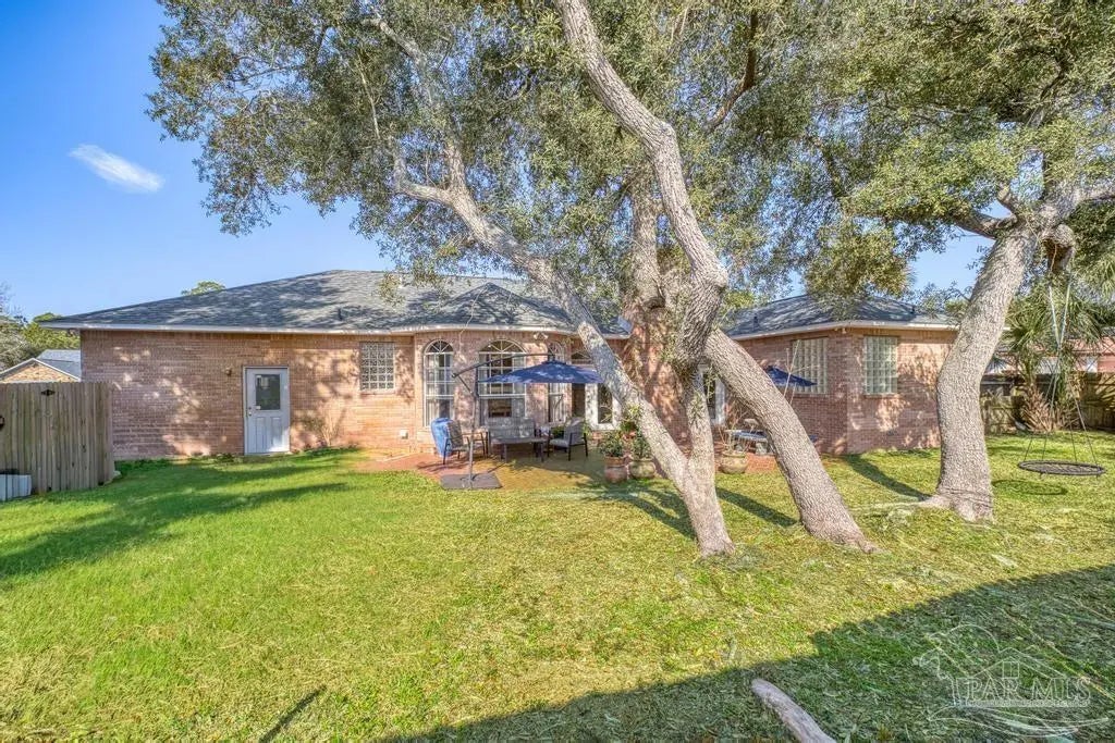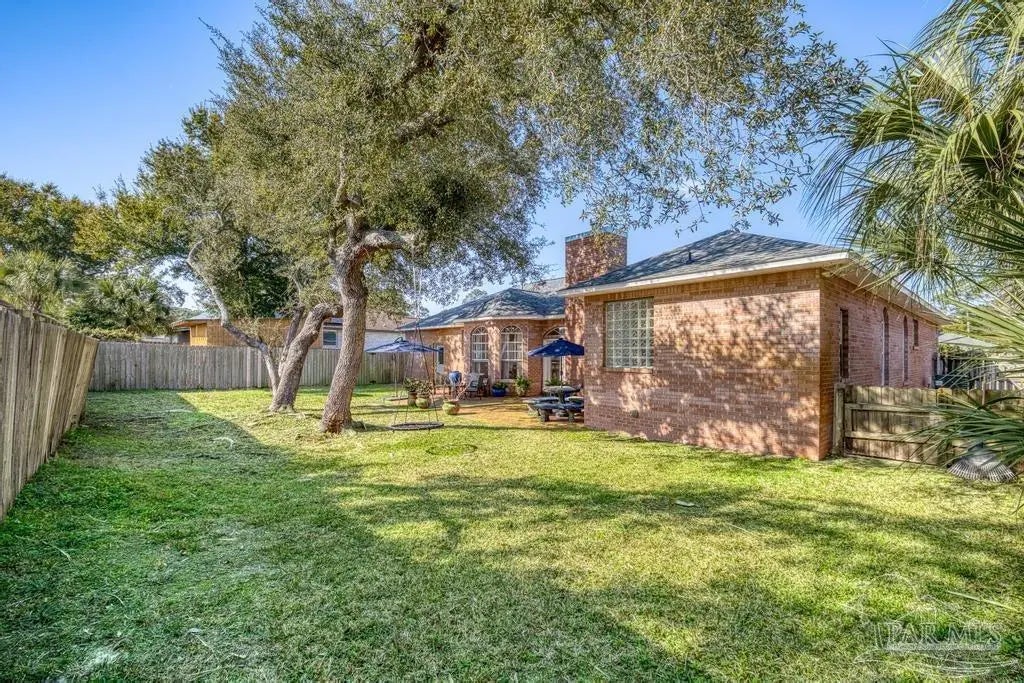 All brick one owner home, custom built with 2x6 construction located just east of Naval Live Oaks. Formal dining room, and family room has built in shelving and a wood burning fireplace. Split floor plan, kitchen has stainless steel appliance, pantry. Opens to the family room and breakfast area. Tile floors throughout the home and 10ft ceilings. Main bedroom has en suite with garden tub, separate shower and double vanity. Two additional bedrooms and guest bathroom. Large patio overlooking back yard perfect for entertaining. Large laundry off the kitchen. Oversized garage. 2025 Roof, Boat and RV parking.Gulf Breeze Elem, Middle and High school district. Close to beach, 10 minutes, but you can walk to the water in this neighborhood. Neighborhood has a park for the kids and a tennis-pickleball court.