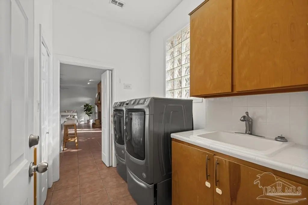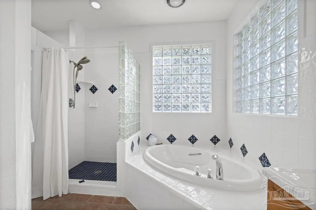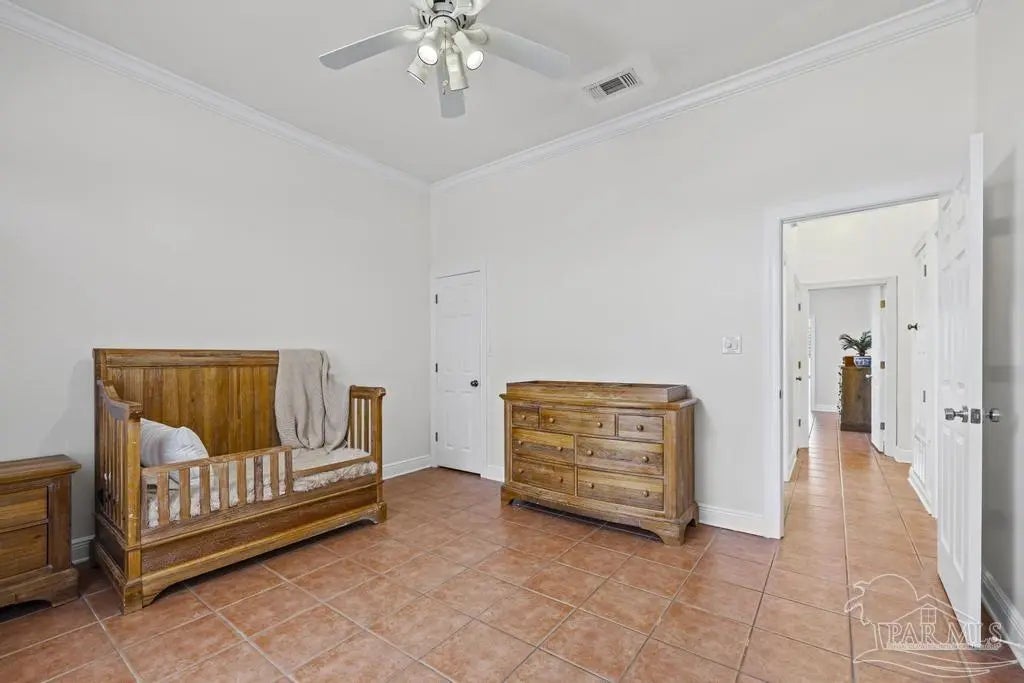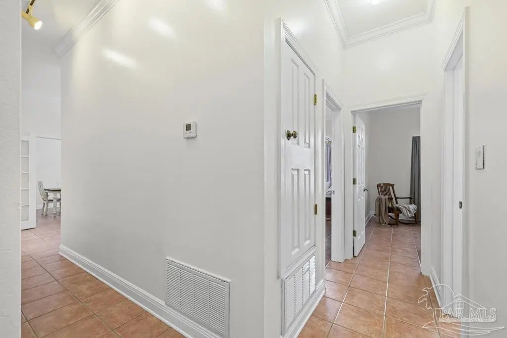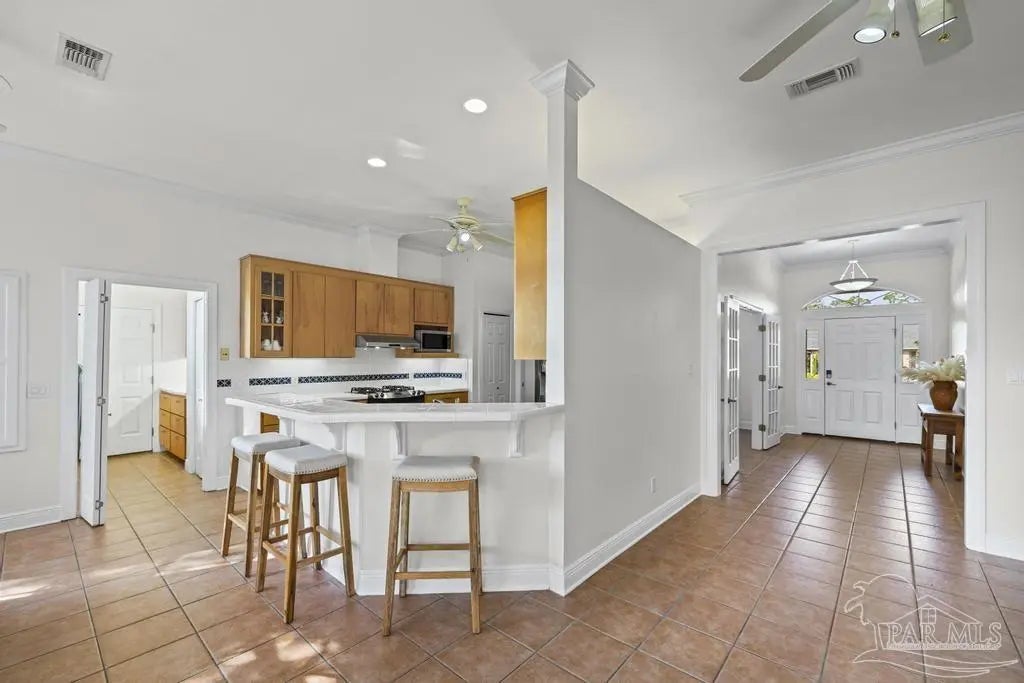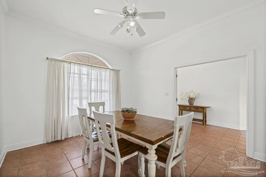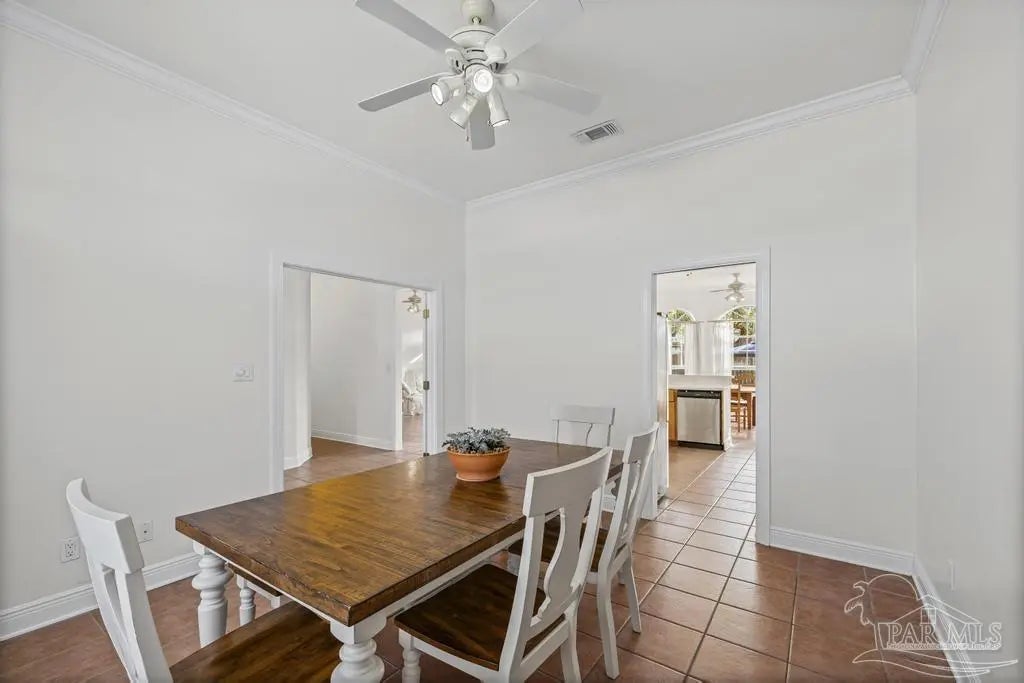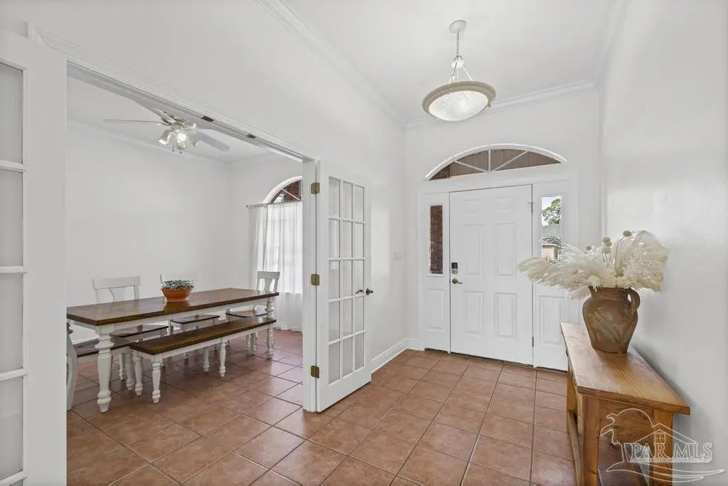 All brick one owner home, custom built with 2x6 construction located just east of Naval Live Oaks. Formal dining room, and family room has built in shelving and a wood burning fireplace. Split floor plan, kitchen has stainless steel appliance, pantry. Opens to the family room and breakfast area. Tile floors throughout the home and 10ft ceilings. Main bedroom has en suite with garden tub, separate shower and double vanity. Two additional bedrooms and guest bathroom. Large patio overlooking back yard perfect for entertaining. Large laundry off the kitchen. Oversized garage. 2025 Roof, Boat and RV parking.Gulf Breeze Elem, Middle and High school district. Close to beach, 10 minutes, but you can walk to the water in this neighborhood. Neighborhood has a park for the kids and a tennis-pickleball court.