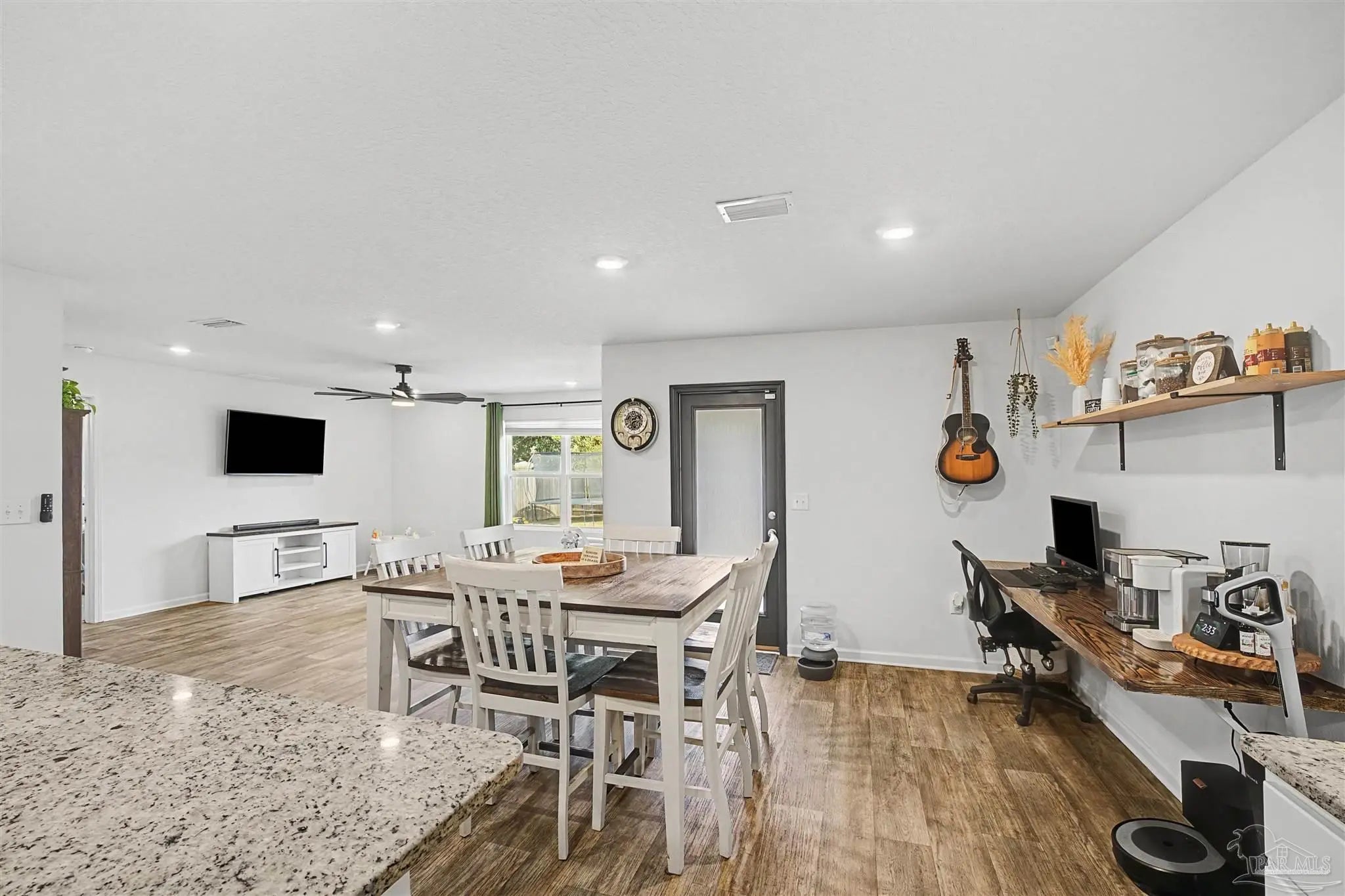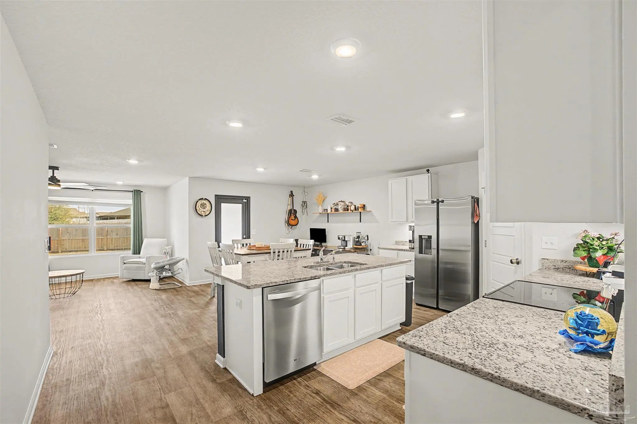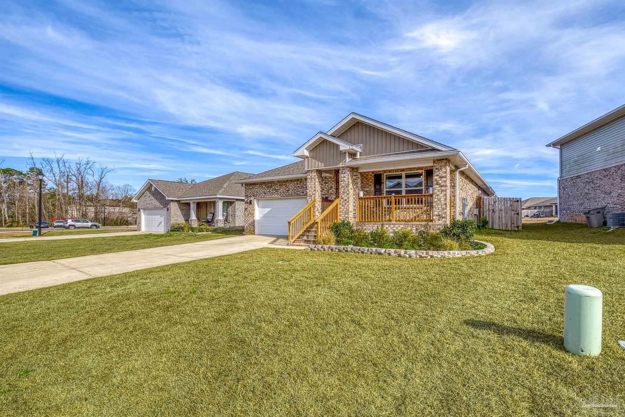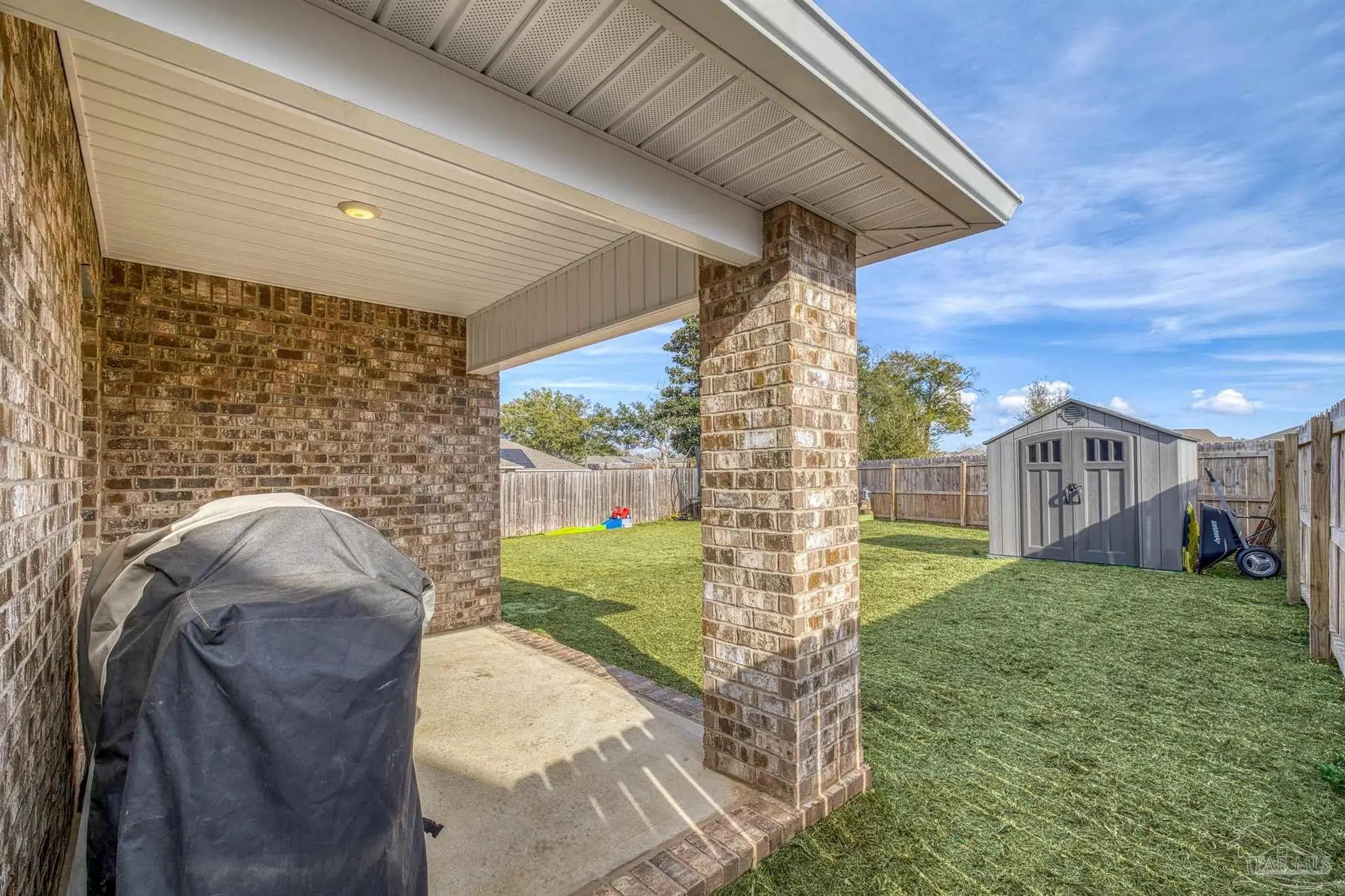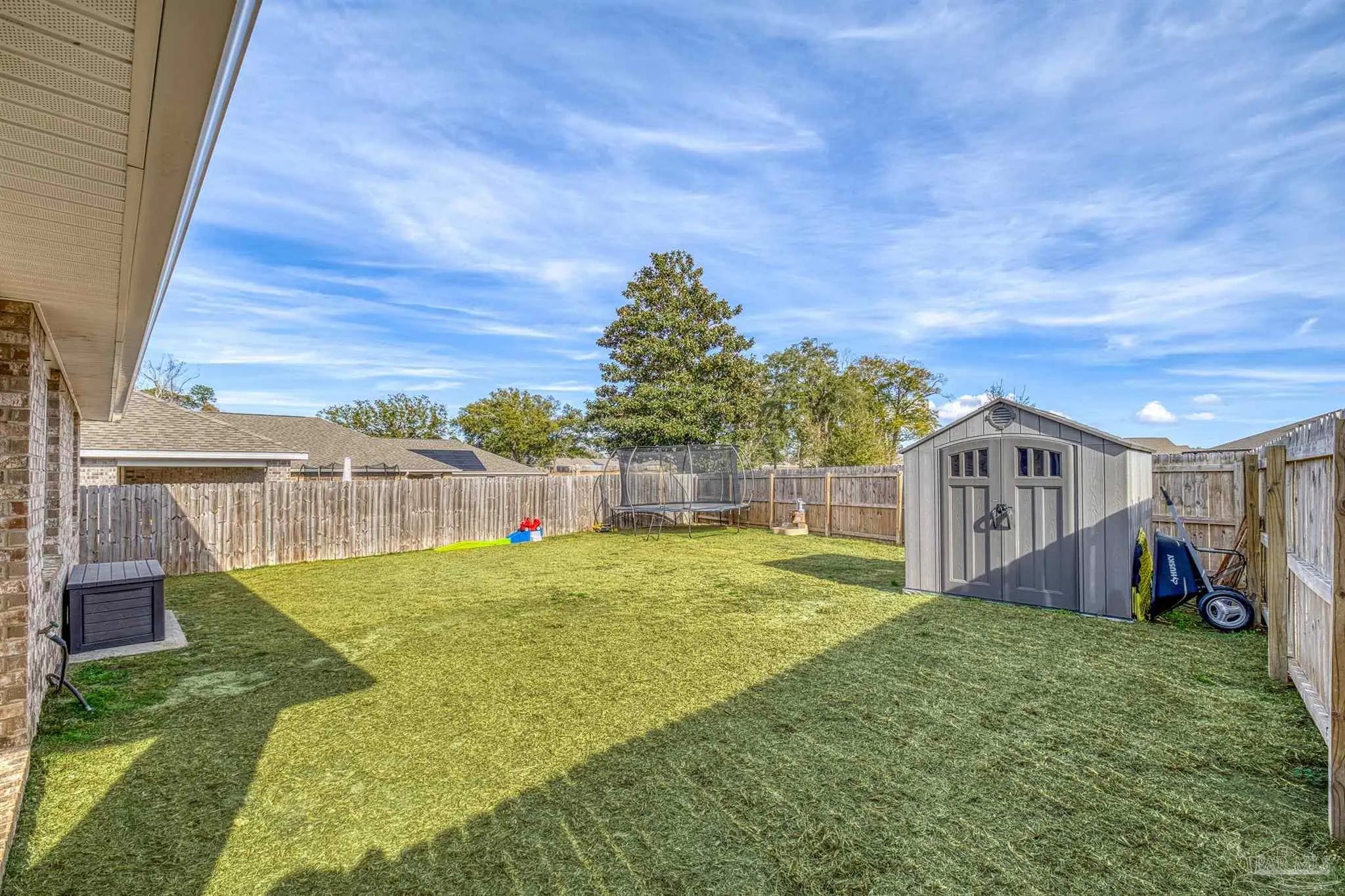 Welcome to Lakeshore Preserve! This refreshed, move-in-ready 4-bed, 2-bath brick home shines with fresh interior paint and a soft-washed exterior. Enjoy an open-concept layout with luxury vinyl plank flooring in main areas and carpet in bedrooms. The spacious kitchen/dining combo features white shaker cabinets, granite countertops, under-cabinet lighting, a large island, walk-in pantry, and stainless steel appliances. The generous living room flows seamlessly. The private primary suite includes a big walk-in closet and luxurious bath with dual granite vanities, separate water closet, and stand-up shower. Two additional bedrooms share a full guest bath, with the third near the laundry room. The fenced backyard offers ample space for entertaining, play, or a future pool, plus an 8’x7.5’ storage shed. The two-car garage has fresh paint, 12’ ceilings, and 3/4” decked attic storage. Steps away: direct lake access to a maintained lake and fishing dock. Neighborhood perks include a dog park, nearby parks, equestrian center, shopping, and dining. Easy commute—7 min to Navy Federal campus (with rec center), ~25 min to Pensacola Beach, 30 min to NAS Pensacola. Comfort, convenience, and community await—make this gem yours today!