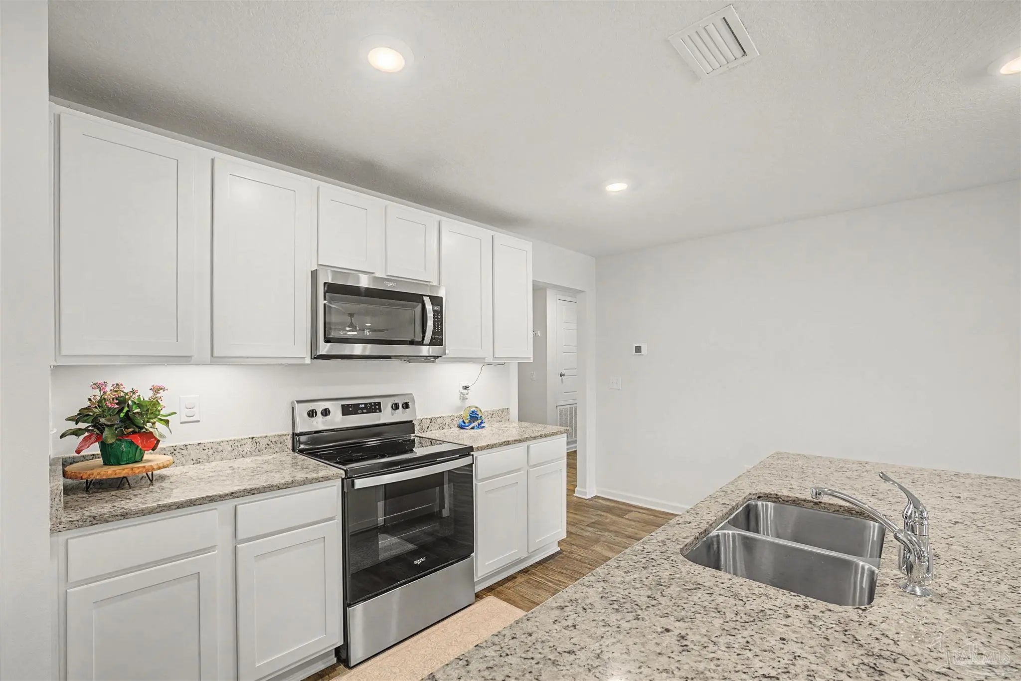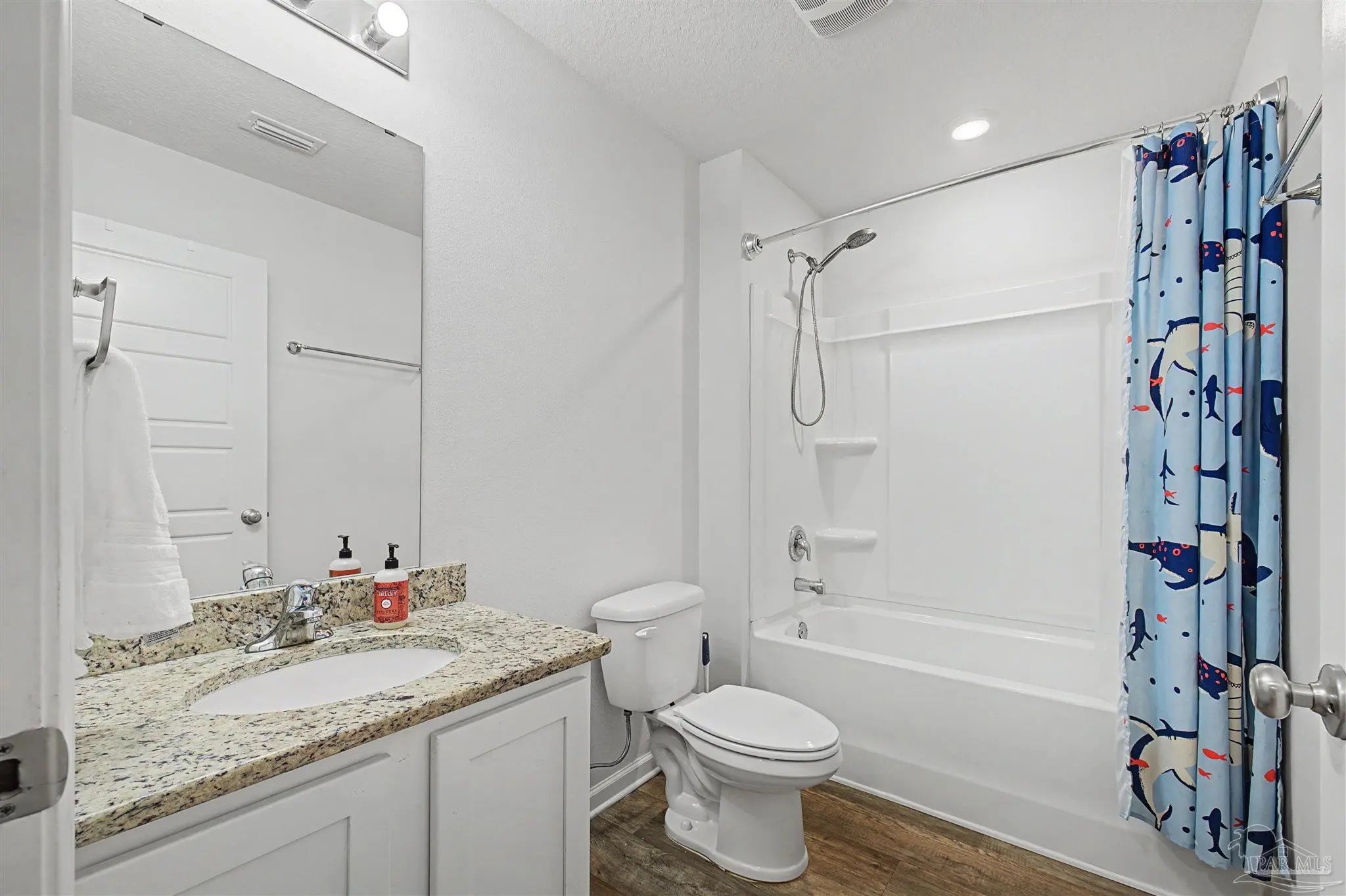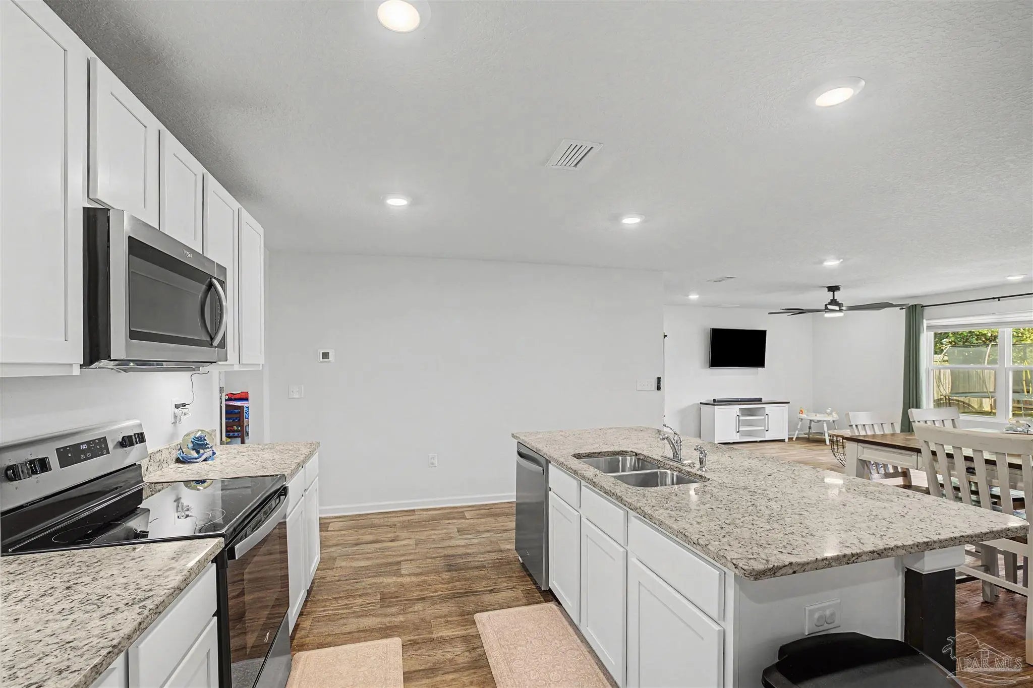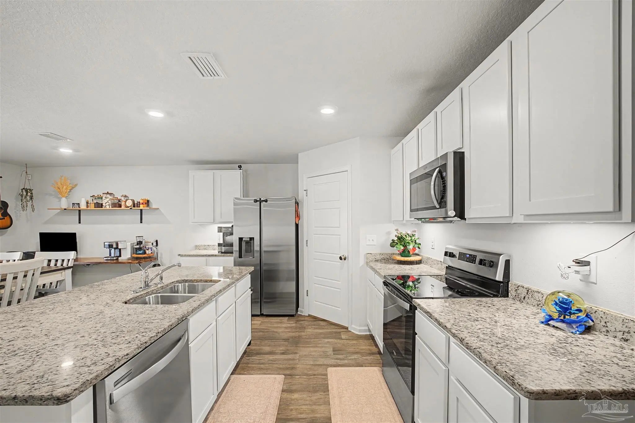 Welcome to Lakeshore Preserve! This refreshed, move-in-ready 4-bed, 2-bath brick home shines with fresh interior paint and a soft-washed exterior. Enjoy an open-concept layout with luxury vinyl plank flooring in main areas and carpet in bedrooms. The spacious kitchen/dining combo features white shaker cabinets, granite countertops, under-cabinet lighting, a large island, walk-in pantry, and stainless steel appliances. The generous living room flows seamlessly. The private primary suite includes a big walk-in closet and luxurious bath with dual granite vanities, separate water closet, and stand-up shower. Two additional bedrooms share a full guest bath, with the third near the laundry room. The fenced backyard offers ample space for entertaining, play, or a future pool, plus an 8’x7.5’ storage shed. The two-car garage has fresh paint, 12’ ceilings, and 3/4” decked attic storage. Steps away: direct lake access to a maintained lake and fishing dock. Neighborhood perks include a dog park, nearby parks, equestrian center, shopping, and dining. Easy commute—7 min to Navy Federal campus (with rec center), ~25 min to Pensacola Beach, 30 min to NAS Pensacola. Comfort, convenience, and community await—make this gem yours today!
