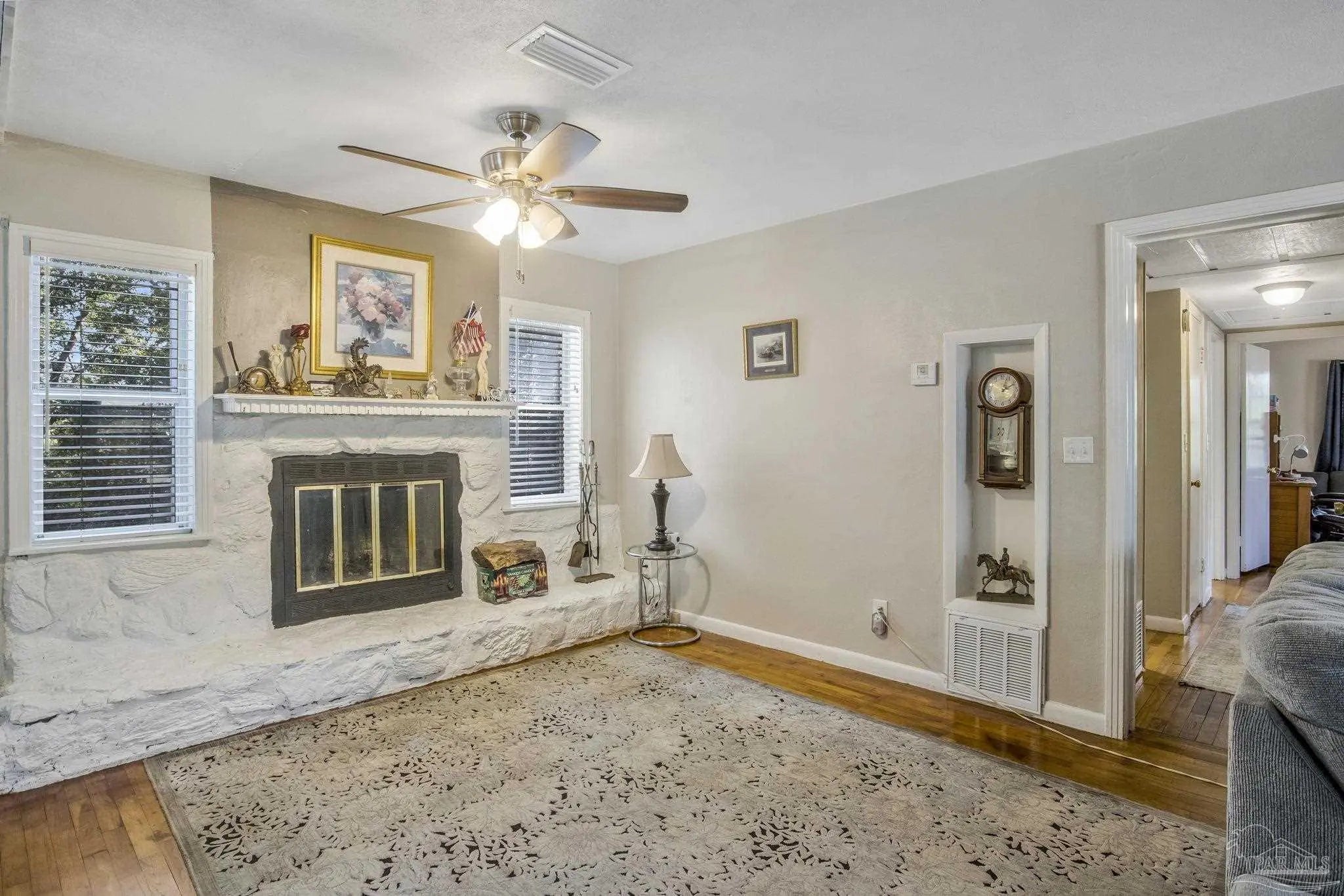 Welcome to this charming home situated on a spacious corner lot. This residence features three bedrooms and one bathroom, with hardwood flooring and an open living space highlighted by a wood-burning fireplace. The kitchen is equipped with modern appliances, ample cabinetry, and a dedicated pantry. Key updates include a new roof 2021 and a new electrical panel 2021, The property also offers a fenced-in yard and additional outdoor storage. Notably, the sale includes a camper currently utilized as an Airbnb, and the property is equipped with an RV hookup. For convenience, the laundry area is located inside the garage.