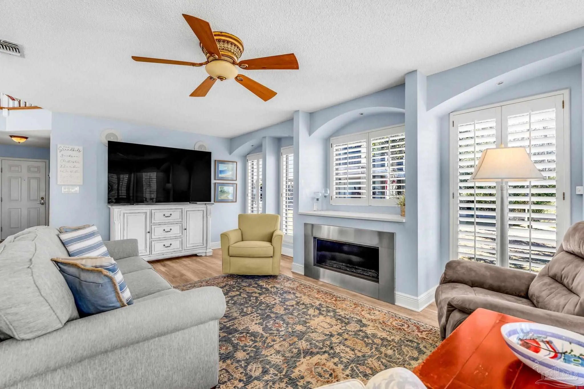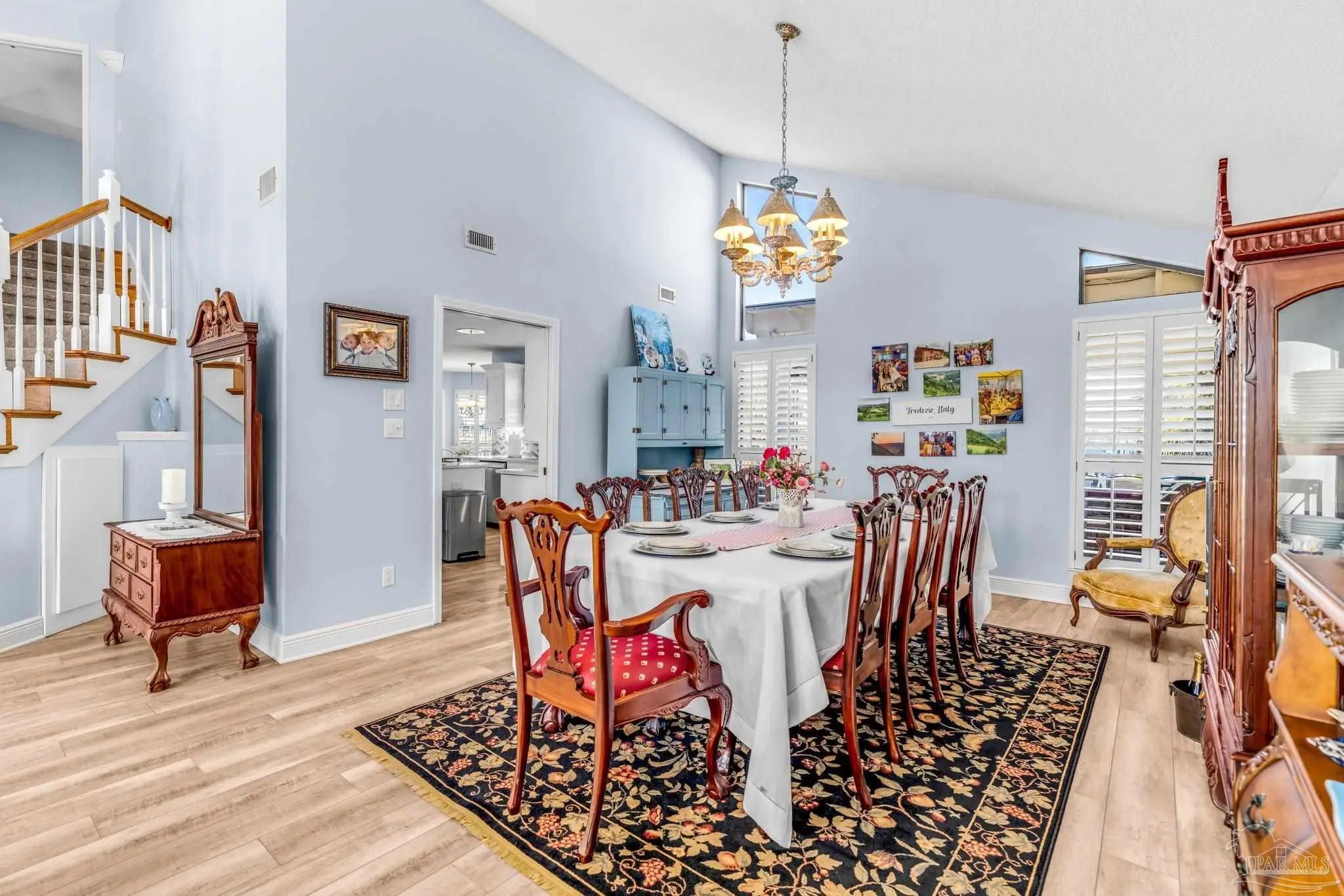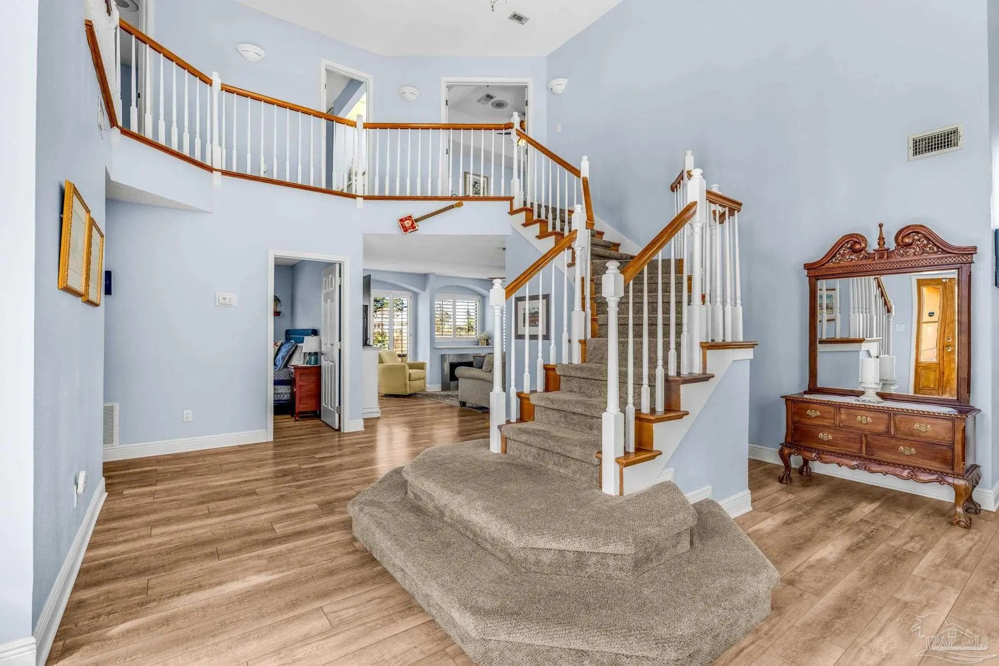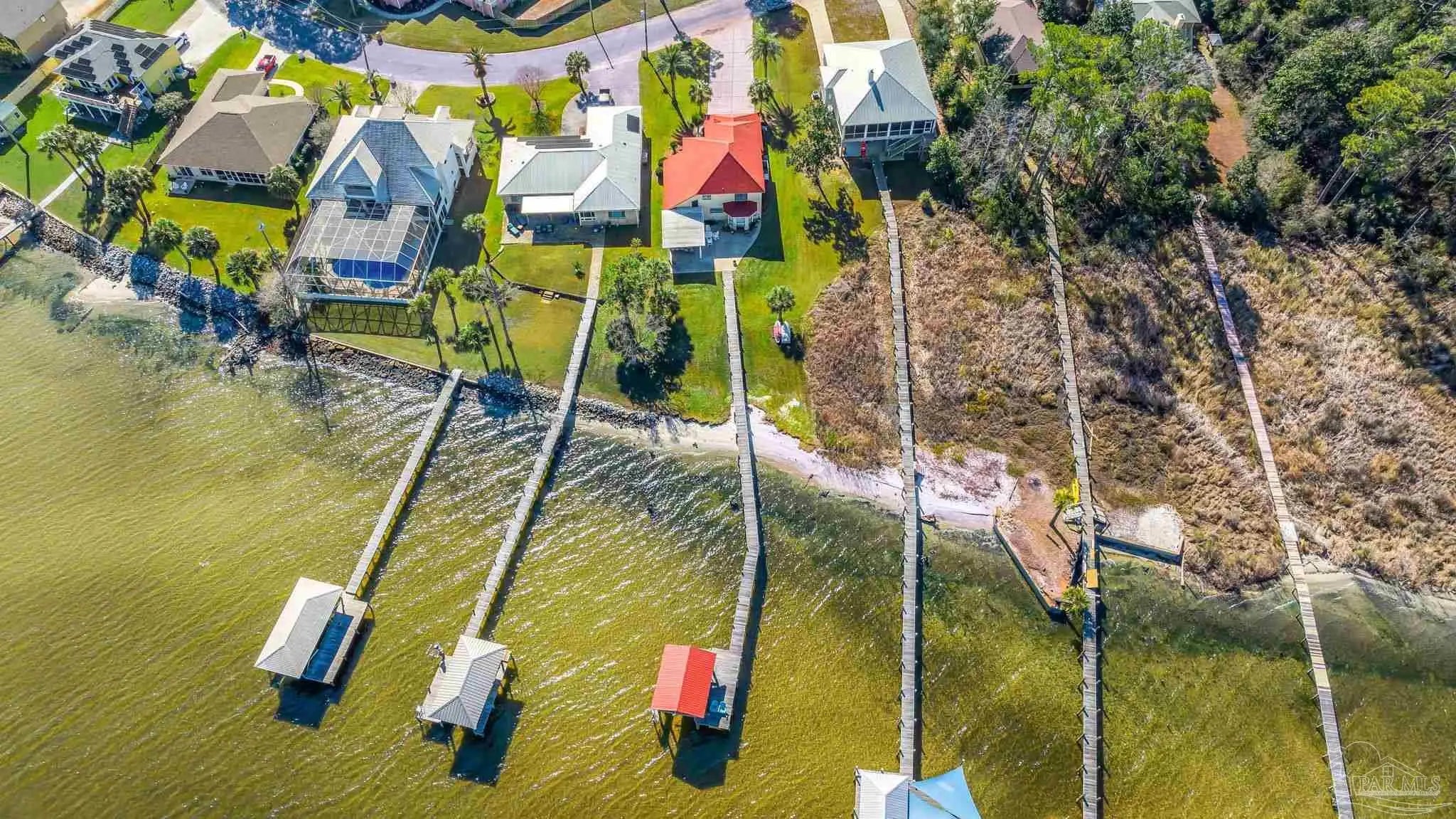 Wake up to wide-open water views and effortless coastal living in this beautifully waterfront home on Perdido Bay. Designed with entertaining in mind, this 4-bedroom, 3-bath residence blends refined interior finishes with resort-style outdoor spaces for a lifestyle that truly embraces the bay. This home has a formal living room and dining room, along with a warm, inviting family room centered around a remote-controlled ventless gas fireplace. The kitchen stands out with crisp quartz countertops, a sleek glass backsplash, and shaker cabinetry with pull-out storage, paired with premium appliances including Thermador double ovens, a Viking gas cooktop, and an LG refrigerator—ideal for both everyday meals and special occasions. The interior showcases luxury vinyl plank flooring installed in 2021, classic plantation shutters, and sweeping curved staircase. Outside, the home transforms into a private waterfront escape. A covered outdoor kitchen features a Big Green Egg, Jenn-Air grill, refrigerator, sink, poured concrete bar, and a remote-controlled powered sunshade—creating a comfortable setting for year-round gatherings. The private dock and covered boathouse offer lift, power, and water, providing direct access to the bay and unforgettable sunset views. Set on approximately 0.38 acres, the property also includes a metal roof installed in 2021, refreshed stucco in 2020, and an irrigation system to maintain the lush coastal landscaping.