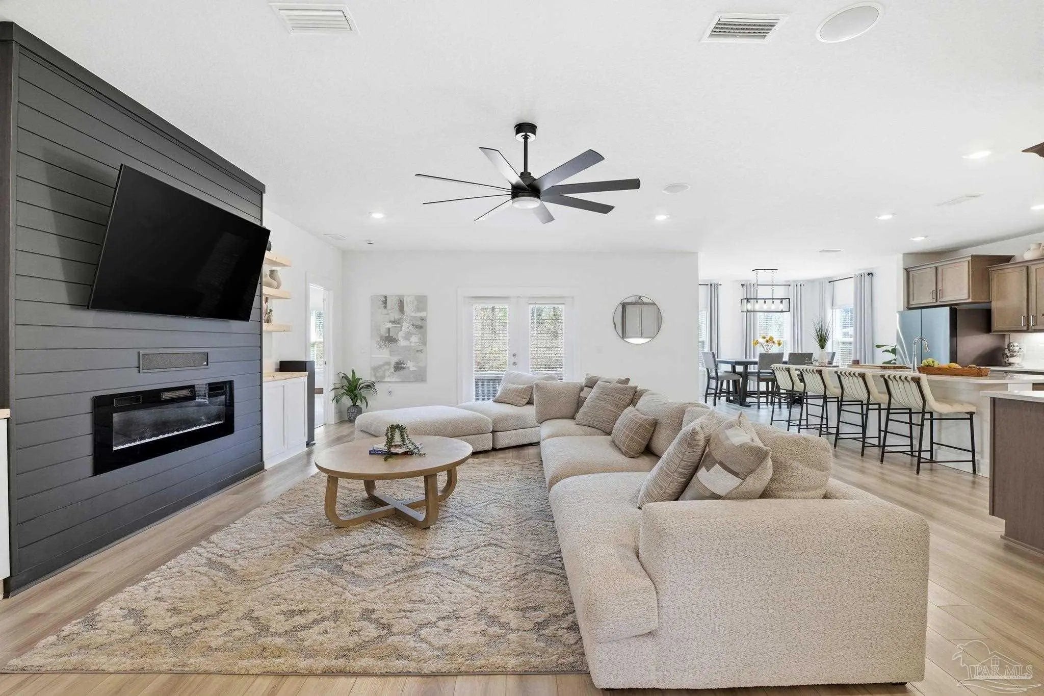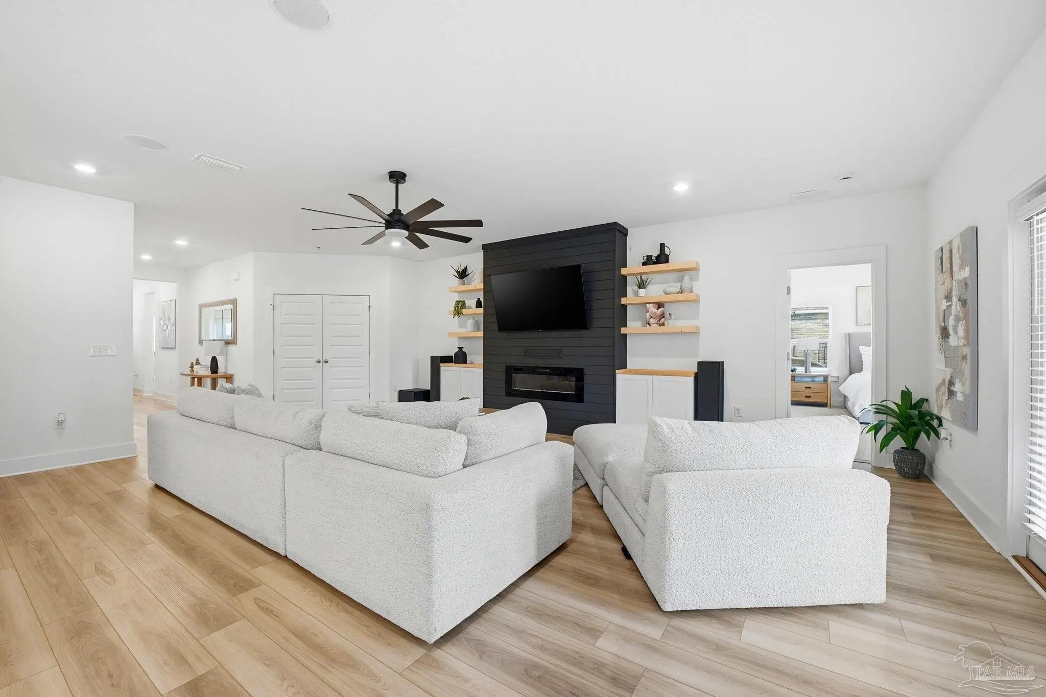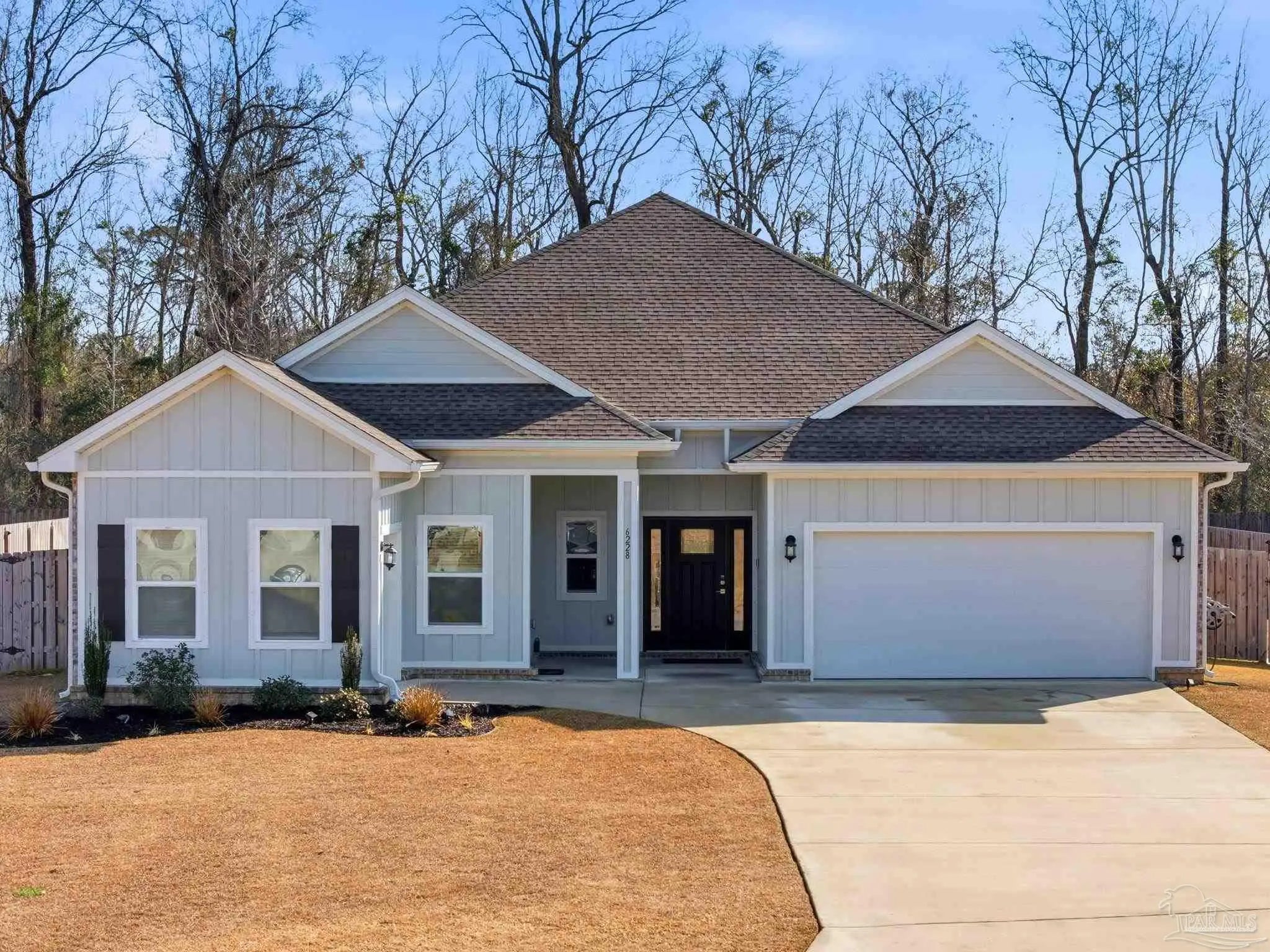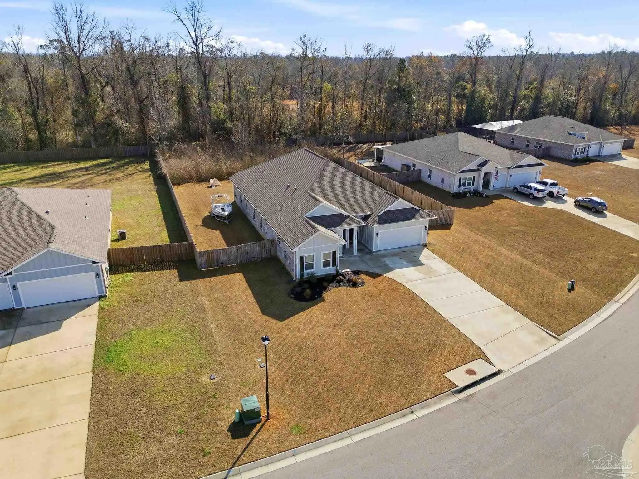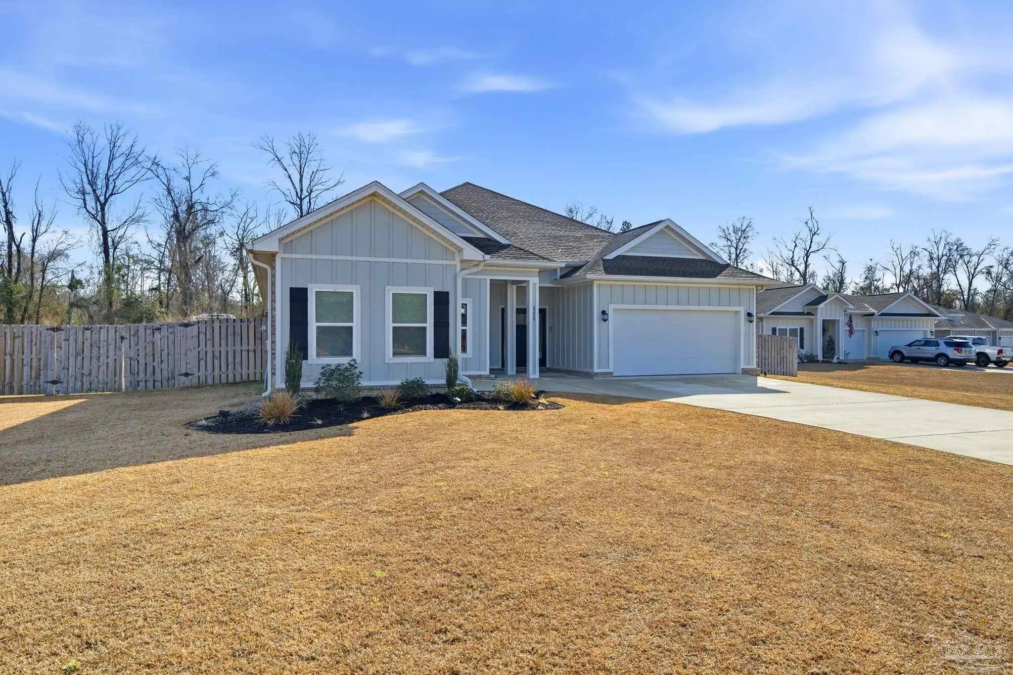 Come take a look at this thoughtfully designed 4-bedroom (+ FLEX room), 3.5-bath home featuring an ATTACHED GUEST SUITE with its own entrance and a recreational garage! In the main home, the foyer welcomes you with a hop-up ceiling and bead board detail. Just off the foyer, a hallway to the left leads to a private office with custom shelving and a half bath featuring board and batten walls. A hallway to the right leads to two bedrooms, a full bath, and a convenient linen closet. Continuing into the main living area, the family room showcases a modern electric fireplace, built-in shelving, recessed lighting, and double doors leading to the covered back patio. Just off the family room is a flex room with double-door entry and board and batten walls. The stunning kitchen offers quartz countertops, a large island, a single-bowl stainless sink, soft-close cabinetry, a pantry, built-in microwave, and more! A dining area connects seamlessly and provides direct patio access, making it ideal for entertaining. The secluded primary suite features tray ceilings and private access to the lanai. The ensuite bath includes double vanities, a linen closet, garden tub, separate shower, water closet, and a spacious walk-in closet! The attached guest suite includes a kitchenette with quartz countertops, a built-in microwave, dishwasher, pantry closet, refrigerator space, and sink. The suite's hallway provides access to a full bath, laundry closet with stackable washer/dryer, additional hallway closets, and a bedroom with a walk-in closet. This suite is perfect for multigenerational living, caregiver quarters, game/media/workout, luxury work-from-home space, etc! Outdoor features include gutters, a sprinkler system, double gate on the left side of the home, single gate on the opposite side, and a fully fenced backyard (yard is not fully cleared). Don't miss out on this incredible move-in-ready home and don't forget to check-out the virtual tour!