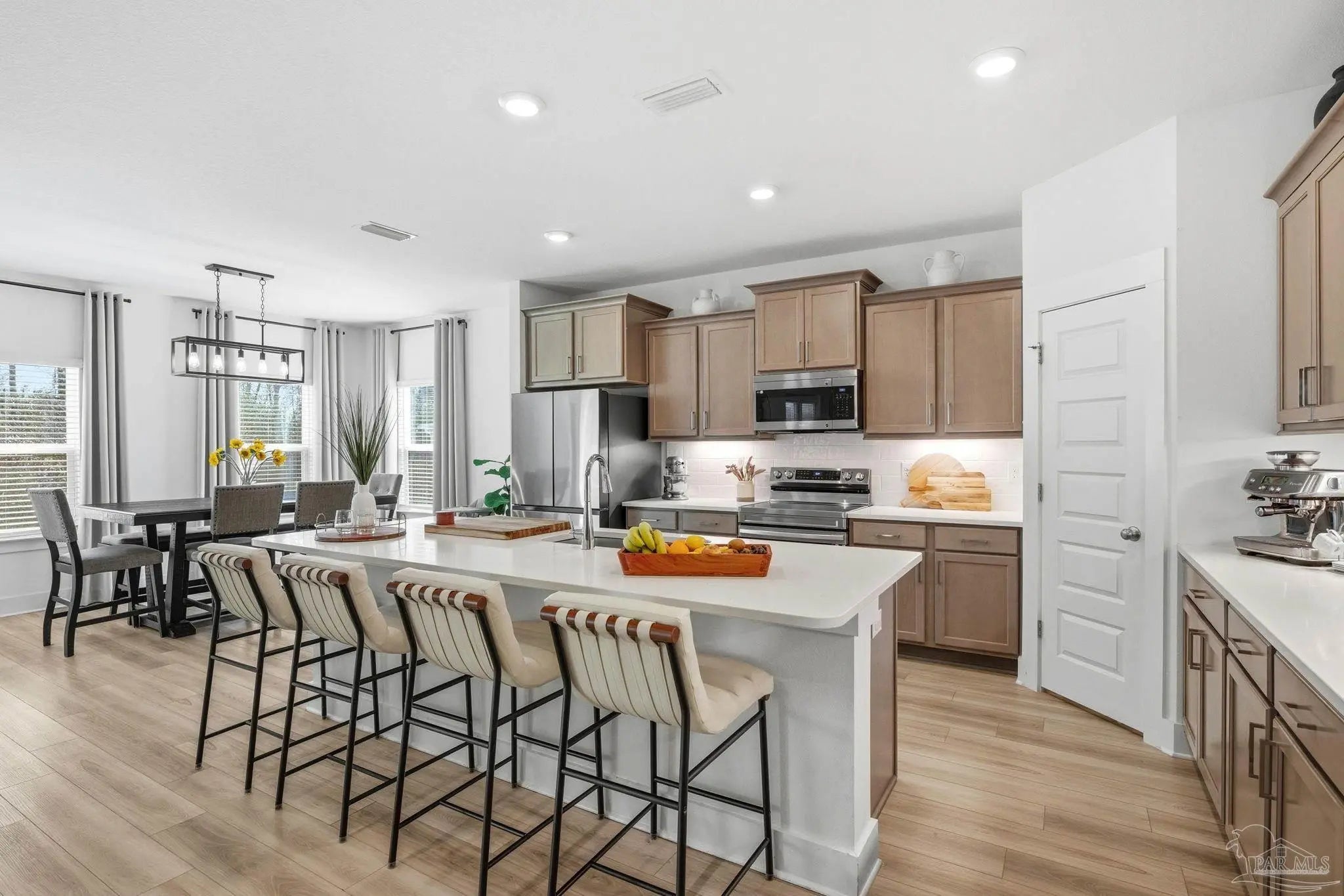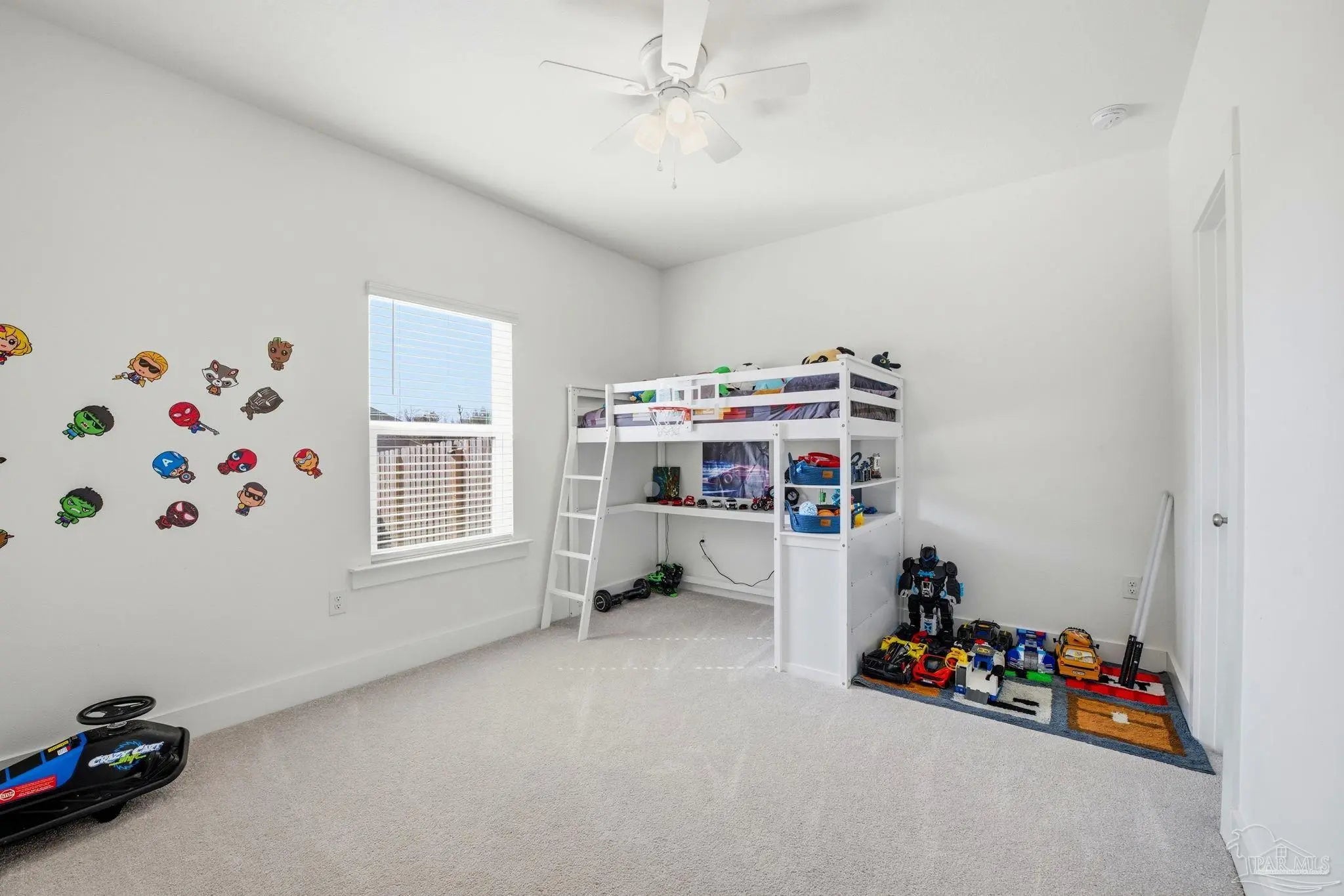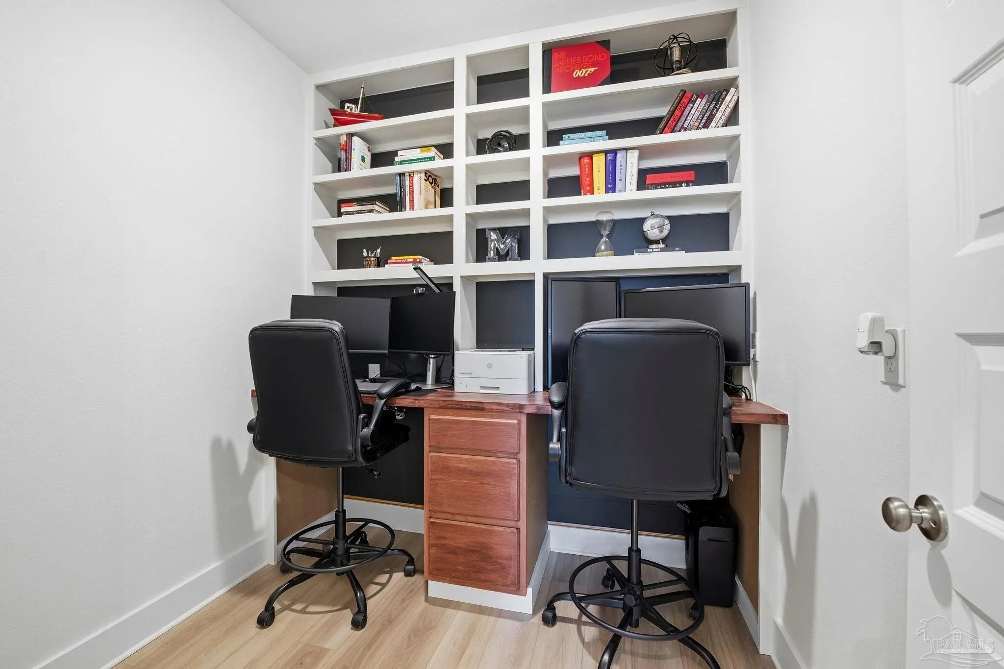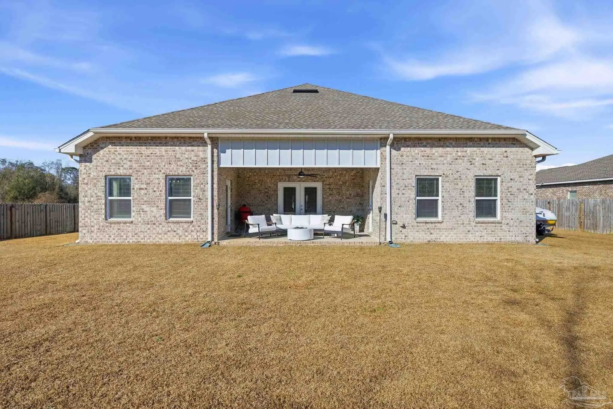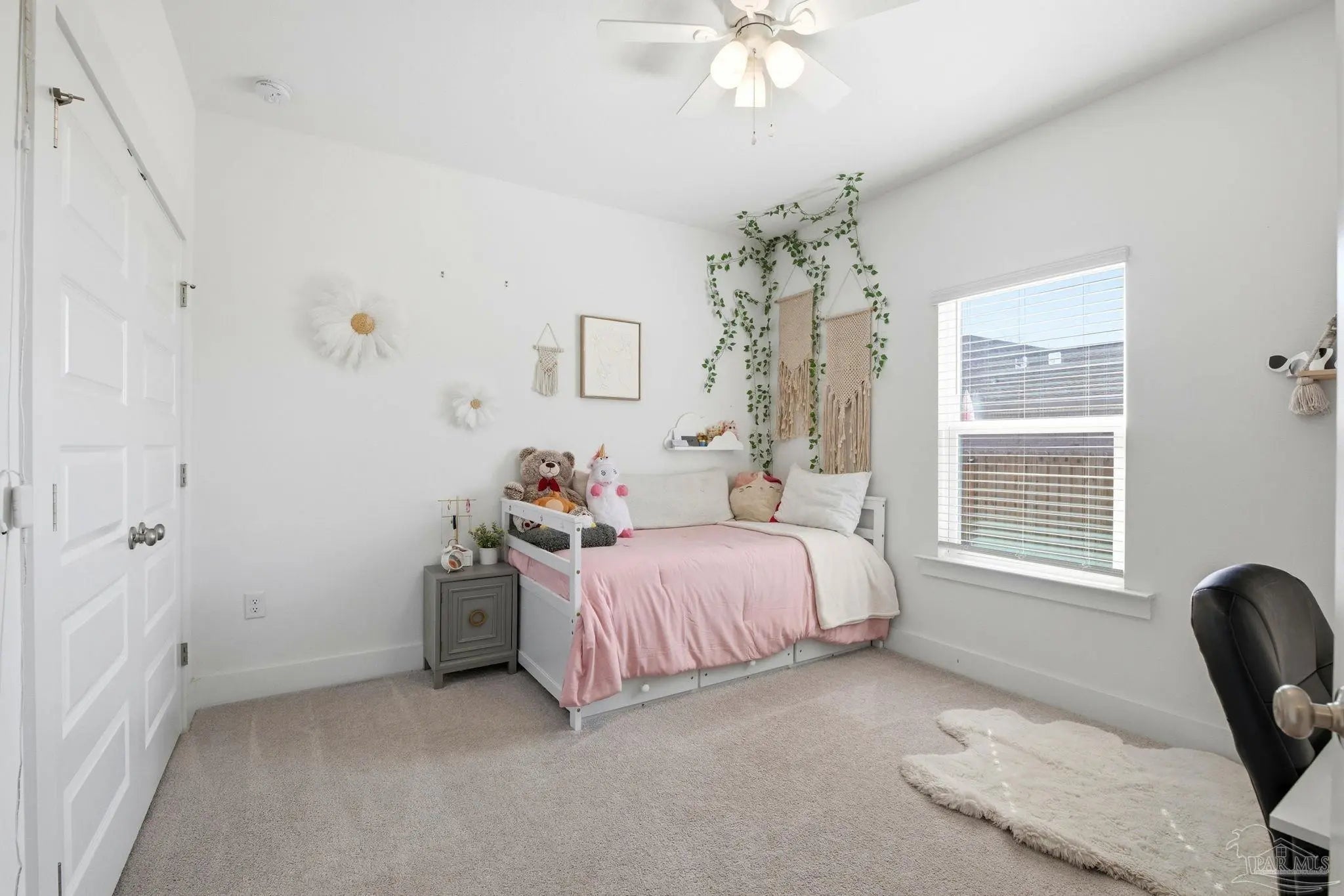 Come take a look at this thoughtfully designed 4-bedroom (+ FLEX room), 3.5-bath home featuring an ATTACHED GUEST SUITE with its own entrance and a recreational garage! In the main home, the foyer welcomes you with a hop-up ceiling and bead board detail. Just off the foyer, a hallway to the left leads to a private office with custom shelving and a half bath featuring board and batten walls. A hallway to the right leads to two bedrooms, a full bath, and a convenient linen closet. Continuing into the main living area, the family room showcases a modern electric fireplace, built-in shelving, recessed lighting, and double doors leading to the covered back patio. Just off the family room is a flex room with double-door entry and board and batten walls. The stunning kitchen offers quartz countertops, a large island, a single-bowl stainless sink, soft-close cabinetry, a pantry, built-in microwave, and more! A dining area connects seamlessly and provides direct patio access, making it ideal for entertaining. The secluded primary suite features tray ceilings and private access to the lanai. The ensuite bath includes double vanities, a linen closet, garden tub, separate shower, water closet, and a spacious walk-in closet! The attached guest suite includes a kitchenette with quartz countertops, a built-in microwave, dishwasher, pantry closet, refrigerator space, and sink. The suite's hallway provides access to a full bath, laundry closet with stackable washer/dryer, additional hallway closets, and a bedroom with a walk-in closet. This suite is perfect for multigenerational living, caregiver quarters, game/media/workout, luxury work-from-home space, etc! Outdoor features include gutters, a sprinkler system, double gate on the left side of the home, single gate on the opposite side, and a fully fenced backyard (yard is not fully cleared). Don't miss out on this incredible move-in-ready home and don't forget to check-out the virtual tour!