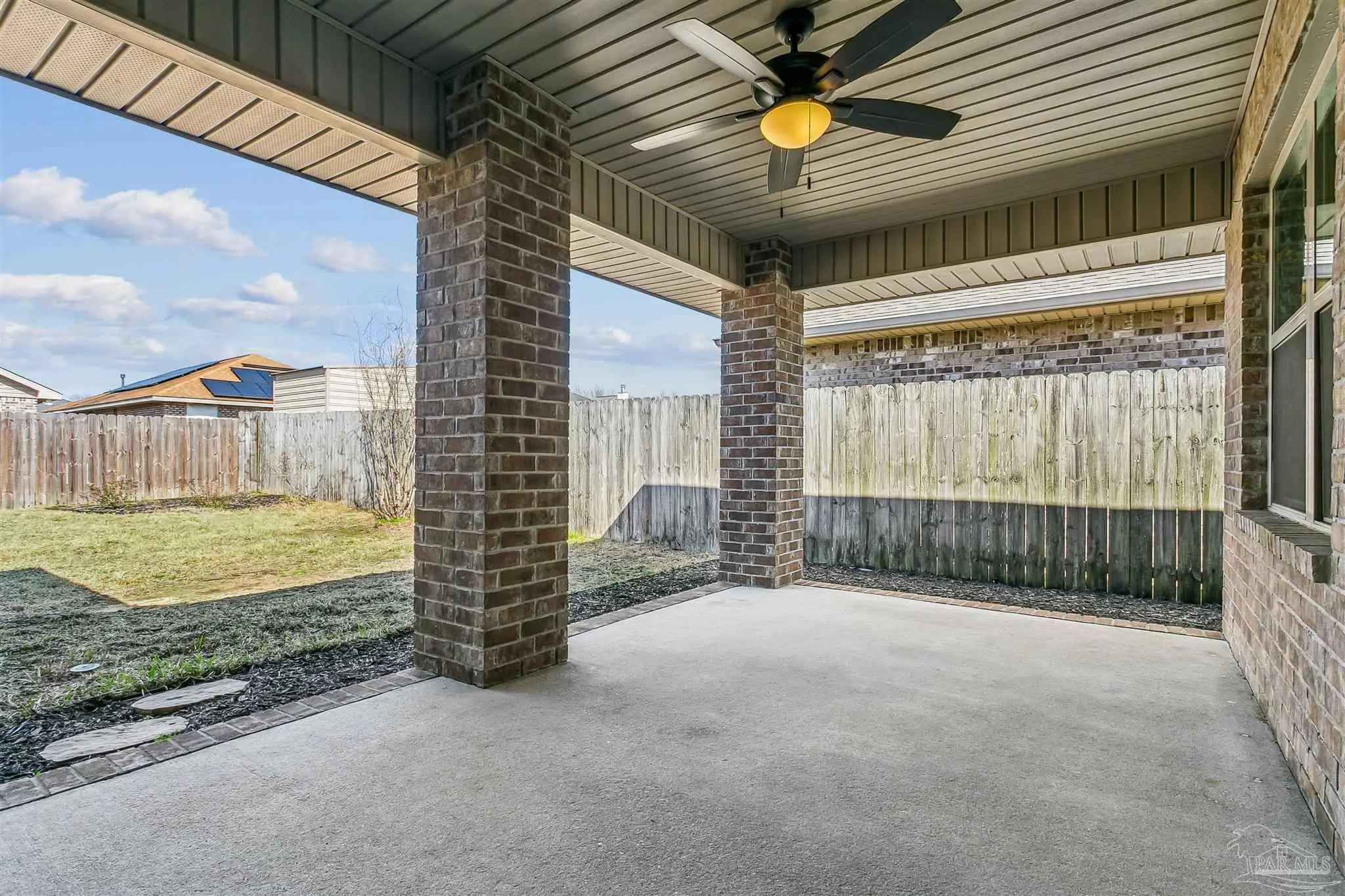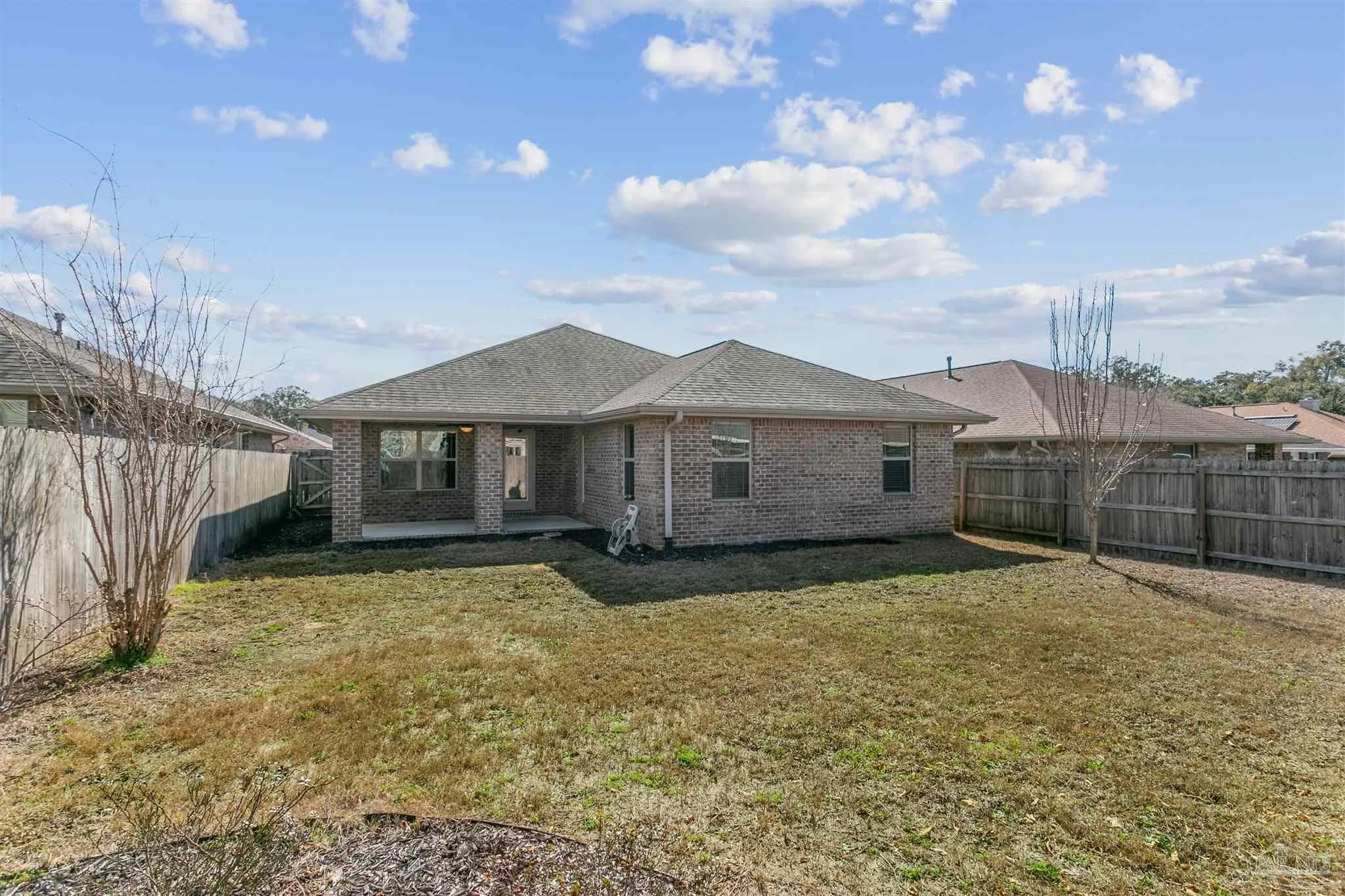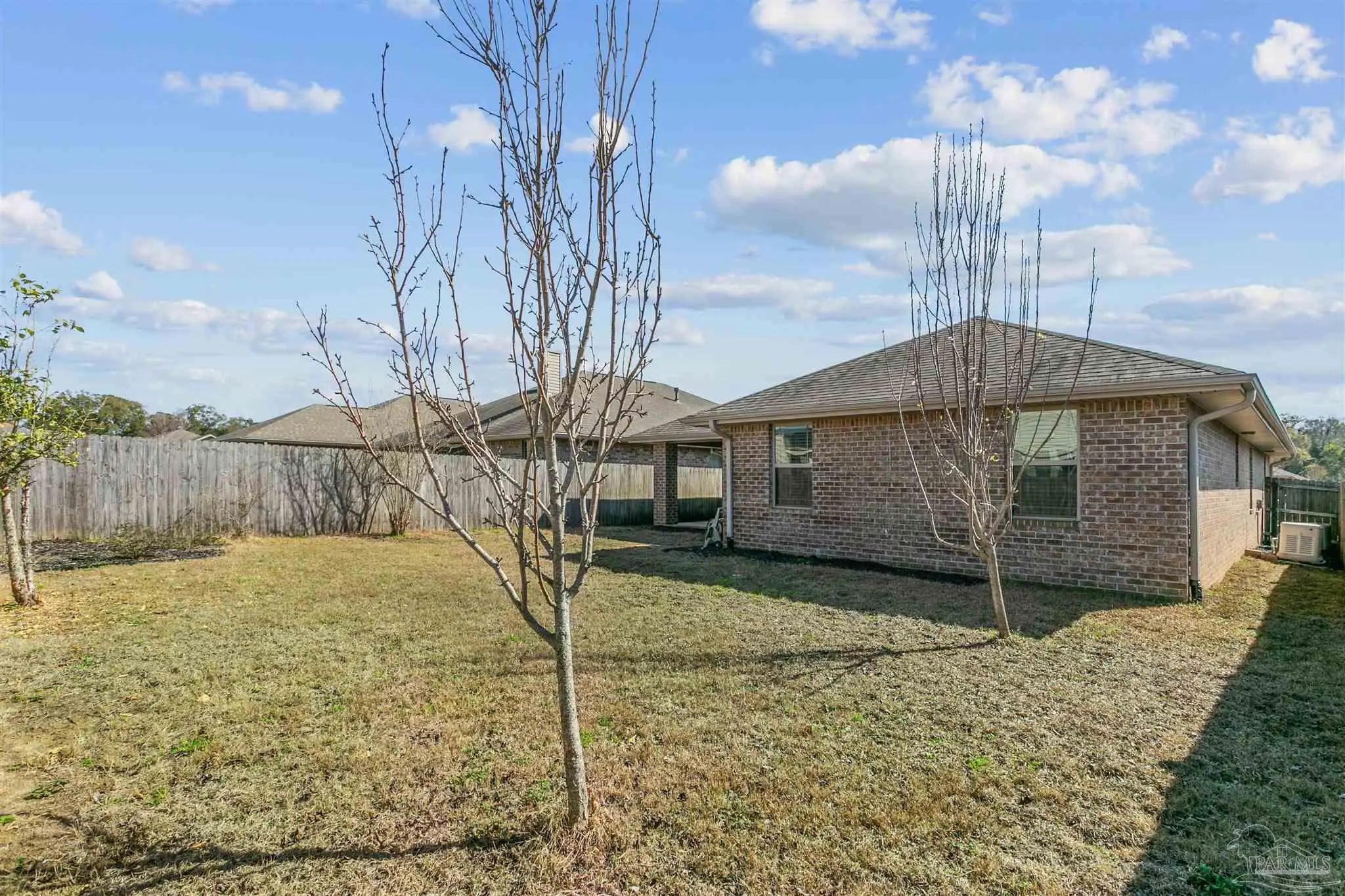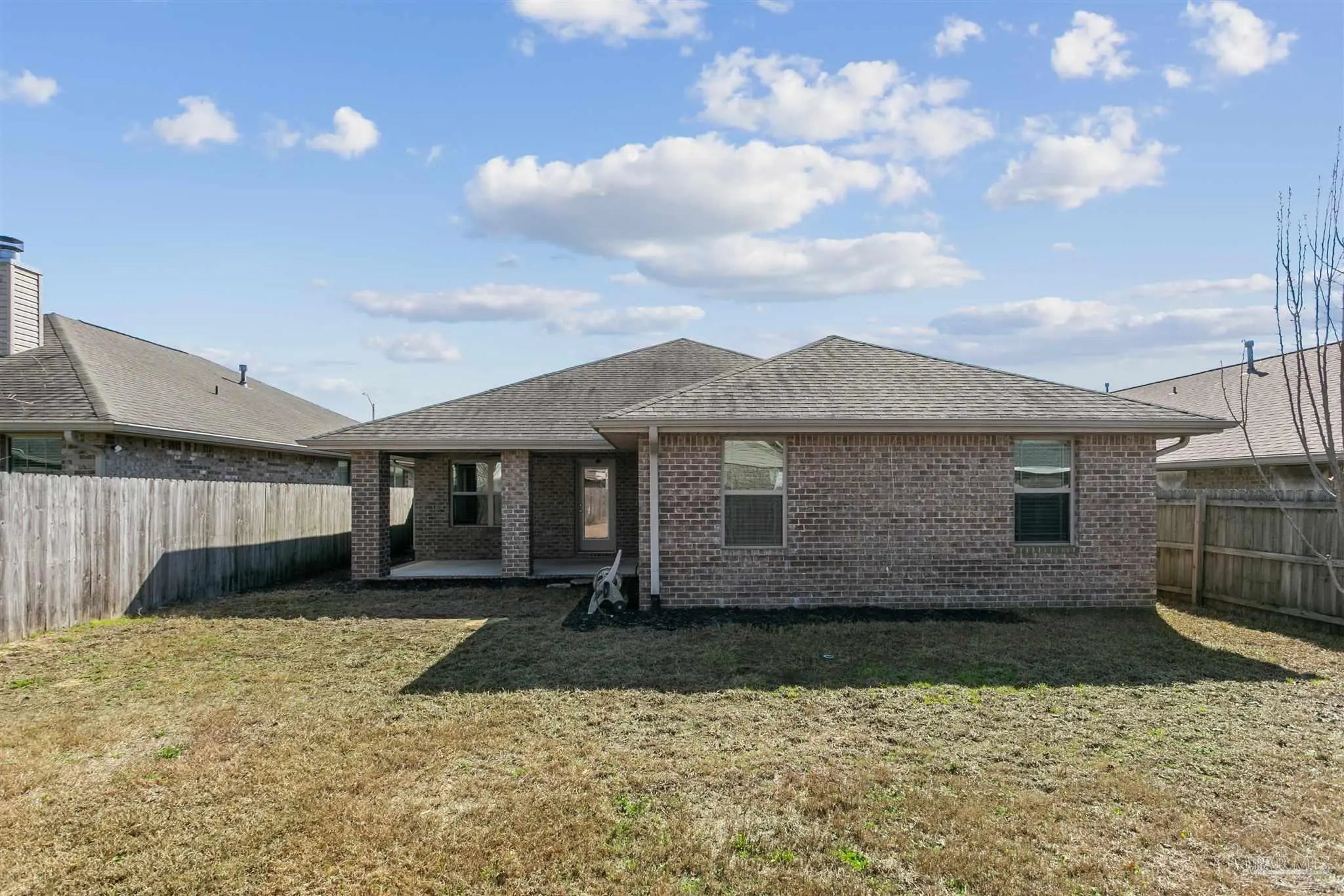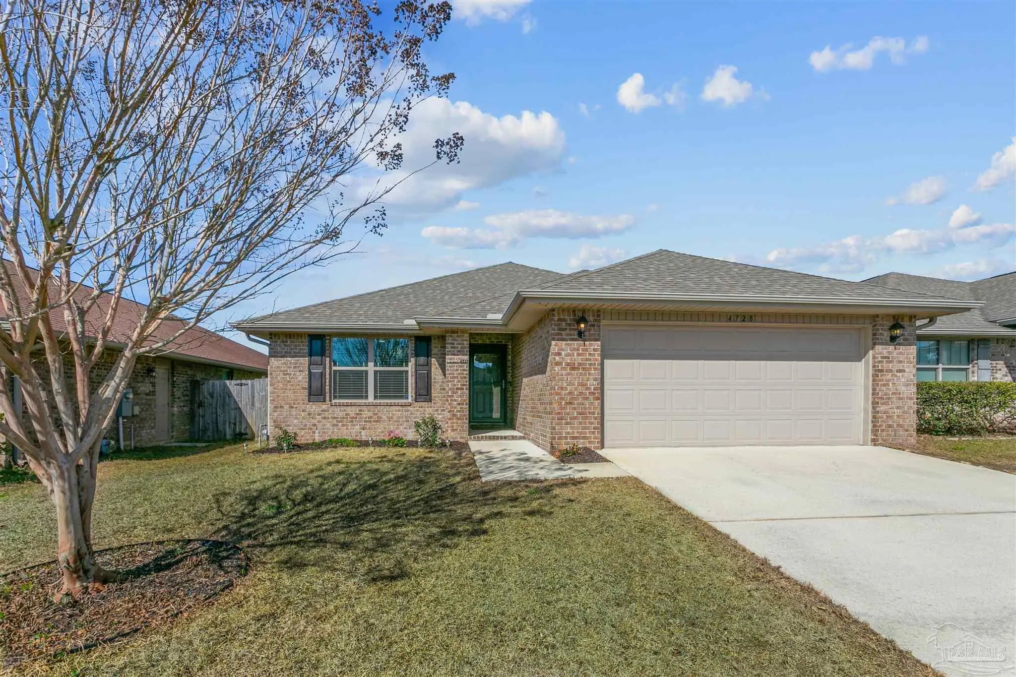 OPEN HOUSE SATURDAY 2/21 from 12:00 PM - 2:00 PM ** Prime Pace location with everyday convenience right at your doorstep—this all-brick home is less than a quarter mile from shopping and dining, including Target and Publix, under a mile to major grocery and home improvement stores, and public schools are all within three miles. The beautifully updated kitchen features GORGEOUS brand-new quartzite countertops and backsplash (2026), customized cabinet pull-outs, a large pantry, breakfast bar, and breakfast room. Stainless appliances were replaced between 2021–2023 and include an induction range with temperature probe, air-fry capability, and a brand-new, never-opened set of compatible cookware. A Maytag washer and dryer with pedestal stands also convey. The open, split floor plan flows seamlessly into a spacious great room with generous living space featuring high ceilings and a defined formal dining or office area. The HUGE primary suite (22x14) offers plenty of room for a sitting area, desk, or workout space, along with direct access to the covered back patio. The en suite bath features a double vanity with custom pull-outs, brand-new granite countertops (2026), an oversized walk-in closet, garden tub, separate shower, and private water closet. Two additional bedrooms are comfortably sized. Additional highlights include ceiling fans in all the bedrooms, great room and covered porch, whole-house Generac generator (2022), gutters, Termite protection and a full-view storm door that enhances natural light. The covered back porch overlooks a privacy-fenced backyard complete with an orange tree and established rose bushes.