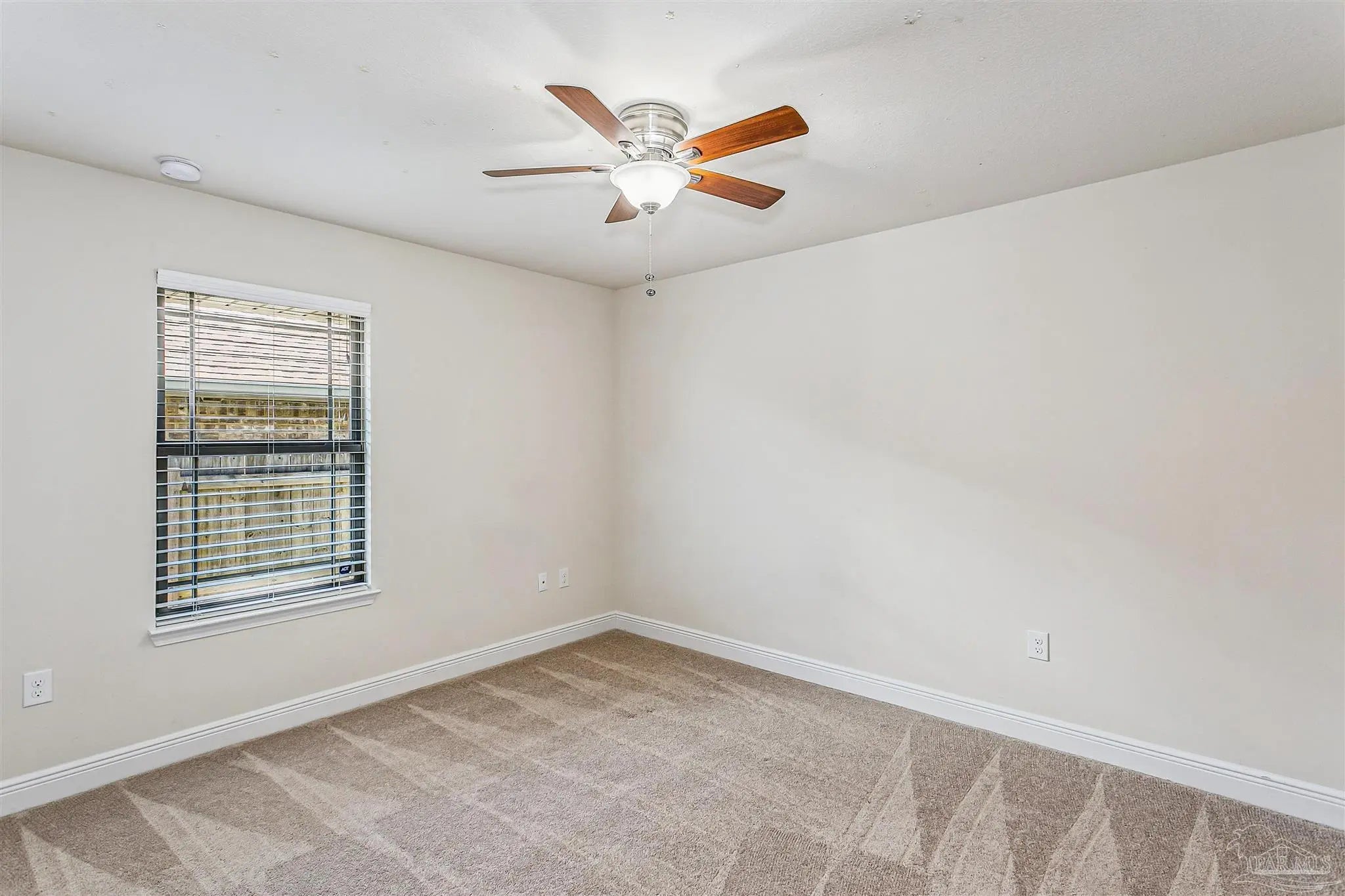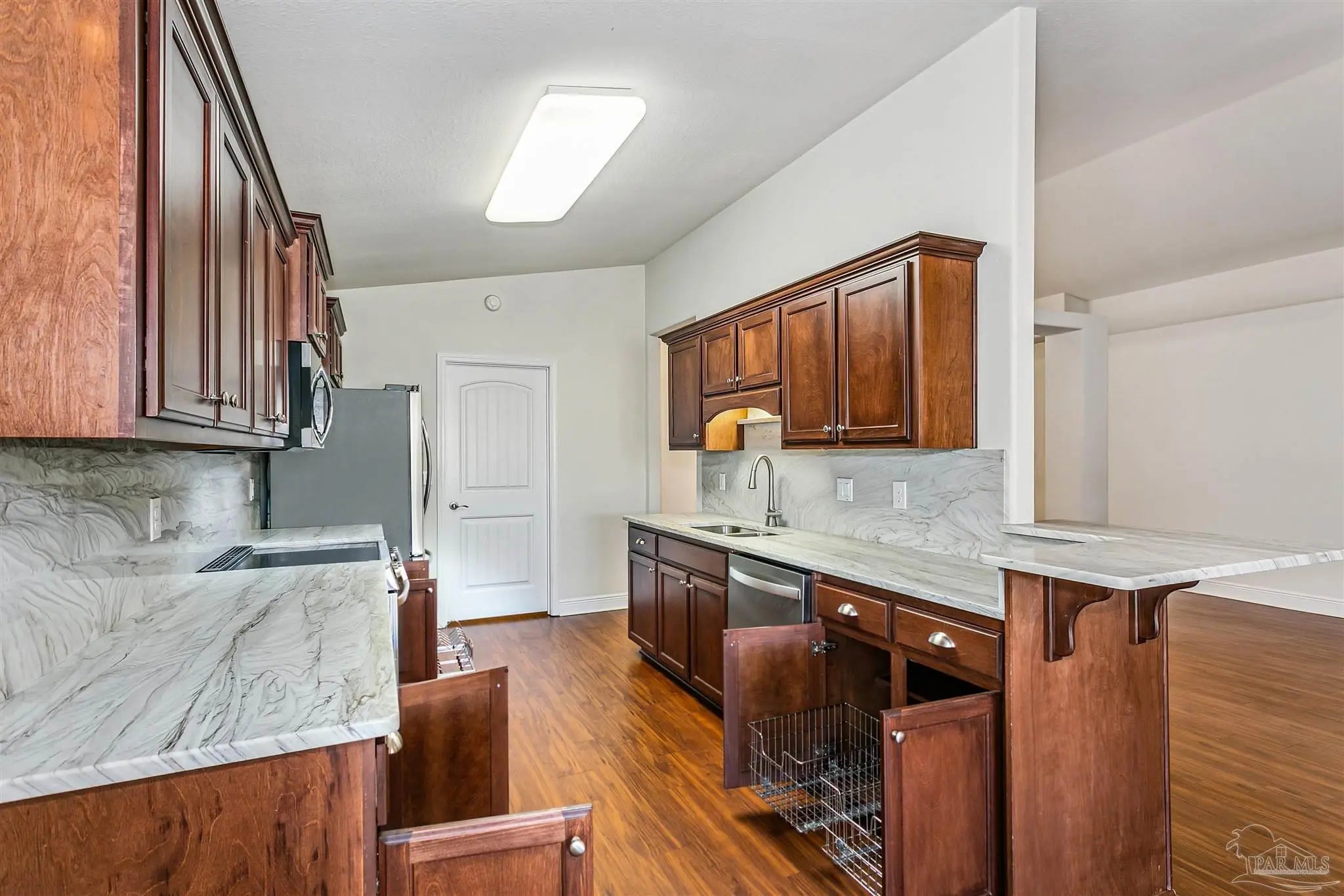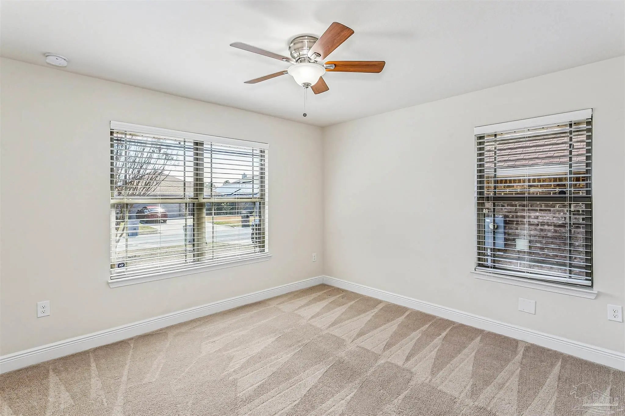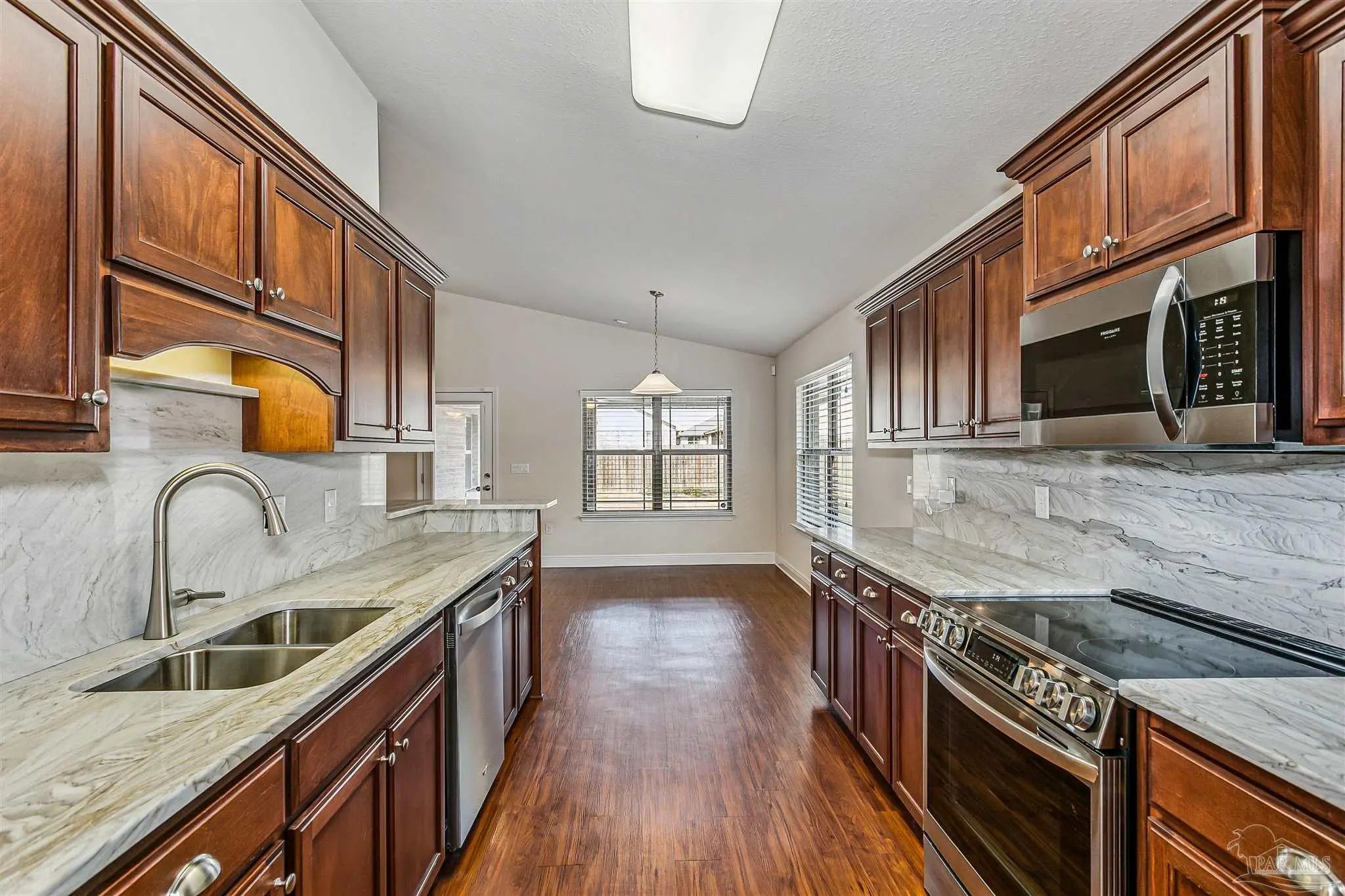 OPEN HOUSE SATURDAY 2/21 from 12:00 PM - 2:00 PM ** Prime Pace location with everyday convenience right at your doorstep—this all-brick home is less than a quarter mile from shopping and dining, including Target and Publix, under a mile to major grocery and home improvement stores, and public schools are all within three miles. The beautifully updated kitchen features GORGEOUS brand-new quartzite countertops and backsplash (2026), customized cabinet pull-outs, a large pantry, breakfast bar, and breakfast room. Stainless appliances were replaced between 2021–2023 and include an induction range with temperature probe, air-fry capability, and a brand-new, never-opened set of compatible cookware. A Maytag washer and dryer with pedestal stands also convey. The open, split floor plan flows seamlessly into a spacious great room with generous living space featuring high ceilings and a defined formal dining or office area. The HUGE primary suite (22x14) offers plenty of room for a sitting area, desk, or workout space, along with direct access to the covered back patio. The en suite bath features a double vanity with custom pull-outs, brand-new granite countertops (2026), an oversized walk-in closet, garden tub, separate shower, and private water closet. Two additional bedrooms are comfortably sized. Additional highlights include ceiling fans in all the bedrooms, great room and covered porch, whole-house Generac generator (2022), gutters, Termite protection and a full-view storm door that enhances natural light. The covered back porch overlooks a privacy-fenced backyard complete with an orange tree and established rose bushes.