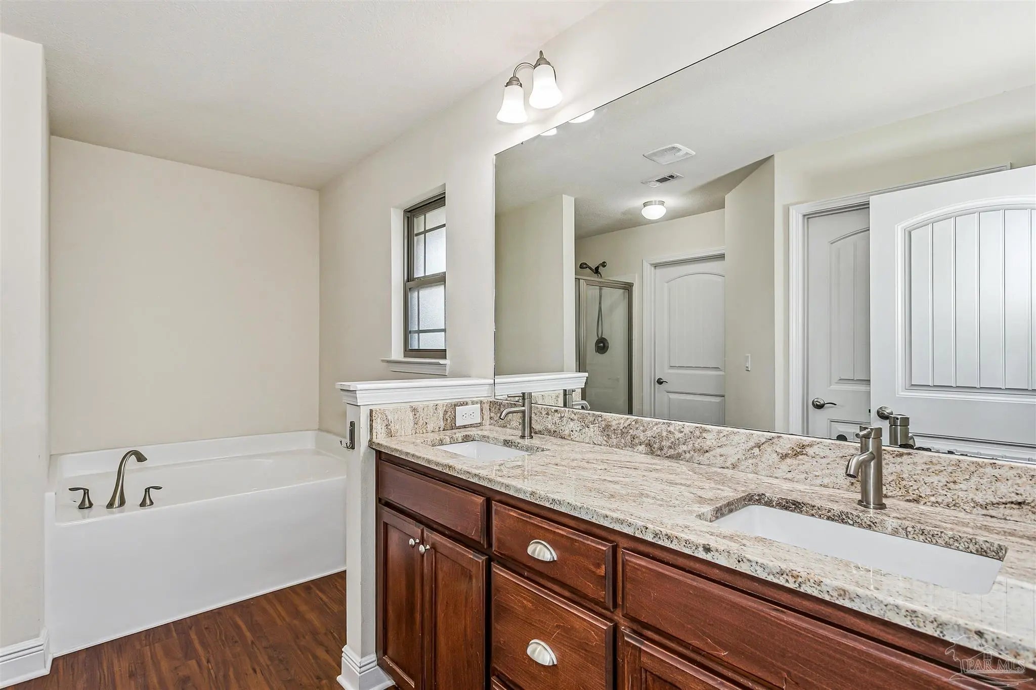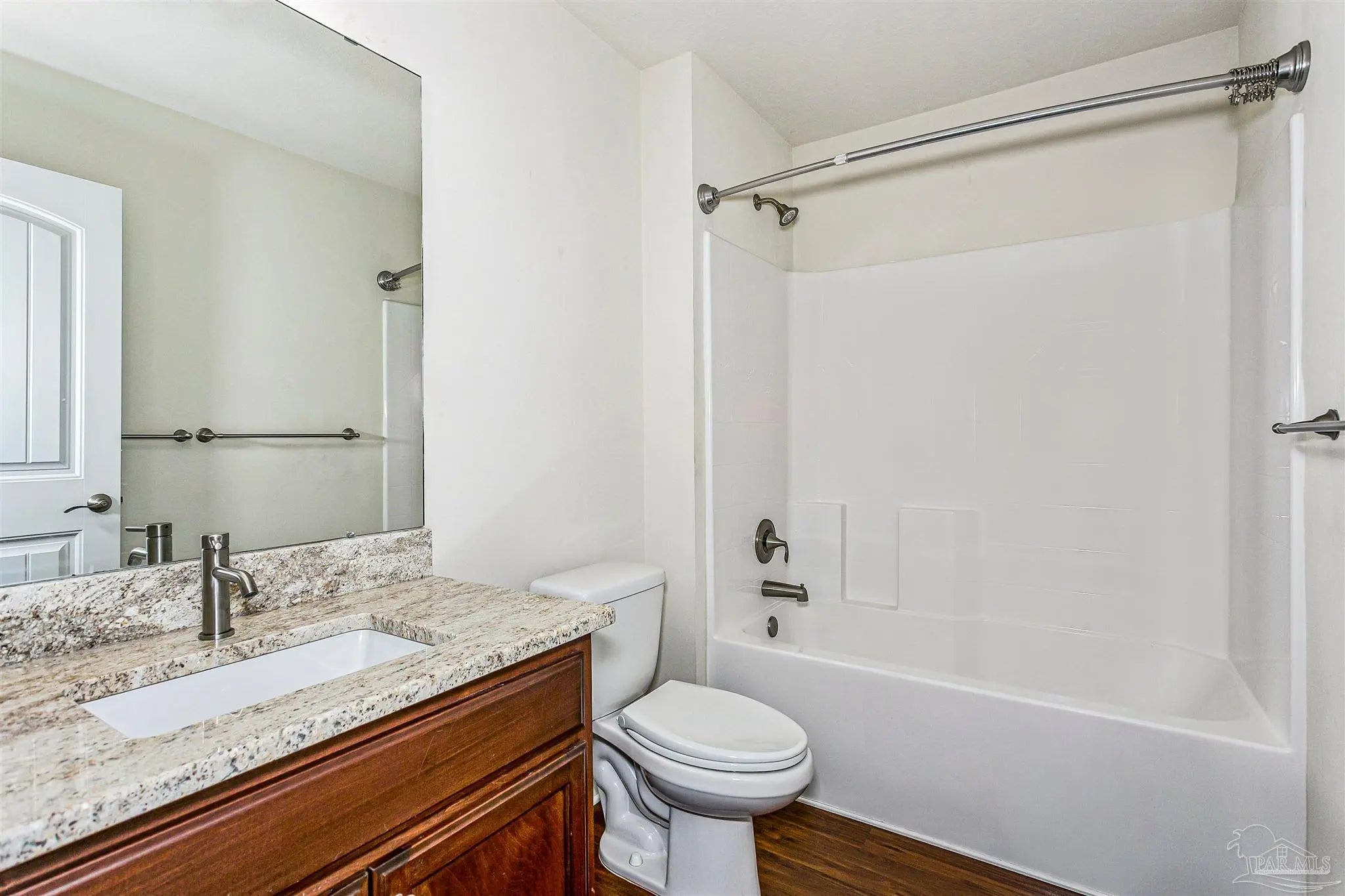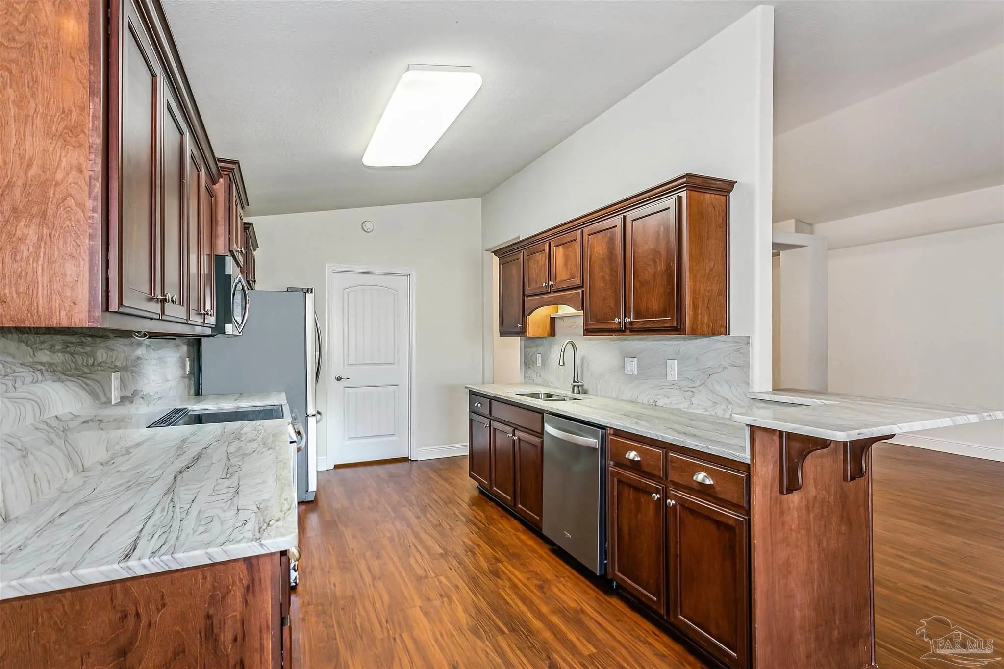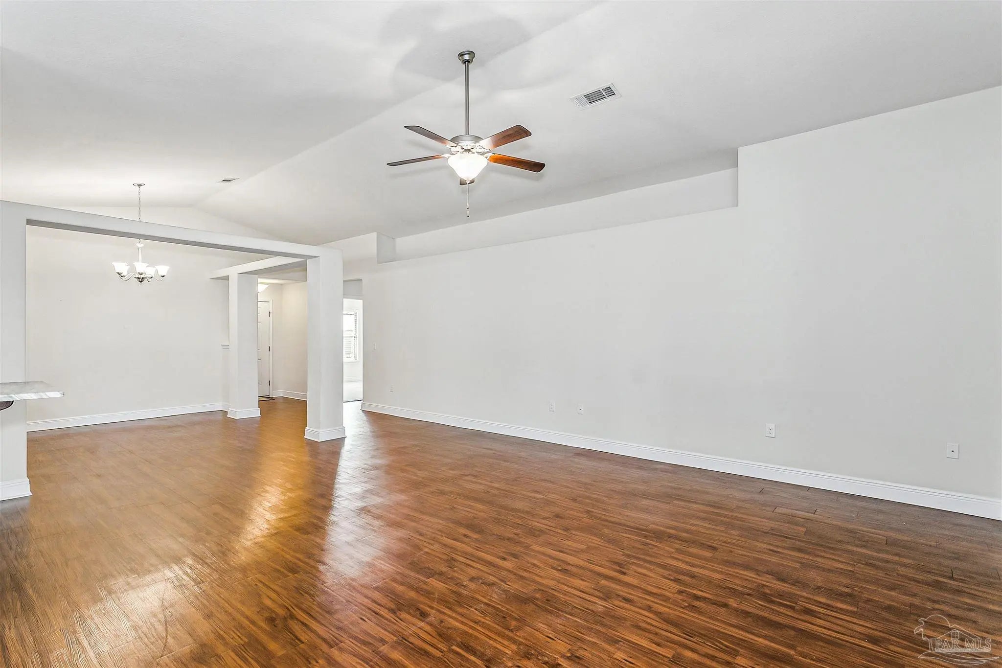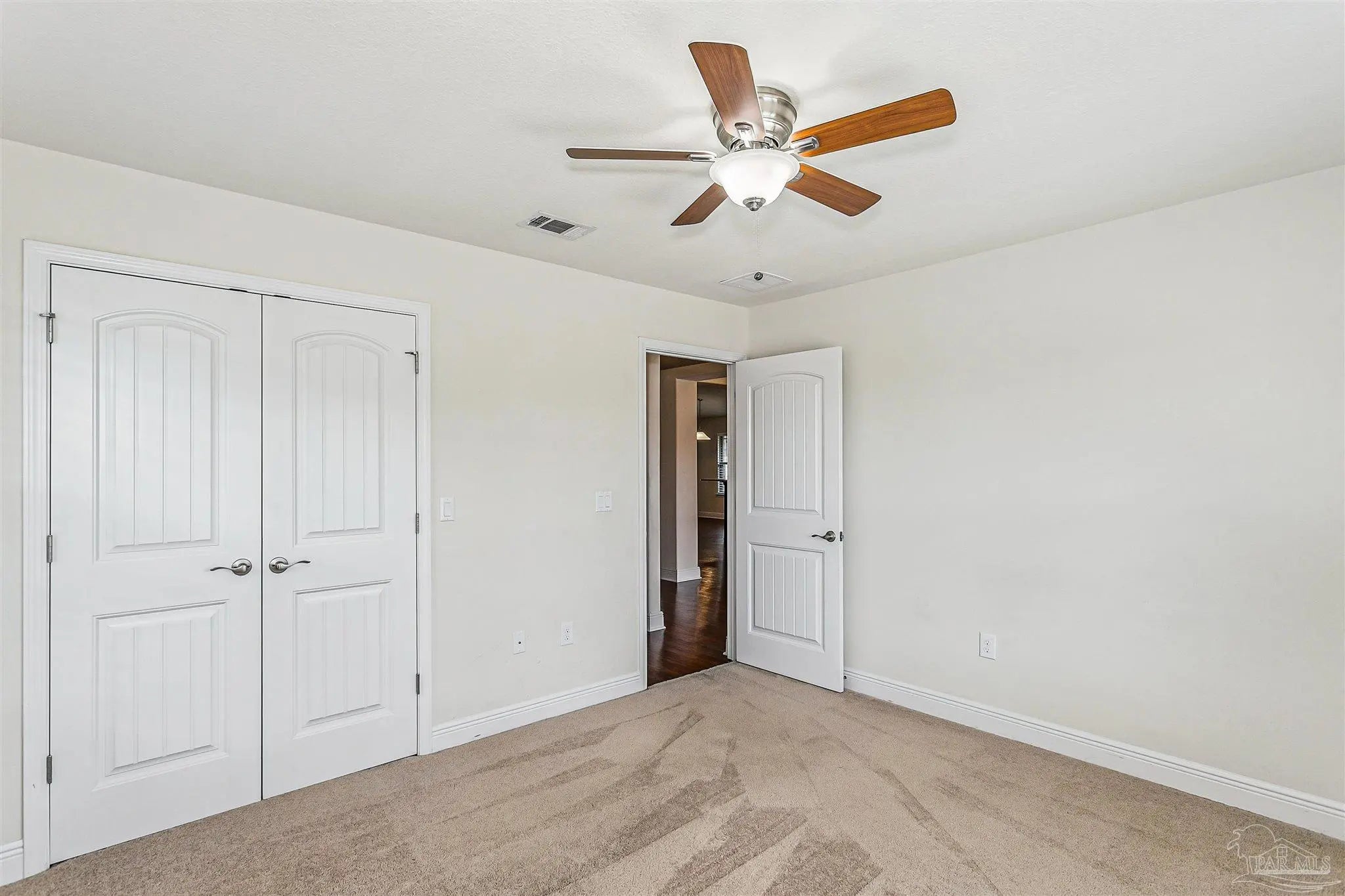 OPEN HOUSE SATURDAY 2/21 from 12:00 PM - 2:00 PM ** Prime Pace location with everyday convenience right at your doorstep—this all-brick home is less than a quarter mile from shopping and dining, including Target and Publix, under a mile to major grocery and home improvement stores, and public schools are all within three miles. The beautifully updated kitchen features GORGEOUS brand-new quartzite countertops and backsplash (2026), customized cabinet pull-outs, a large pantry, breakfast bar, and breakfast room. Stainless appliances were replaced between 2021–2023 and include an induction range with temperature probe, air-fry capability, and a brand-new, never-opened set of compatible cookware. A Maytag washer and dryer with pedestal stands also convey. The open, split floor plan flows seamlessly into a spacious great room with generous living space featuring high ceilings and a defined formal dining or office area. The HUGE primary suite (22x14) offers plenty of room for a sitting area, desk, or workout space, along with direct access to the covered back patio. The en suite bath features a double vanity with custom pull-outs, brand-new granite countertops (2026), an oversized walk-in closet, garden tub, separate shower, and private water closet. Two additional bedrooms are comfortably sized. Additional highlights include ceiling fans in all the bedrooms, great room and covered porch, whole-house Generac generator (2022), gutters, Termite protection and a full-view storm door that enhances natural light. The covered back porch overlooks a privacy-fenced backyard complete with an orange tree and established rose bushes.