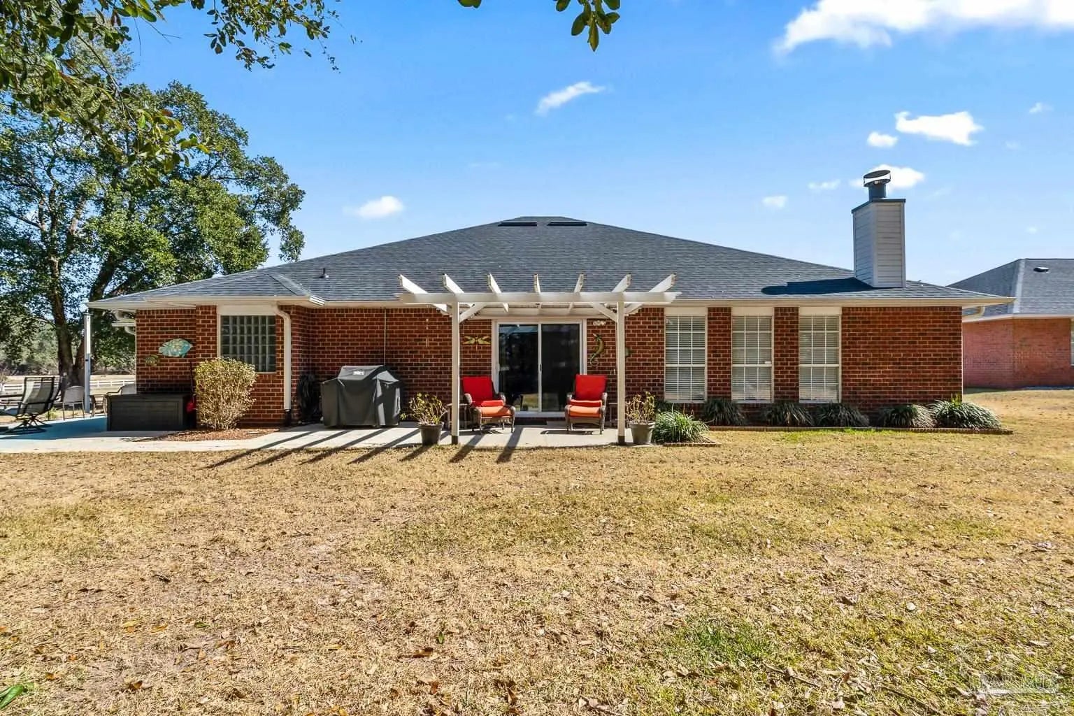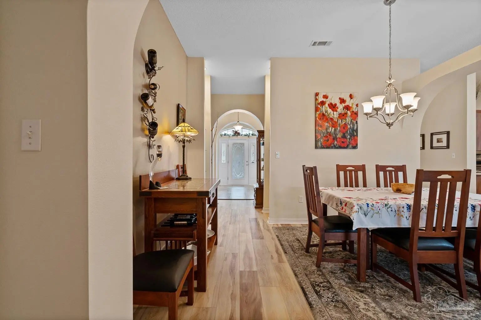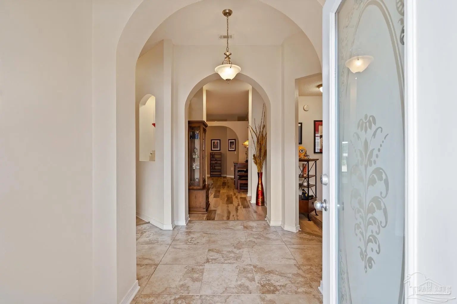 Welcome to this beautifully designed semi-custom built, four-sided brick residence offering 2,957 square feet of thoughtfully crafted living space and architectural elegance. Positioned on a corner lot spanning nearly one-third of an acre, this property captures peaceful golf course views while maintaining exceptional privacy within an established 18-hole golf course community spanning over 160 acres. Step inside and experience soaring ceilings, dramatic archways, and distinctive architectural accents that define this semi-custom home. The welcoming foyer showcases elegant 18” x 18” tile flooring, adding both sophistication and durability while complementing the home’s refined design. Recessed lighting and generous natural light amplify the sense of space. Beautifully appointed luxury vinyl plank flooring flows seamlessly throughout the main living areas, showcasing a soft, natural wood grain aesthetic with wide-plank detailing. This durable, low-maintenance surface offers the warmth of hardwood with enhanced resilience—perfectly blending style and functionality for everyday living. The living room is anchored by a wood-burning fireplace and framed by abundant windows that flood the space with natural daylight, creating an inviting yet refined atmosphere. The kitchen is appointed with granite countertops, custom cabinetry, stainless steel appliances, and designer backsplash, offering both elegance and functionality. An adjacent office area provides flexibility for remote work or additional living space. The primary suite serves as a private retreat, featuring granite surfaces, custom cabinetry, 18” x 18” tile flooring, and a fully tiled walk-in shower with glass enclosure and natural light accents. A 2025 roof, 2021 gas water heater and 2021 HVAC system provide peace of mind the major components of the home have been updated. A 375-square-foot heated and cooled sunroom is perfectly positioned to capture golf course views for relaxing evenings.