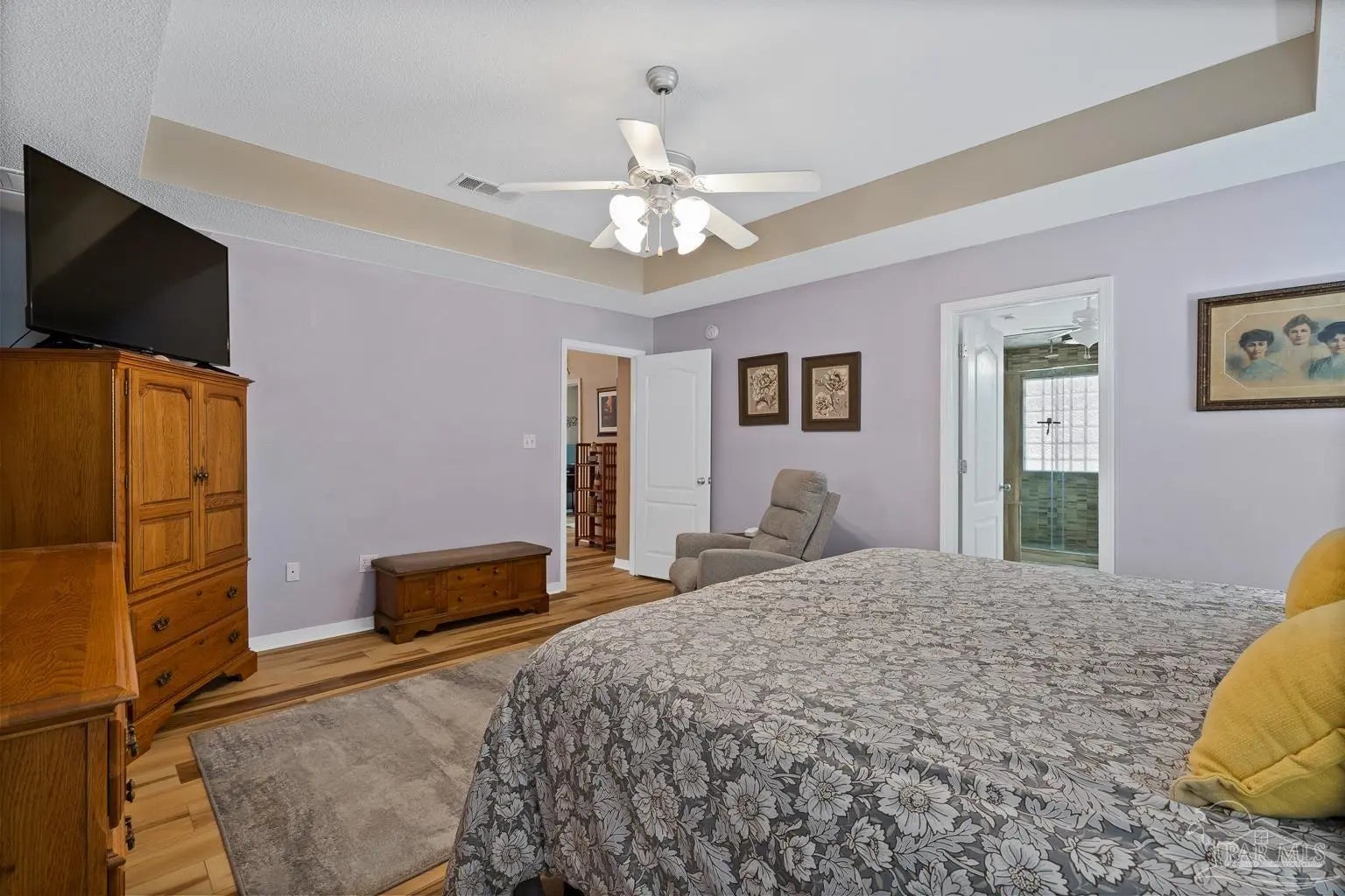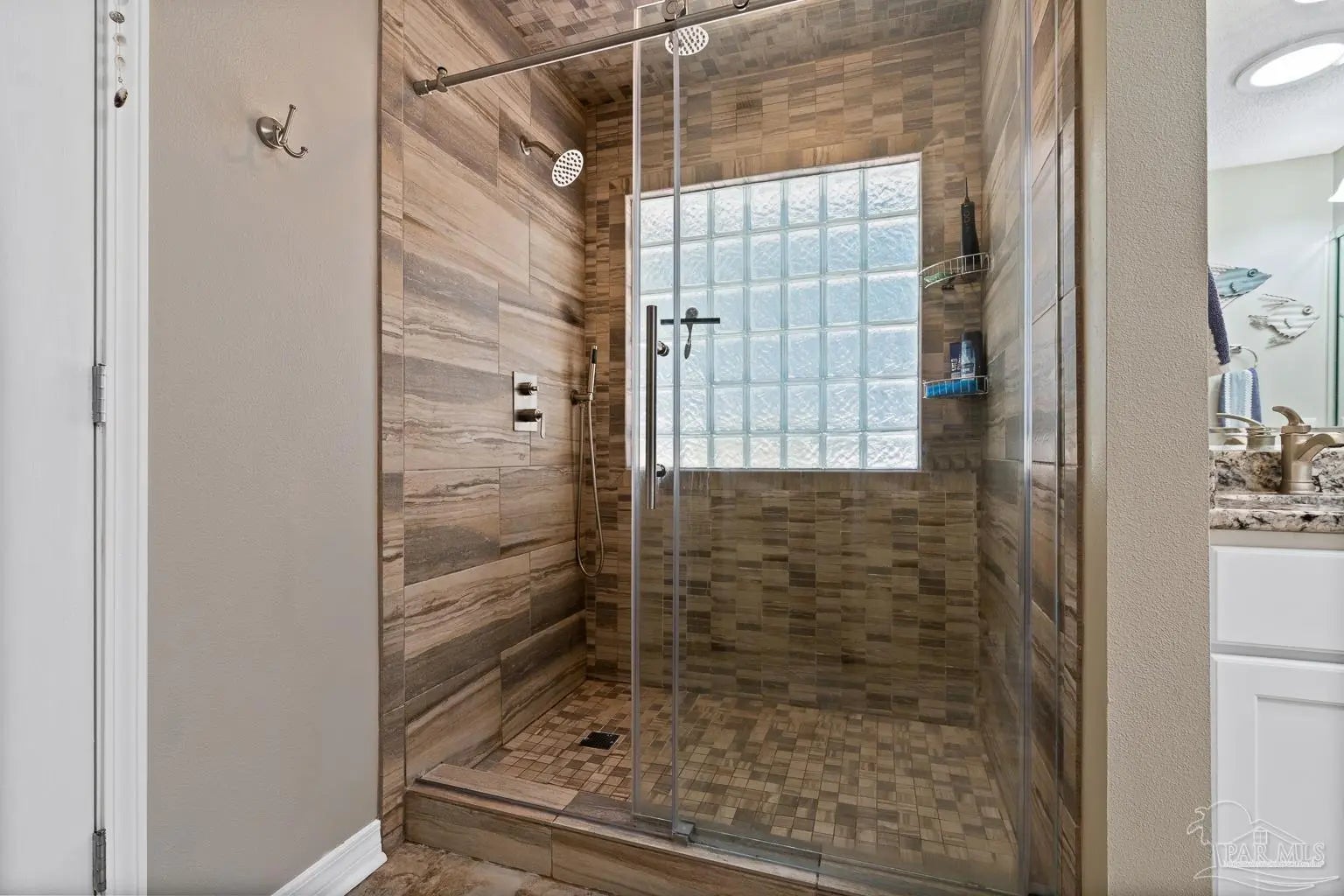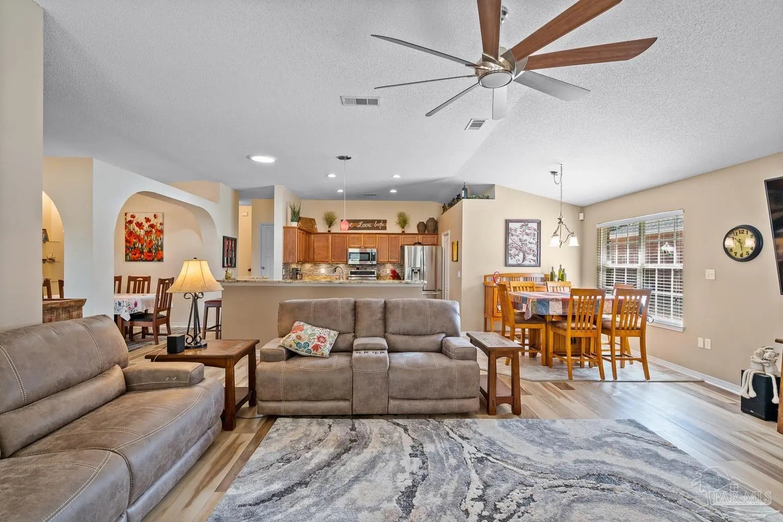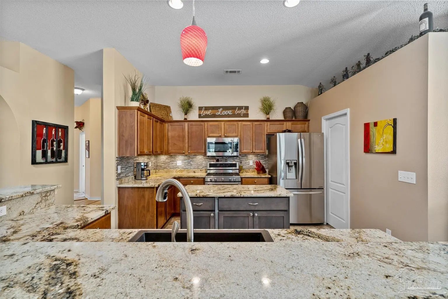 Welcome to this beautifully designed semi-custom built, four-sided brick residence offering 2,957 square feet of thoughtfully crafted living space and architectural elegance. Positioned on a corner lot spanning nearly one-third of an acre, this property captures peaceful golf course views while maintaining exceptional privacy within an established 18-hole golf course community spanning over 160 acres. Step inside and experience soaring ceilings, dramatic archways, and distinctive architectural accents that define this semi-custom home. The welcoming foyer showcases elegant 18” x 18” tile flooring, adding both sophistication and durability while complementing the home’s refined design. Recessed lighting and generous natural light amplify the sense of space. Beautifully appointed luxury vinyl plank flooring flows seamlessly throughout the main living areas, showcasing a soft, natural wood grain aesthetic with wide-plank detailing. This durable, low-maintenance surface offers the warmth of hardwood with enhanced resilience—perfectly blending style and functionality for everyday living. The living room is anchored by a wood-burning fireplace and framed by abundant windows that flood the space with natural daylight, creating an inviting yet refined atmosphere. The kitchen is appointed with granite countertops, custom cabinetry, stainless steel appliances, and designer backsplash, offering both elegance and functionality. An adjacent office area provides flexibility for remote work or additional living space. The primary suite serves as a private retreat, featuring granite surfaces, custom cabinetry, 18” x 18” tile flooring, and a fully tiled walk-in shower with glass enclosure and natural light accents. A 2025 roof, 2021 gas water heater and 2021 HVAC system provide peace of mind the major components of the home have been updated. A 375-square-foot heated and cooled sunroom is perfectly positioned to capture golf course views for relaxing evenings.