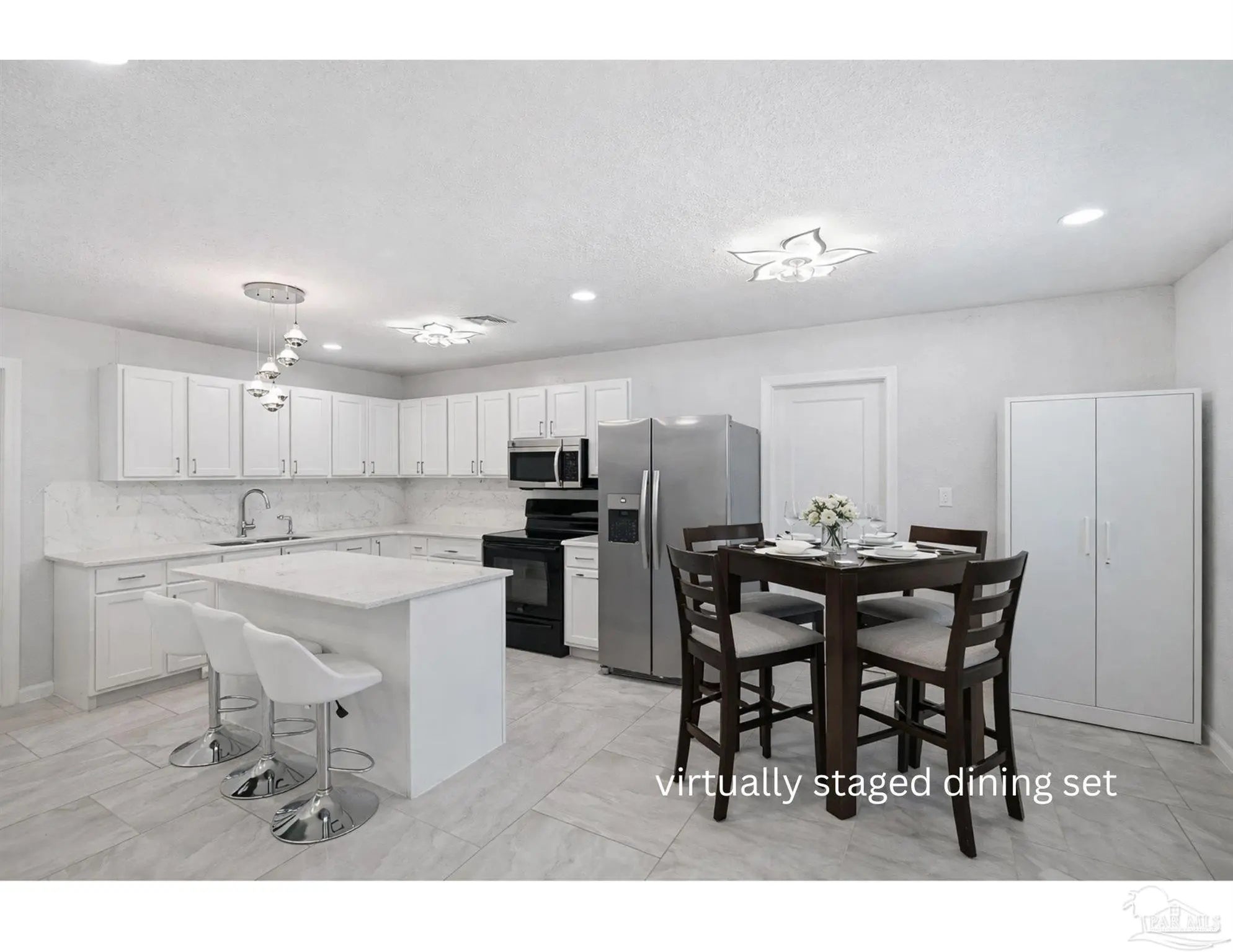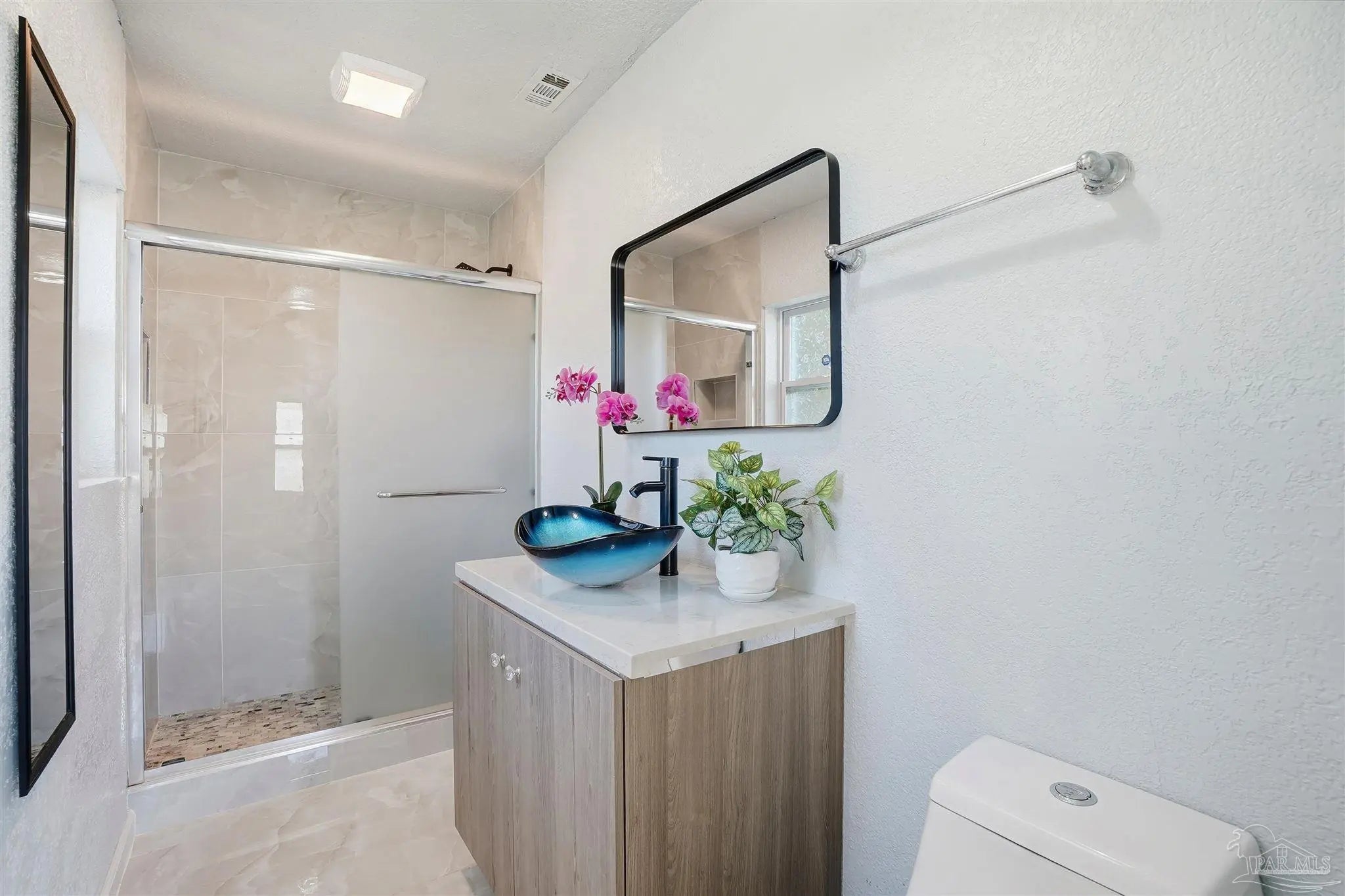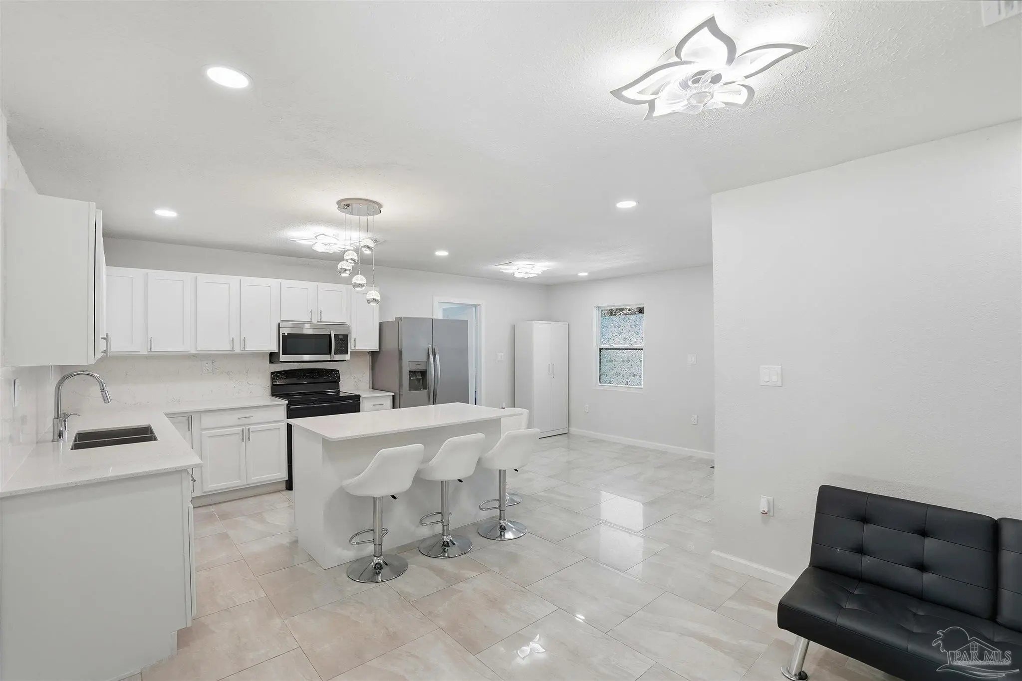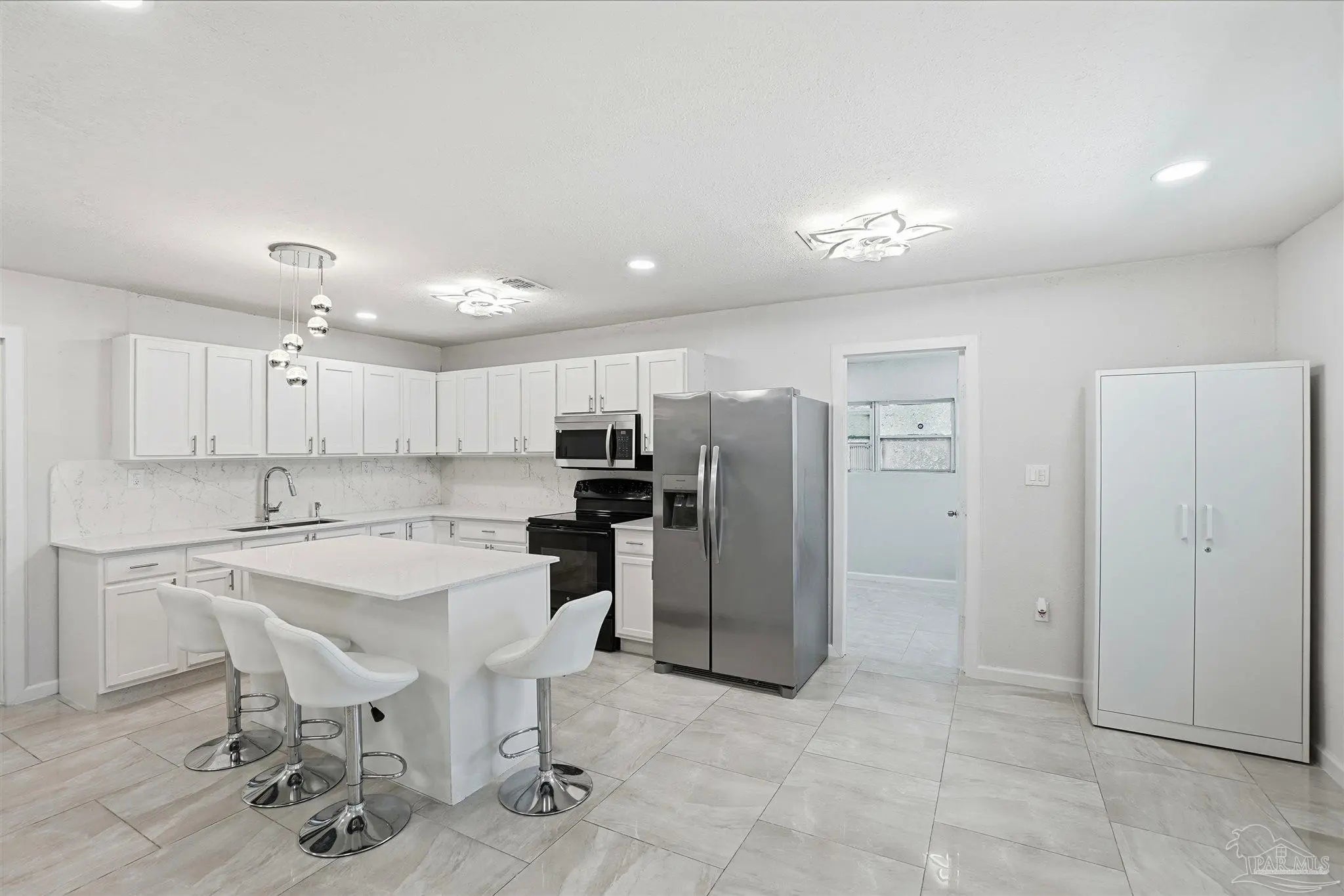 Extensively updated and move-in ready! This solid block 4-bedroom, 3-bath home has been thoughtfully renovated in 2024 with major improvements already completed, including a new roof, updated electrical, new water heater, impact windows, fresh interior and exterior paint, and beautiful porcelain tile flooring throughout — no carpet anywhere. The beautifully re-done and updated kitchen is a true highlight, featuring quartz countertops, an undermount sink, stainless steel appliances including a double-door refrigerator, built-in microwave, and modern cabinetry that create a bright and functional space for everyday living and entertaining. The home offers four bedrooms and three full bathrooms, including a primary suite with a private bath, a second bedroom with its own full bathroom, and a third bathroom conveniently shared by the remaining two bedrooms. This functional layout provides flexibility for guests, extended family, or multi-generational living. Step outside to enjoy the covered back porch, a great place to relax or gather, overlooking a spacious 0.35-acre lot with plenty of room for outdoor projects, storage, or hobbies. A separate storage/work area adds additional flexibility. Originally built in 1968, the Escambia County Property Appraiser reflects an effective year built of 1981 due to updates and improvements made over time. Conveniently located just minutes from NAS Pensacola, downtown Pensacola, shopping, schools, and major roadways. This location makes it an excellent option for first-time buyers, military personnel looking to be close to base, or investors seeking a strong rental opportunity. Pensacola’s beautiful white-sand beaches are also a short drive away. With no HOA, a large lot, and many major upgrades, this property offers space, function, and value for its next owner.