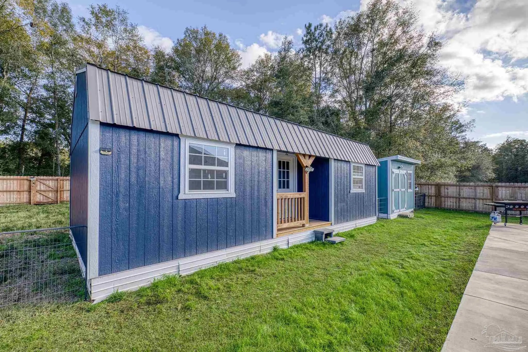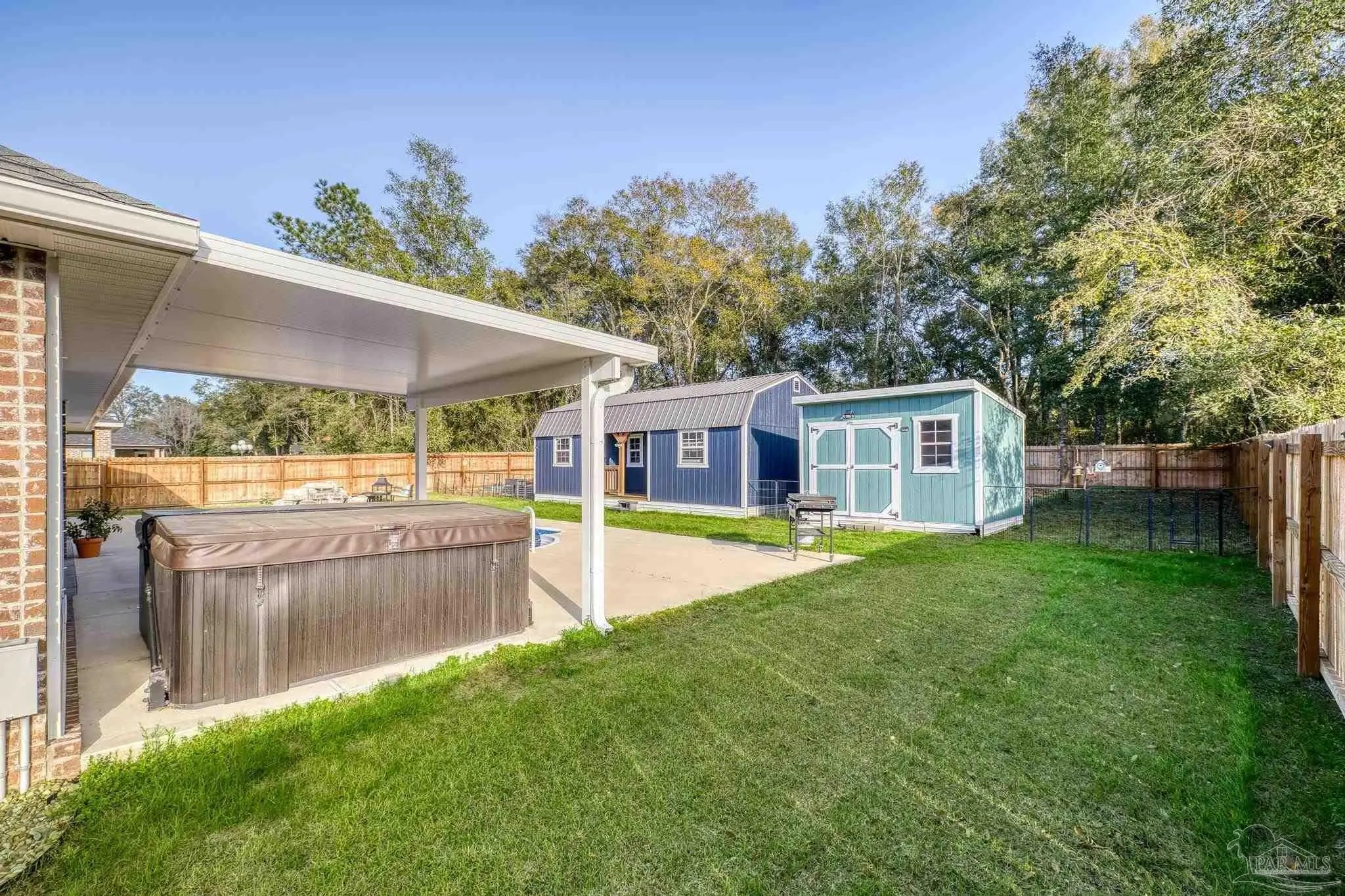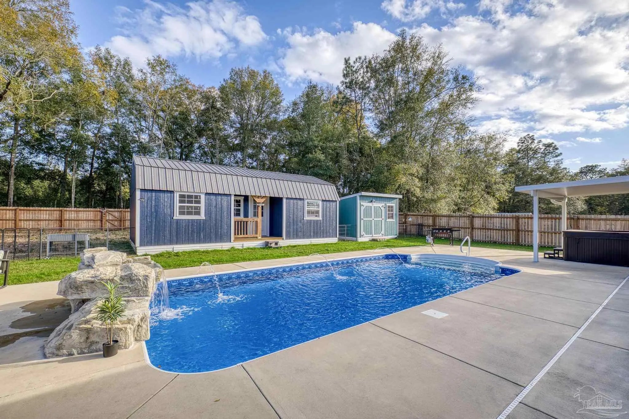 Welcome to 4566 Red Oak Dr, a 2023-built 4-bedroom, 3-bath home offering approximately 2,548 sq ft on a beautifully improved half-acre lot in Milton’s Preserve subdivision. This property has been transformed beyond builder grade with a full suite of premium upgrades. ~ Step outside to your private resort-style backyard featuring a rectangular vinyl pool with deck and Rico Rock accents, a relaxing hot tub spa, premium fencing with solar lighting, a walk gate, and thoughtfully cleared and landscaped grounds. An irrigation system, lush sod, rock beds, flower beds, seamless gutters, and upgraded drainage keep the property attractive and low-maintenance year-round. Two outbuildings, a 16×30 shed with electric and portable HVAC for heat and cooling, and an additional 8×10 shed, provide abundant storage, exercise, or workshop space. Inside, the modern kitchen features a newer LG oven and microwave plus an included Whirlpool refrigerator, while the home also comes with an LG washer and dryer so you can move in with ease. All bathrooms offer spa-like comfort with a rainfall shower and bidet upgrades, setting this home apart. ~ With completed HOA approvals for major exterior projects and a long list of high-value improvements already in place, this customized home delivers a finished lifestyle package that would cost significantly more to replicate from scratch. This property combines the peace of new construction with the benefits of a custom, fully realized outdoor and indoor living experience.