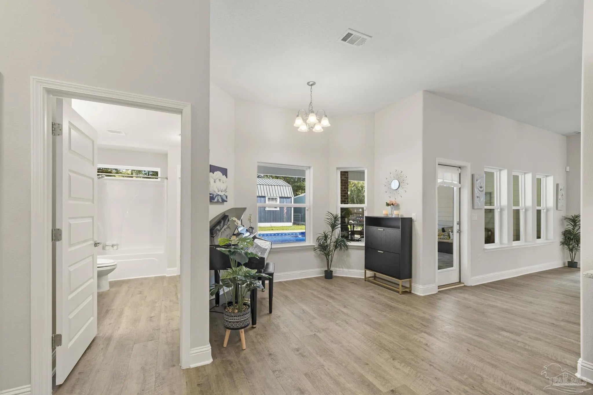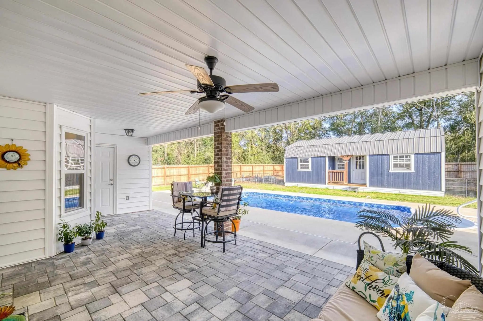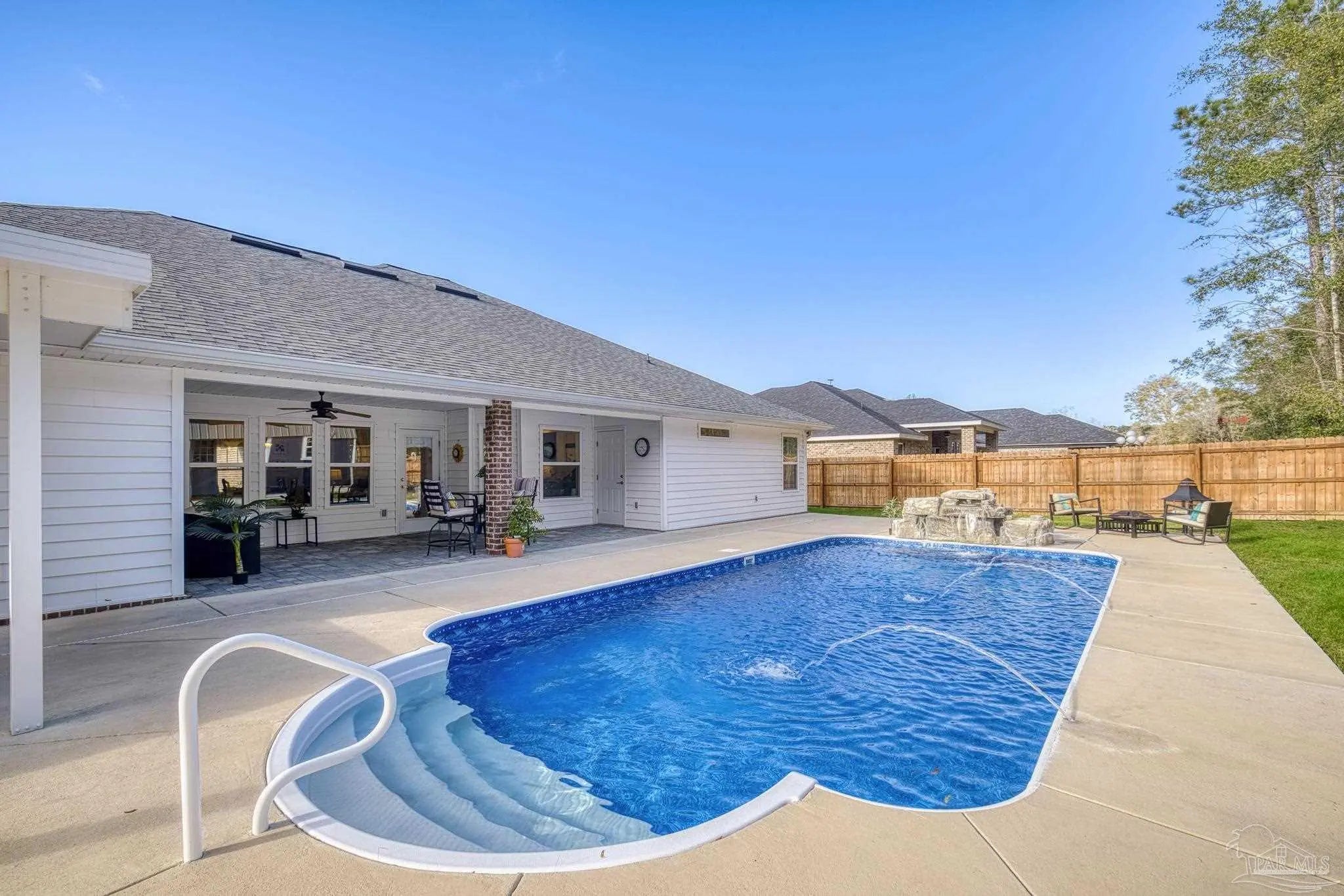 Welcome to 4566 Red Oak Dr, a 2023-built 4-bedroom, 3-bath home offering approximately 2,548 sq ft on a beautifully improved half-acre lot in Milton’s Preserve subdivision. This property has been transformed beyond builder grade with a full suite of premium upgrades. ~ Step outside to your private resort-style backyard featuring a rectangular vinyl pool with deck and Rico Rock accents, a relaxing hot tub spa, premium fencing with solar lighting, a walk gate, and thoughtfully cleared and landscaped grounds. An irrigation system, lush sod, rock beds, flower beds, seamless gutters, and upgraded drainage keep the property attractive and low-maintenance year-round. Two outbuildings, a 16×30 shed with electric and portable HVAC for heat and cooling, and an additional 8×10 shed, provide abundant storage, exercise, or workshop space. Inside, the modern kitchen features a newer LG oven and microwave plus an included Whirlpool refrigerator, while the home also comes with an LG washer and dryer so you can move in with ease. All bathrooms offer spa-like comfort with a rainfall shower and bidet upgrades, setting this home apart. ~ With completed HOA approvals for major exterior projects and a long list of high-value improvements already in place, this customized home delivers a finished lifestyle package that would cost significantly more to replicate from scratch. This property combines the peace of new construction with the benefits of a custom, fully realized outdoor and indoor living experience.