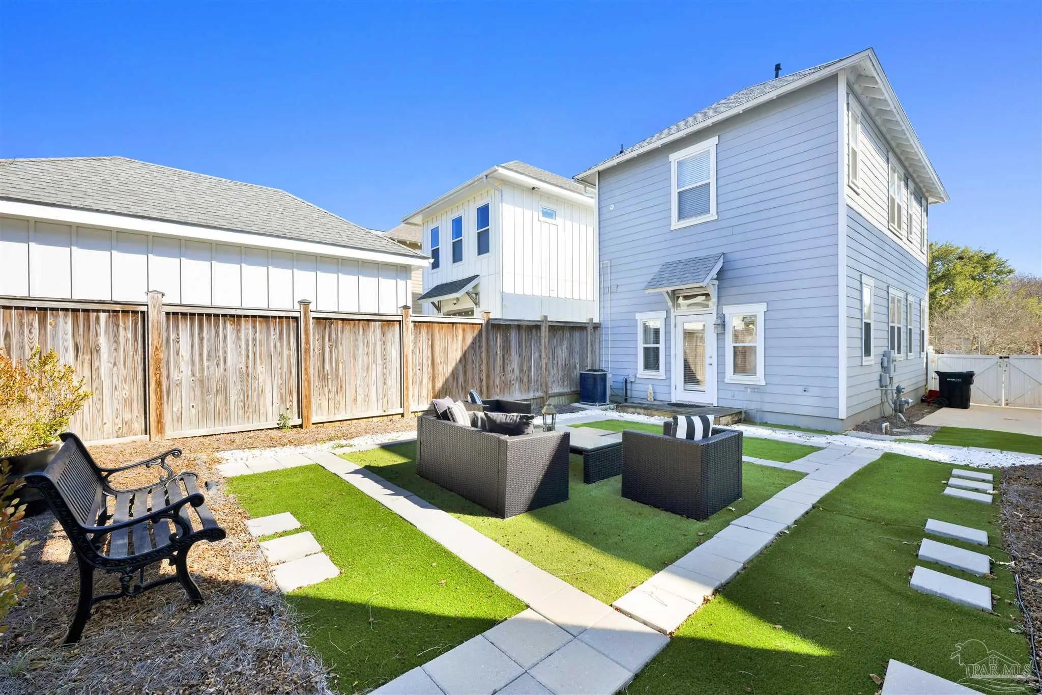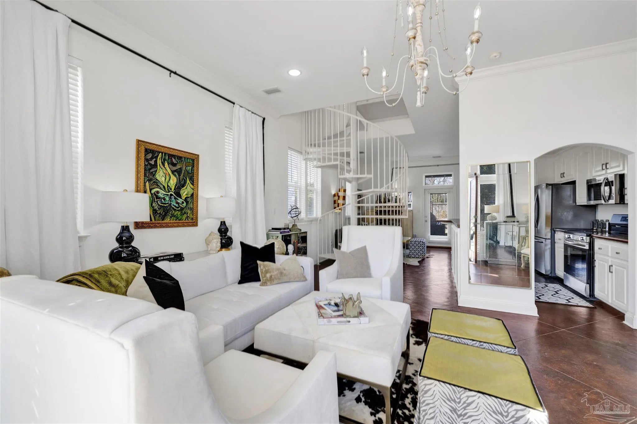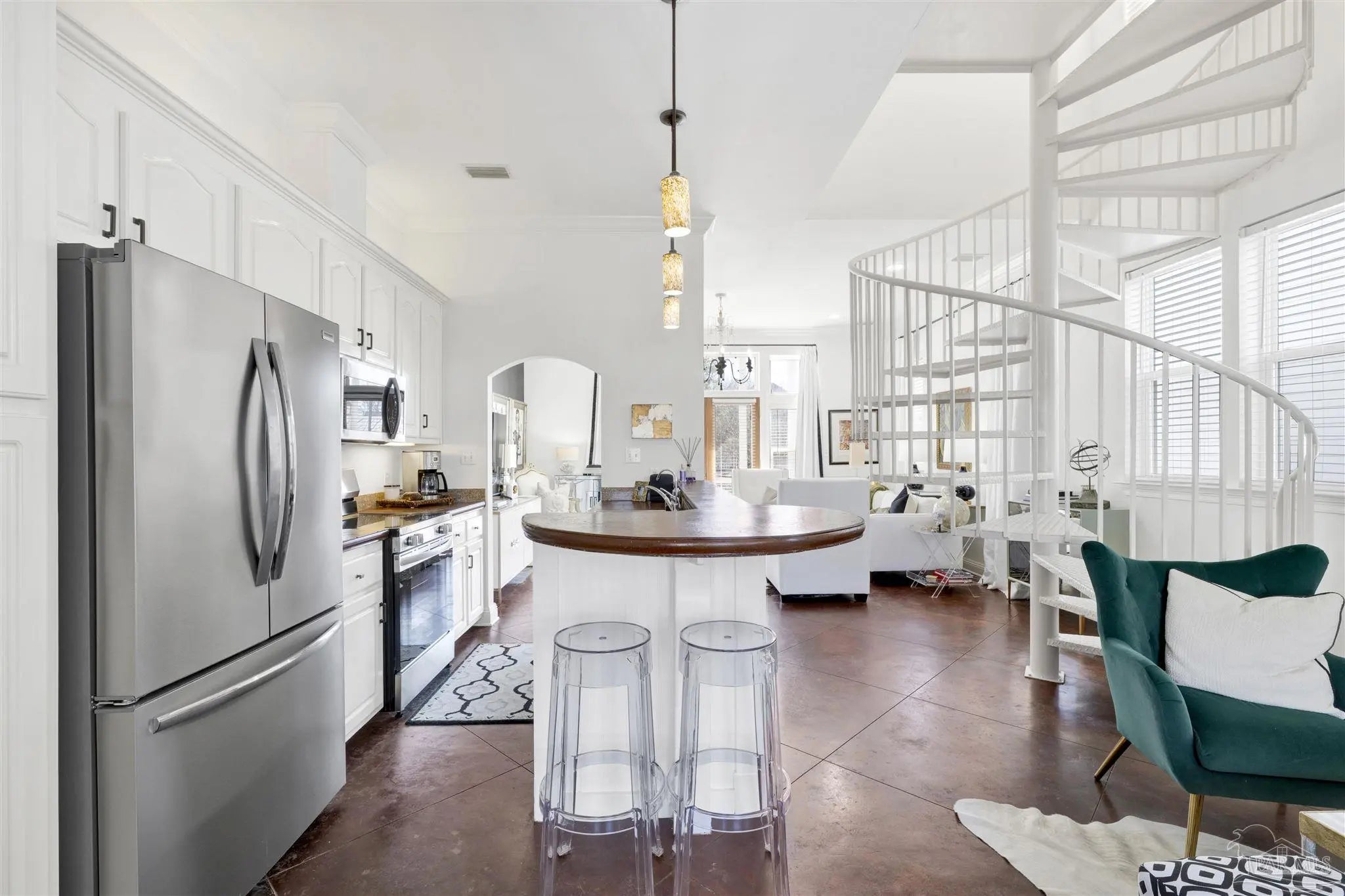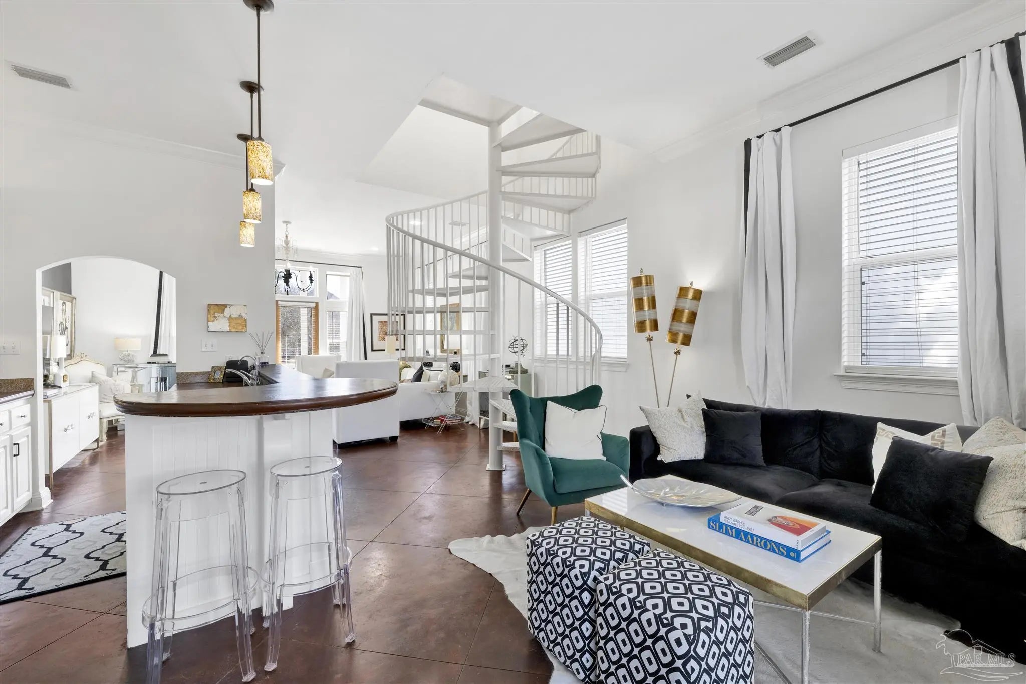 Live the vibrant downtown lifestyle in this beautifully designed 2 bedroom home located in the highly sought-after Aragon neighborhood of Pensacola. Nestled on quiet, charming streets and within walking distance to all that downtown has to offer, this home also provides a short drive to Pensacola Beach and quick access to the interstate for easy commuting. Major updates provide peace of mind, including all new appliances, a newer HVAC system, newer water heater, and a 2023 roof—making this home truly move-in ready. The lower level welcomes you with stunning stained concrete flooring and soaring high ceilings that create a modern, open feel. The living area is filled with natural light from oversized windows and features a stylish accent wall—perfect for showcasing artwork. The adjacent dining space flows seamlessly into the kitchen, where you’ll find abundant cabinetry, sleek concrete countertops, and stainless steel appliances. A convenient half bath completes the main level. Up the eye-catching spiral staircase, the primary bedroom offers wood laminate flooring, a spacious walk-in closet, and a private balcony overlooking the beautiful park just across the street—an ideal spot for morning coffee or evening relaxation. The additional bedroom, also featuring its own walk-in closet, is perfect for guests or a home office. The generously sized bathroom services both bedrooms and includes tile flooring, double vanities, a jetted tub, and a conveniently located laundry closet. Step outside to a thoughtfully designed, privacy-fenced backyard featuring pavers and low-maintenance artificial grass—creating a peaceful outdoor retreat in the heart of the city. Enjoy style, comfort, and convenience all in one exceptional downtown home!