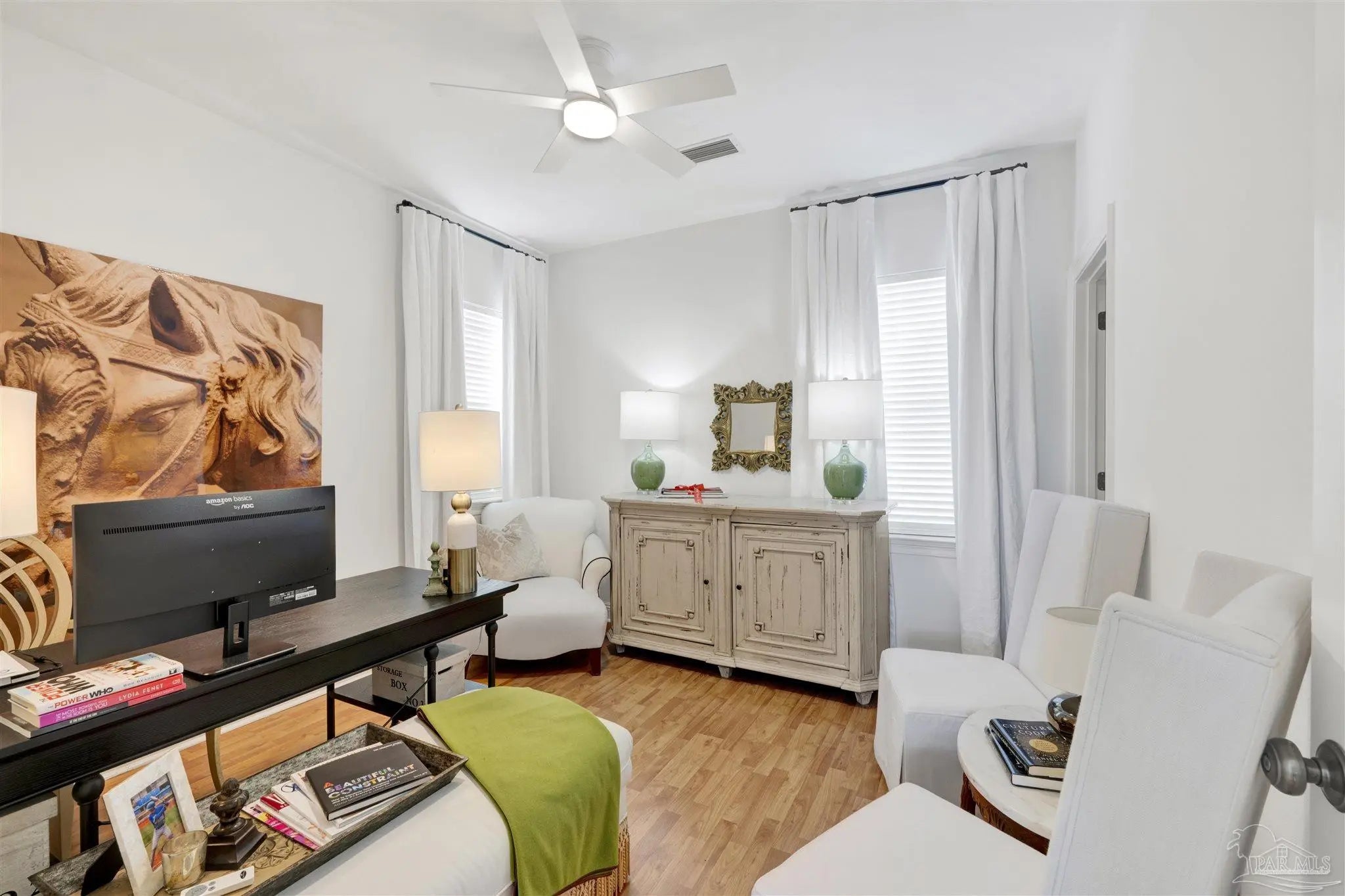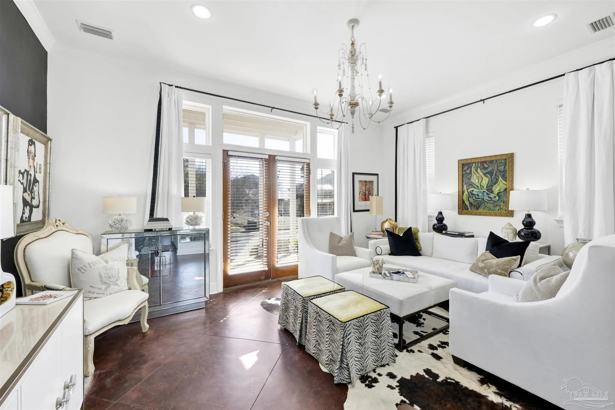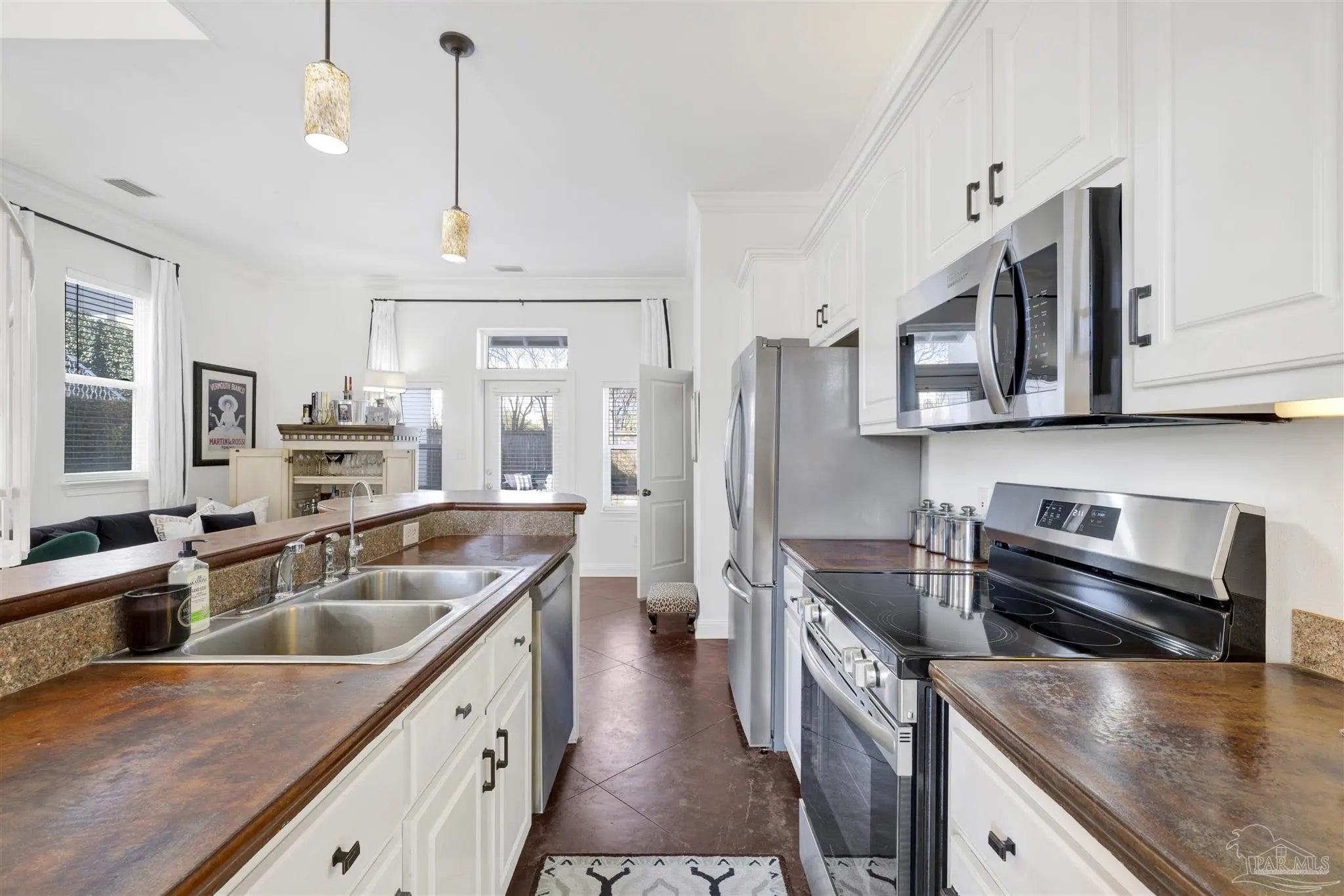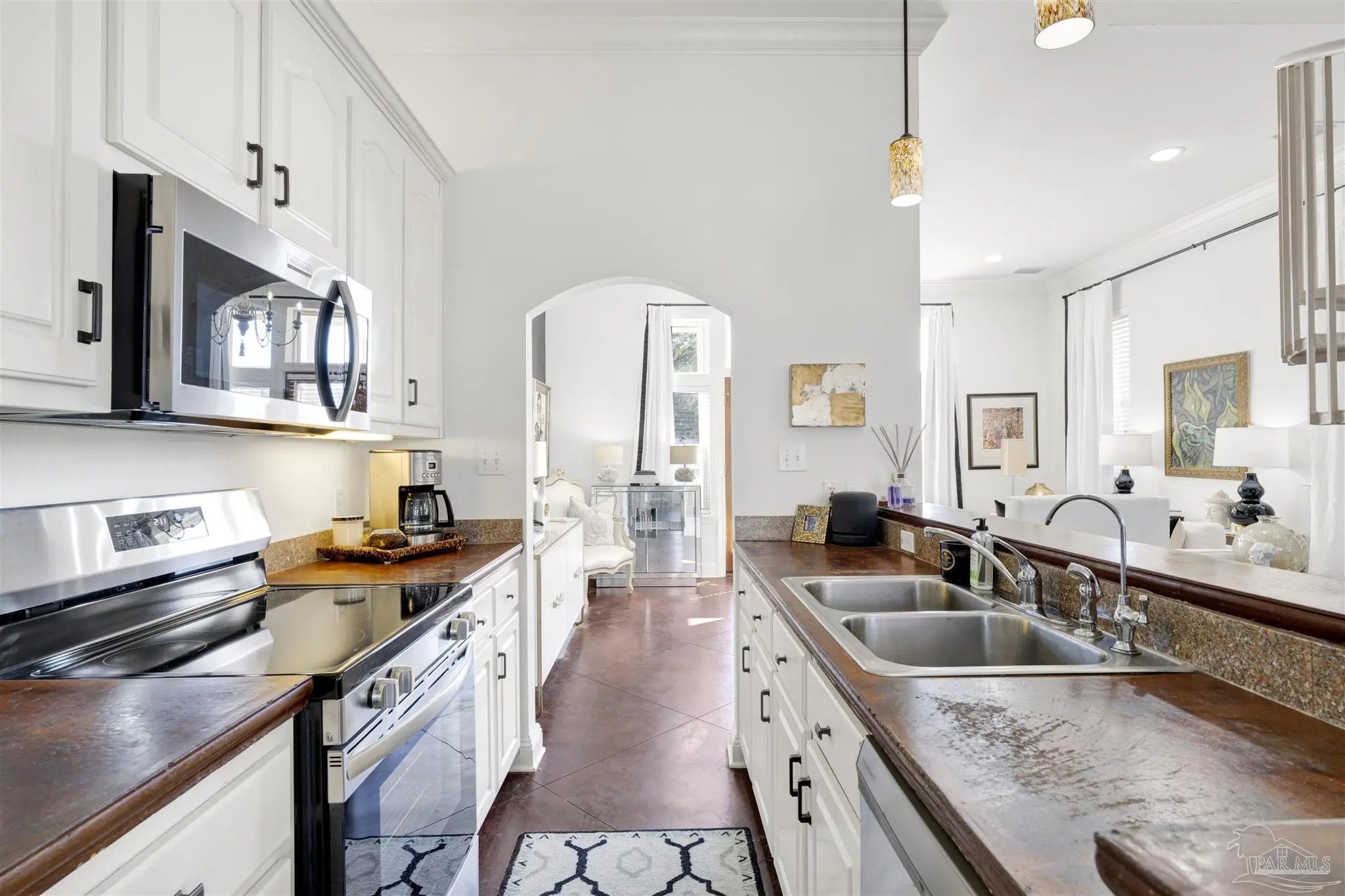 Live the vibrant downtown lifestyle in this beautifully designed 2 bedroom home located in the highly sought-after Aragon neighborhood of Pensacola. Nestled on quiet, charming streets and within walking distance to all that downtown has to offer, this home also provides a short drive to Pensacola Beach and quick access to the interstate for easy commuting. Major updates provide peace of mind, including all new appliances, a newer HVAC system, newer water heater, and a 2023 roof—making this home truly move-in ready. The lower level welcomes you with stunning stained concrete flooring and soaring high ceilings that create a modern, open feel. The living area is filled with natural light from oversized windows and features a stylish accent wall—perfect for showcasing artwork. The adjacent dining space flows seamlessly into the kitchen, where you’ll find abundant cabinetry, sleek concrete countertops, and stainless steel appliances. A convenient half bath completes the main level. Up the eye-catching spiral staircase, the primary bedroom offers wood laminate flooring, a spacious walk-in closet, and a private balcony overlooking the beautiful park just across the street—an ideal spot for morning coffee or evening relaxation. The additional bedroom, also featuring its own walk-in closet, is perfect for guests or a home office. The generously sized bathroom services both bedrooms and includes tile flooring, double vanities, a jetted tub, and a conveniently located laundry closet. Step outside to a thoughtfully designed, privacy-fenced backyard featuring pavers and low-maintenance artificial grass—creating a peaceful outdoor retreat in the heart of the city. Enjoy style, comfort, and convenience all in one exceptional downtown home!