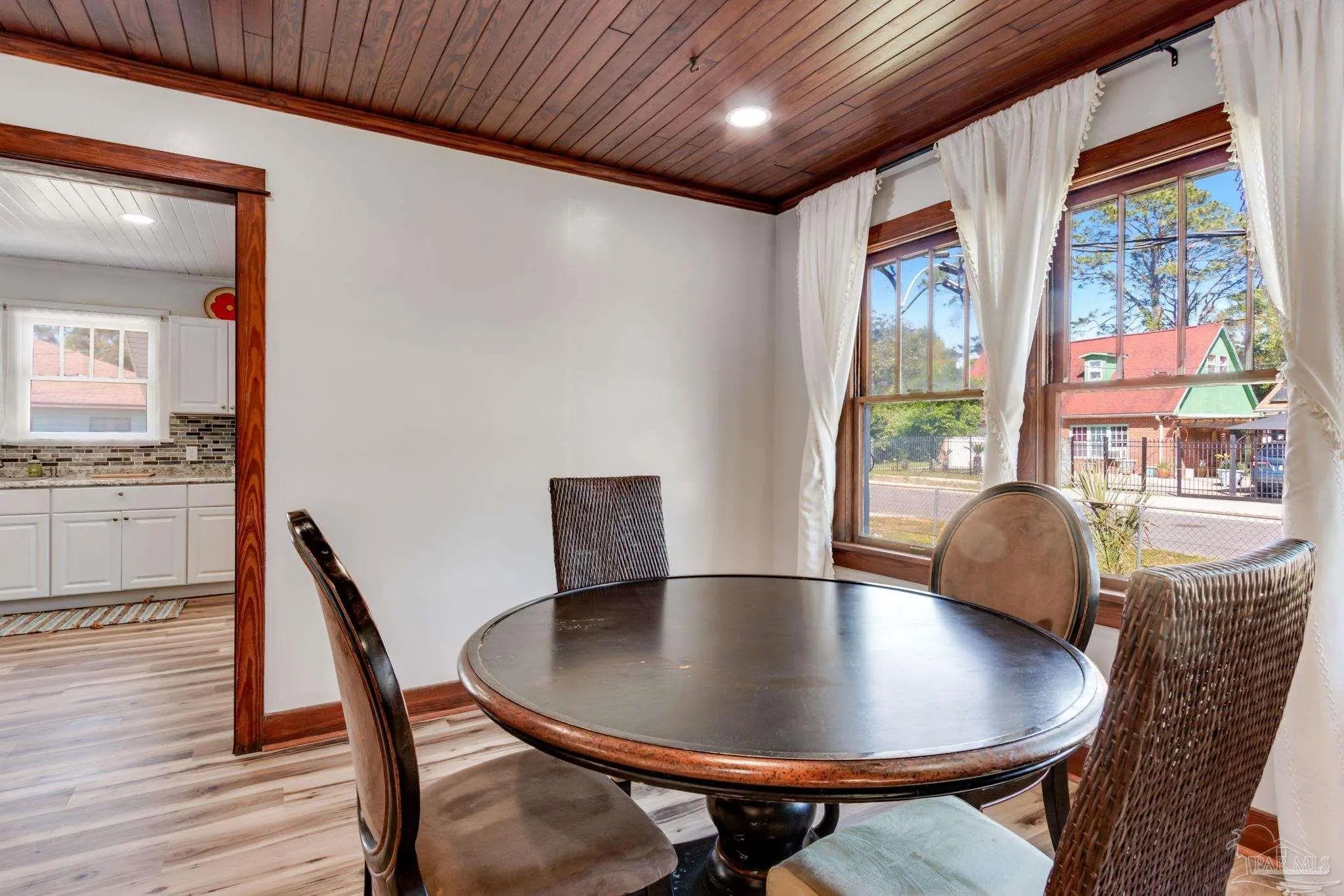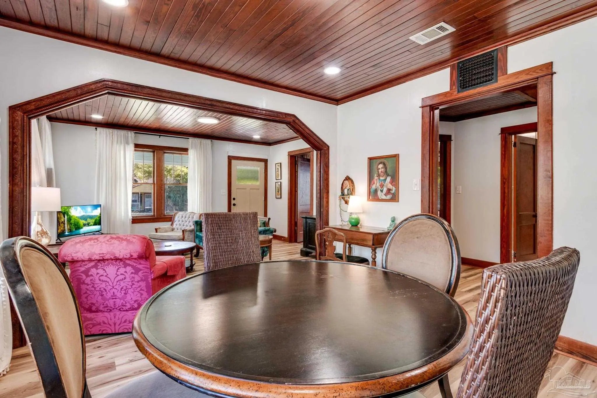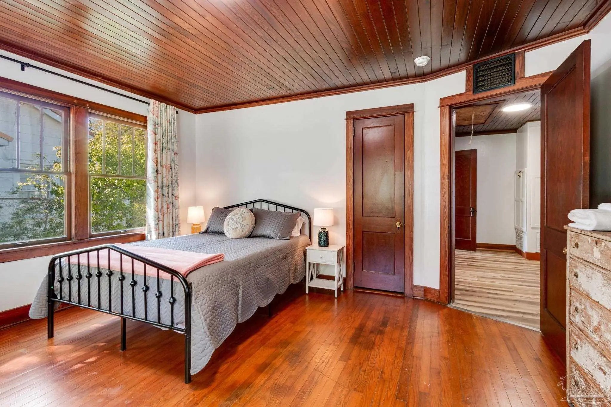 BACK ON THE MARKET! This beautifully maintained home blends historic charm with thoughtful updates throughout. Rich wood trim, original architectural details, and stunning wood plank ceilings create an inviting atmosphere you don’t often find. The spacious living and dining areas feature gorgeous millwork, wide cased openings, and abundant natural light pouring through oversized windows. Hardwood floors and detailed trim work add warmth and elegance, while recessed lighting provides a modern touch. The bedroom showcases beautiful hardwood flooring and large windows that flood the space with natural light, creating a bright and airy retreat. The updated kitchen offers white cabinetry, a stylish tile backsplash, stainless steel appliances, and a double-basin sink overlooking the yard. Modern finishes blend seamlessly with the home’s classic style. If you appreciate craftsmanship, character, and a home that stands apart from cookie-cutter construction, this one is a must-see. Schedule your showing today! MOTIVATED SELLER! Property is on a rental program. Small desk and game table does not convey...
