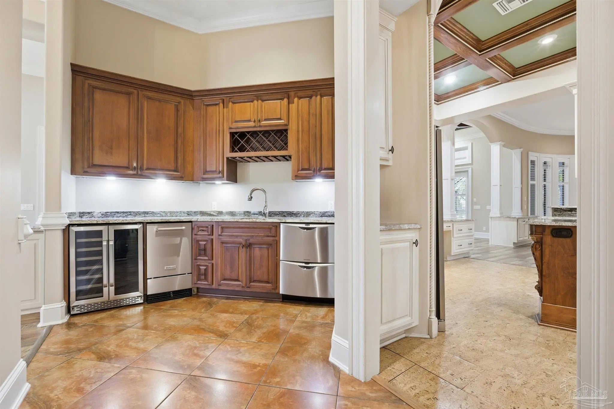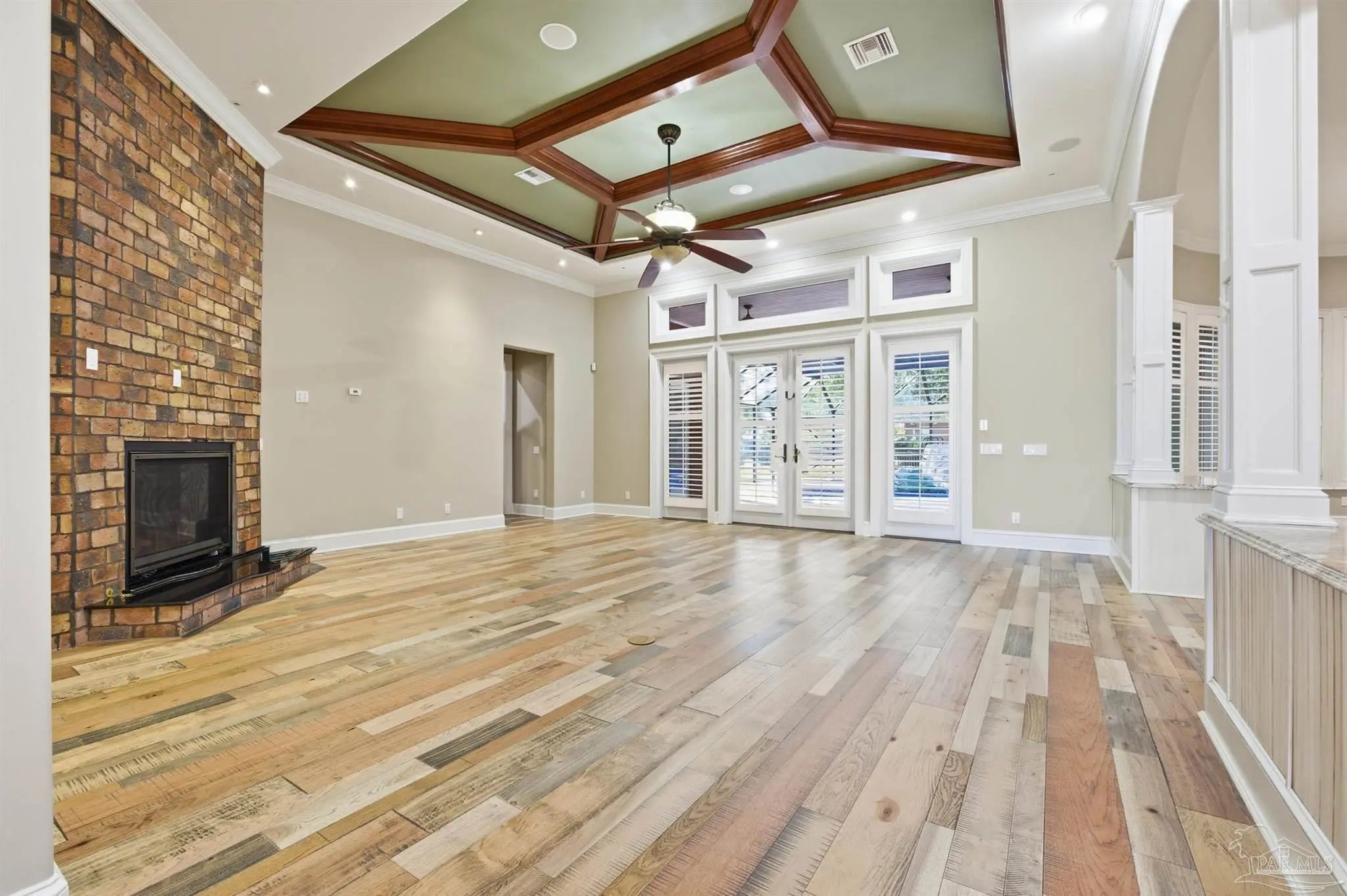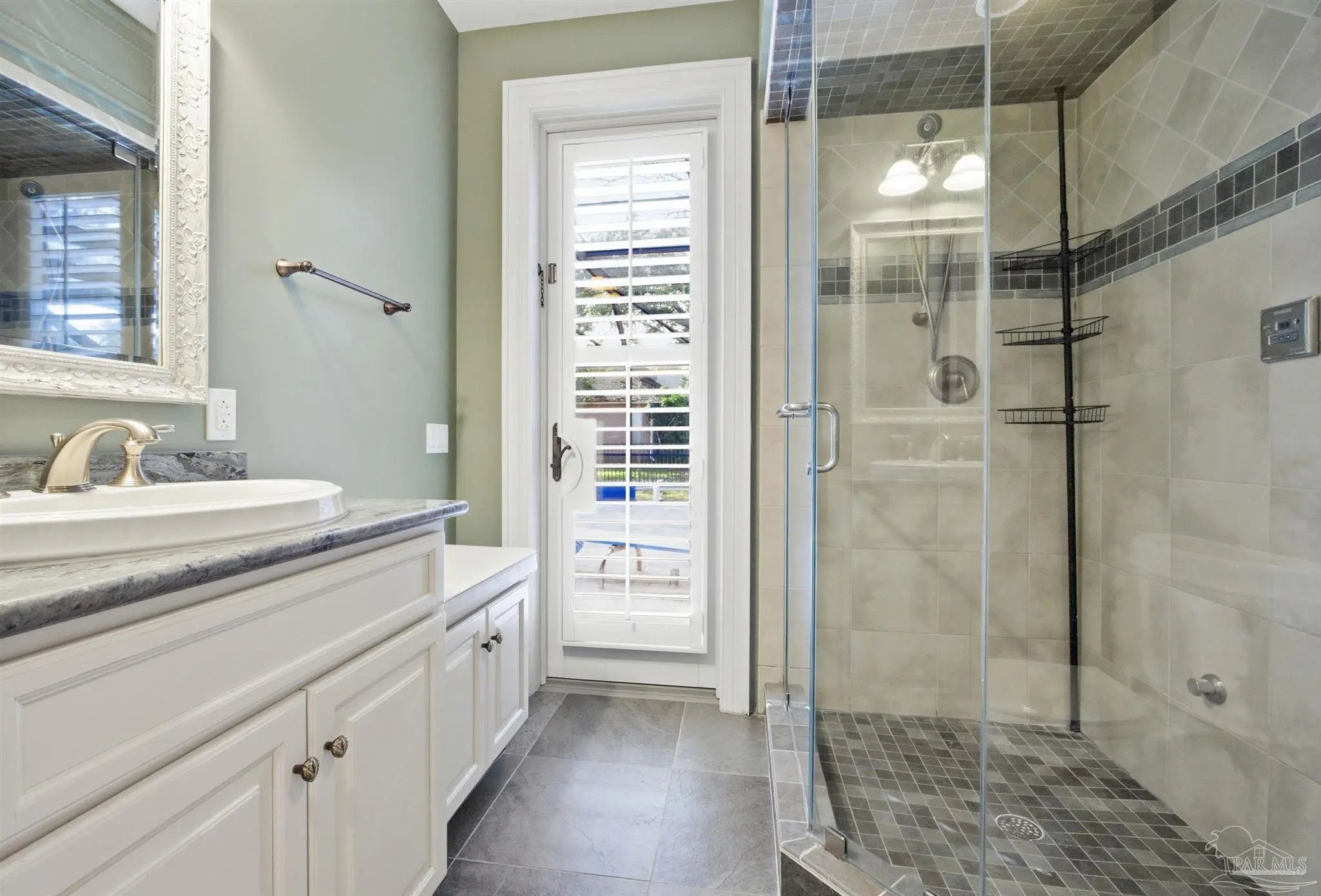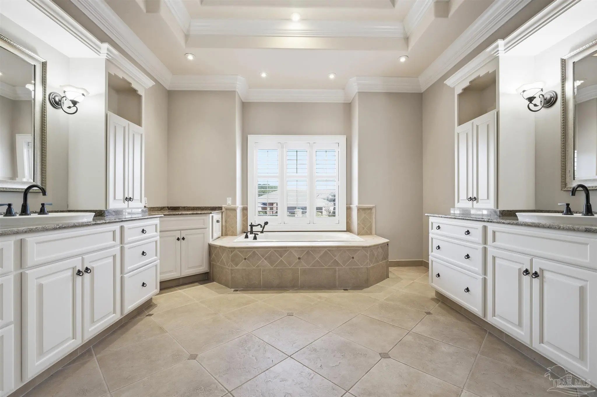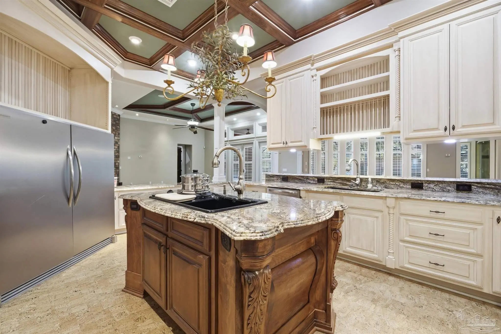 Custom-built home in the gated Stonebrook Village golf course community. Fresh interior paint throughout the entire home. Ceilings range from approximately 10–12 ft with tray ceilings in the living room, kitchen, and primary bedroom. Crown molding and 3.5" plantation shutters on all windows. Seller will install a new roof with acceptable terms, allowing buyer to select shingle color. The kitchen features a large island with secondary sink, pot filler, built-in grease fryer, smooth-surface cooktop, and a butler pantry/wet bar with additional dishwasher, ice maker, sink, and secondary refrigerator. Full-size side-by-side refrigerator and freezer configuration in place. Granite countertops throughout the home, including all bathrooms. The primary suite functions as a private wing with oversized his-and-hers walk-in closets, dedicated laundry and storage, and a spa-style bath featuring a soaking jetted tub, granite counters, and a massive walk-in steam shower. Private pool access from the primary bedroom. Dedicated office/library with floor-to-ceiling built-in bookshelves and concealed storage. Gas fireplace, whole-home fire sprinkler system, whole-home central vacuum system, spray foam attic insulation, tankless gas water heater, 2 HVAC systems (approx. 2019 and 2021), and whole-home generator. Screen-enclosed vinyl pool with gas heater. Pool liner replaced December 2024 and pool screen and doors replaced 2025. Concrete pavers surrounding pool, brick paver circular driveway, fully fenced yard, front and rear sprinkler system, and leaf filter gutter system. Located near shopping, dining, and a short drive to Pensacola. Priced BELOW recent appraised value.