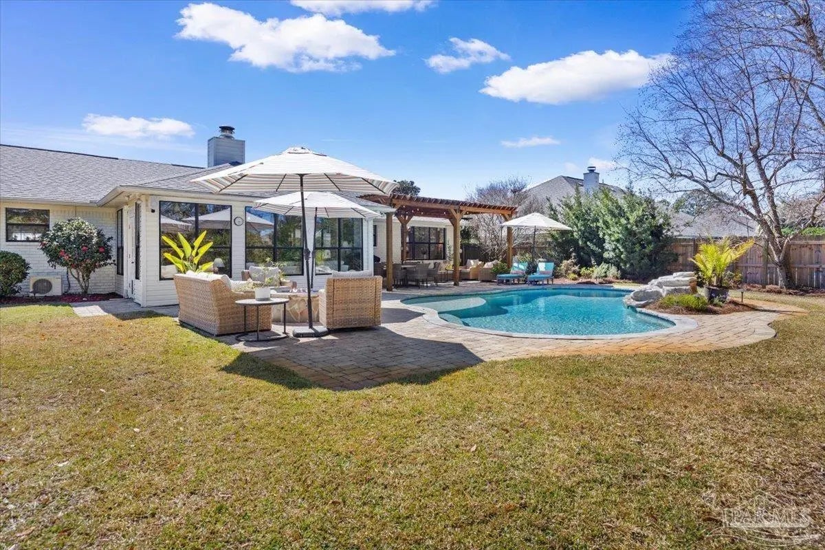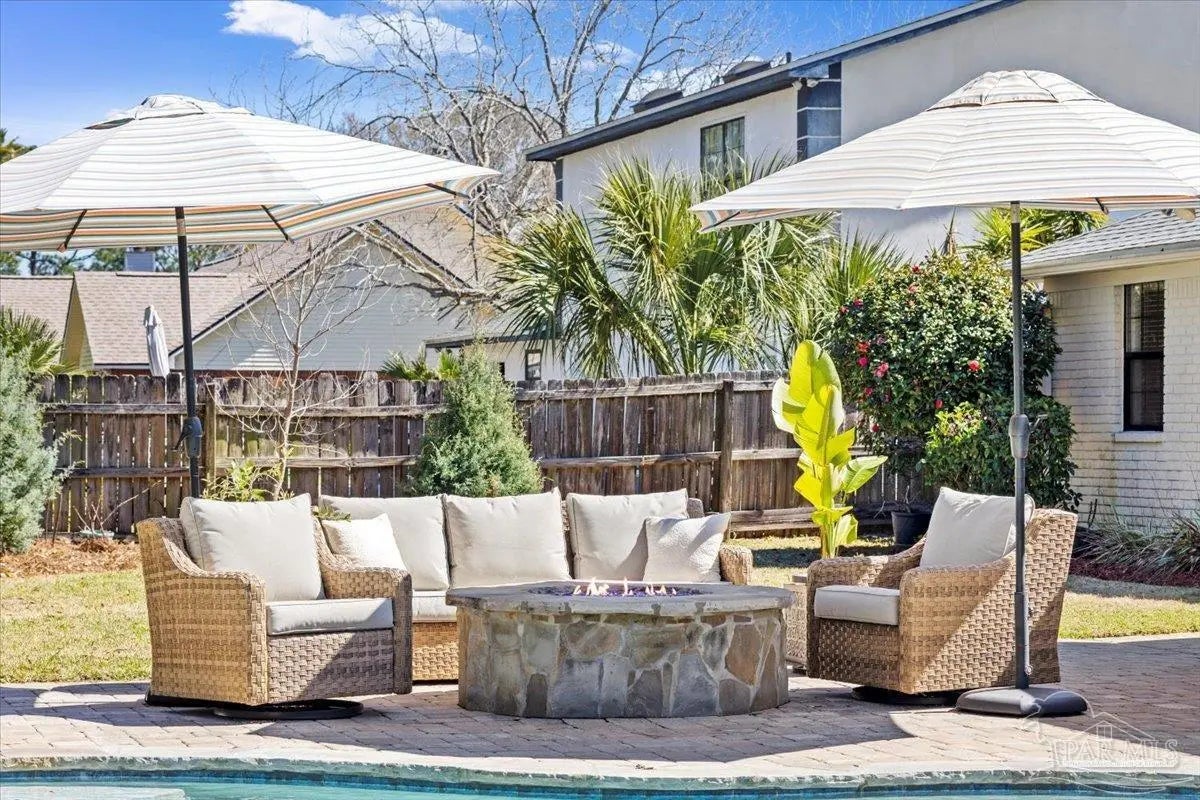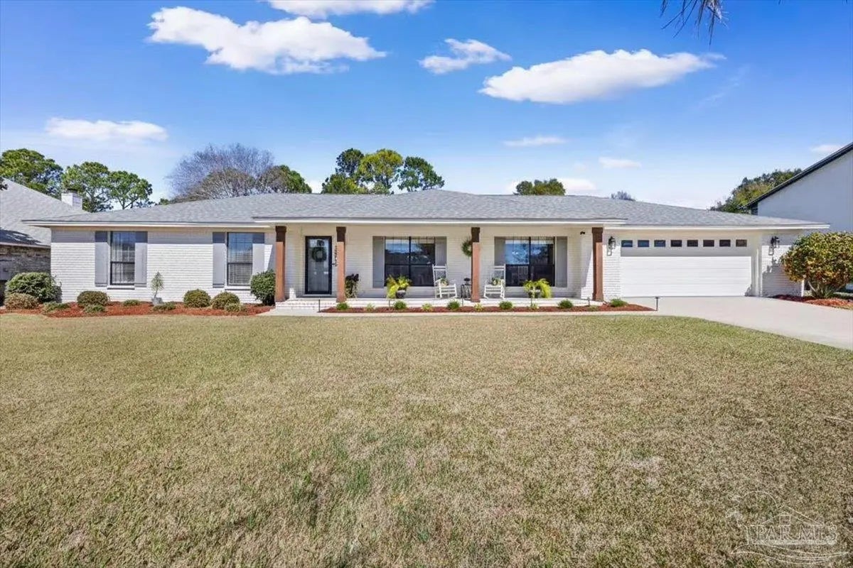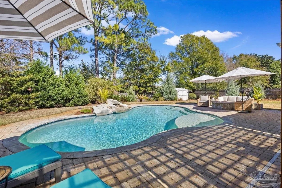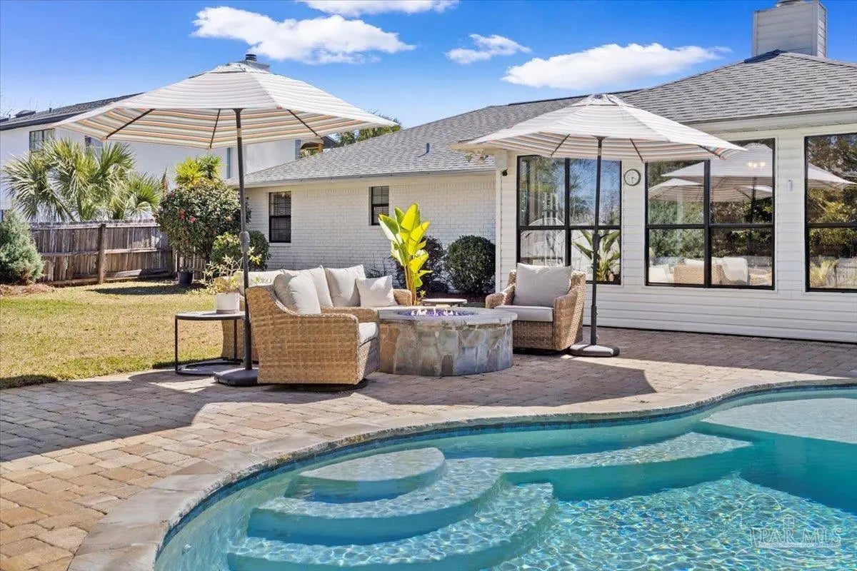 **Open House Saturday February 28th and Sunday March 1st, 11 AM - 2 PM**. Freshly updated, upgraded and move-in ready, this solidly constructed BRICK 4-bed, 3-bath POOL home on 0.34 acres in Tiger Point combines modern systems with an entertainer’s backyard. Recent improvements: new roof (2020), HVAC (2021), water heater (2024), salt cell (2024) and new pool pumps (2025), plus remodeled master bath and updated guest baths with new vanities, fixtures and tiled showers. A welcoming front porch greets all and opens into bright, light-filled formal living and dining rooms; the kitchen features a breakfast bar, oversized built-in pantry and flows into the large den for easy daily living. The den is highlighted with a high beamed ceiling and a gas fireplace. The spacious master suite has a large bay window overlooking the patio and pool and a recently renovated bath with a large tiled shower and updated vanity. One bedroom and full bath are separately located and ideal as a guest suite. The backyard is a private resort-style oasis: salt-water gunite pool with sun shelf and waterfall, covered patio for outdoor dining, natural-gas built in fire pit, and low-maintenance custom landscaping served by a well and irrigation system — perfect for entertaining or relaxed living. Located in desirable, golf-cart-friendly Tiger Point with quick access to the famed Pointe Restaurant and Bar, Tiger Point Park, Publix, Lowe’s and other shopping and dining. Zoned for TOP RATED SCHOOLS: Oriole Beach Elementary, Gulf Breeze Middle and High School, and just 9 miles to Pensacola Beach with easy access to shopping, hospitals and downtown Pensacola.