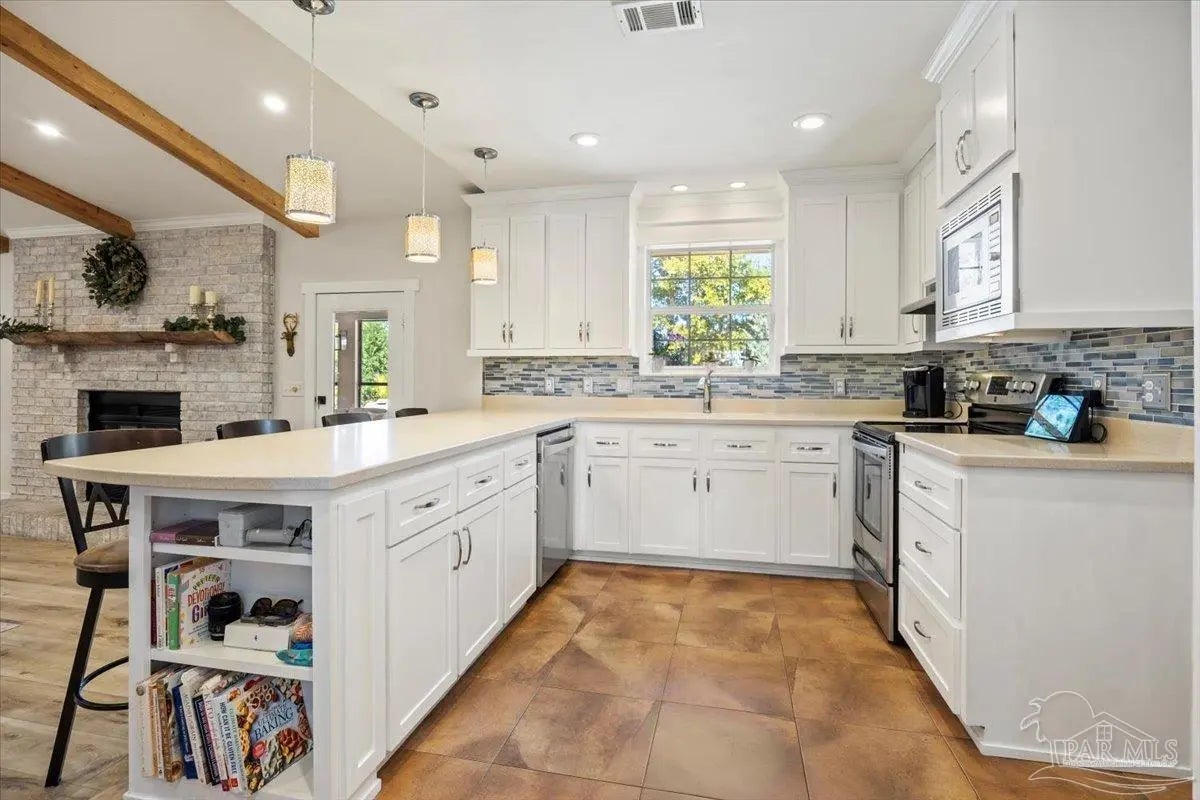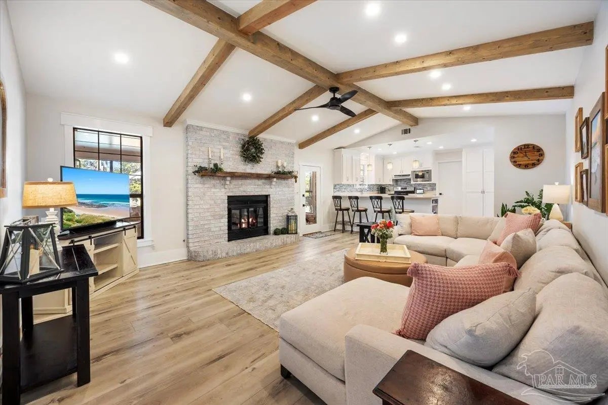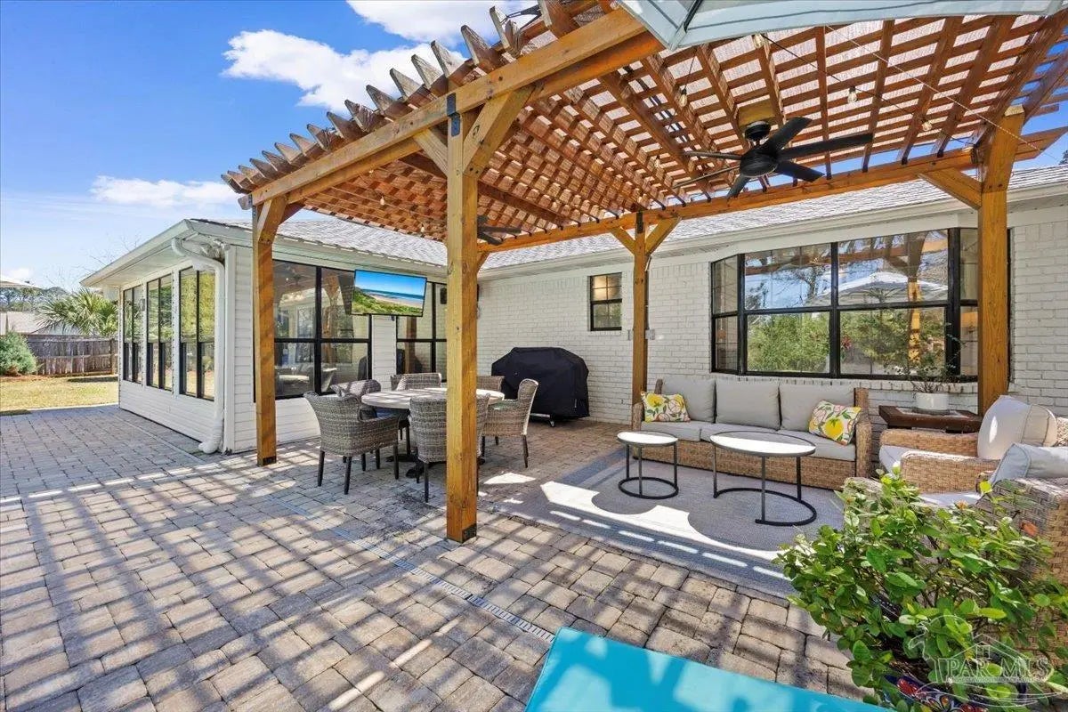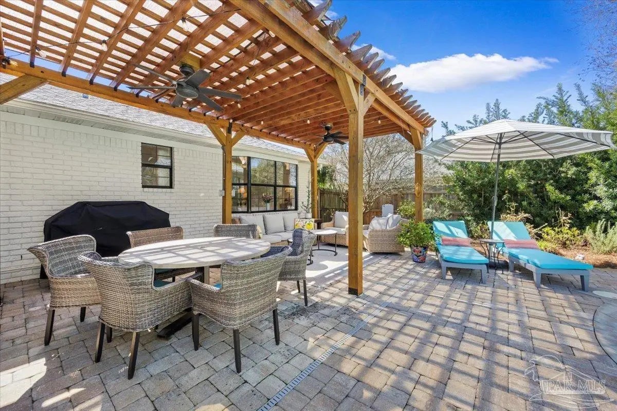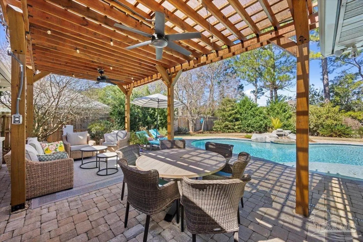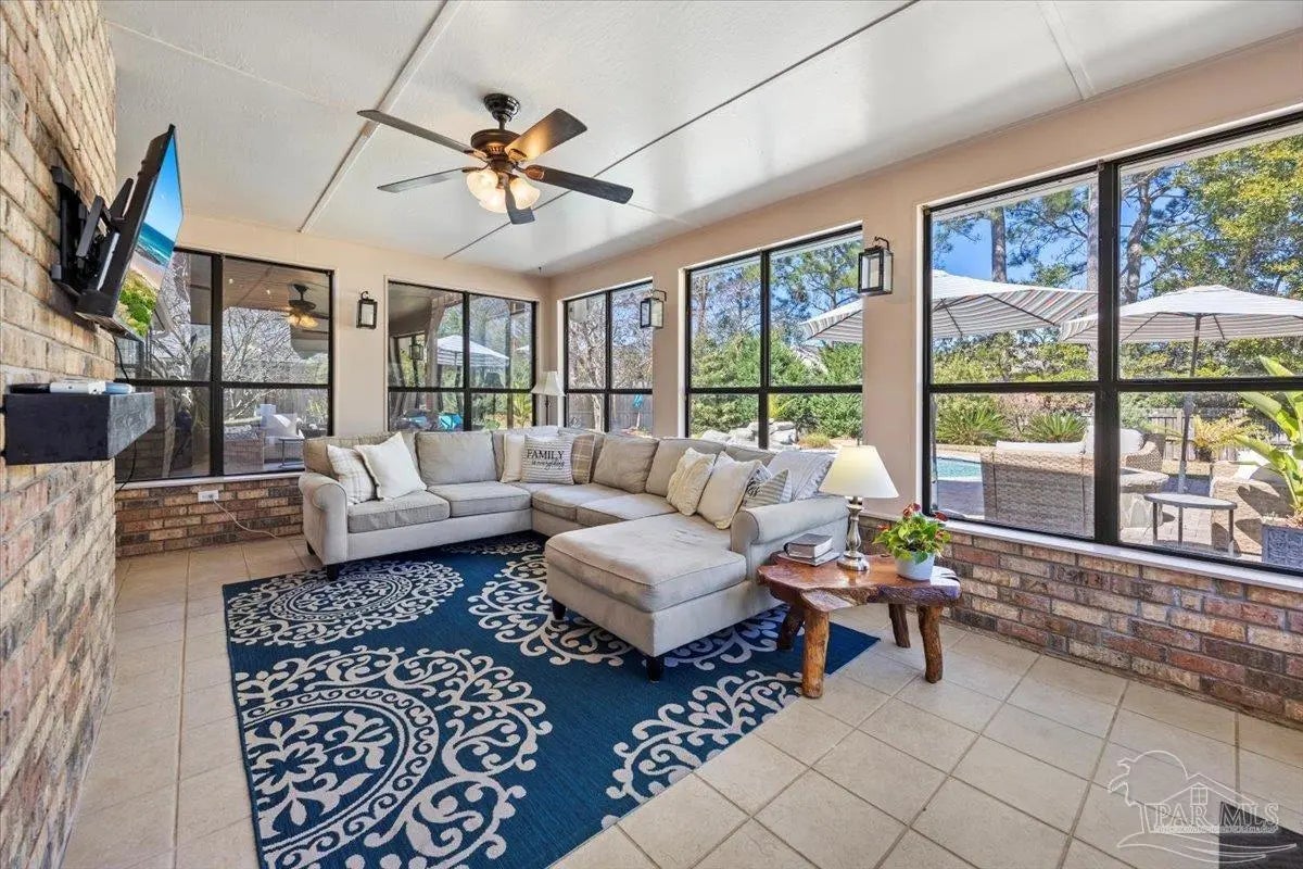 **Open House Saturday February 28th and Sunday March 1st, 11 AM - 2 PM**. Freshly updated, upgraded and move-in ready, this solidly constructed BRICK 4-bed, 3-bath POOL home on 0.34 acres in Tiger Point combines modern systems with an entertainer’s backyard. Recent improvements: new roof (2020), HVAC (2021), water heater (2024), salt cell (2024) and new pool pumps (2025), plus remodeled master bath and updated guest baths with new vanities, fixtures and tiled showers. A welcoming front porch greets all and opens into bright, light-filled formal living and dining rooms; the kitchen features a breakfast bar, oversized built-in pantry and flows into the large den for easy daily living. The den is highlighted with a high beamed ceiling and a gas fireplace. The spacious master suite has a large bay window overlooking the patio and pool and a recently renovated bath with a large tiled shower and updated vanity. One bedroom and full bath are separately located and ideal as a guest suite. The backyard is a private resort-style oasis: salt-water gunite pool with sun shelf and waterfall, covered patio for outdoor dining, natural-gas built in fire pit, and low-maintenance custom landscaping served by a well and irrigation system — perfect for entertaining or relaxed living. Located in desirable, golf-cart-friendly Tiger Point with quick access to the famed Pointe Restaurant and Bar, Tiger Point Park, Publix, Lowe’s and other shopping and dining. Zoned for TOP RATED SCHOOLS: Oriole Beach Elementary, Gulf Breeze Middle and High School, and just 9 miles to Pensacola Beach with easy access to shopping, hospitals and downtown Pensacola.
