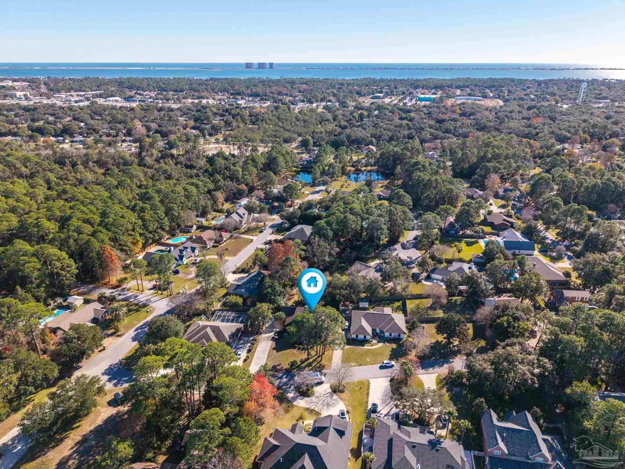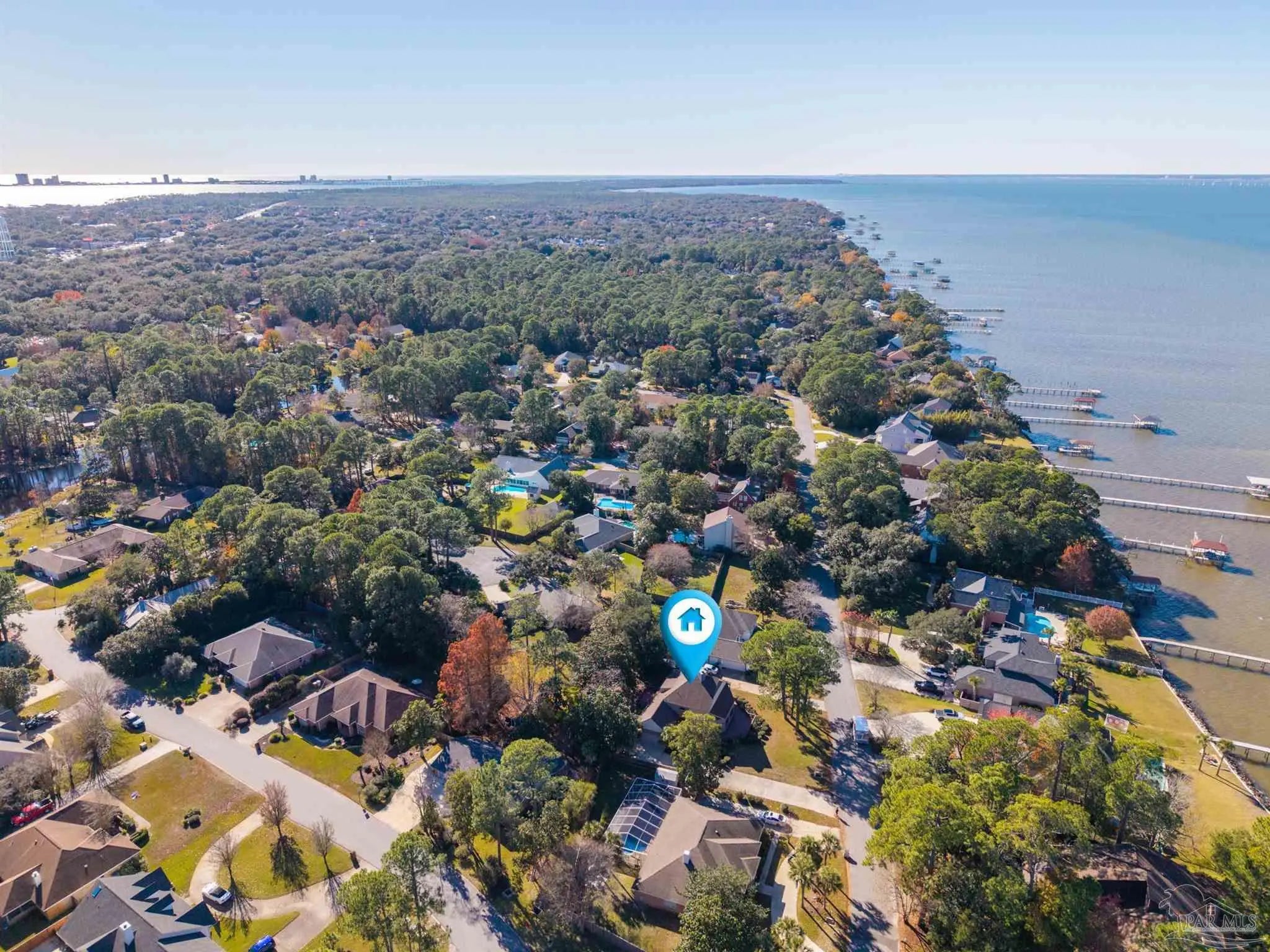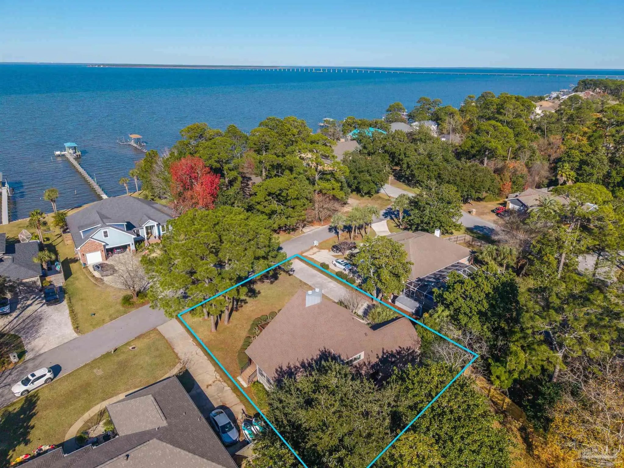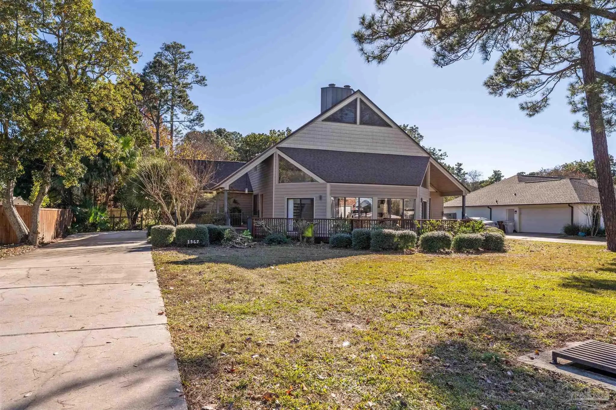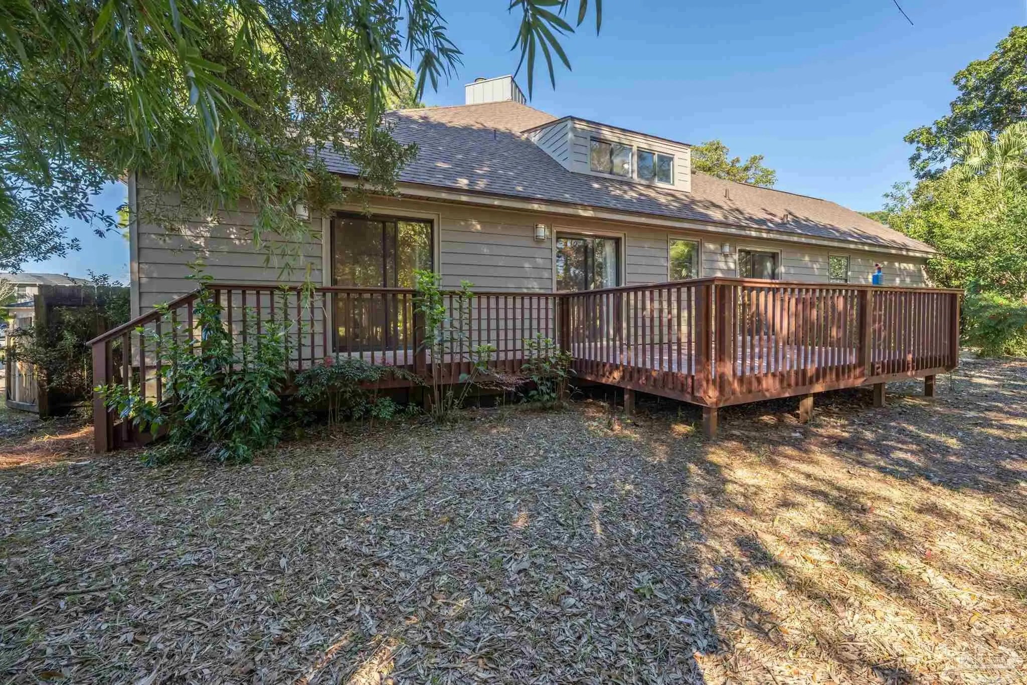 CONTEMPORARY MODERN DESIGN WITH A WATER VIEW and zoned for A-rated Gulf Breeze schools! This spacious, one-of-a-kind home provides 2,913 sf of thoughtfully designed living space in a wonderful, tree-lined, bayfront neighborhood. With four bedrooms and two full bathrooms, you will discover a light drenched, open and functional layout with partial views of the bay across the street. This location is perfect for those desiring to be close to the water, the beautiful beaches and essential amenities. This home immediately stands out with its unique architectural design. Step inside and you'll be greeted by cathedral ceilings, large windows and a mix of beautiful flooring including classic hardwood, sleek tile, and cozy carpet, each thoughtfully placed to enhance the home's charm and character. A sunken living room surrounded by huge windows, a beautiful wooden beam and a soaring wooden fireplace is the perfect place to relax. The centerpiece of the home is its stunning kitchen, featuring gleaming granite countertops and a ton of cabinets which provide ample space for cooking and entertaining. A breakfast/ dining room just off of the kitchen allows enough space for a large dining set and offers water views through the sliding glass door leading onto the expansive front deck. Three additional bedrooms and one bath are also located on the first level, with all bedrooms having direct access to the large back deck. The back yard offers privacy and a park-like setting with enough room for a pool! The entire second floor contains the primary suite dreams are made of, complete with full bath, vaulted ceilings, a lovely sitting area and a fireplace. The thoughtful design of the home creates inviting spaces for gatherings or quiet evenings at home, yet enough privacy for all dwellers and guests. Enjoy a 2 car garage and amazing wrap around porches on the front and back. Must be seend in person to fully appreciate all that this remarkable home has to offer! Schedule your showing!